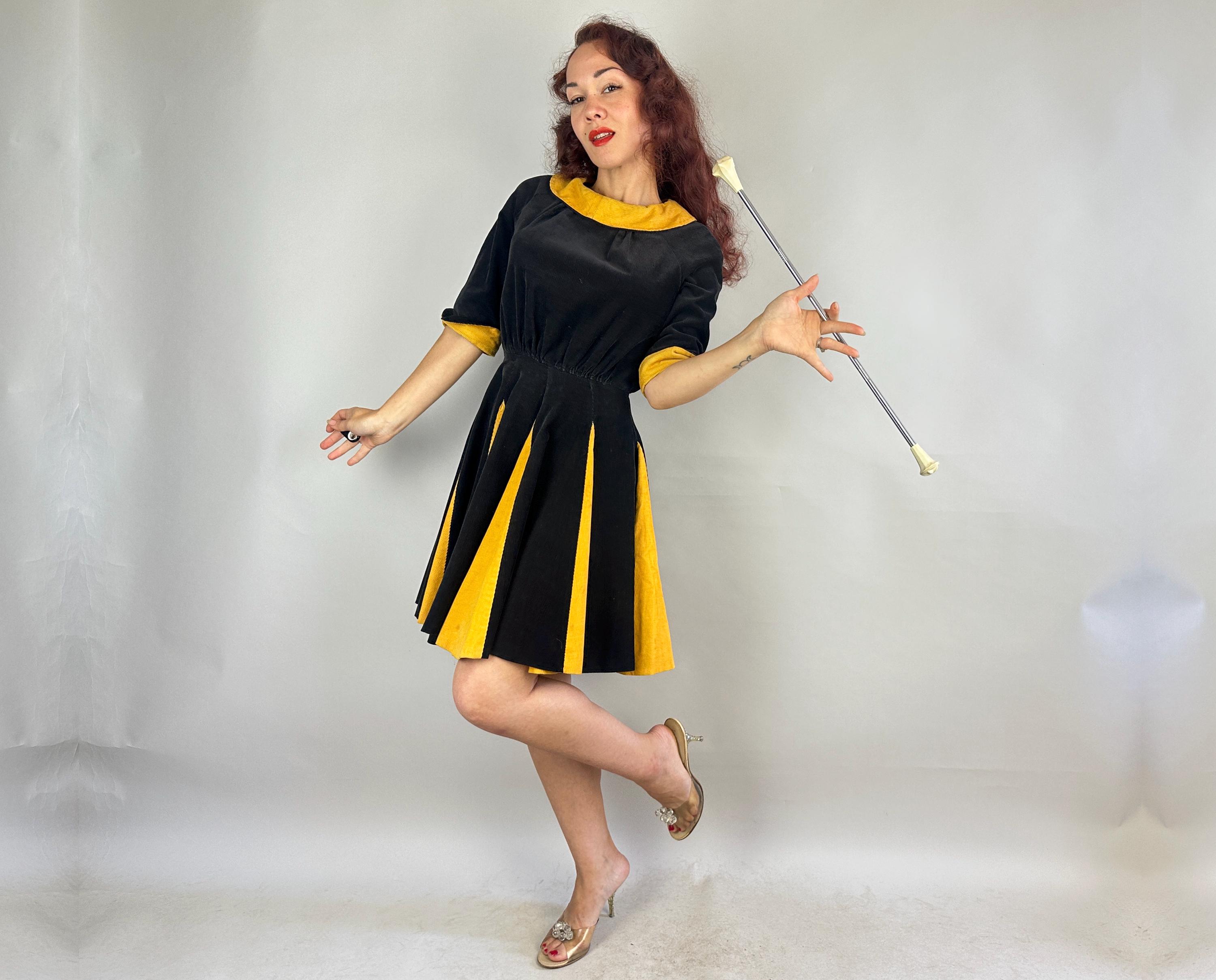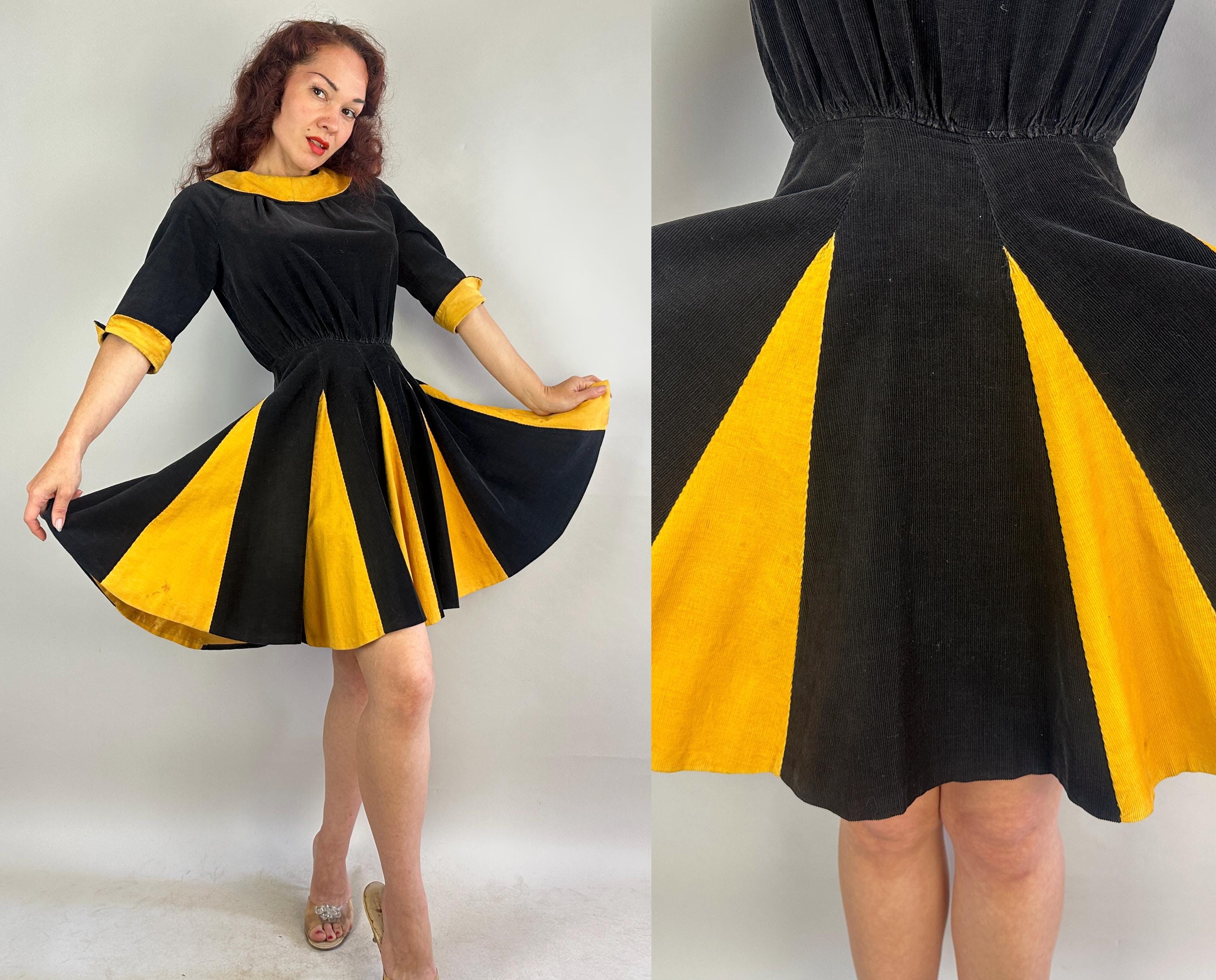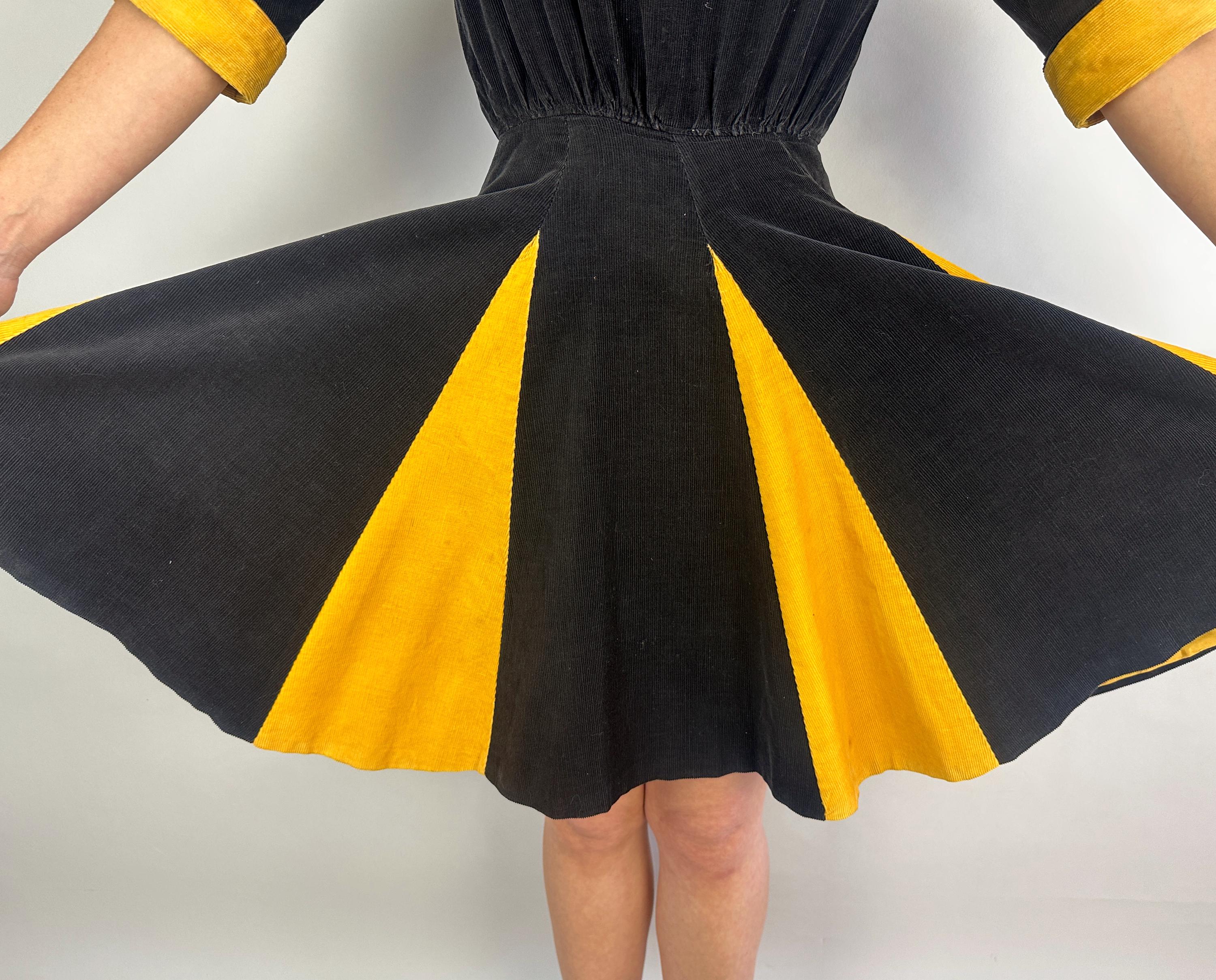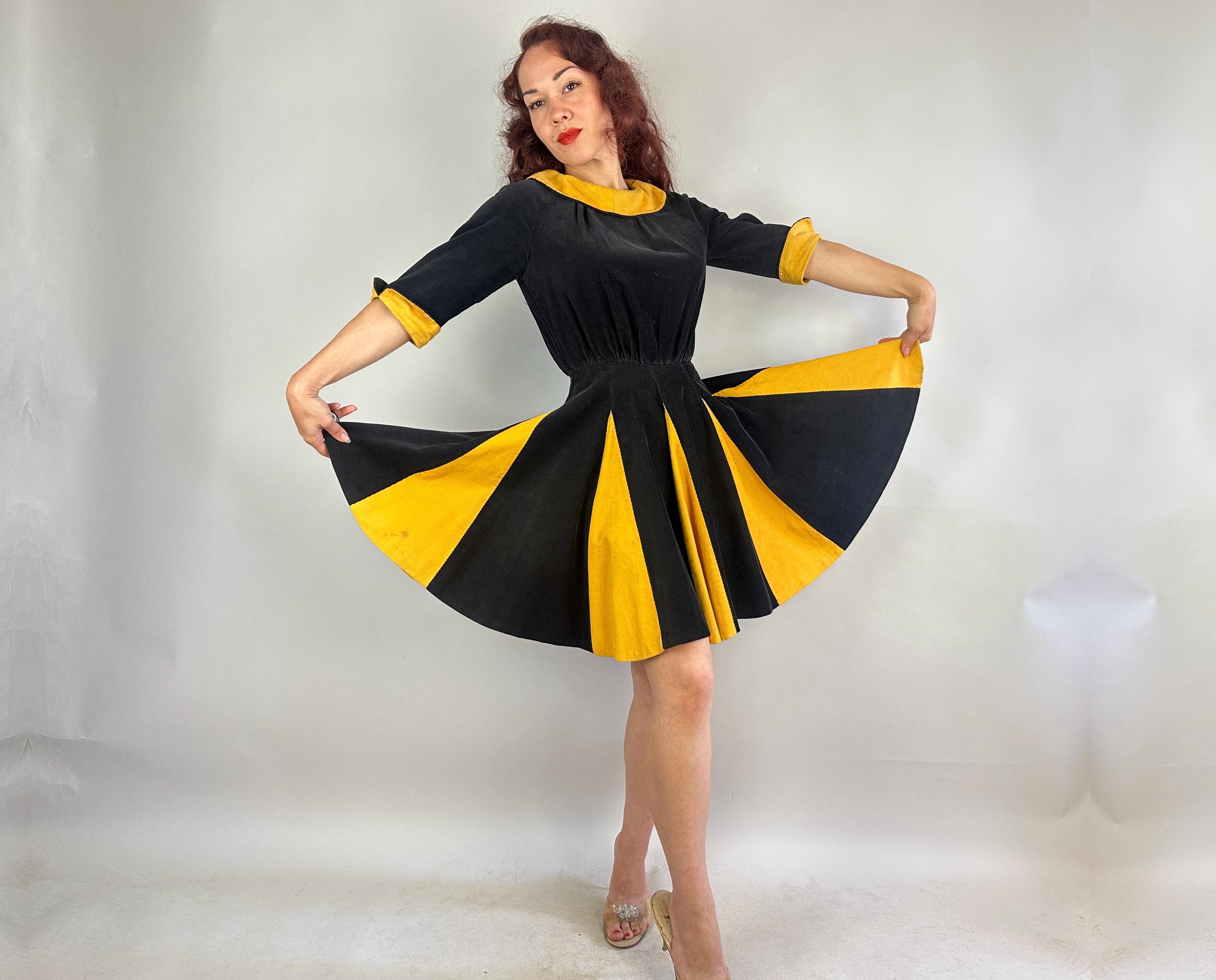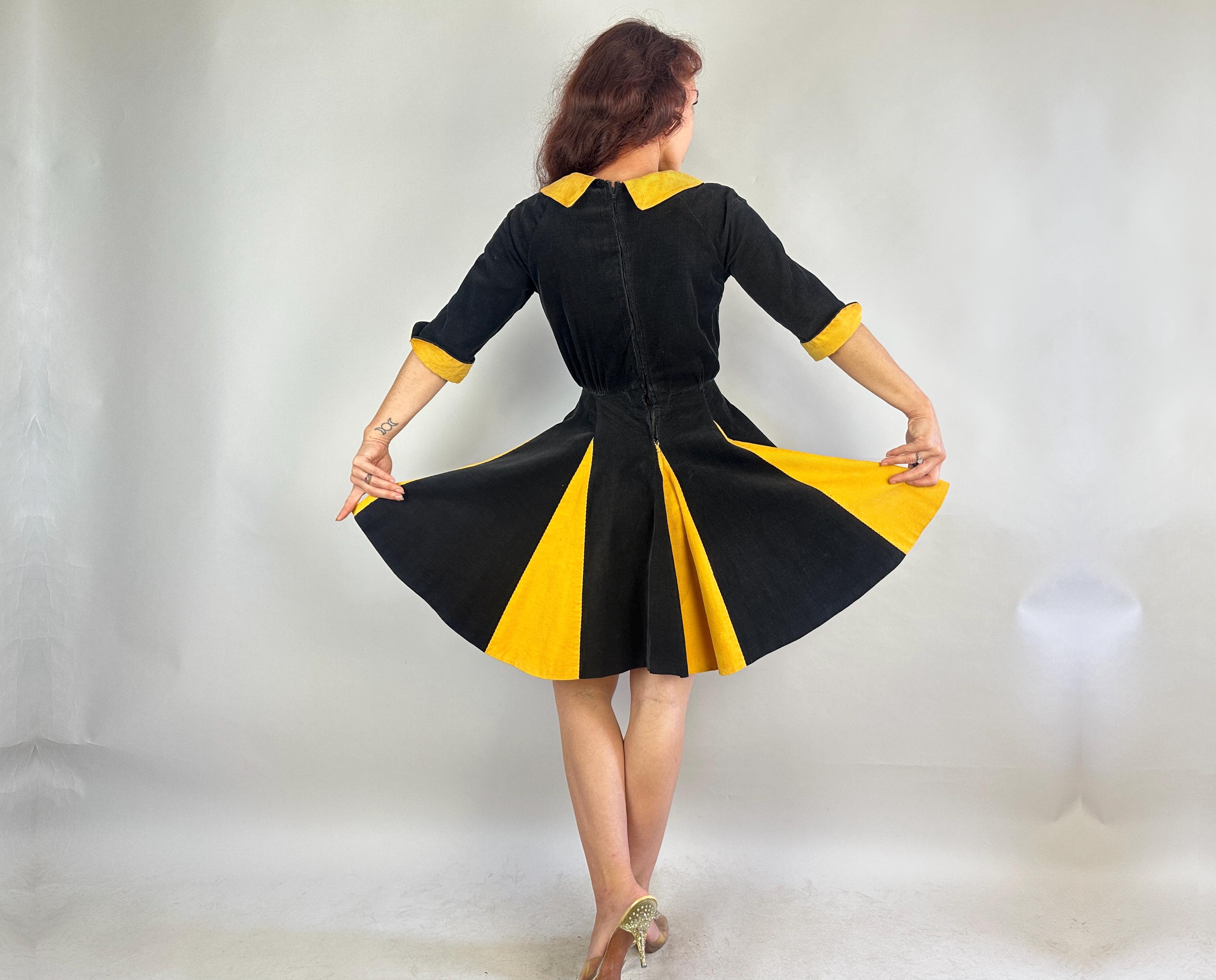 Help those spirits soar like a buzzing bee and lead them to victory in this 1950s cheerleader dress! The two tone corduroy is super cute in a black and yellow bumblebee combo. The dress is a short skater stlye with ultra flared circle skirt inset with triangular gores of the yellow and lined with yellow acetate that is sure to makes your twirls and kicks really standout. A wide round collar sits high to the neck and matches well with the cuffs of the three quarter length sleeves. Metal zipper up the back. This set is in great vintage condition, a few small faint marks in the skirting, easily lost in the extra-full circle skirt, no holes or odors to note.