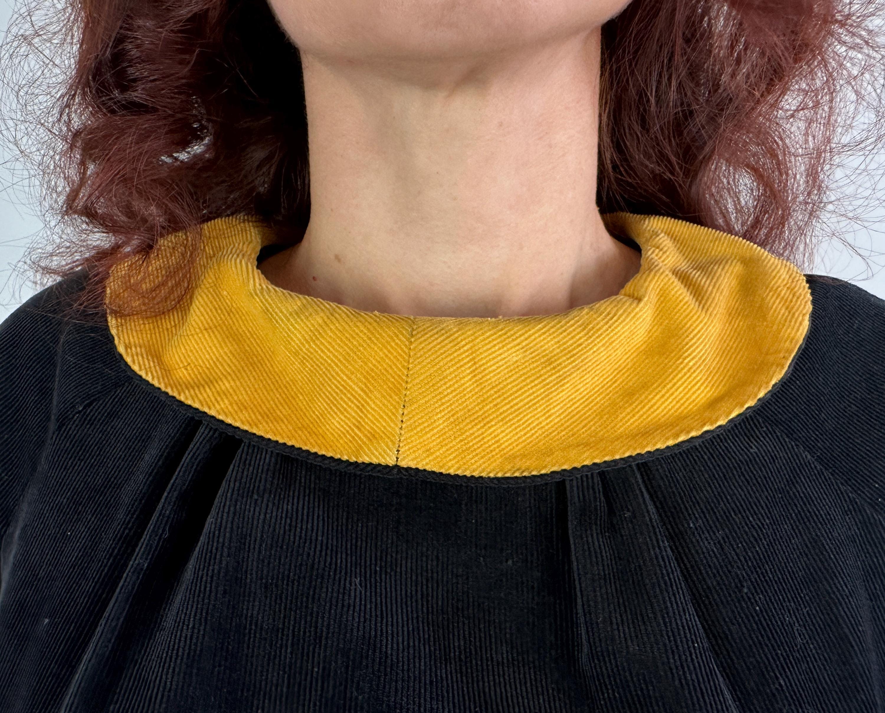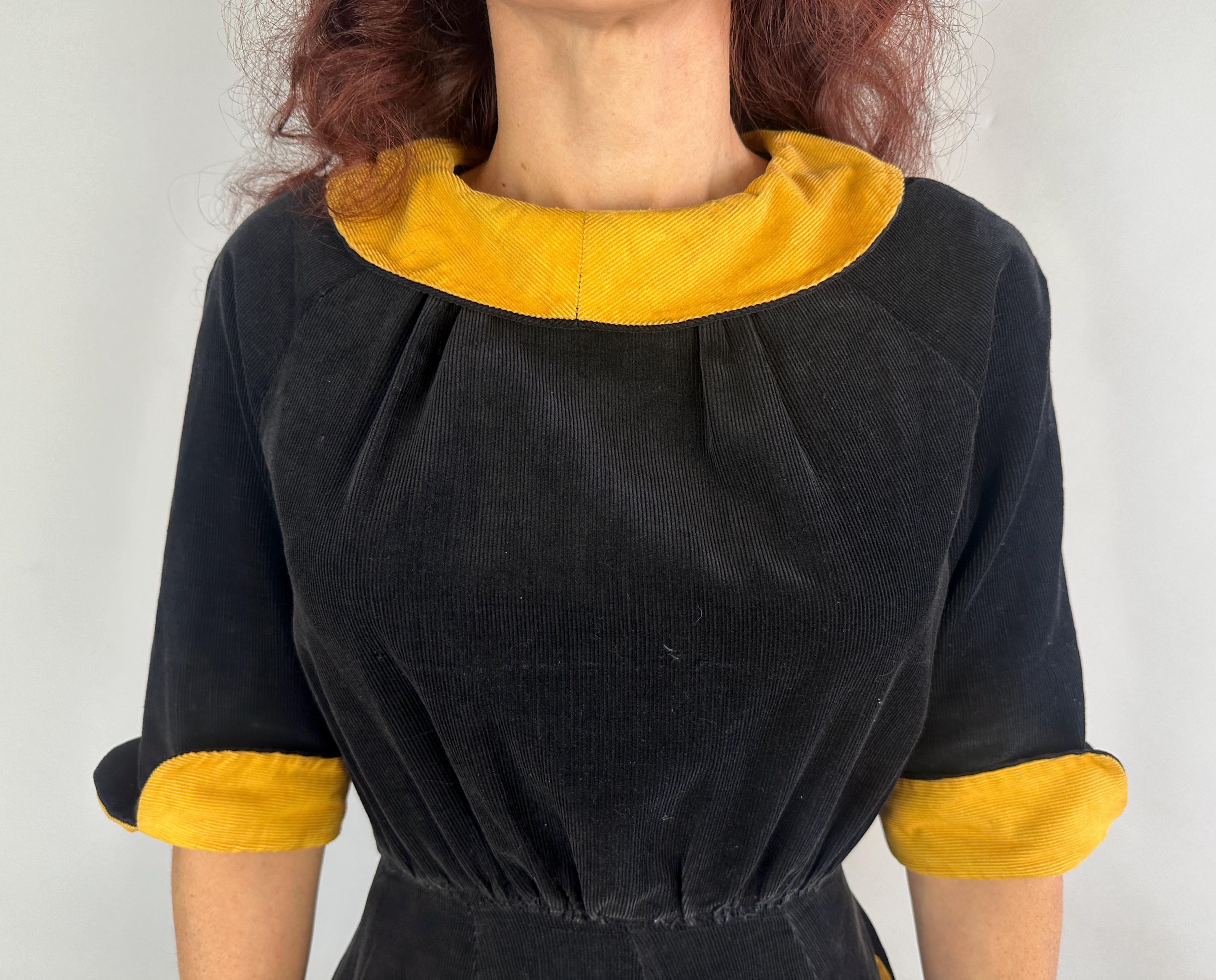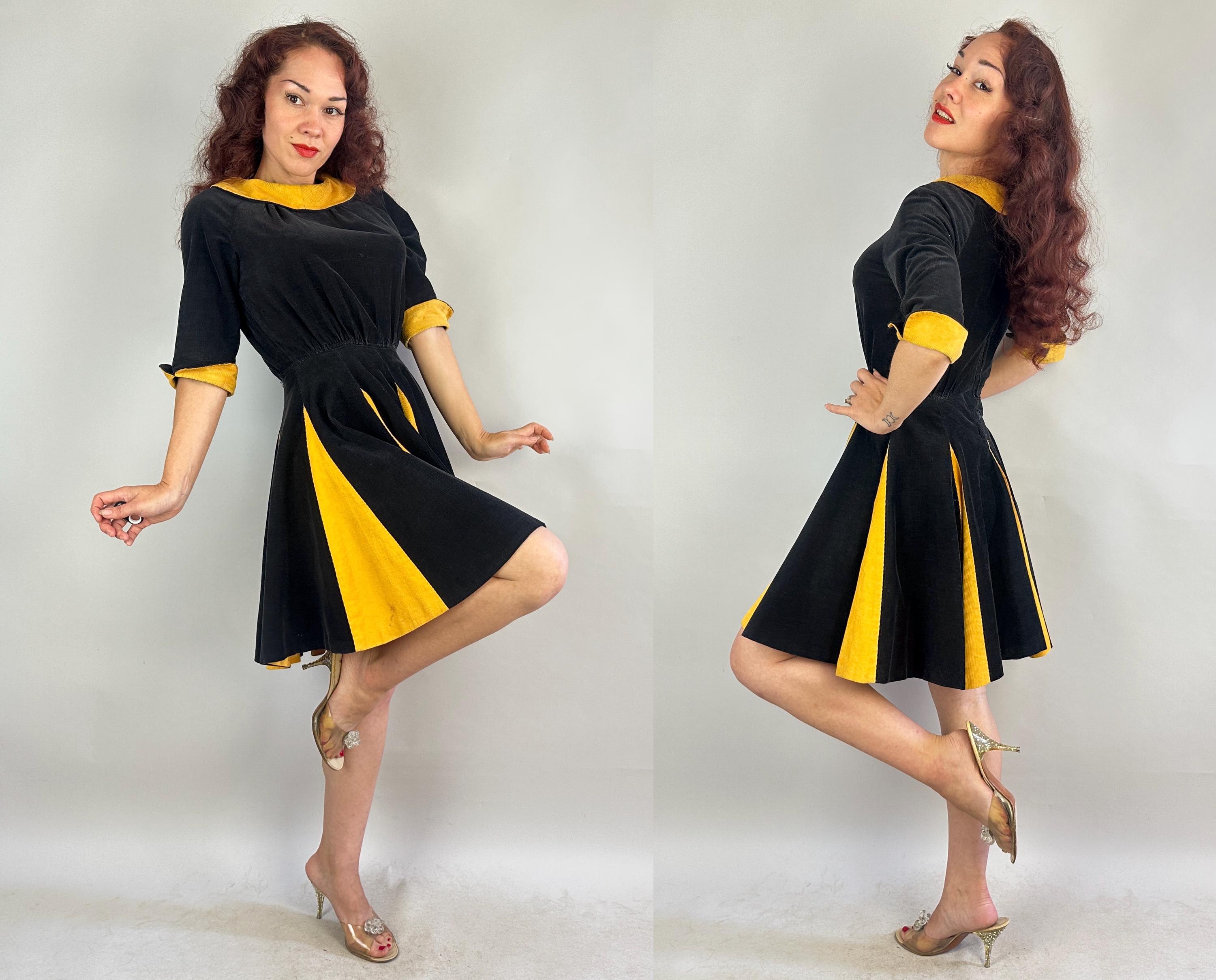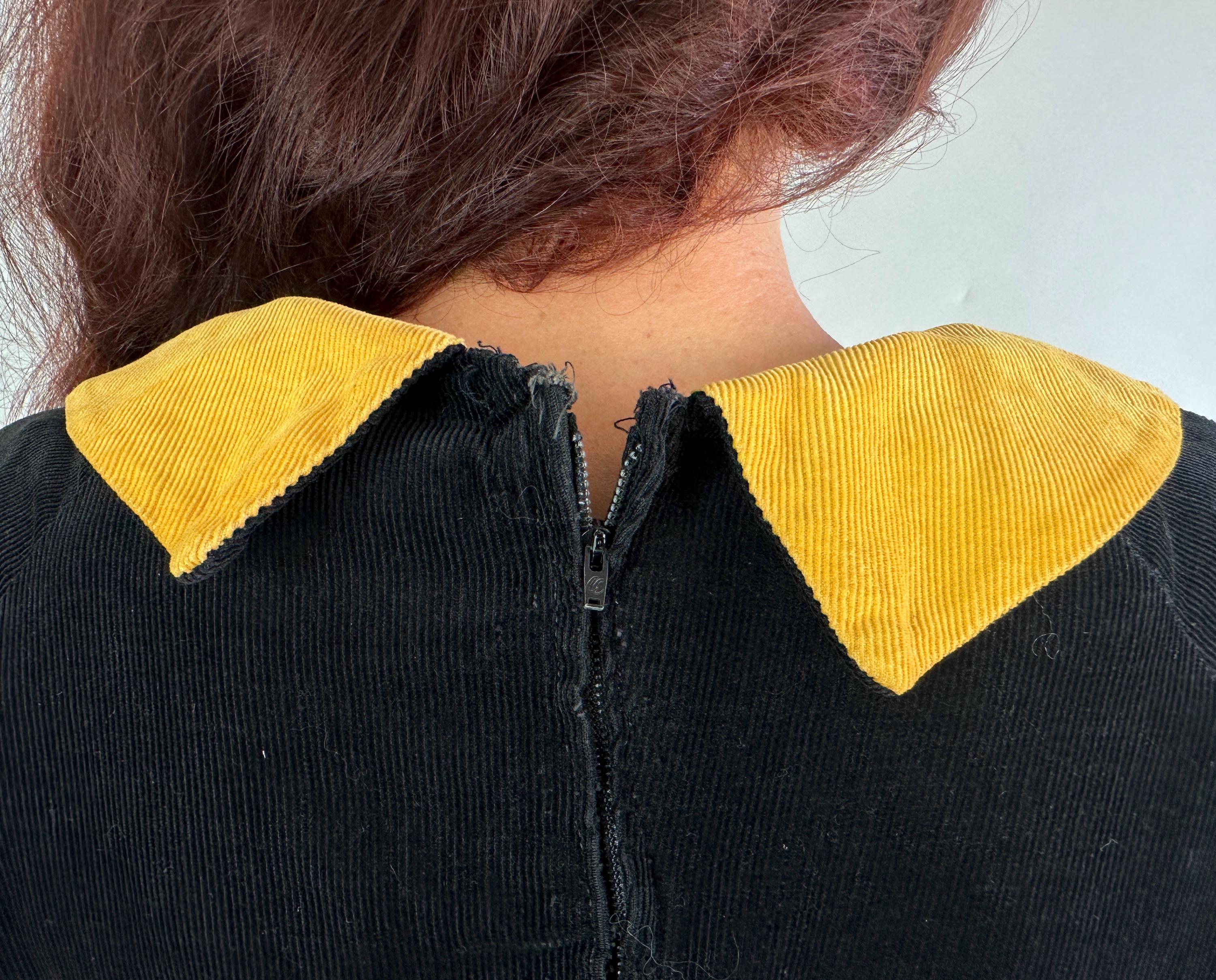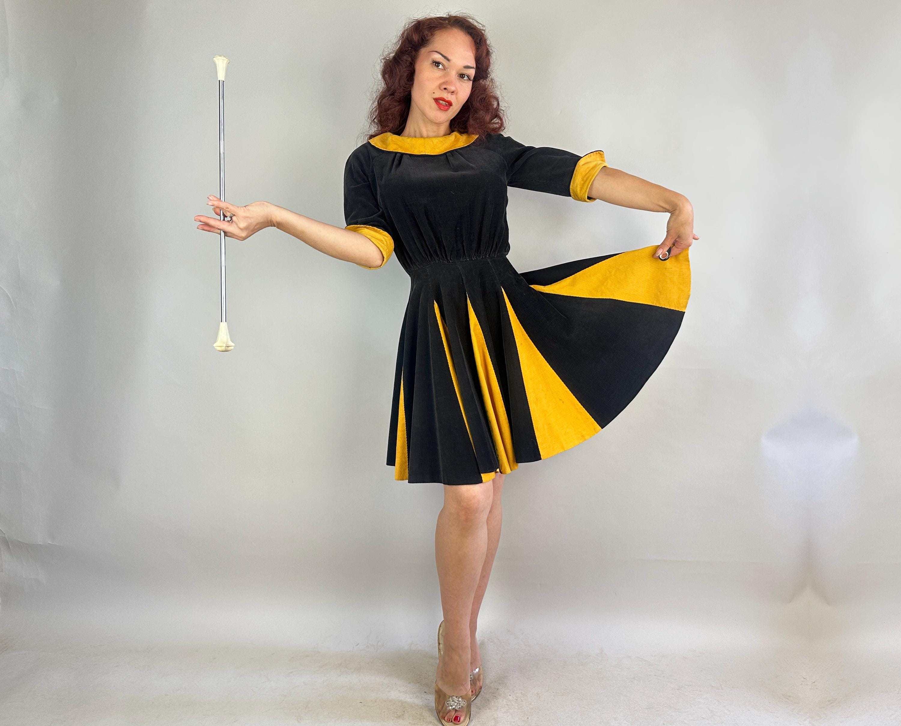 Help those spirits soar like a buzzing bee and lead them to victory in this 1950s cheerleader dress! The two tone corduroy is super cute in a black and yellow bumblebee combo. The dress is a short skater stlye with ultra flared circle skirt inset with triangular gores of the yellow and lined with yellow acetate that is sure to makes your twirls and kicks really standout. A wide round collar sits high to the neck and matches well with the cuffs of the three quarter length sleeves. Metal zipper up the back. This set is in great vintage condition, a few small faint marks in the skirting, easily lost in the extra-full circle skirt, no holes or odors to note.