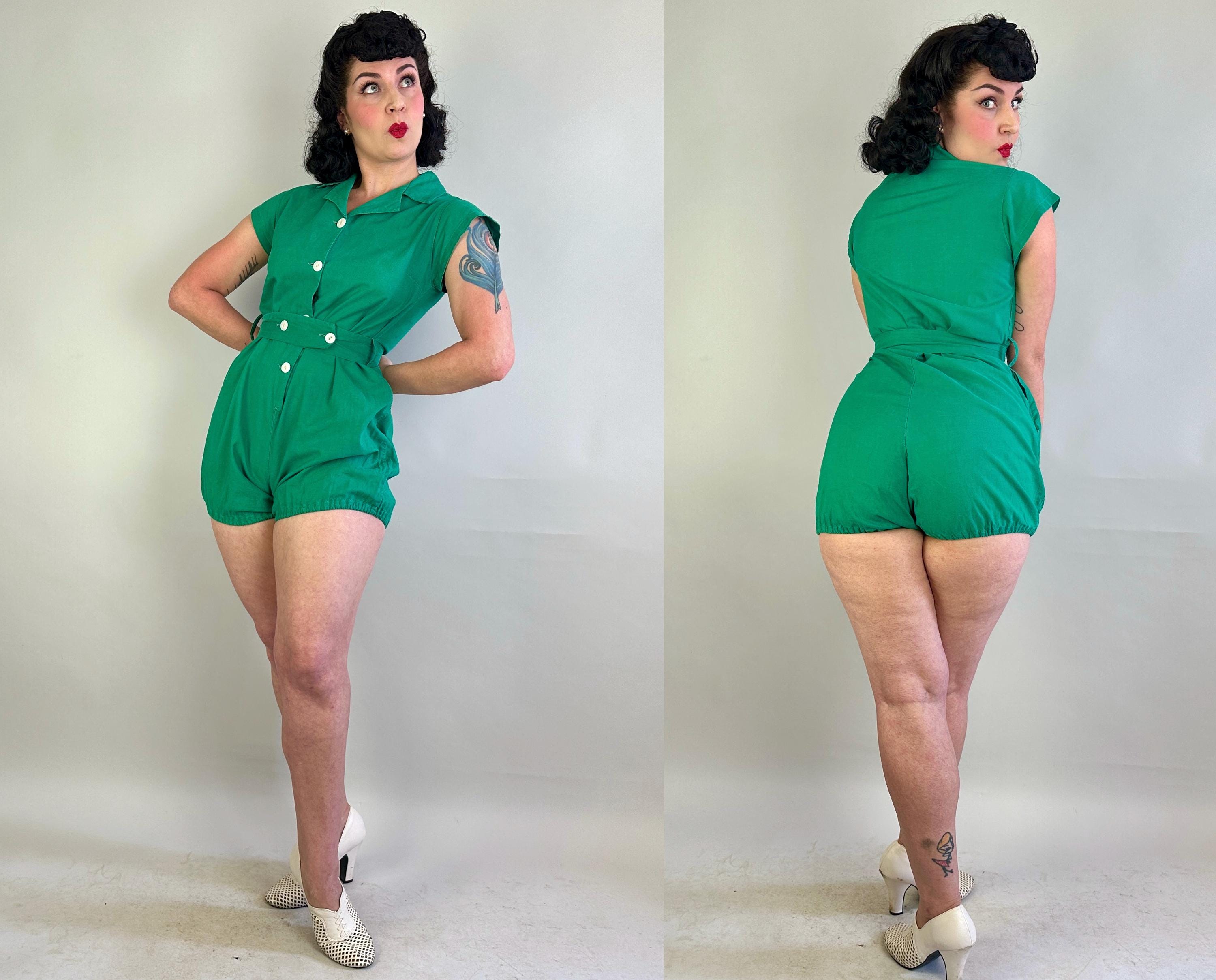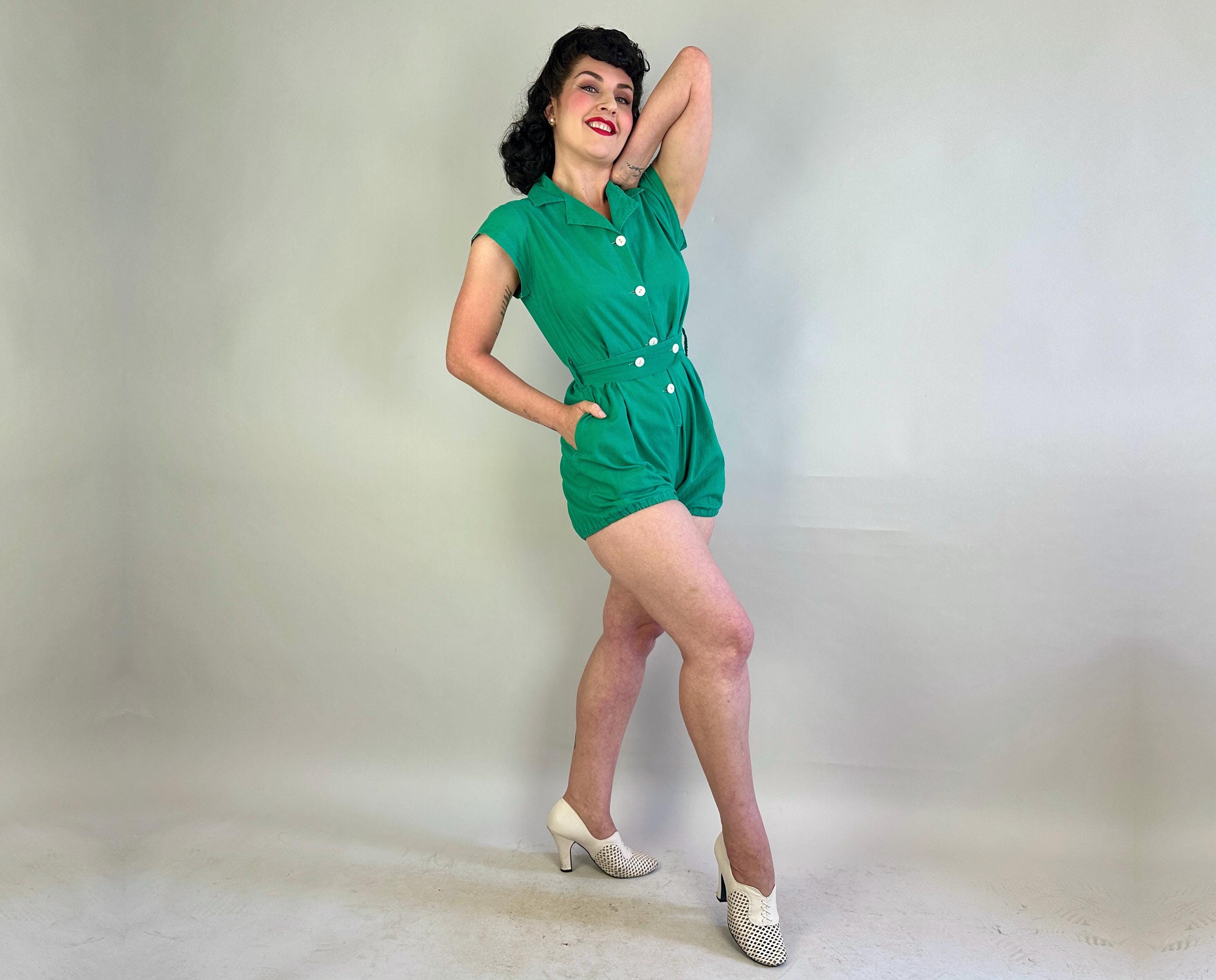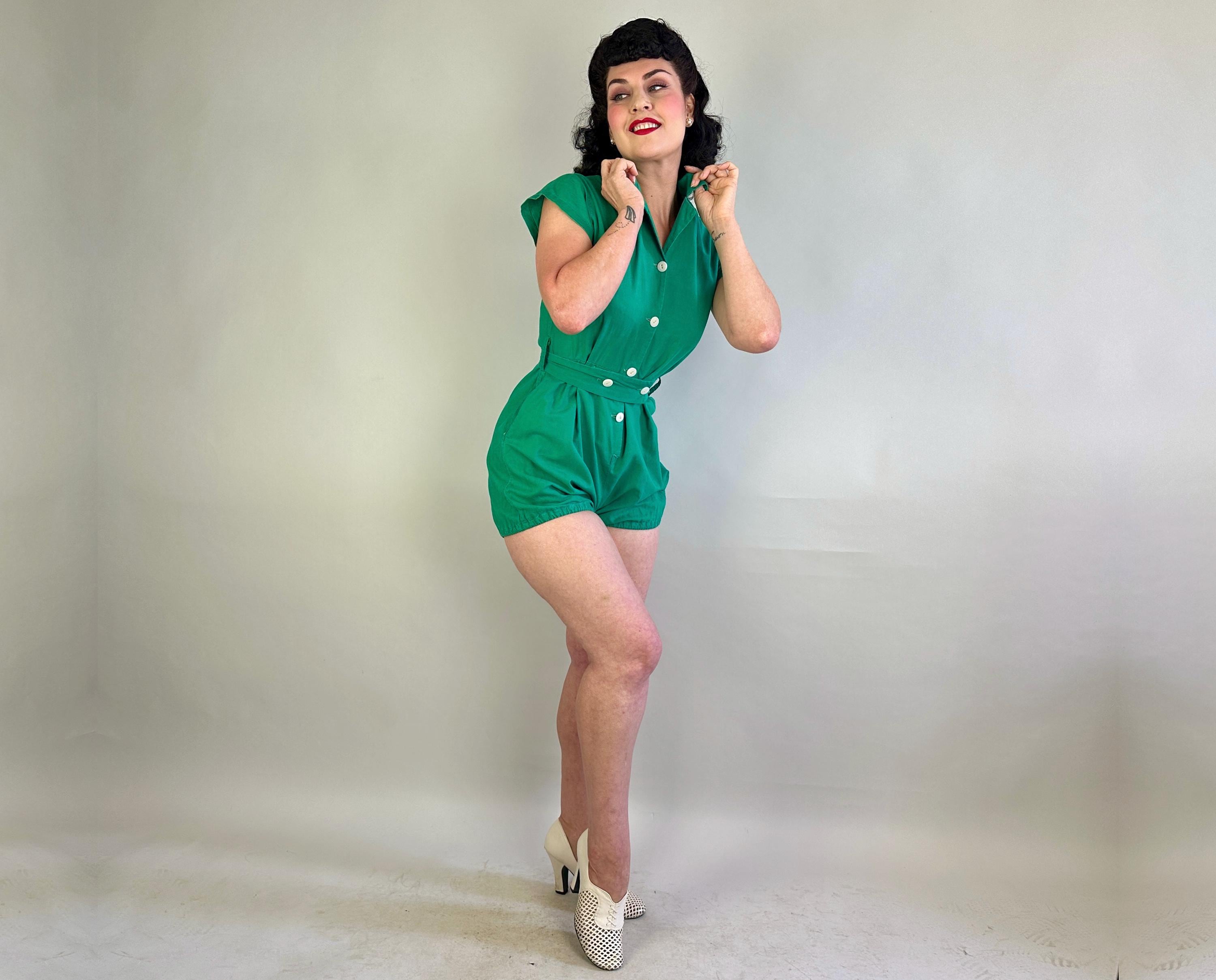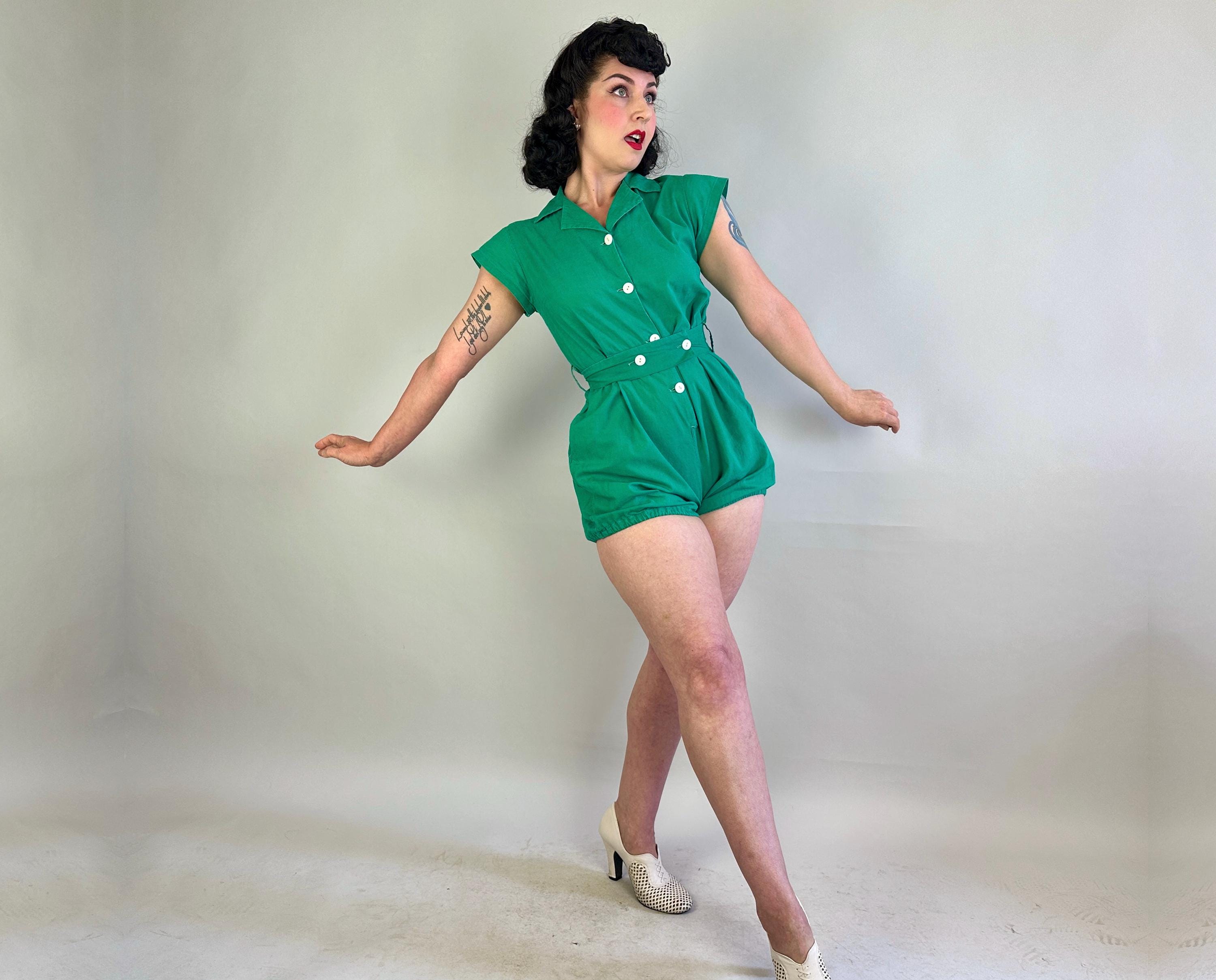 You'll be fun and fit in this 1940s romper! Cotton in a lovely wintergreen makes up this shirtwaist style romper with white cateye buttons adding two tone chicness. With cap sleeves, bloomer style legs, and a cinching belt, this is one of the cutest gym uniforms we've seen! This playsuit is in great vintage condition, with no holes, stains or odors to note.