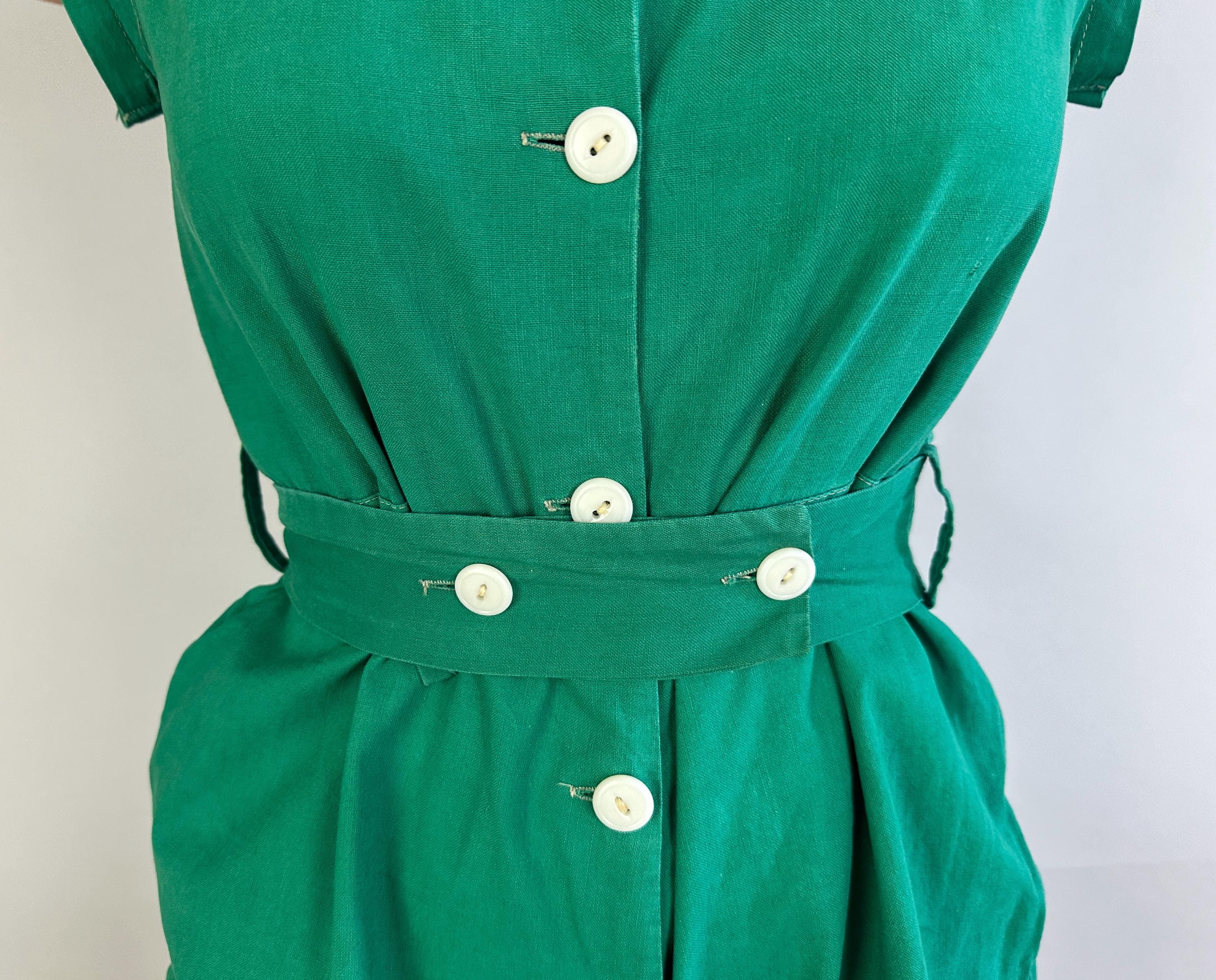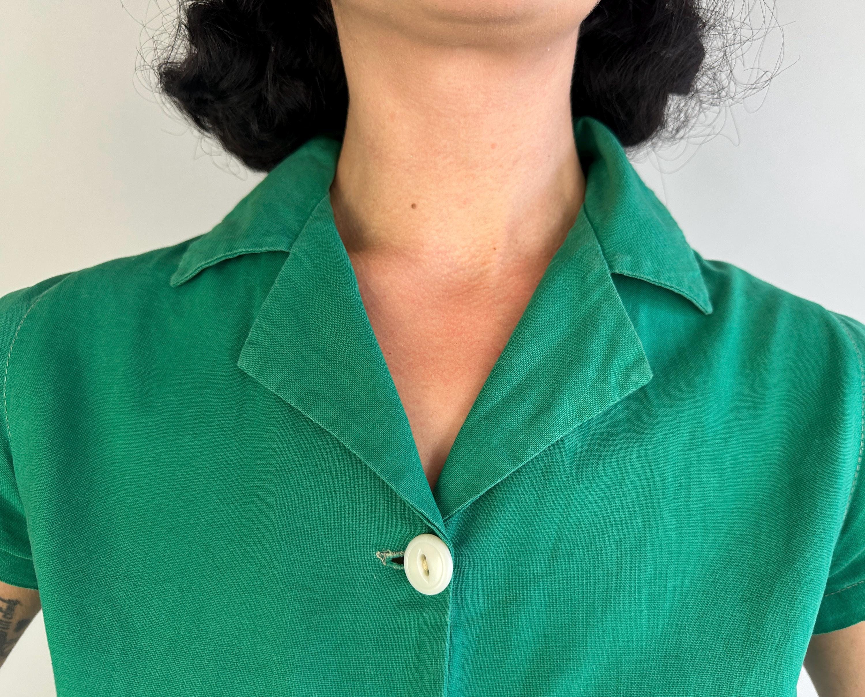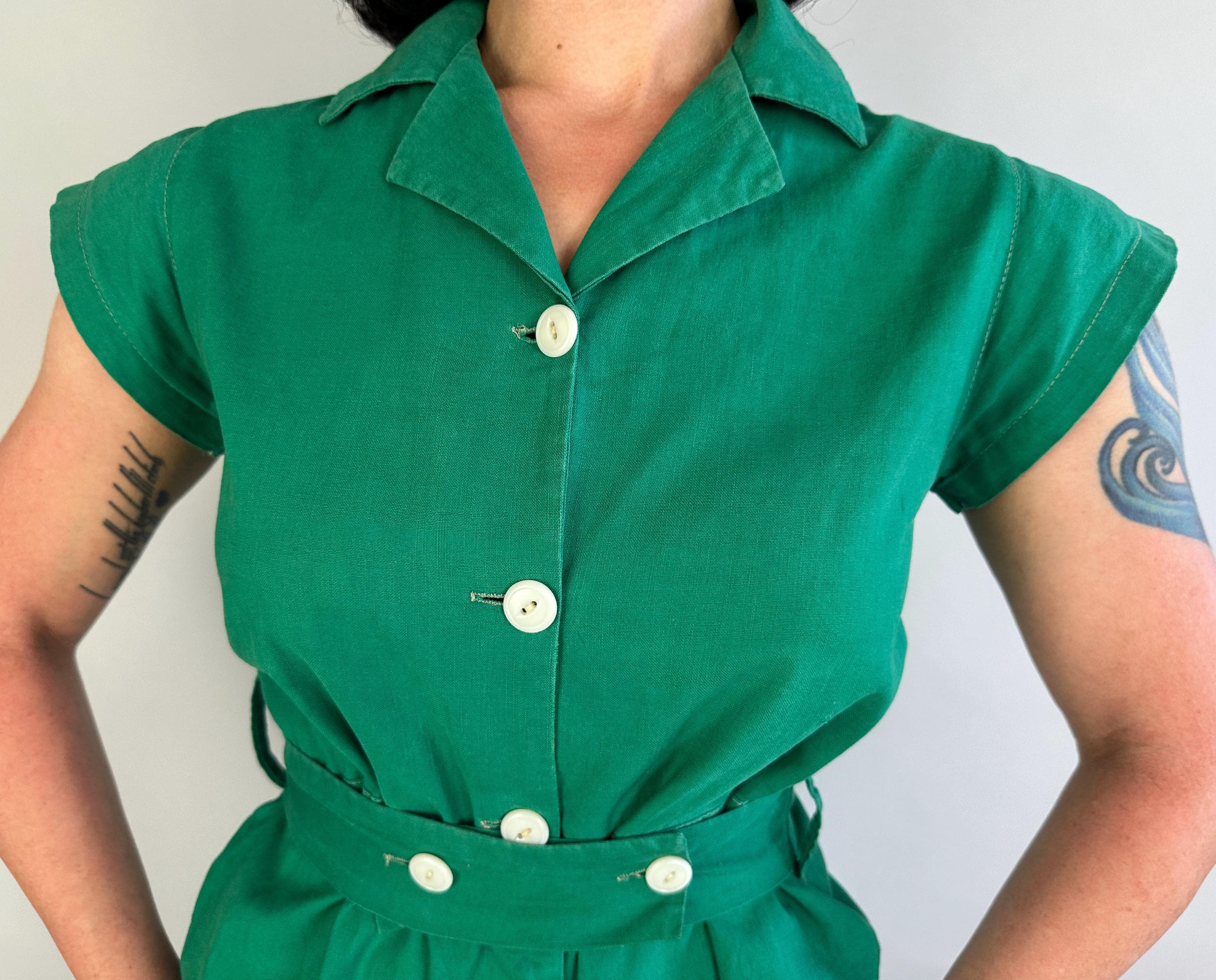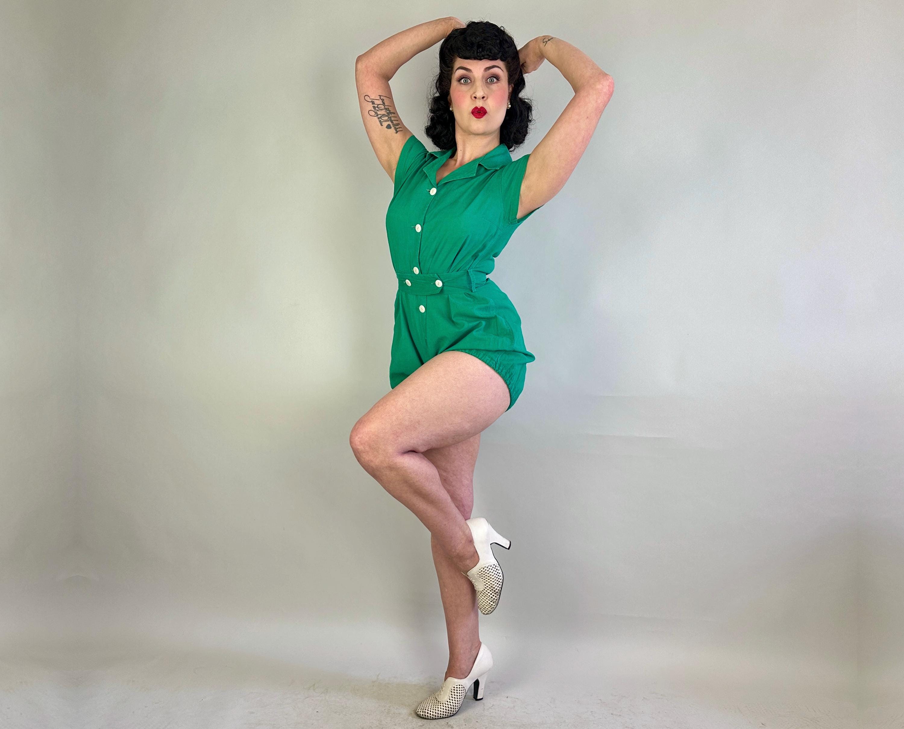 You'll be fun and fit in this 1940s romper! Cotton in a lovely wintergreen makes up this shirtwaist style romper with white cateye buttons adding two tone chicness. With cap sleeves, bloomer style legs, and a cinching belt, this is one of the cutest gym uniforms we've seen! This playsuit is in great vintage condition, with no holes, stains or odors to note.