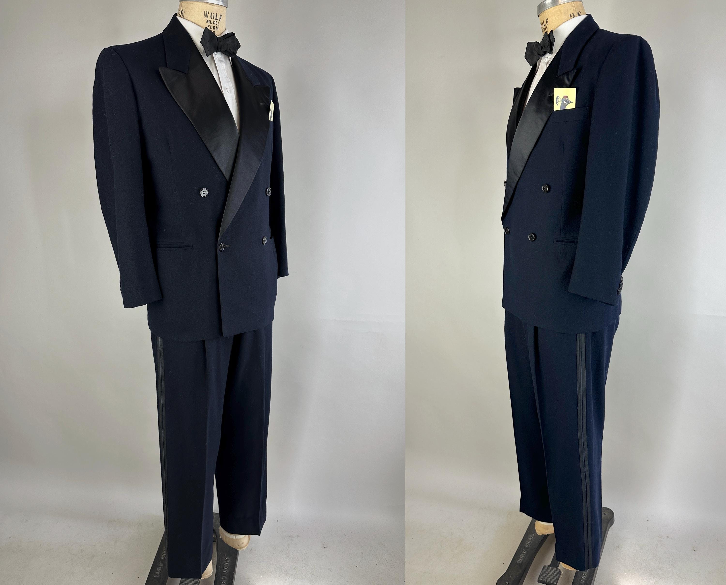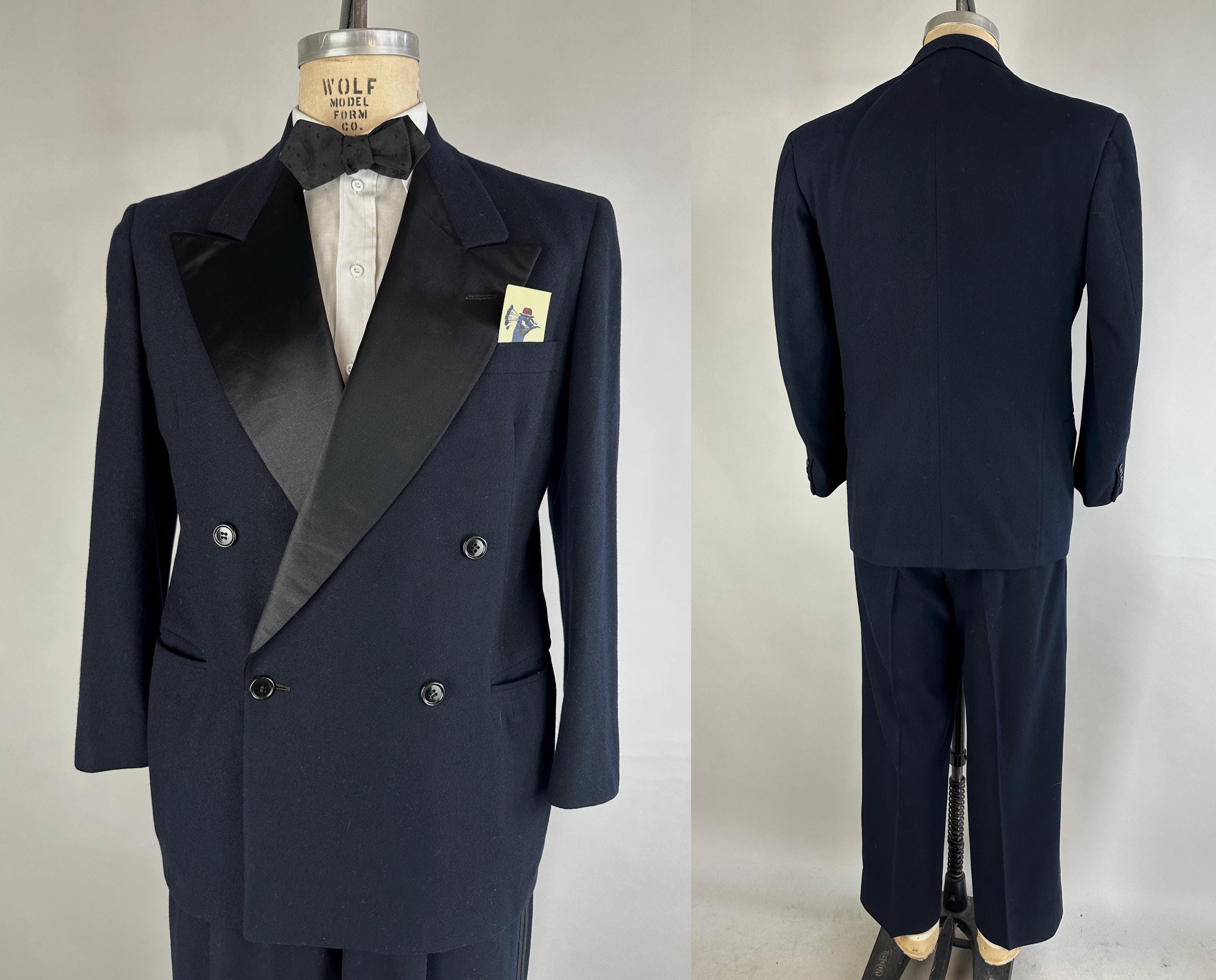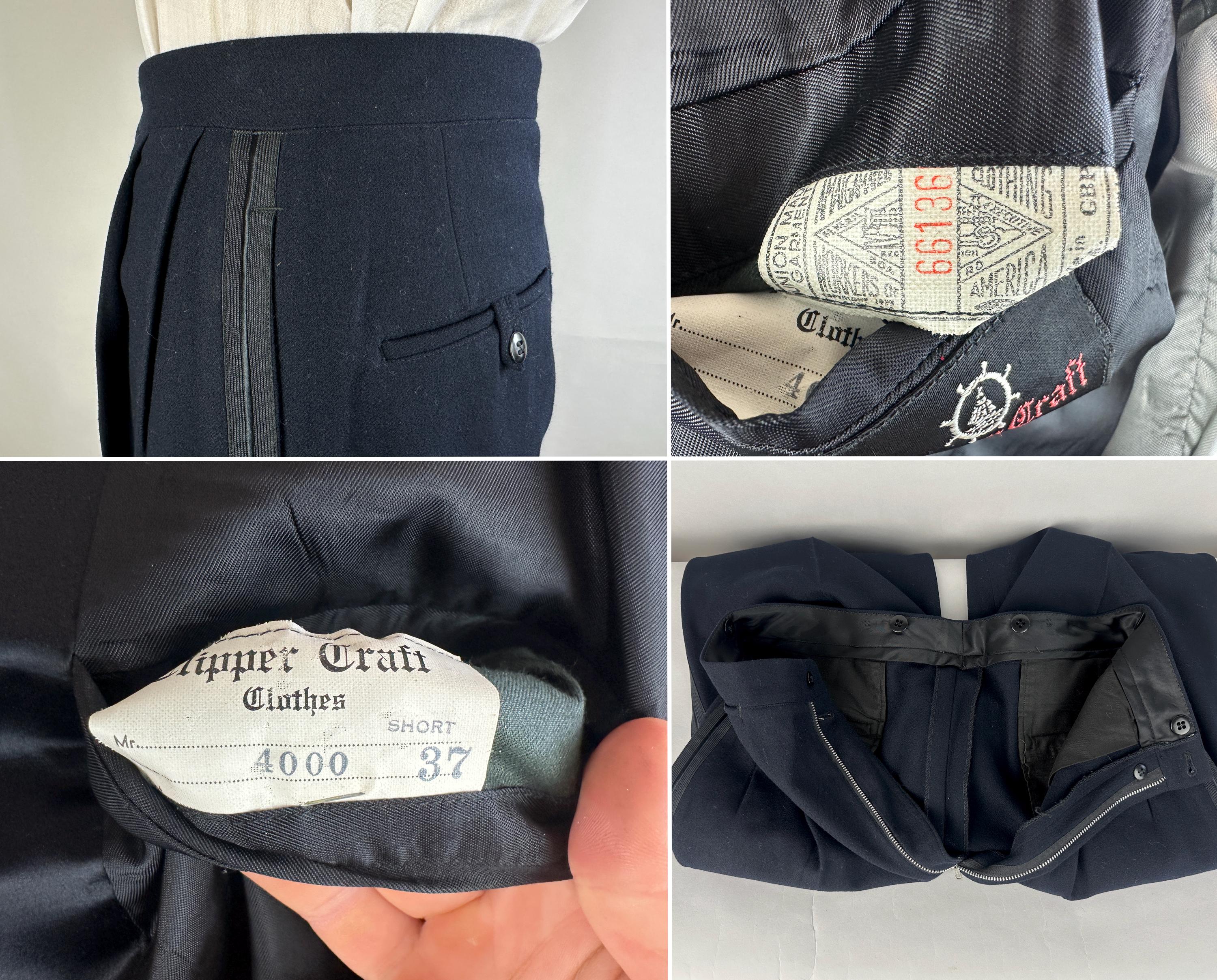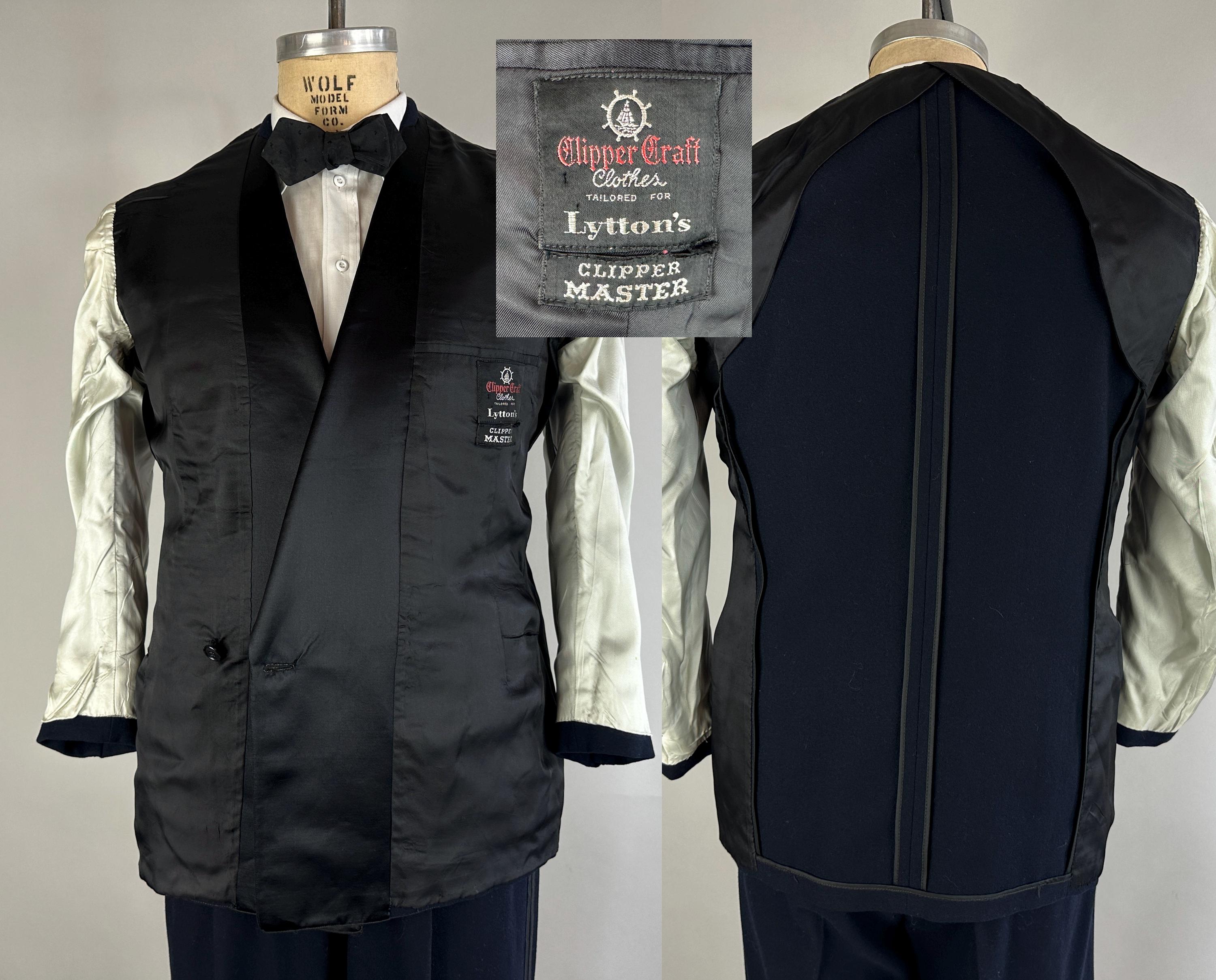 A man in a tux is awlays irresistable so be the heartthrob in this 1940s classic! Luxuriously soft black wool in a double-breasted cut features a 1x4 button closure, wide peak lapels in silk, jetted chest pocket, and two welted hip pockets. With a skeleton lining, fully taped seams, one inner pocket, shoulder pads, and an unvented back. Trousers have a pleated front, silk and braided band stripe down the sides, 5 pockets with one buttoning in the back, metal "Talon" zip fly, and a full set of suspender buttons. By "Clipper Craft" and marked "Clipper Master" 1939-48 Union Label dates this suit to the 1940s. This suit is in great vintage condition, with no holes, stains, odors to note.