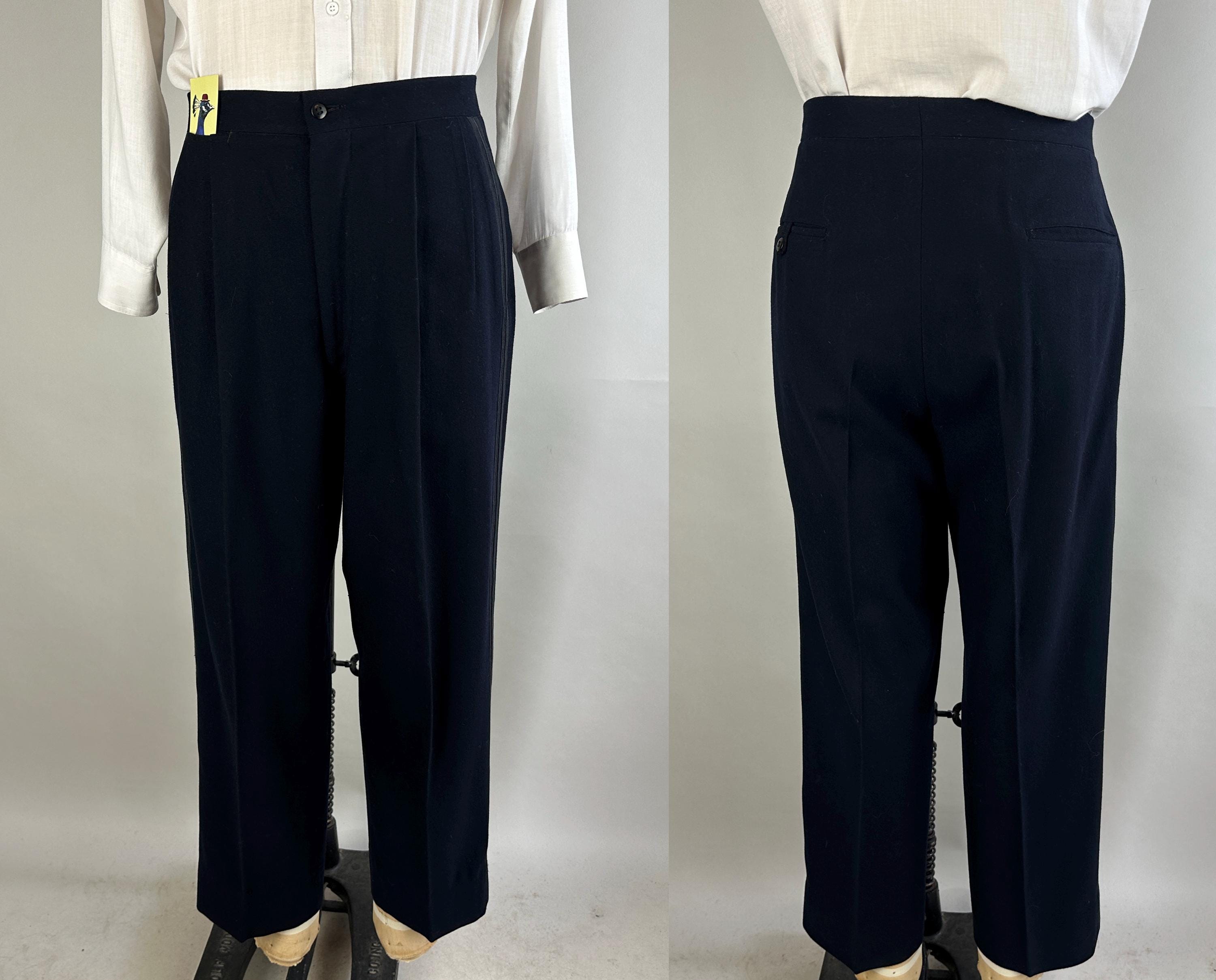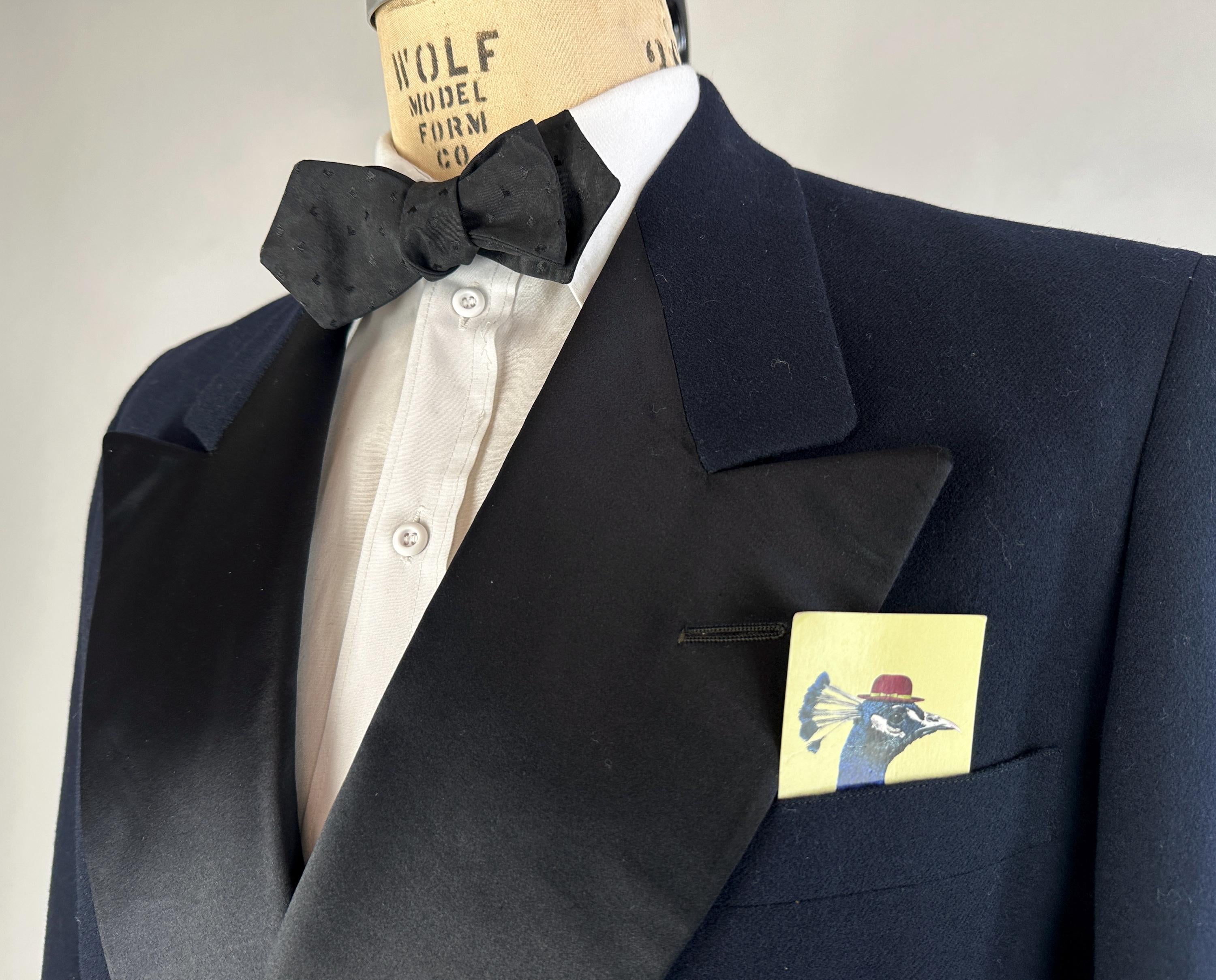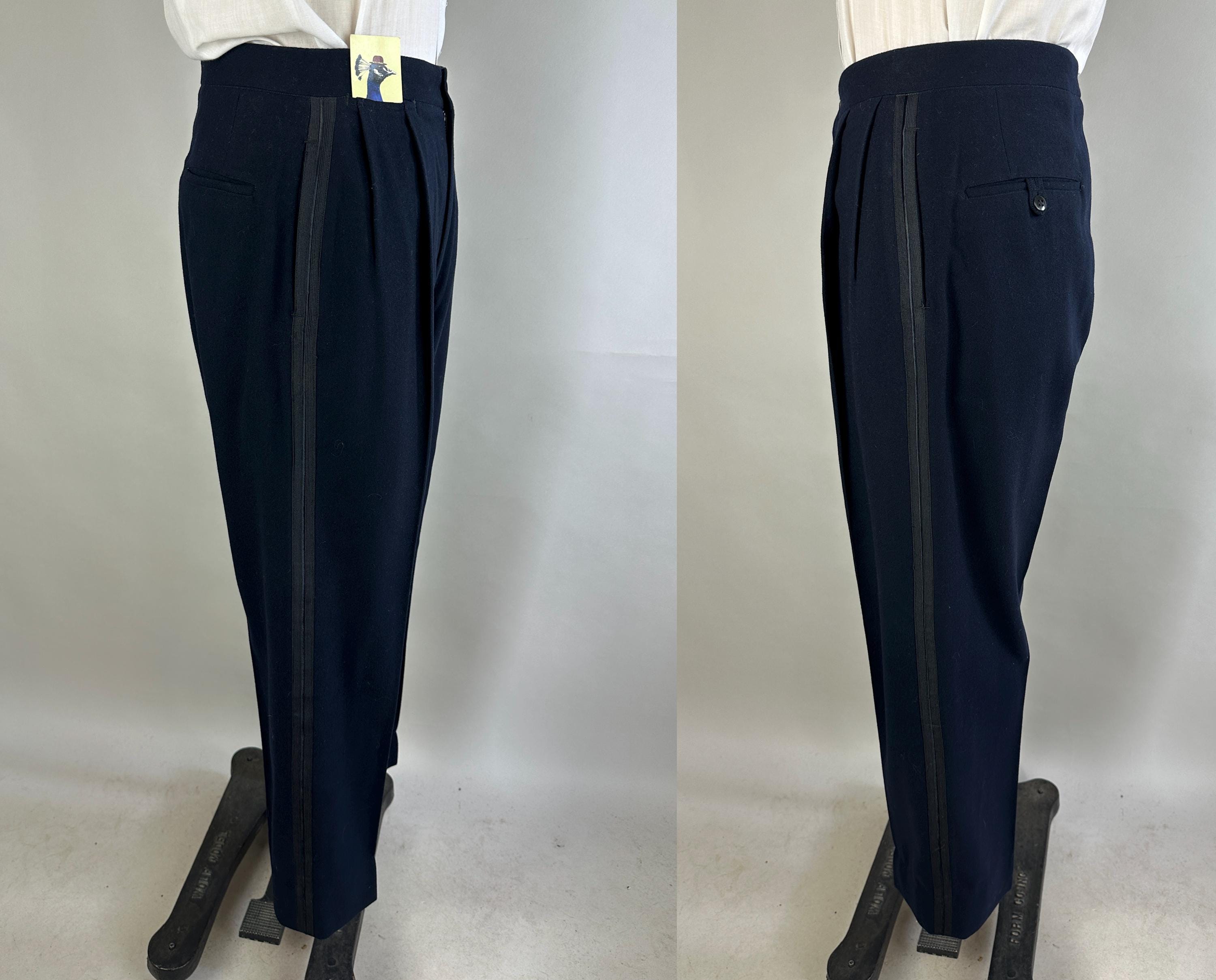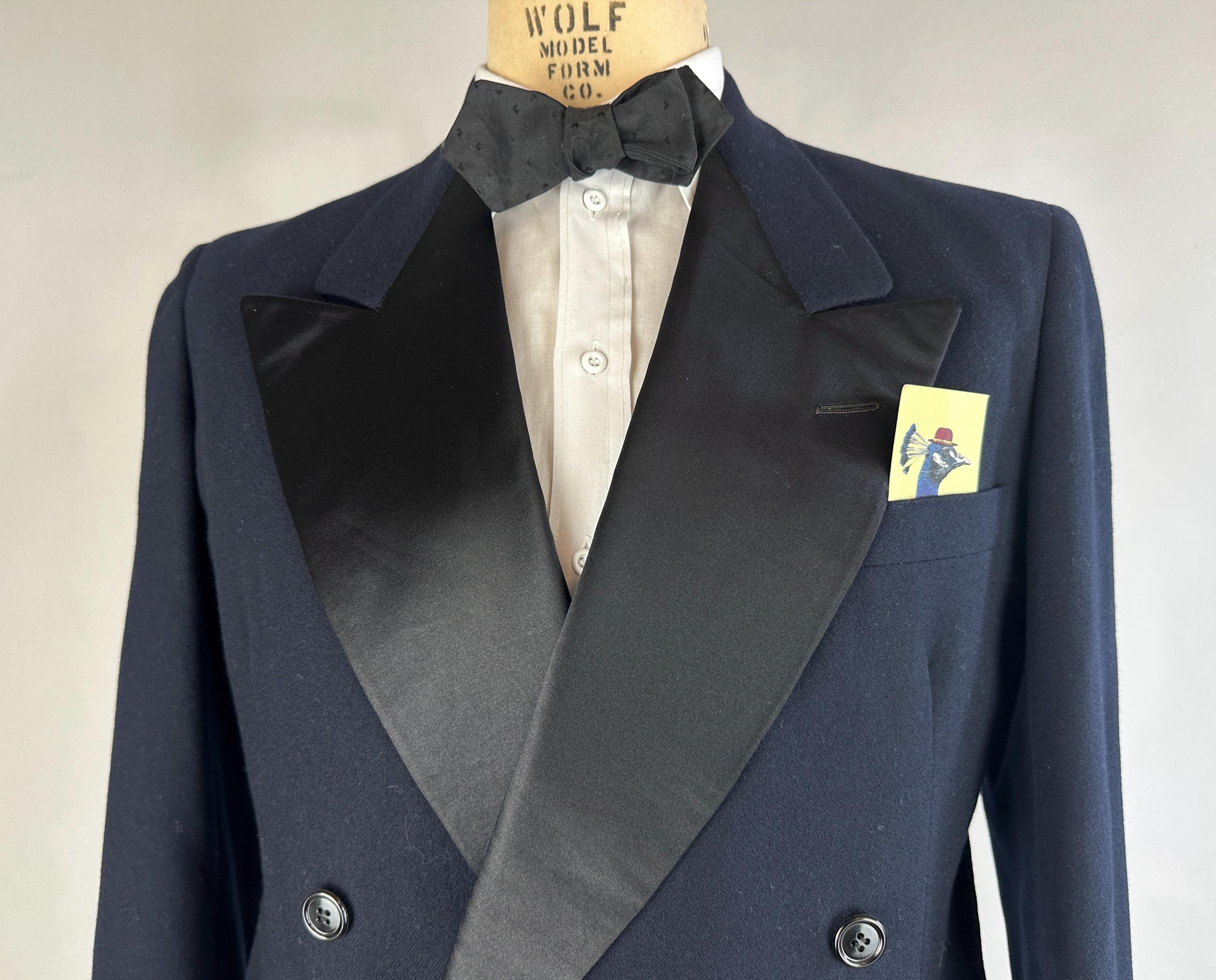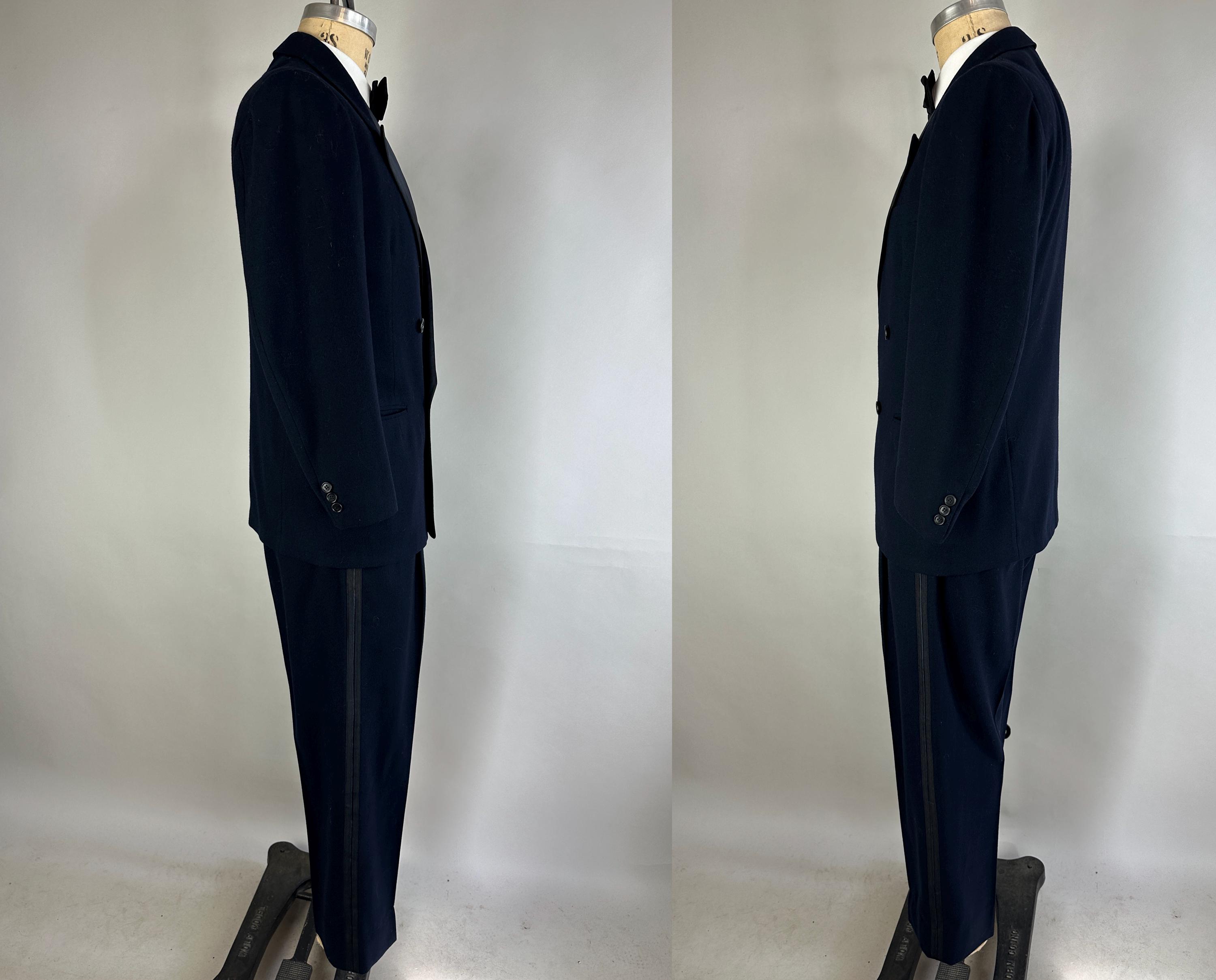 A man in a tux is awlays irresistable so be the heartthrob in this 1940s classic! Luxuriously soft black wool in a double-breasted cut features a 1x4 button closure, wide peak lapels in silk, jetted chest pocket, and two welted hip pockets. With a skeleton lining, fully taped seams, one inner pocket, shoulder pads, and an unvented back. Trousers have a pleated front, silk and braided band stripe down the sides, 5 pockets with one buttoning in the back, metal "Talon" zip fly, and a full set of suspender buttons. By "Clipper Craft" and marked "Clipper Master" 1939-48 Union Label dates this suit to the 1940s. This suit is in great vintage condition, with no holes, stains, odors to note.