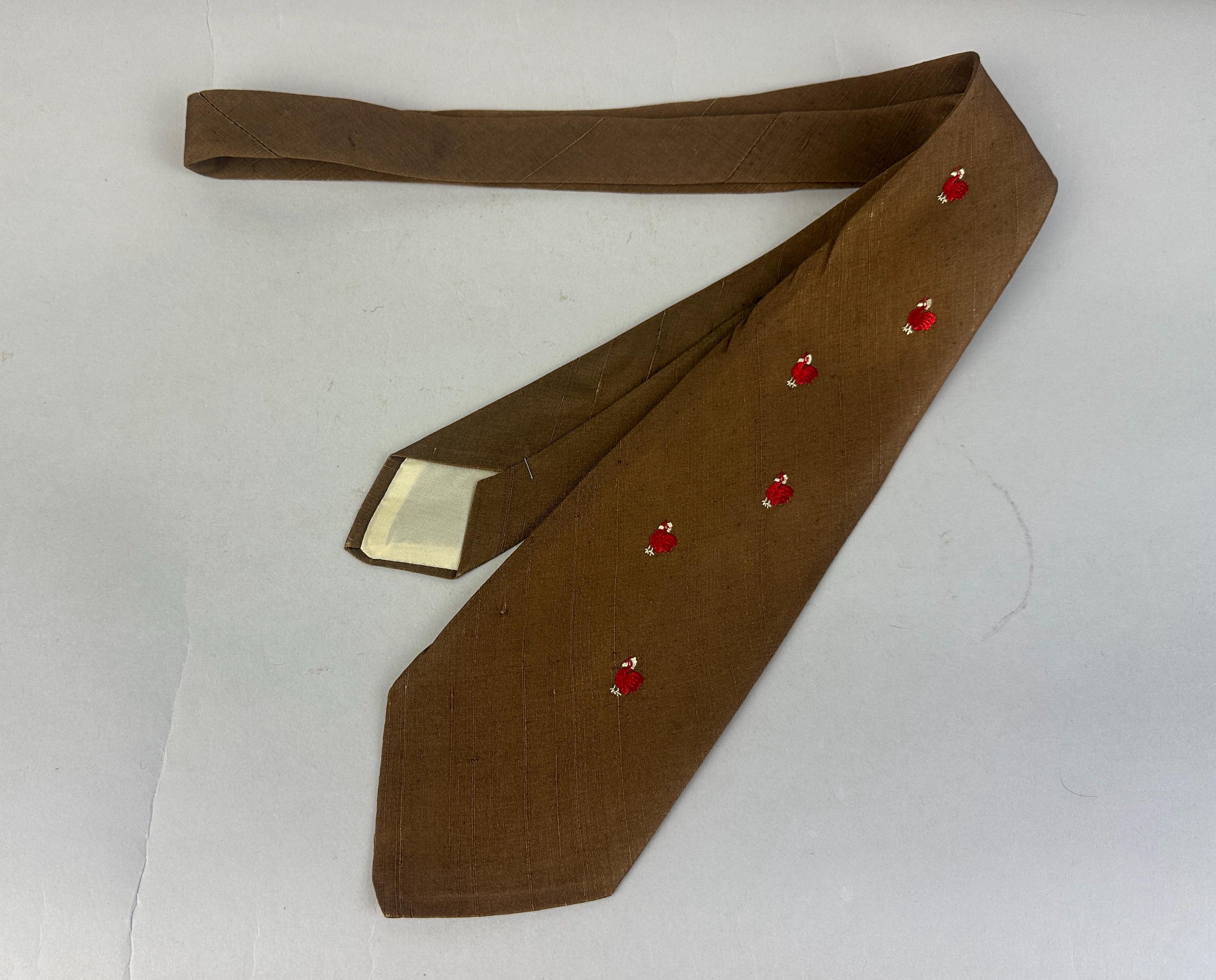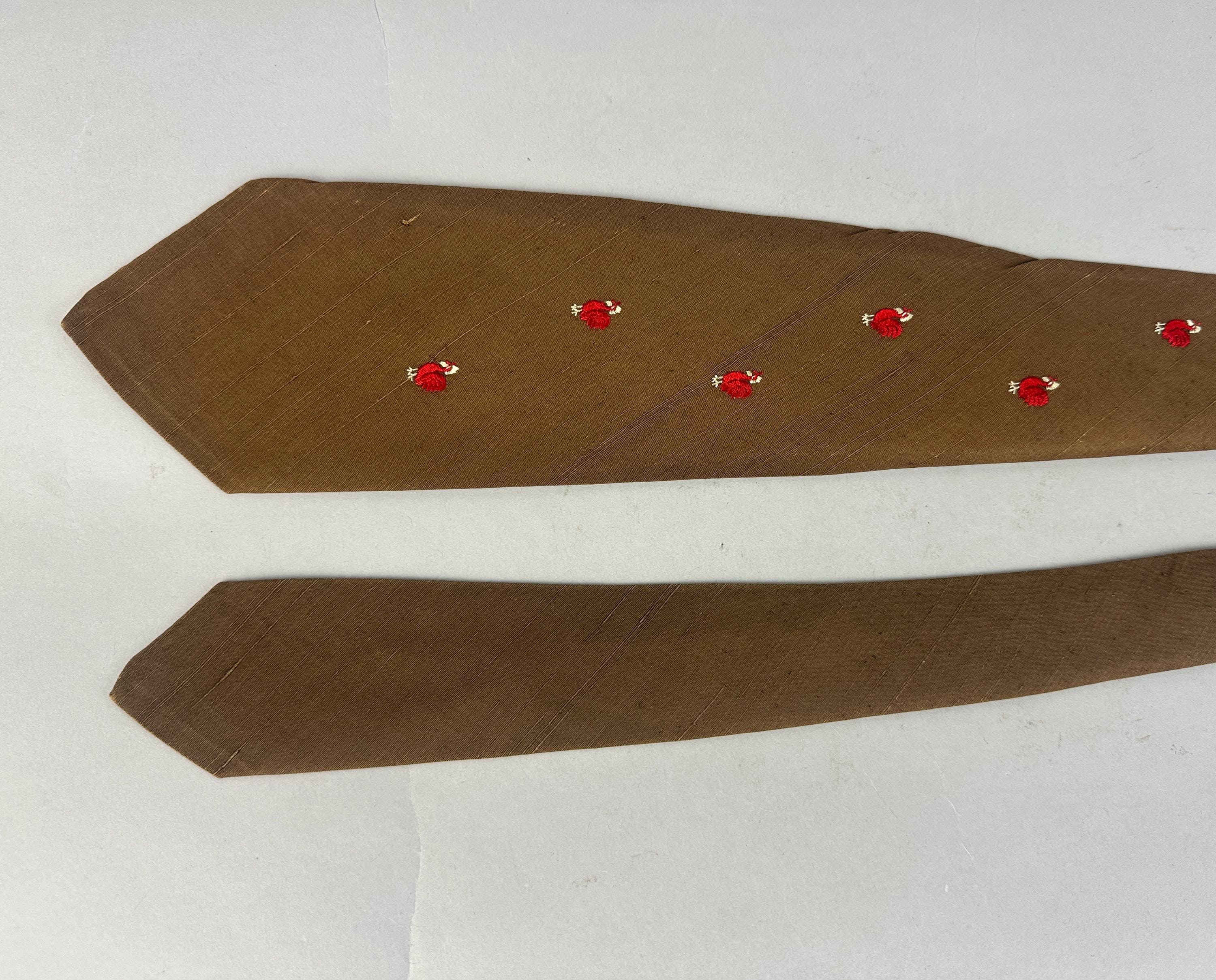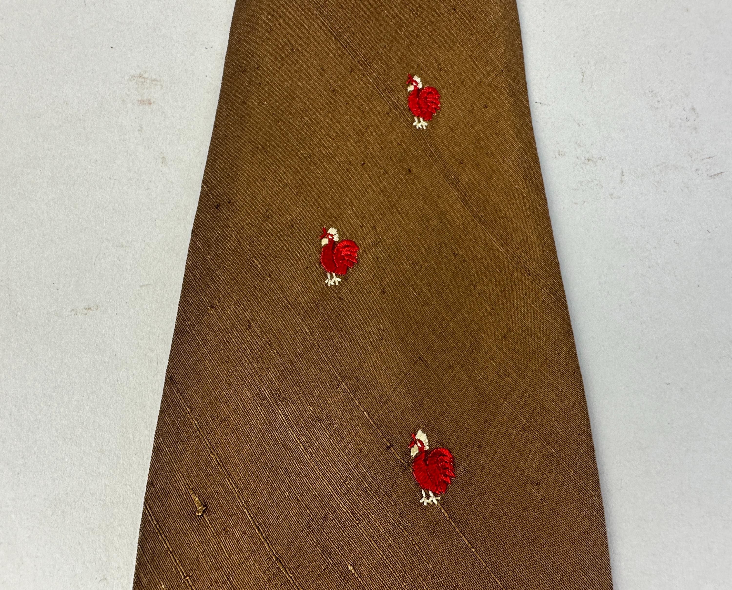 Even if the sky is falling, you'll be well dressed for it with this 1940s necktie! The tarnished copper brown silk tie has a slub texture that runs on the bias and novel embroidery of chickens in white and scarlet. Fully lined. Pairs well with a wide variety of Art Deco and Mid-Century suit colors and fabric types. Fully lined. This tie is in great vintage condition with no flaws found!