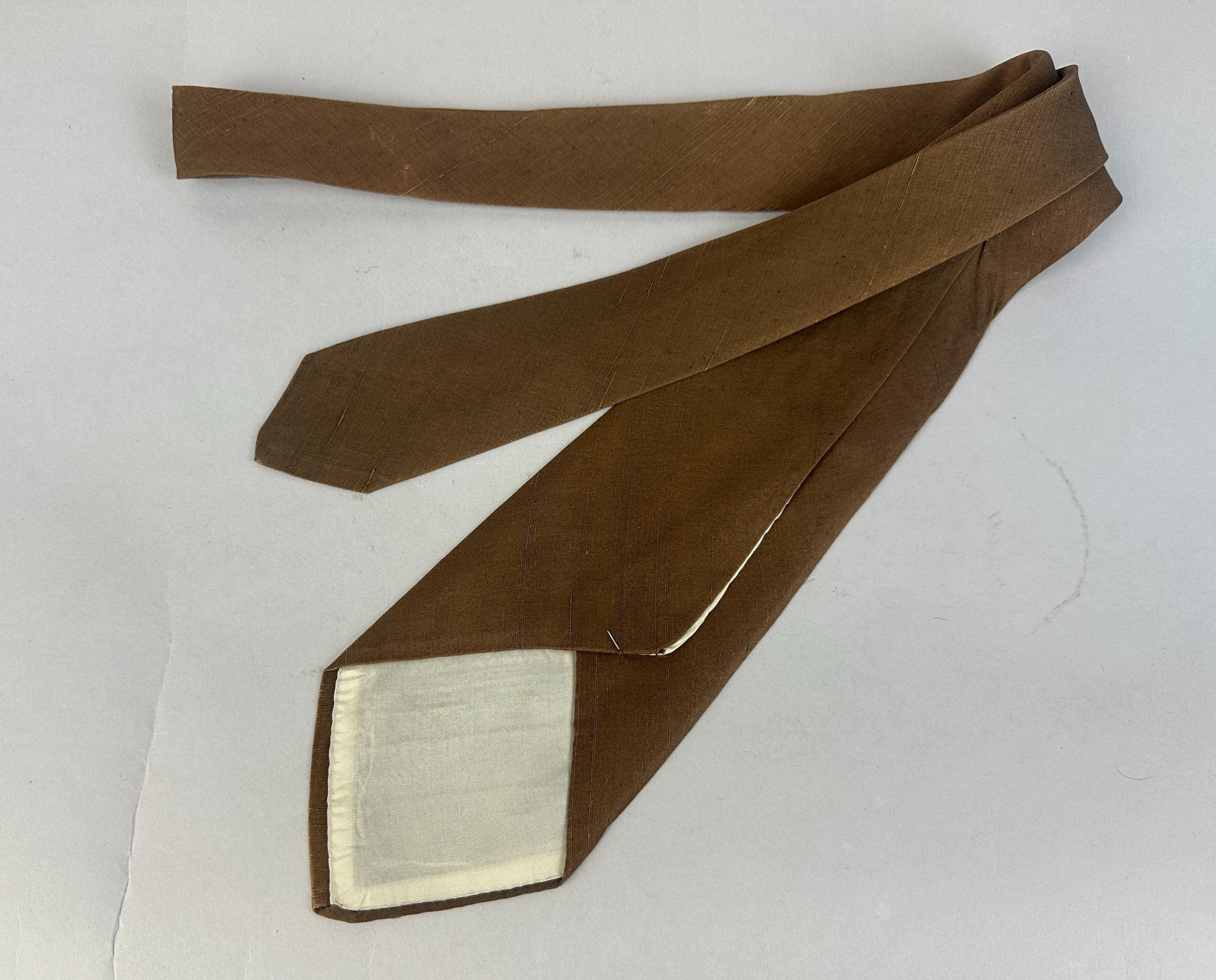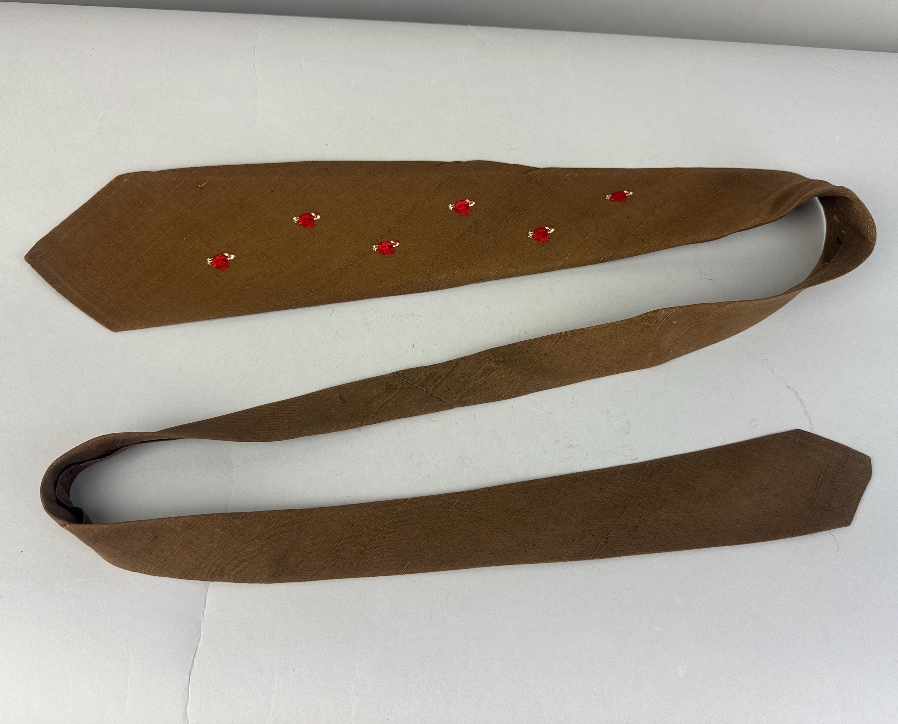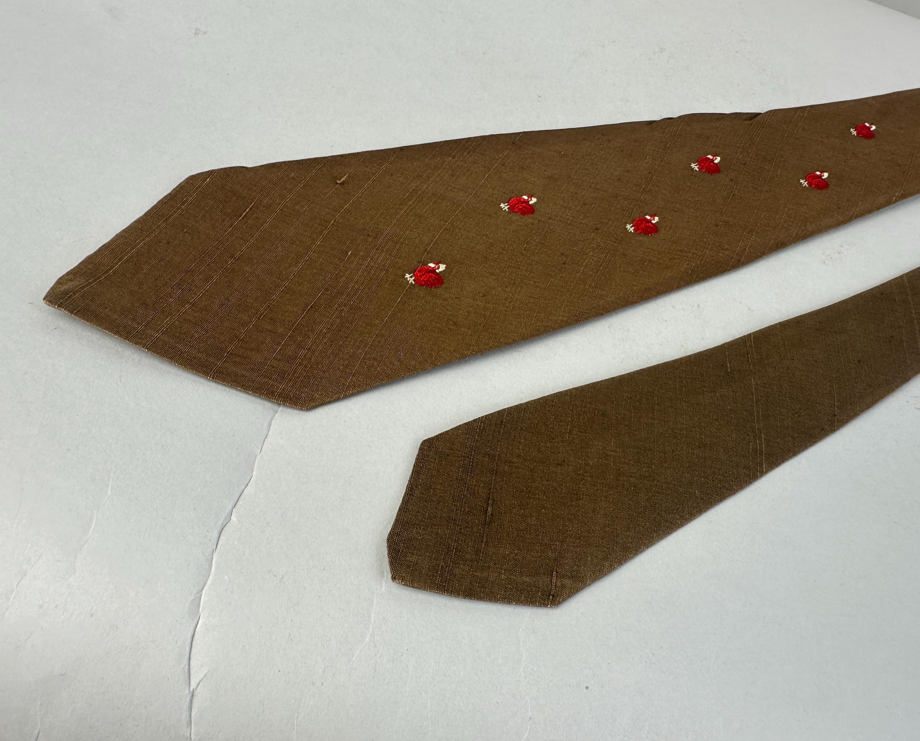Even if the sky is falling, you'll be well dressed for it with this 1940s necktie! The tarnished copper brown silk tie has a slub texture that runs on the bias and novel embroidery of chickens in white and scarlet. Fully lined. Pairs well with a wide variety of Art Deco and Mid-Century suit colors and fabric types. Fully lined. This tie is in great vintage condition with no flaws found!