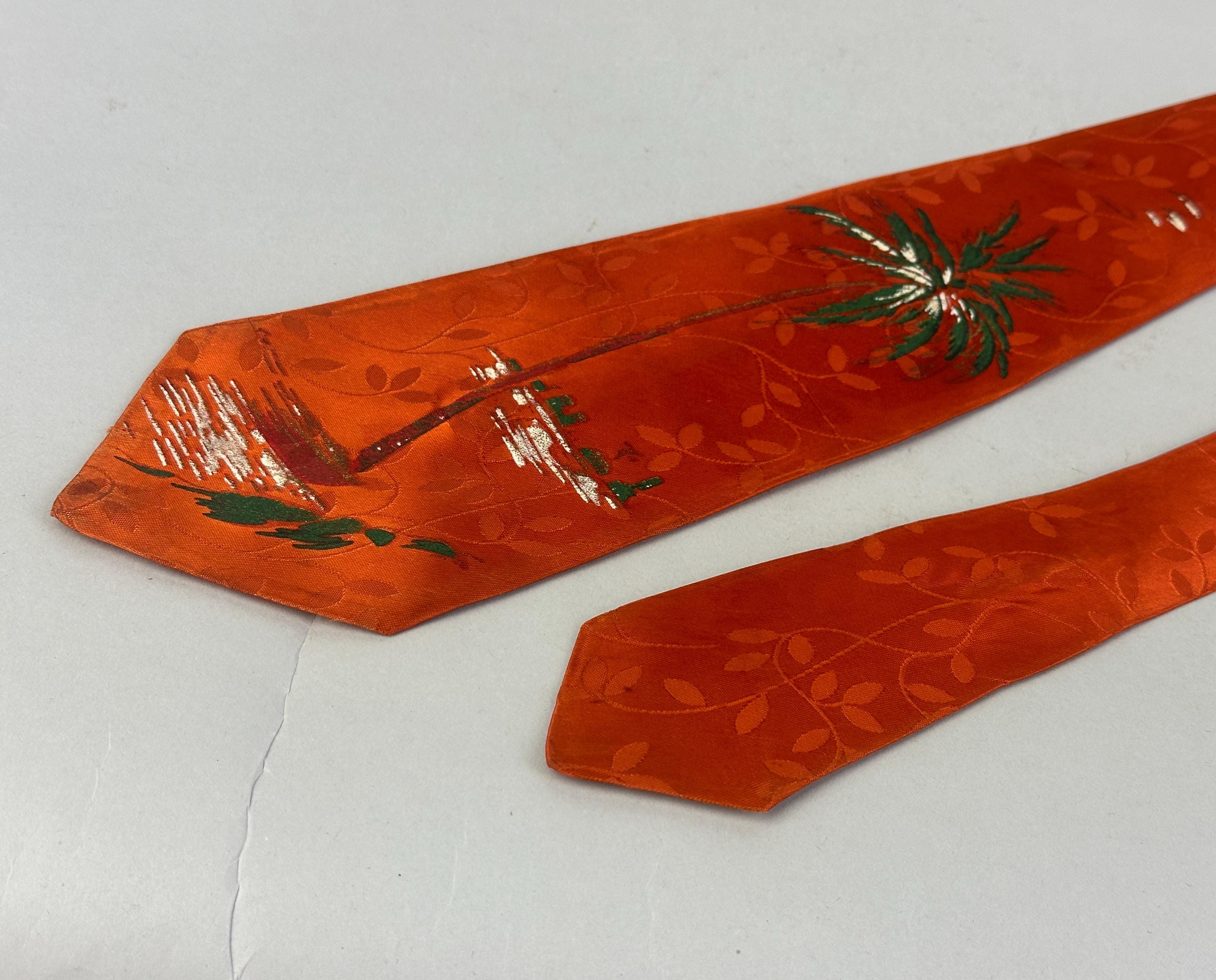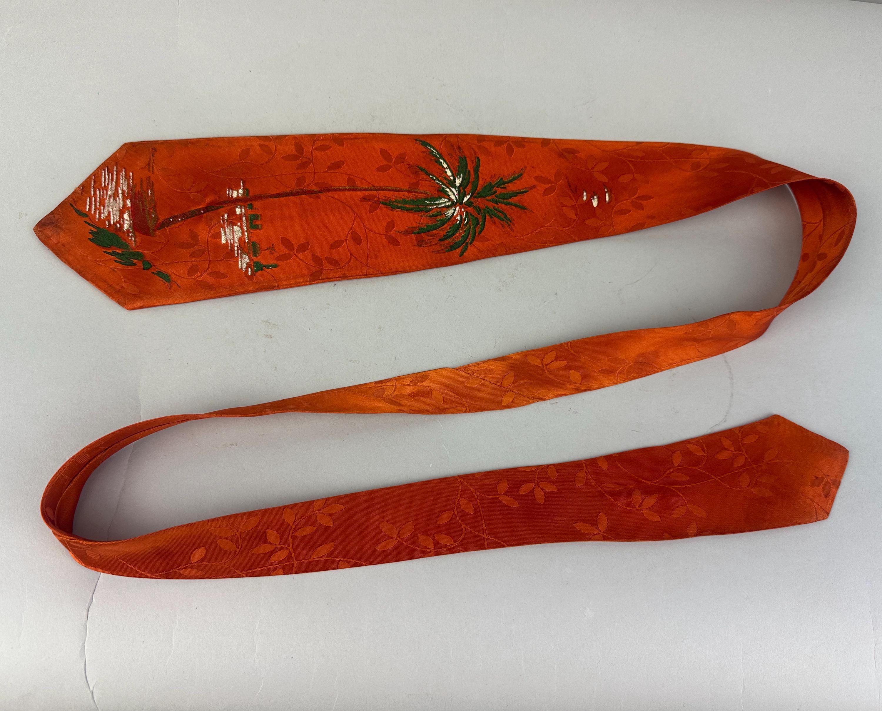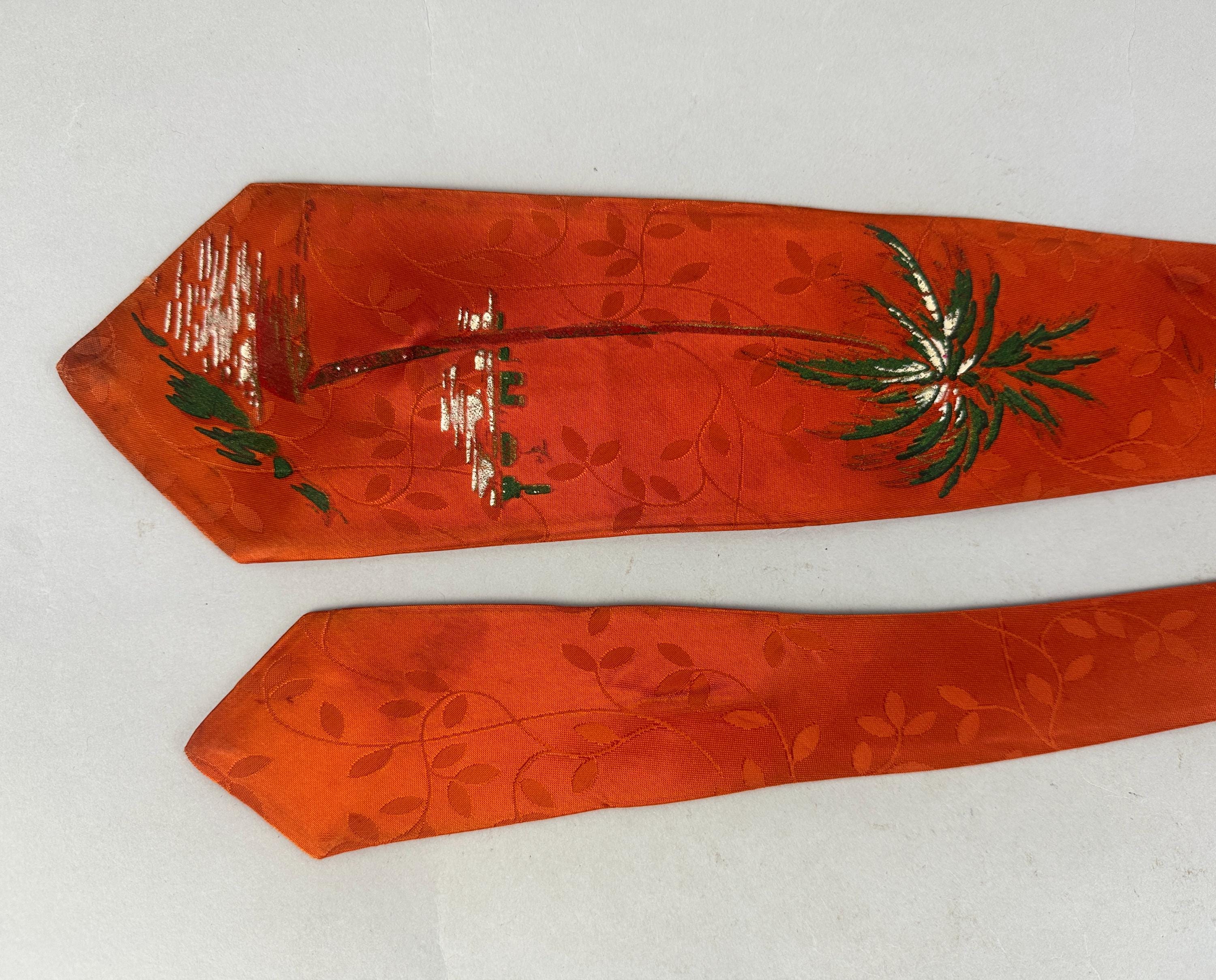 Grab a Mai Tai and watch the sunset dressed to impress with this 1940s necktie! Rayon satin with a vine and leaf background weave makes a statement in bold sunset orange. Made unique by the individually hand painted scene of palm tree with water reflections in white, pine green, crimson, and gold. Fully lined. Pairs well with a wide variety of Art Deco and Mid-Century suit colors and fabric types. This tie is in good vintage condition, a little subtle discoloration where the tie narrows but no other flaws to note.