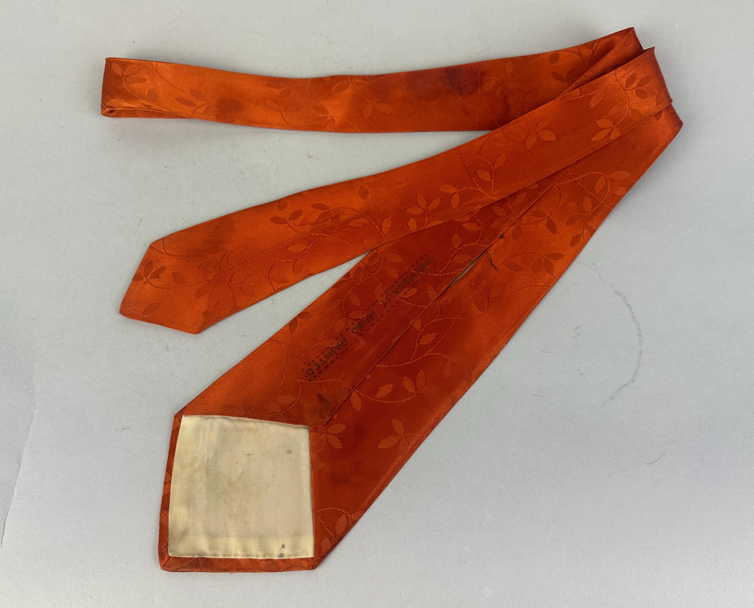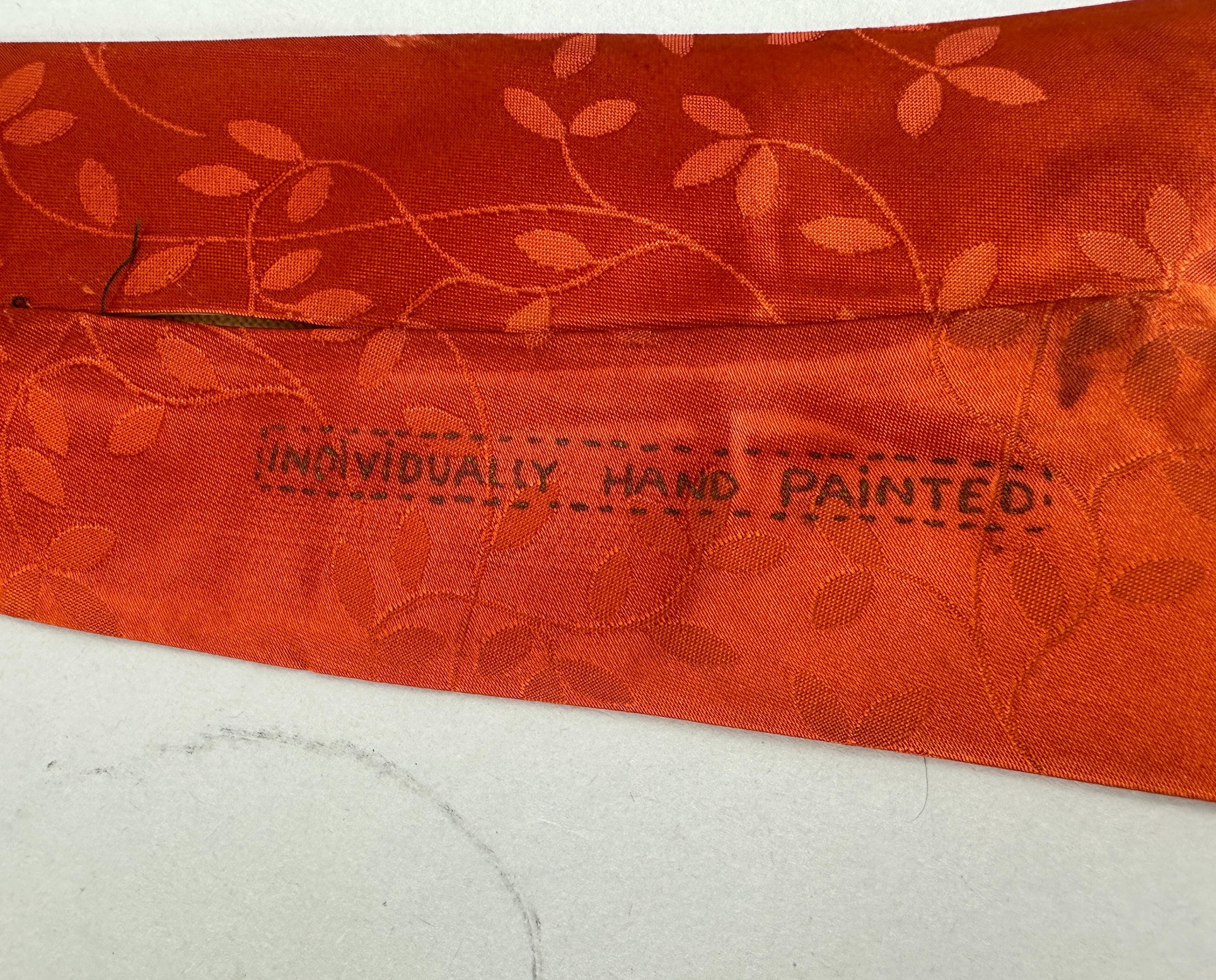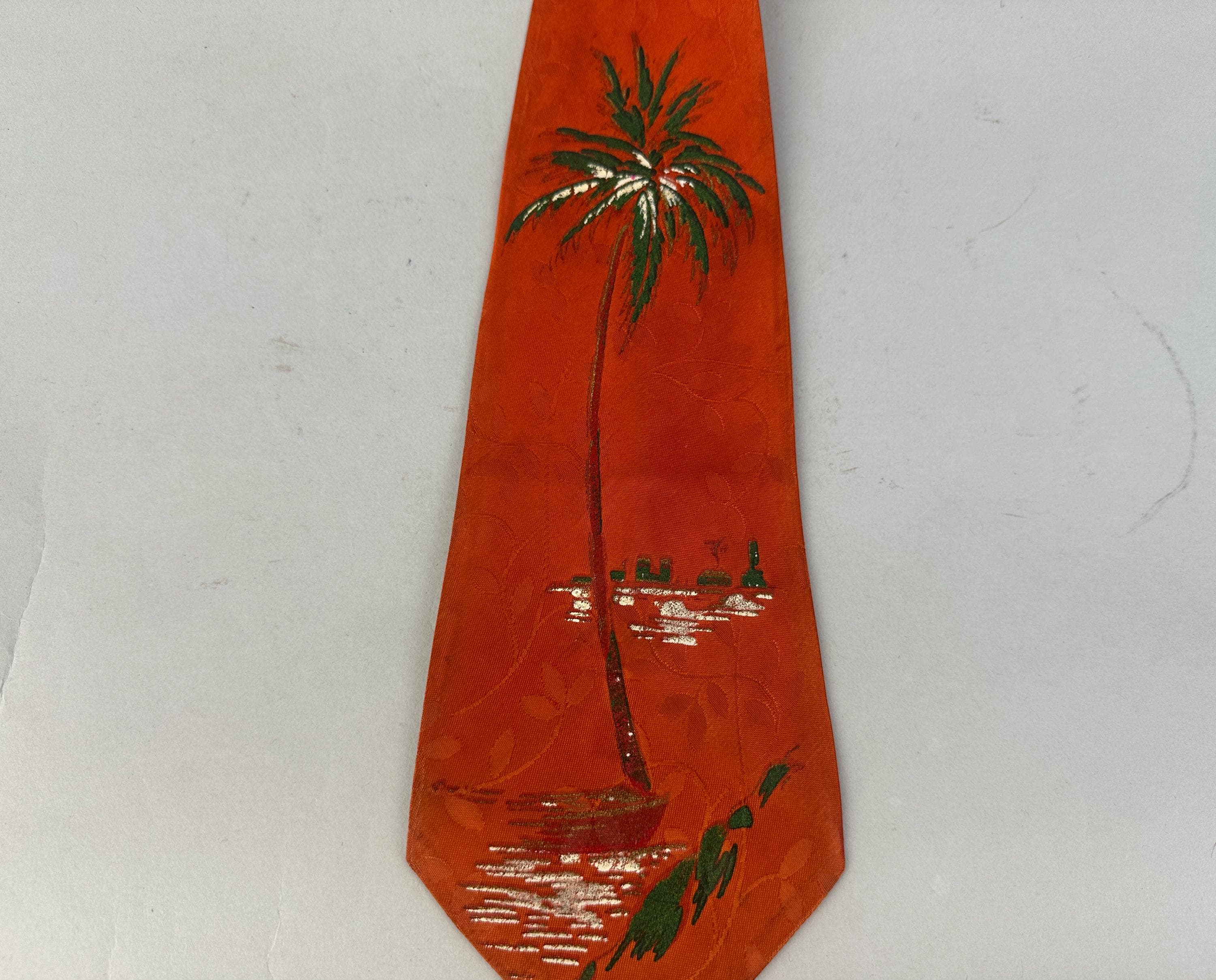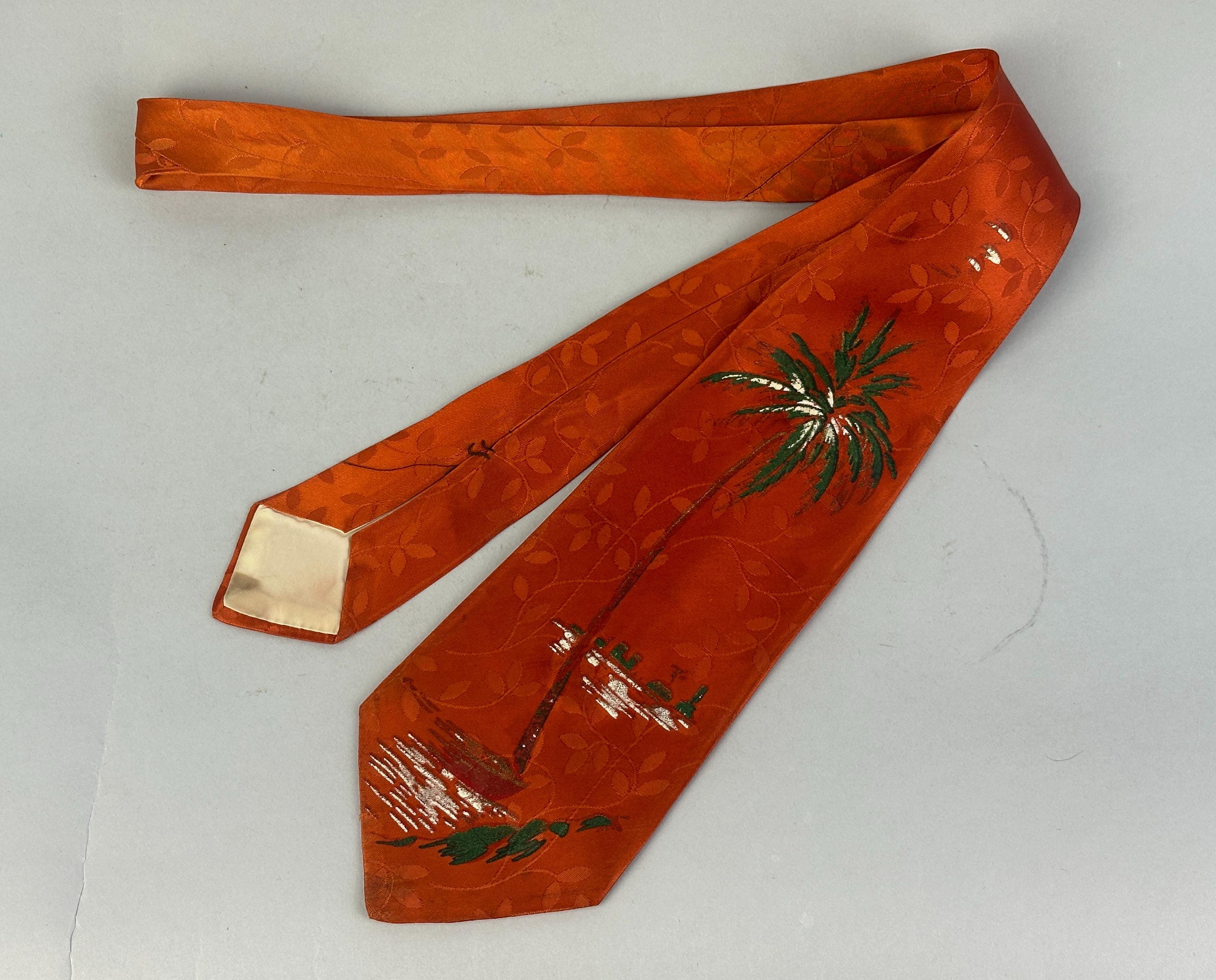 Grab a Mai Tai and watch the sunset dressed to impress with this 1940s necktie! Rayon satin with a vine and leaf background weave makes a statement in bold sunset orange. Made unique by the individually hand painted scene of palm tree with water reflections in white, pine green, crimson, and gold. Fully lined. Pairs well with a wide variety of Art Deco and Mid-Century suit colors and fabric types. This tie is in good vintage condition, a little subtle discoloration where the tie narrows but no other flaws to note.
