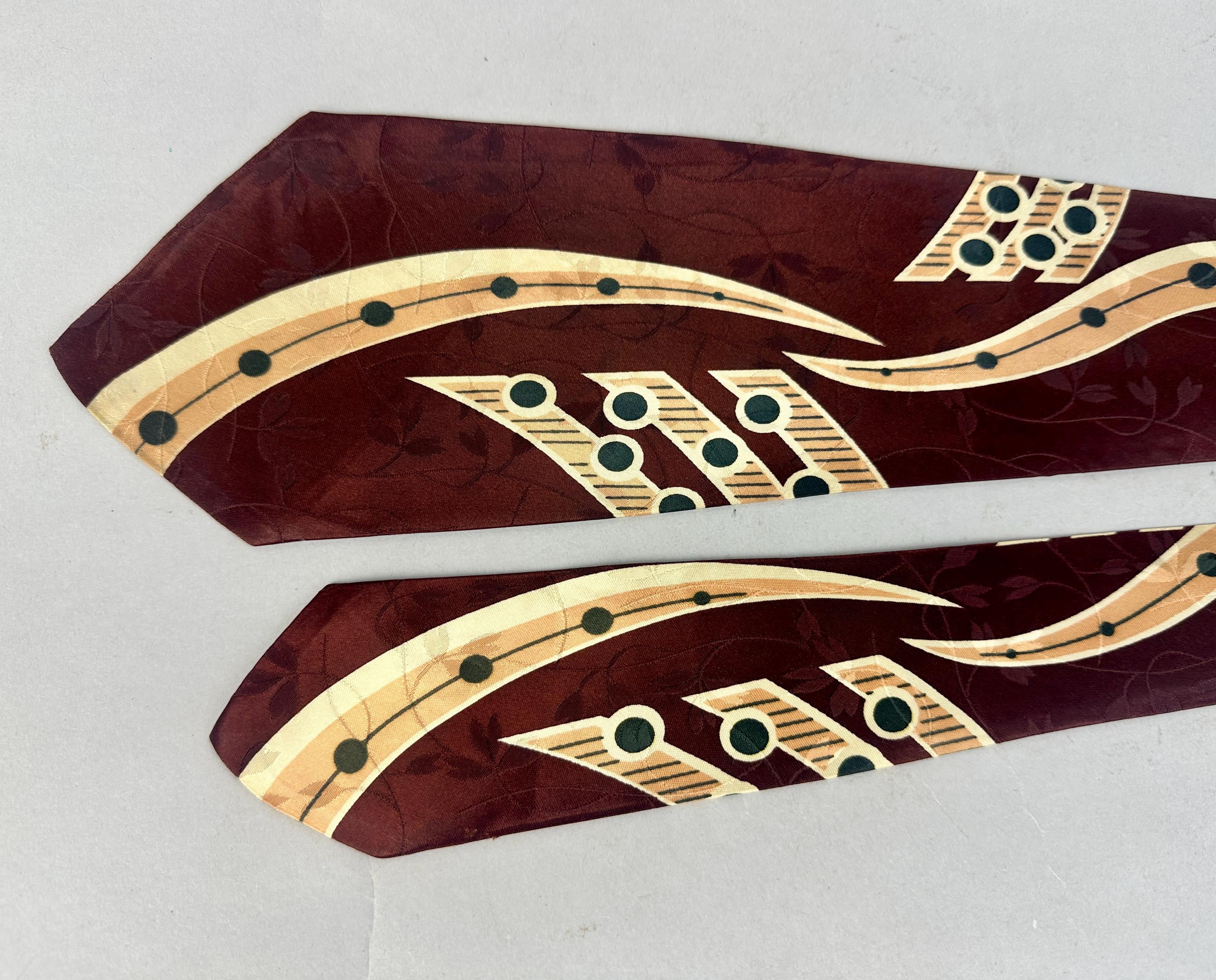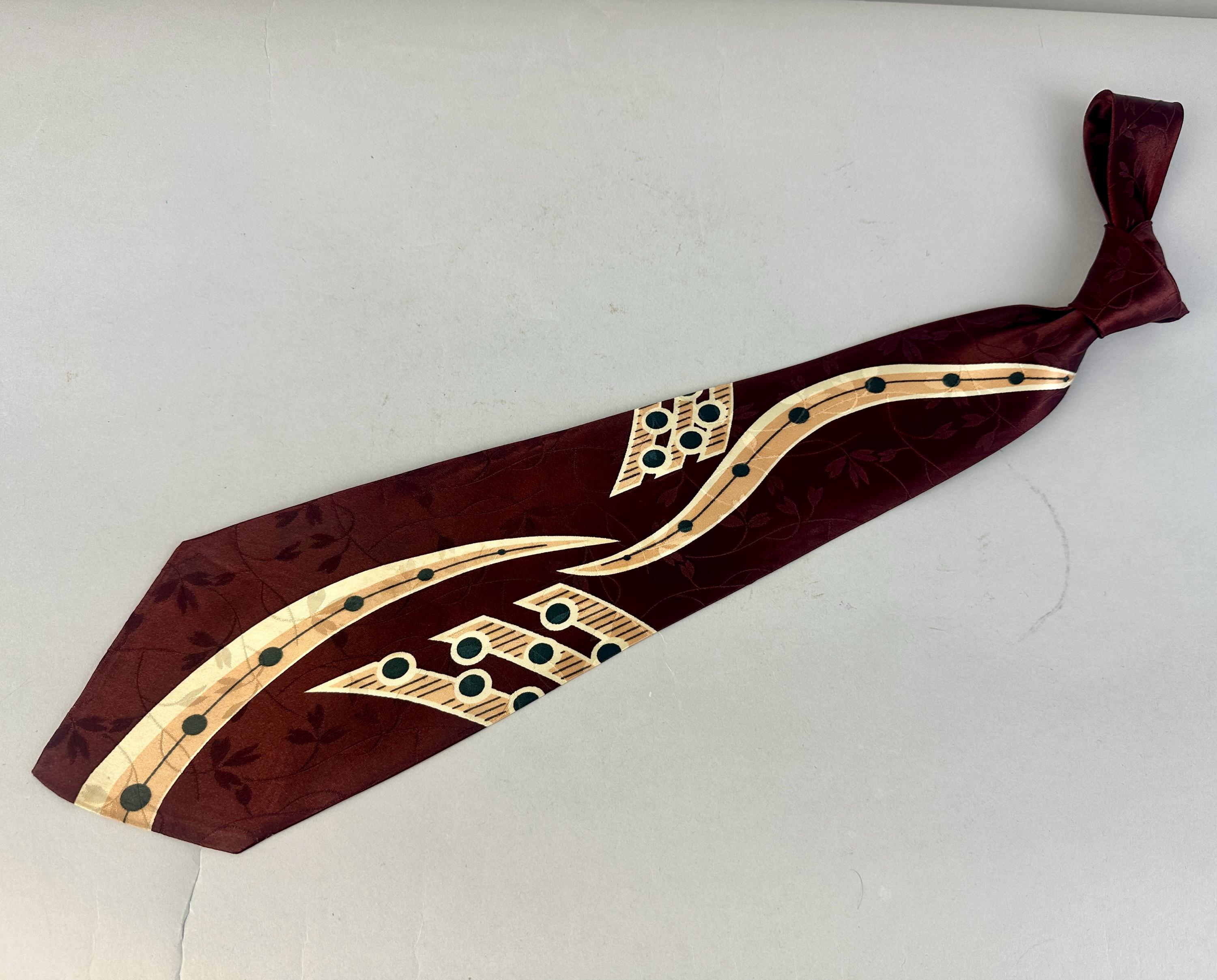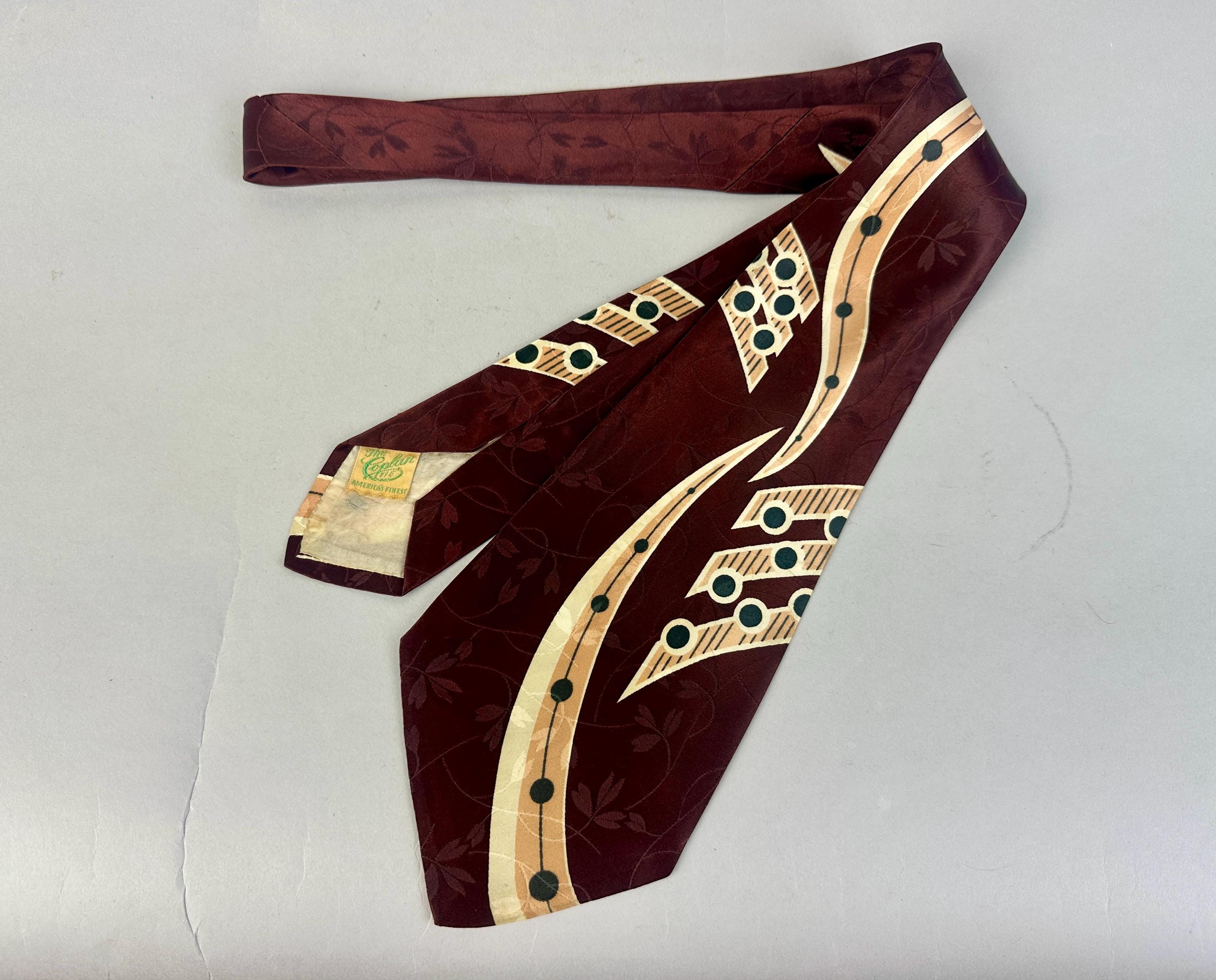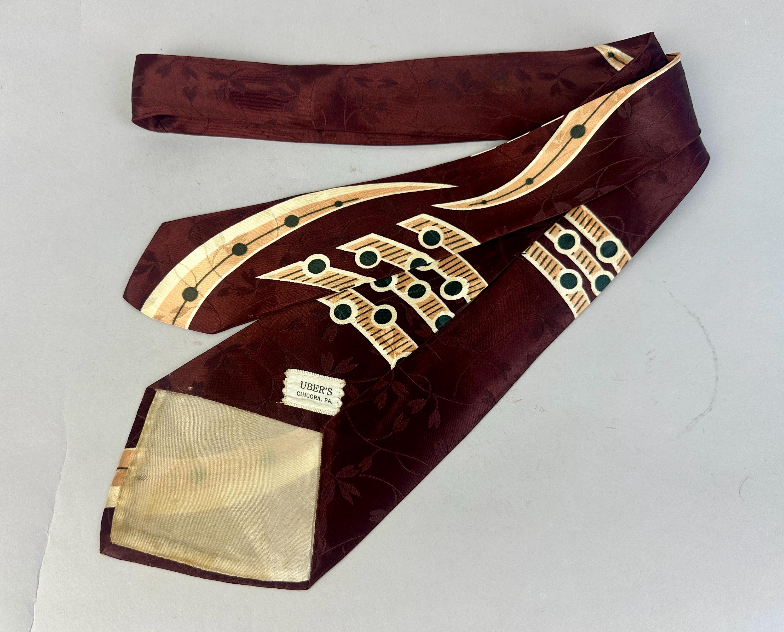 Make beautiful music by dressing just right with this 1940s necktie! The tie is made of rayon satin in a deep warm mahogany with a background weave of leaves and vines. Pine green, peach, and ivory make a pseudo-music chart with notation imagery. Fully lined and labeled "The Coplan Tie" and "Uber's". Pairs well with a wide variety of Art Deco and Mid-Century suit colors and fabric types. This tie is in great vintage condition with no holes, stains, or odors to note.