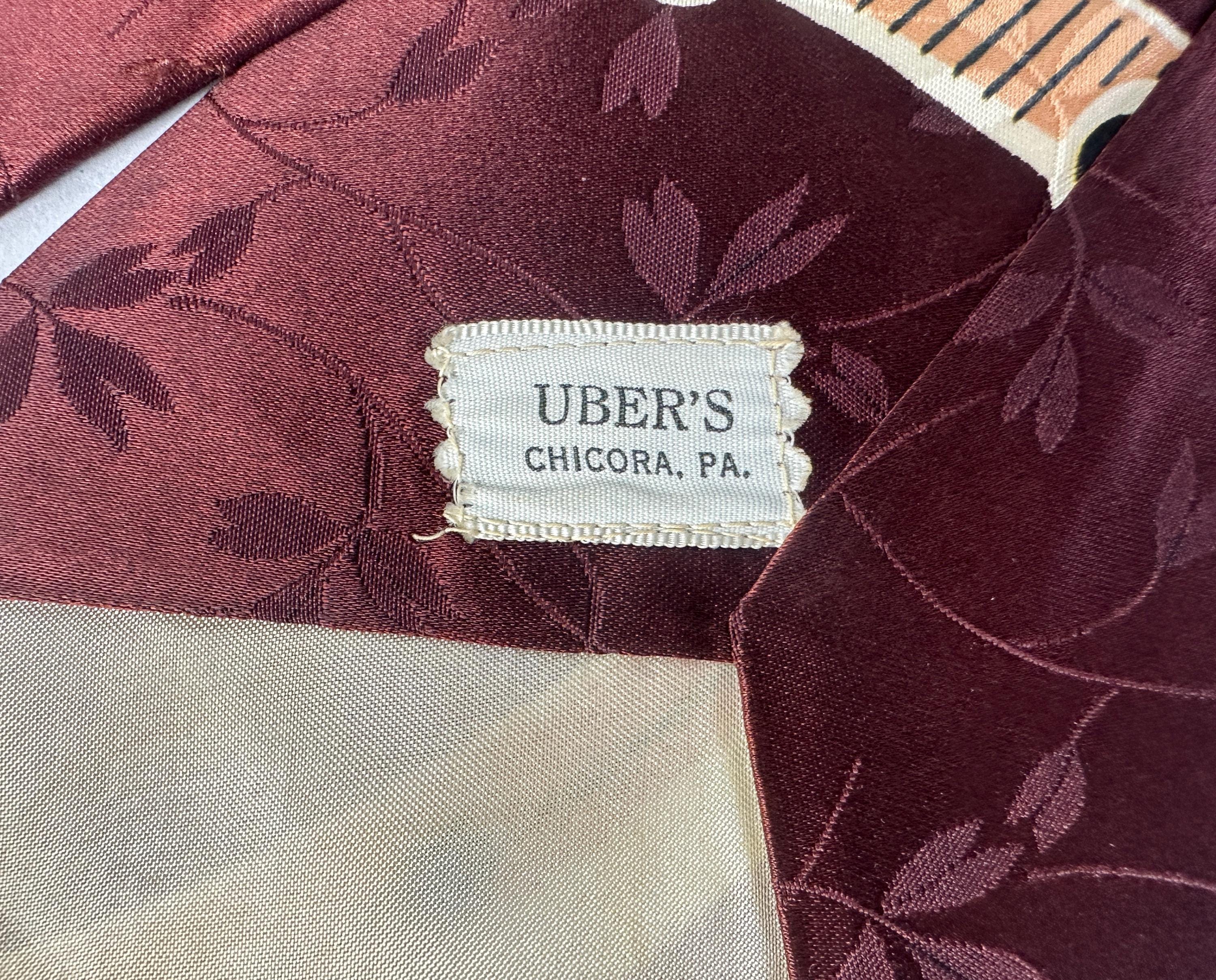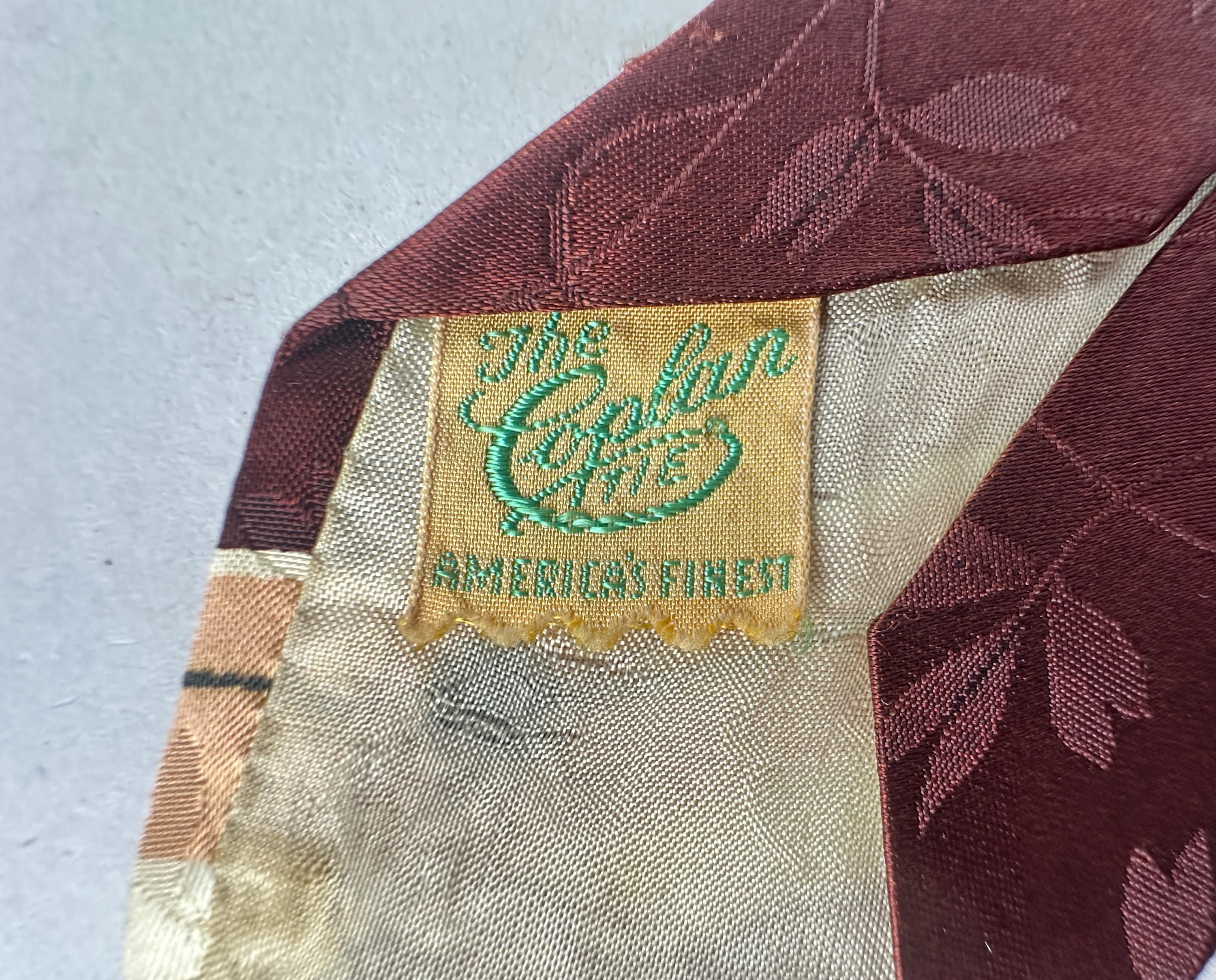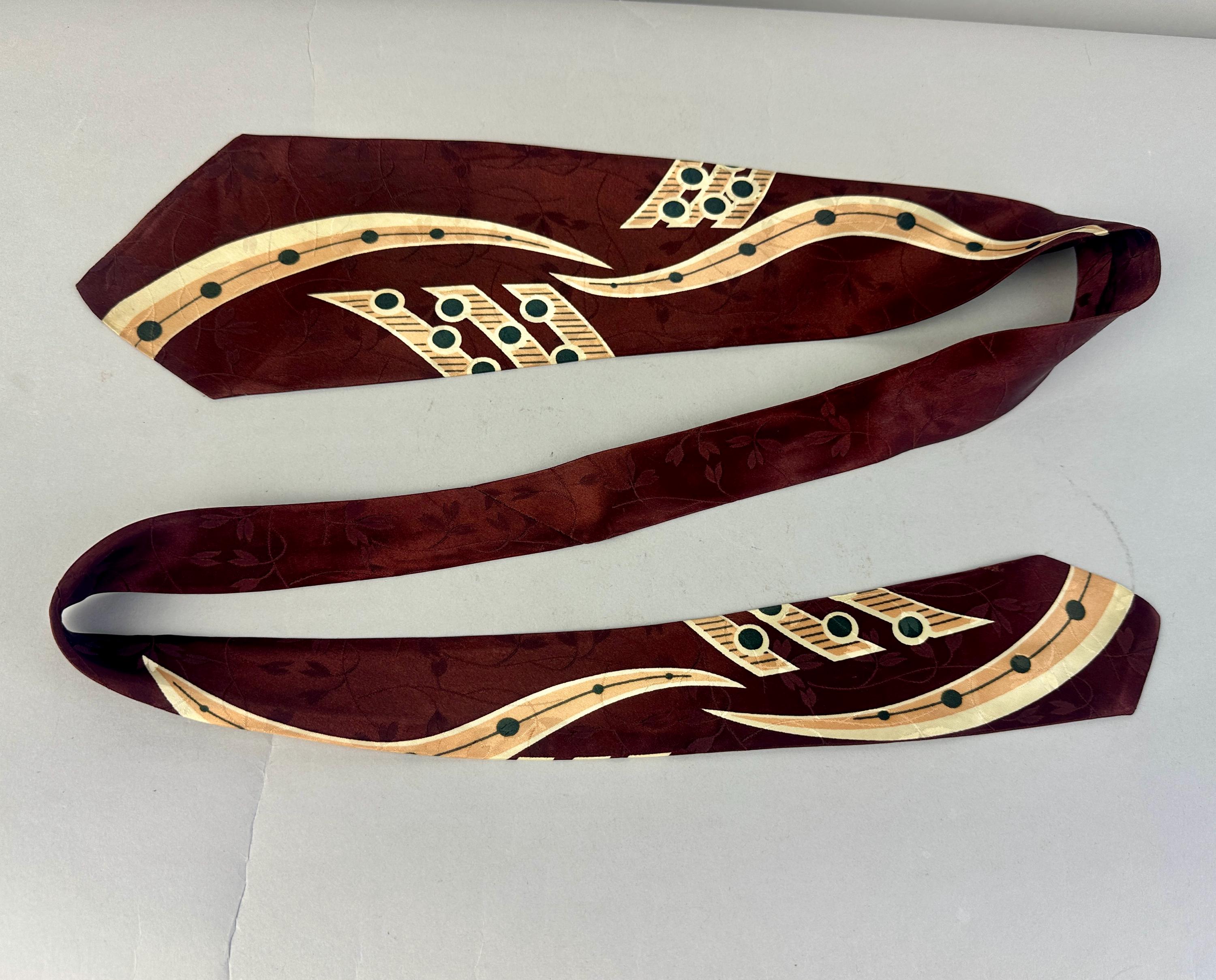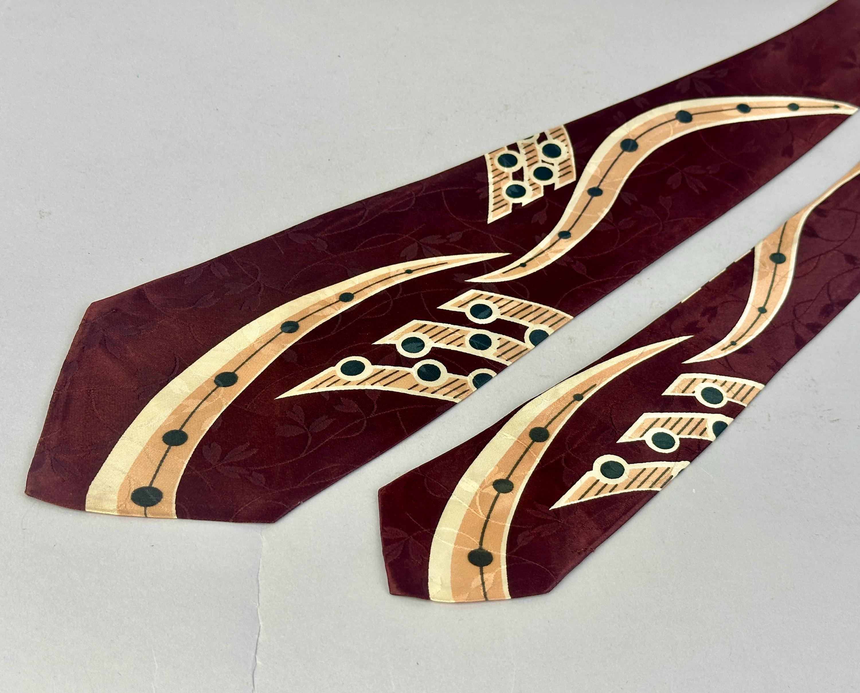 Make beautiful music by dressing just right with this 1940s necktie! The tie is made of rayon satin in a deep warm mahogany with a background weave of leaves and vines. Pine green, peach, and ivory make a pseudo-music chart with notation imagery. Fully lined and labeled "The Coplan Tie" and "Uber's". Pairs well with a wide variety of Art Deco and Mid-Century suit colors and fabric types. This tie is in great vintage condition with no holes, stains, or odors to note.