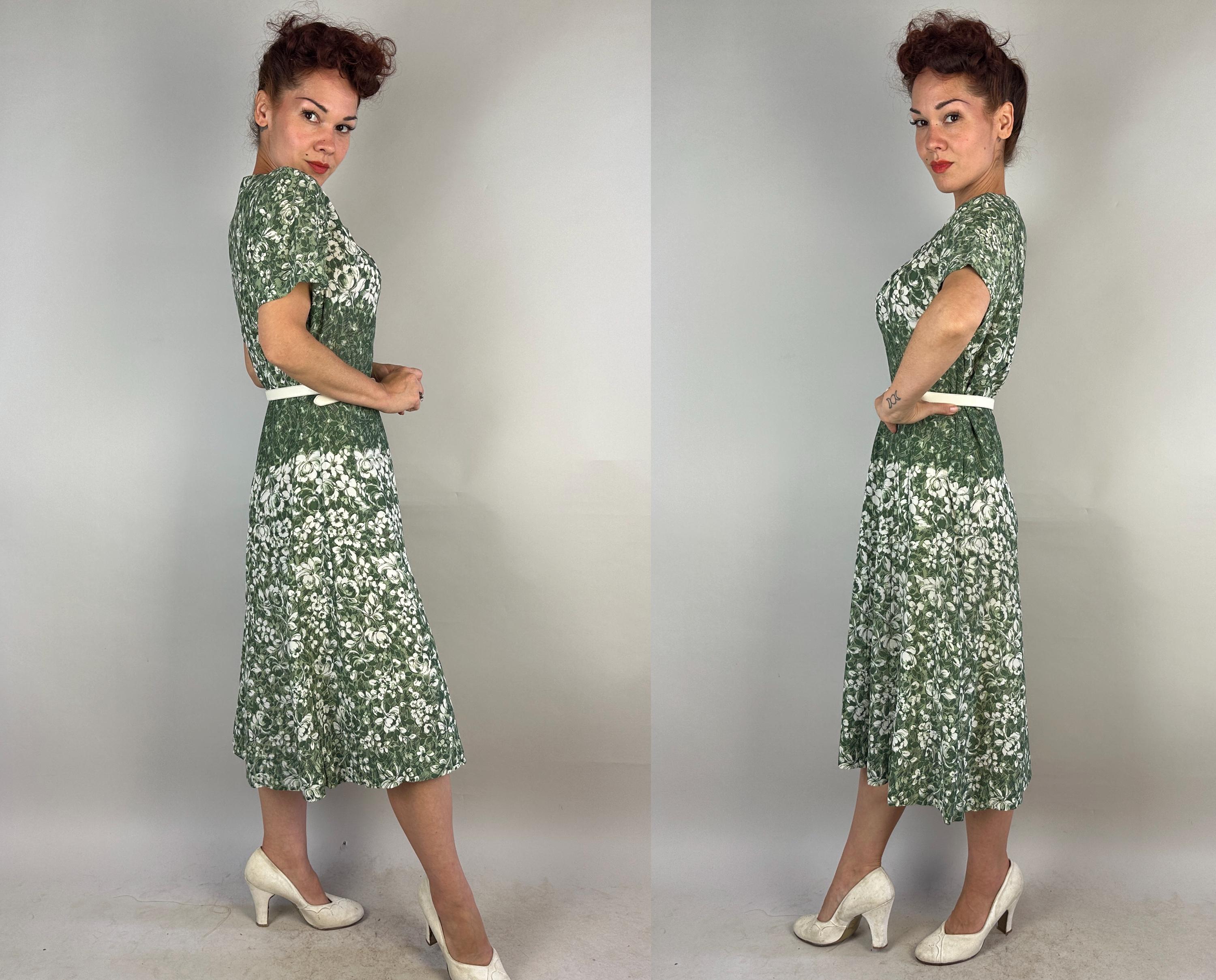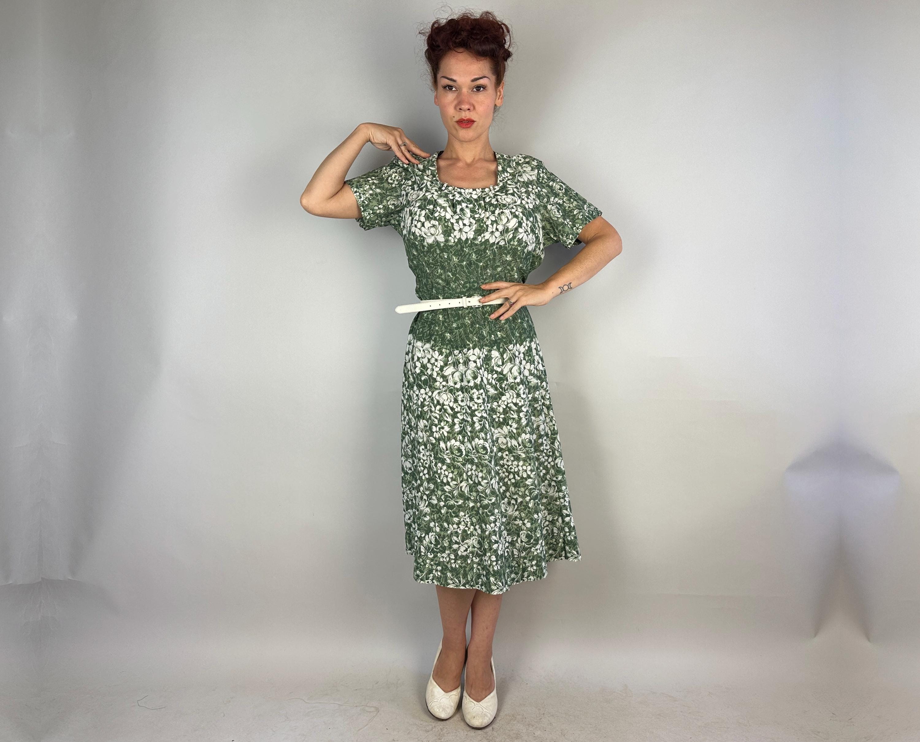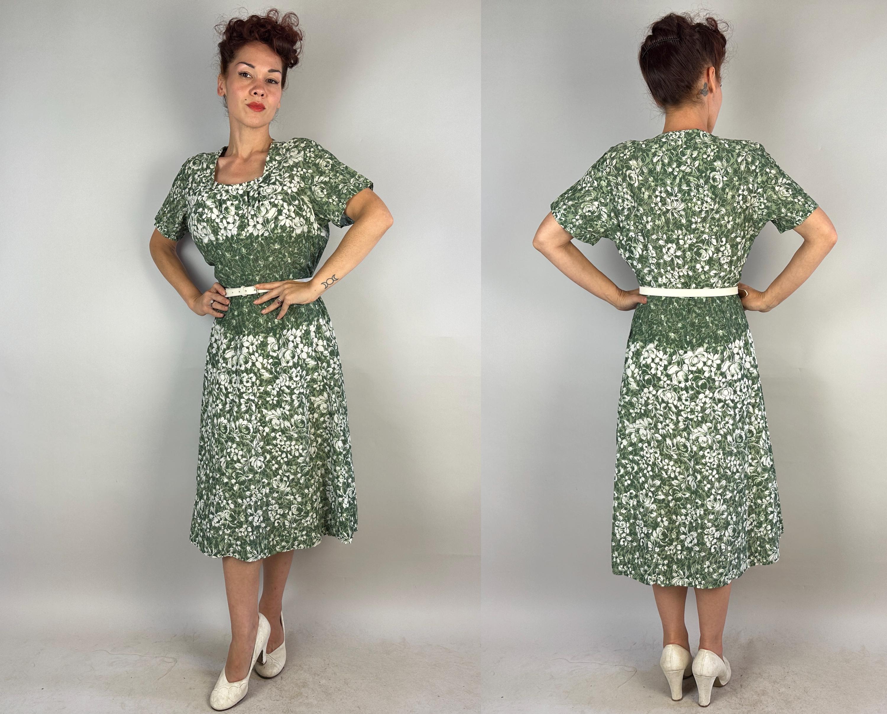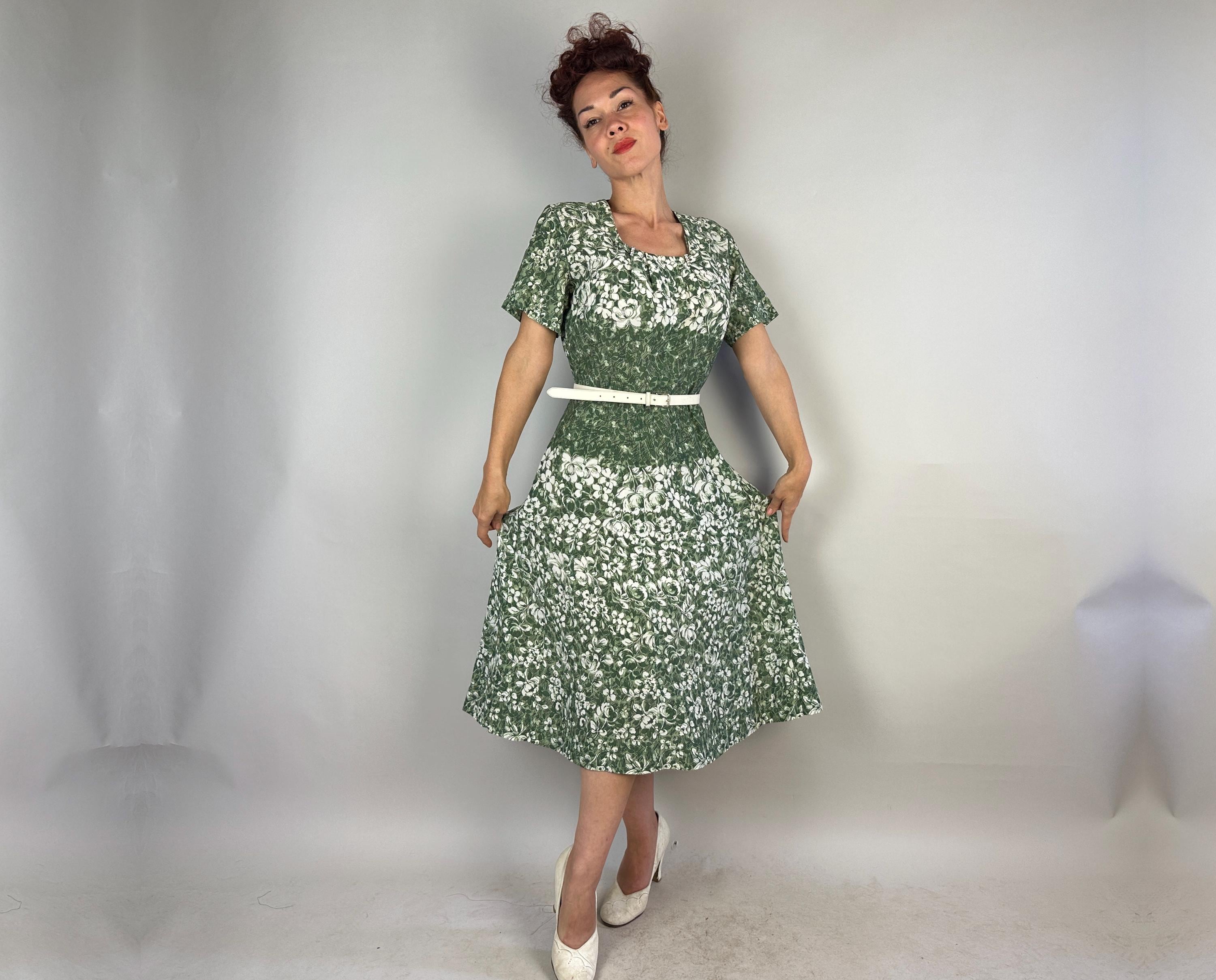 Perfect for daytime dates or enjoying time on your own, this 1940s dress is a pleasure! Made of lightweight rayon with a white and dark and light sage green floral print with black pen stroke outlines. It features a square neck with pleats and rhinestone brooches holding bow tabs in place and a gored skirt with gentle flare. Metal zipper on the side. This dress is in great vintage condition, with no holes, stains, or odors to note - very likely deadstock/unworn because the original paper tag is still intact! Please note, belt is model's own.