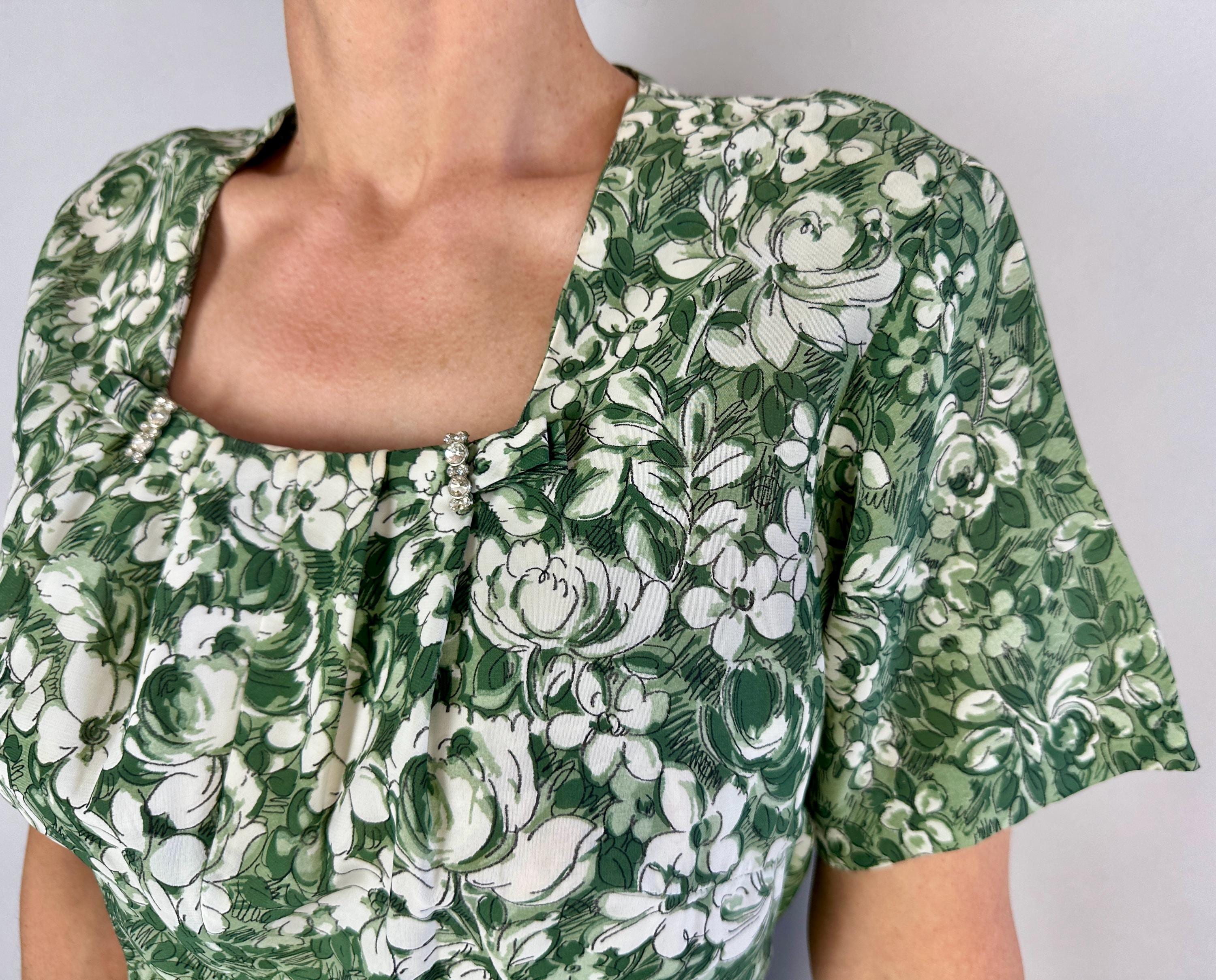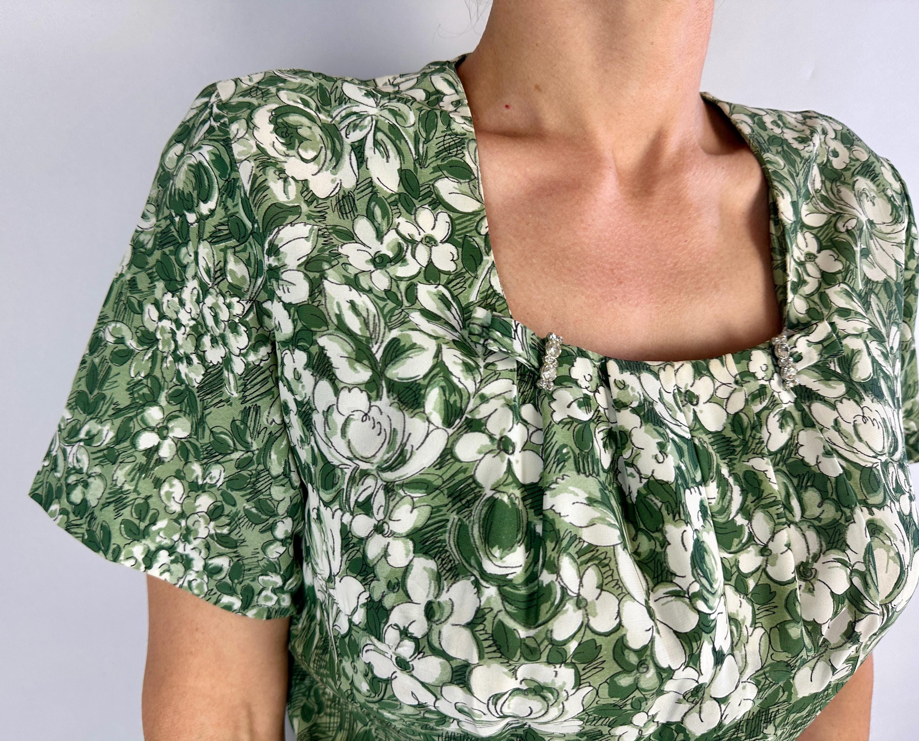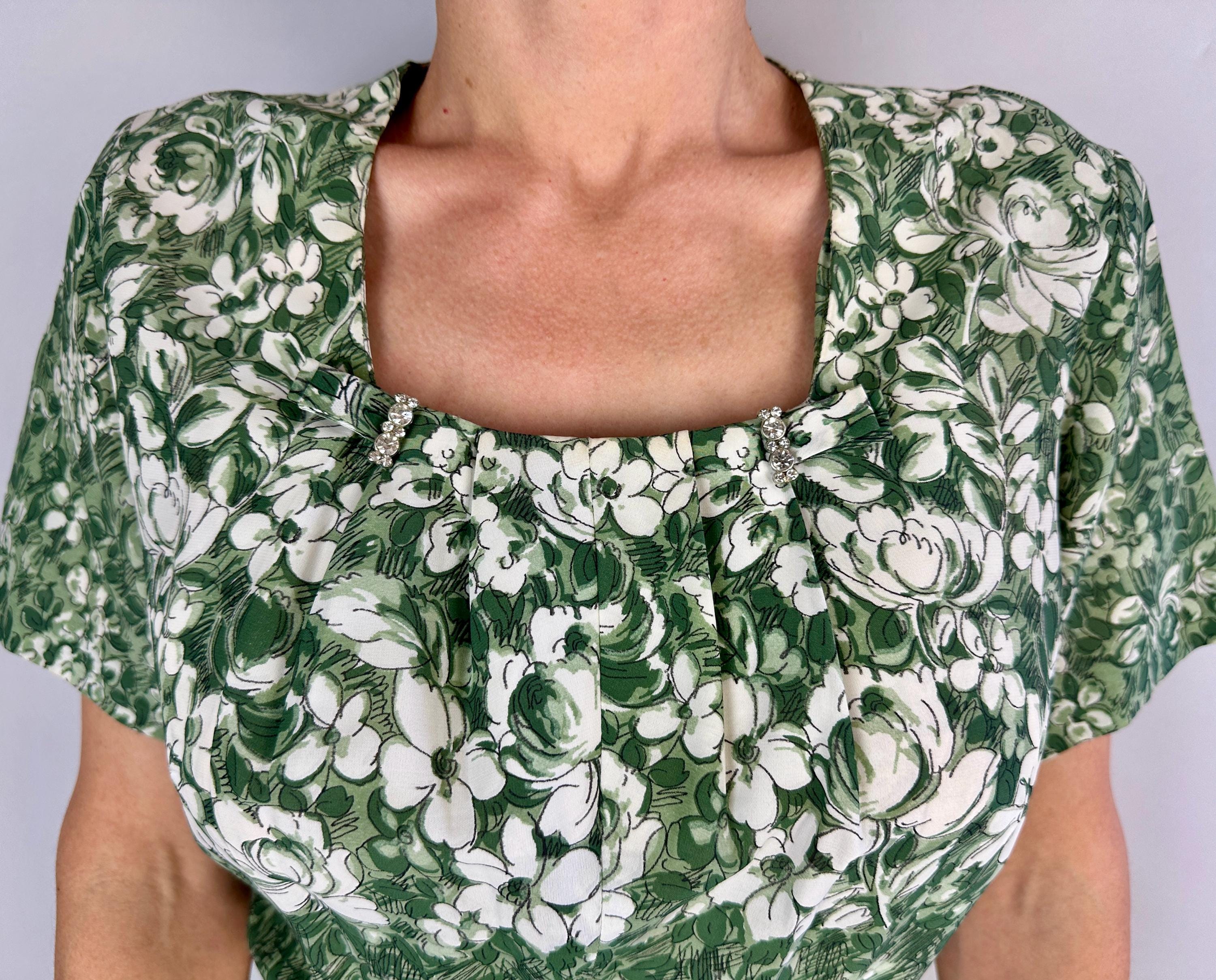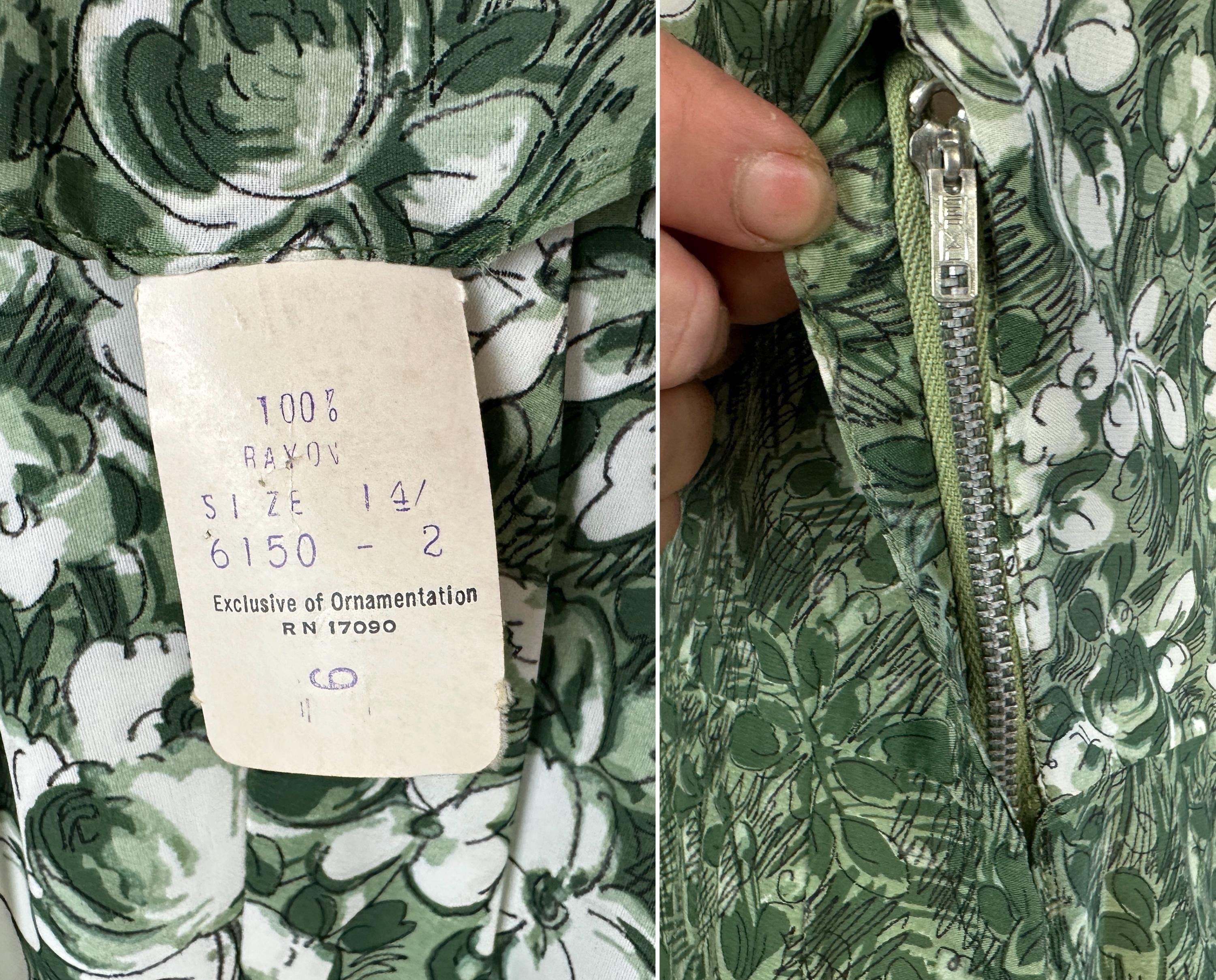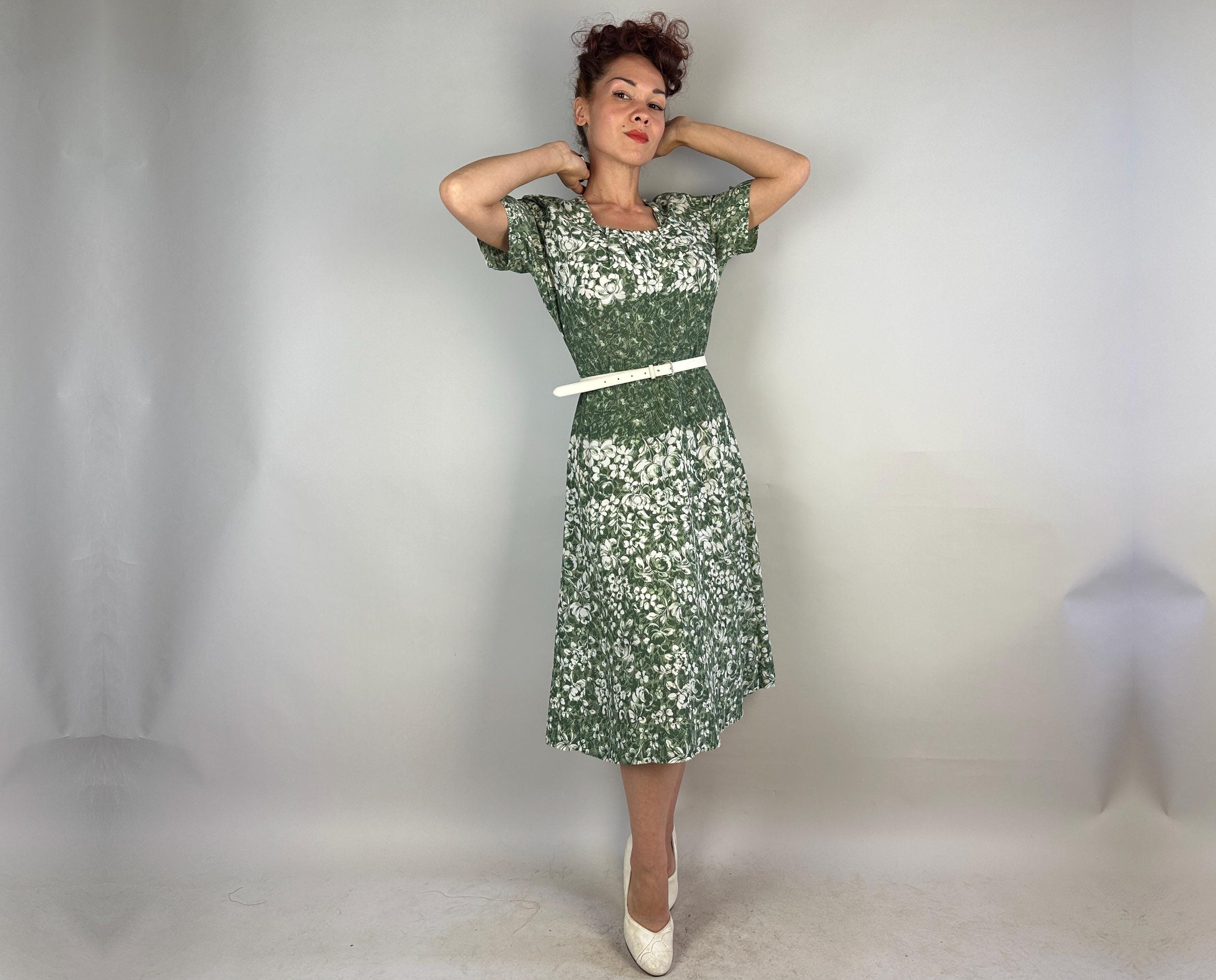Perfect for daytime dates or enjoying time on your own, this 1940s dress is a pleasure! Made of lightweight rayon with a white and dark and light sage green floral print with black pen stroke outlines. It features a square neck with pleats and rhinestone brooches holding bow tabs in place and a gored skirt with gentle flare. Metal zipper on the side. This dress is in great vintage condition, with no holes, stains, or odors to note - very likely deadstock/unworn because the original paper tag is still intact! Please note, belt is model's own.