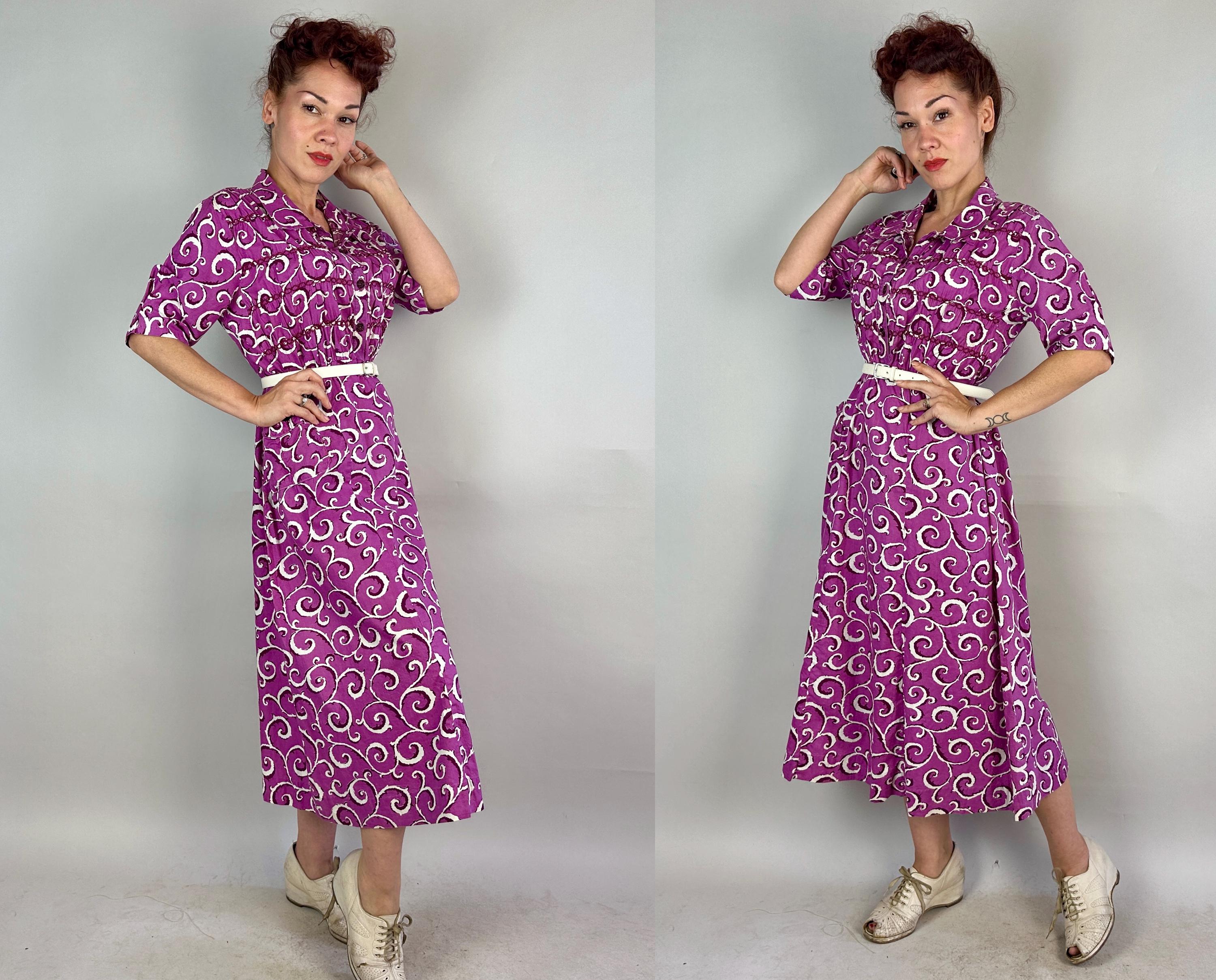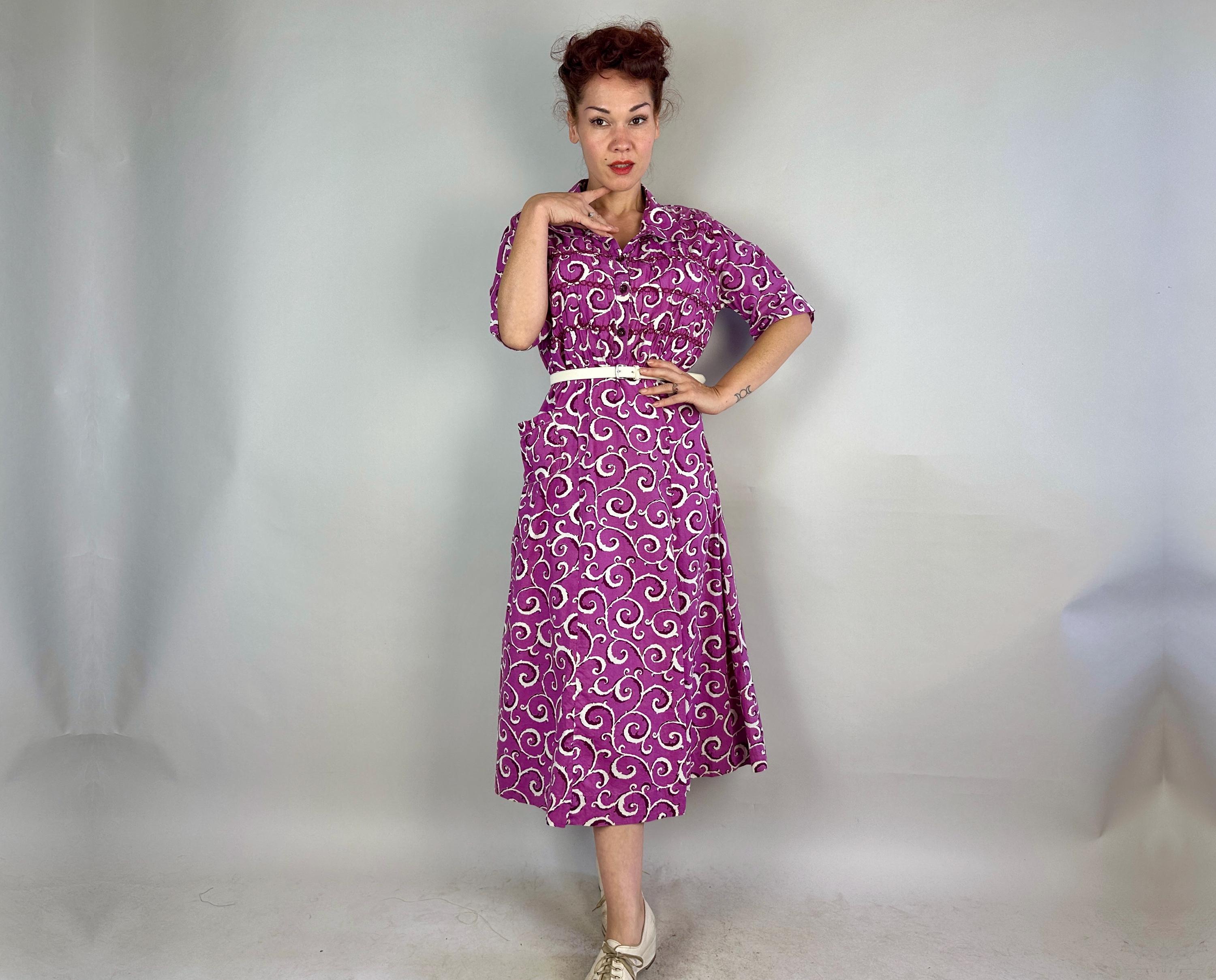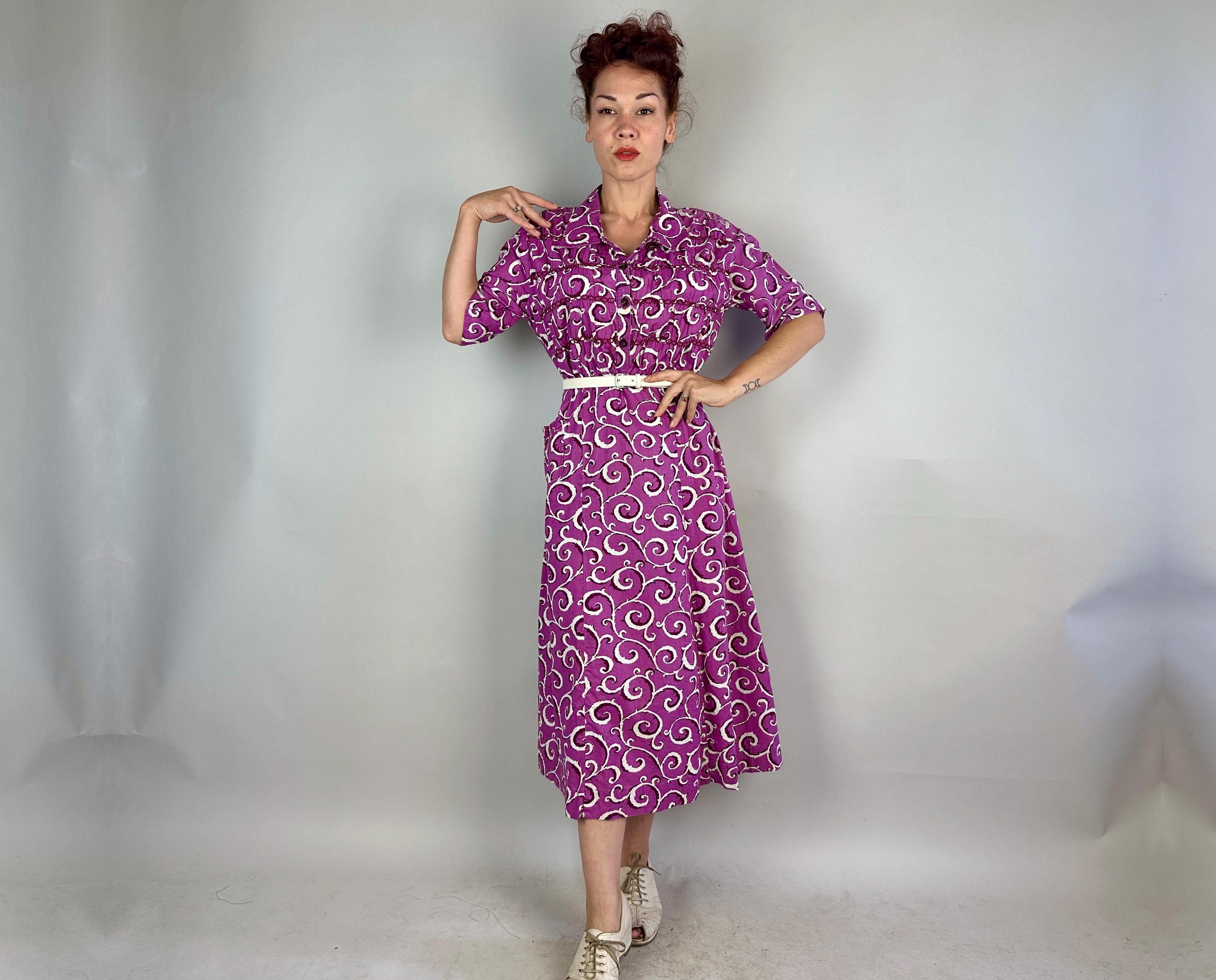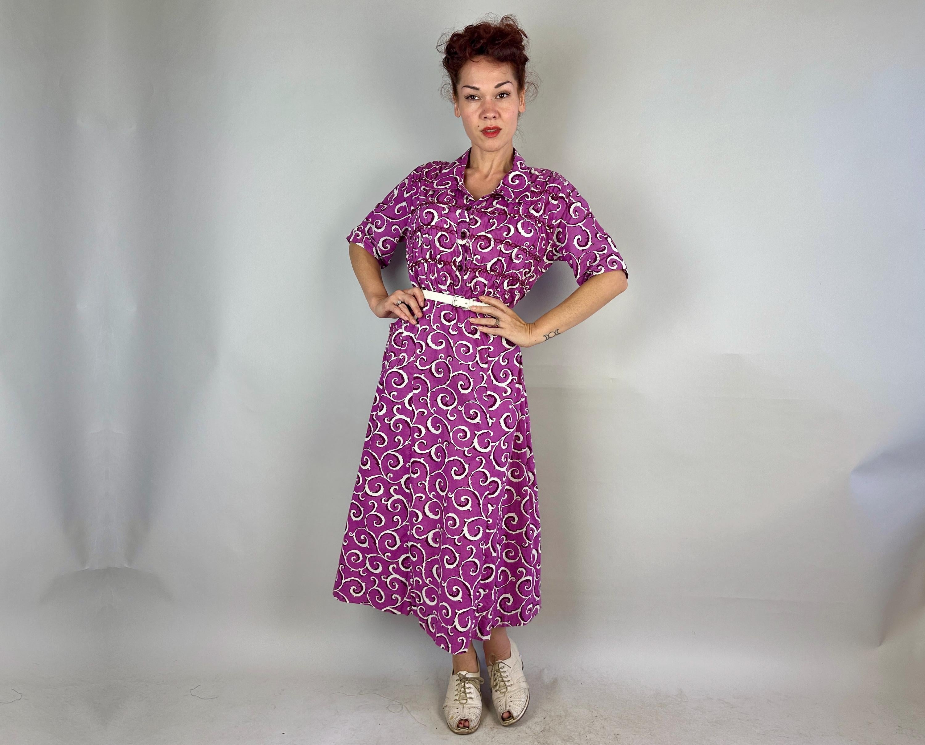 Feel sure fire and swell when you're surrounded in swirls with this 1930s day dress! This shirtwaist style dress is orchid pink cotton with a large pattern of swirling white vines shaded with a mulberry tone. The bodice has rows of chain embroidery that creates gathered panels and the gored skirt is straight cut with a single patch pocket on the hip. bodice fastens with maroon pie shell buttons. This dress is in great vintage condition, with no holes, stains, or odors to note. Please note, belt is model's own.