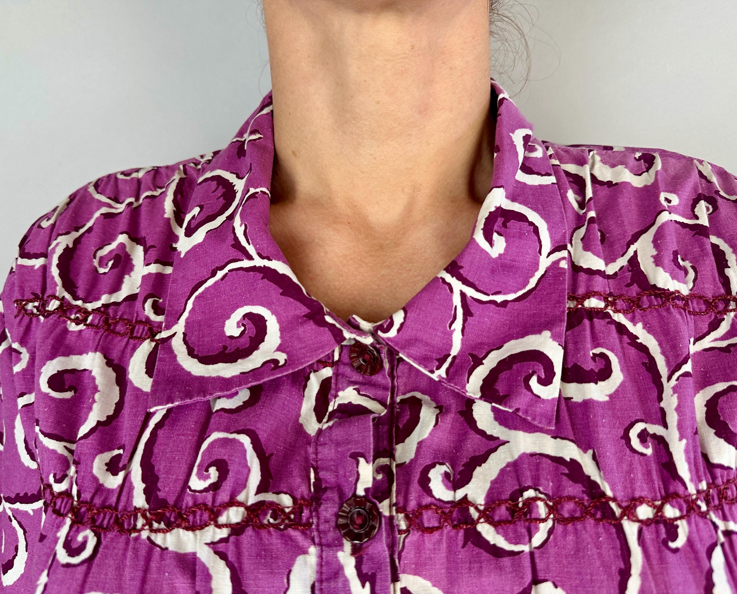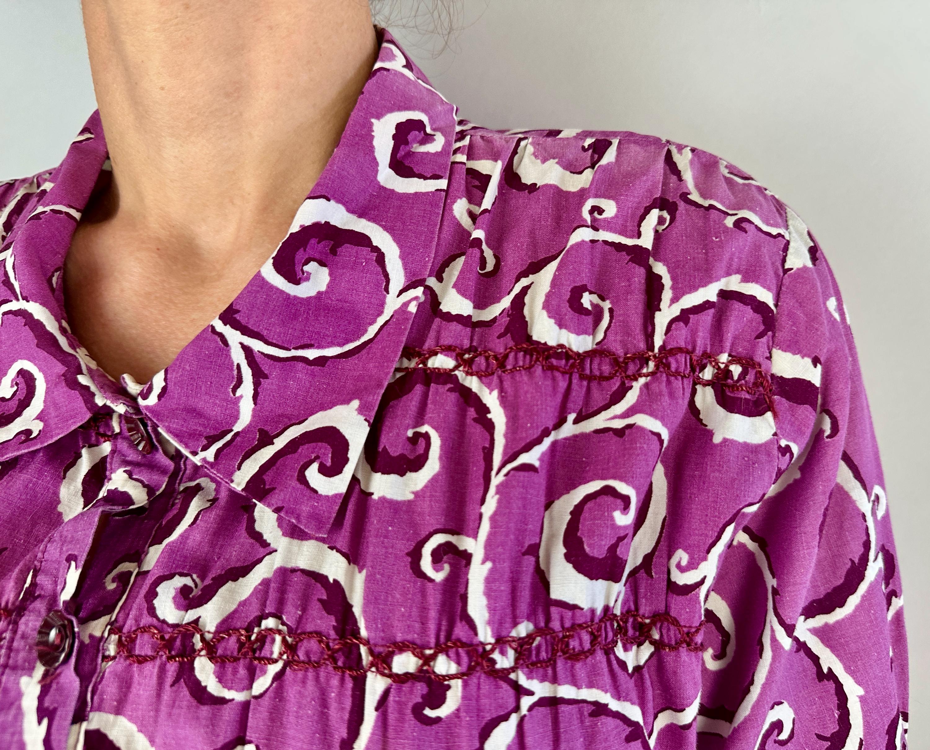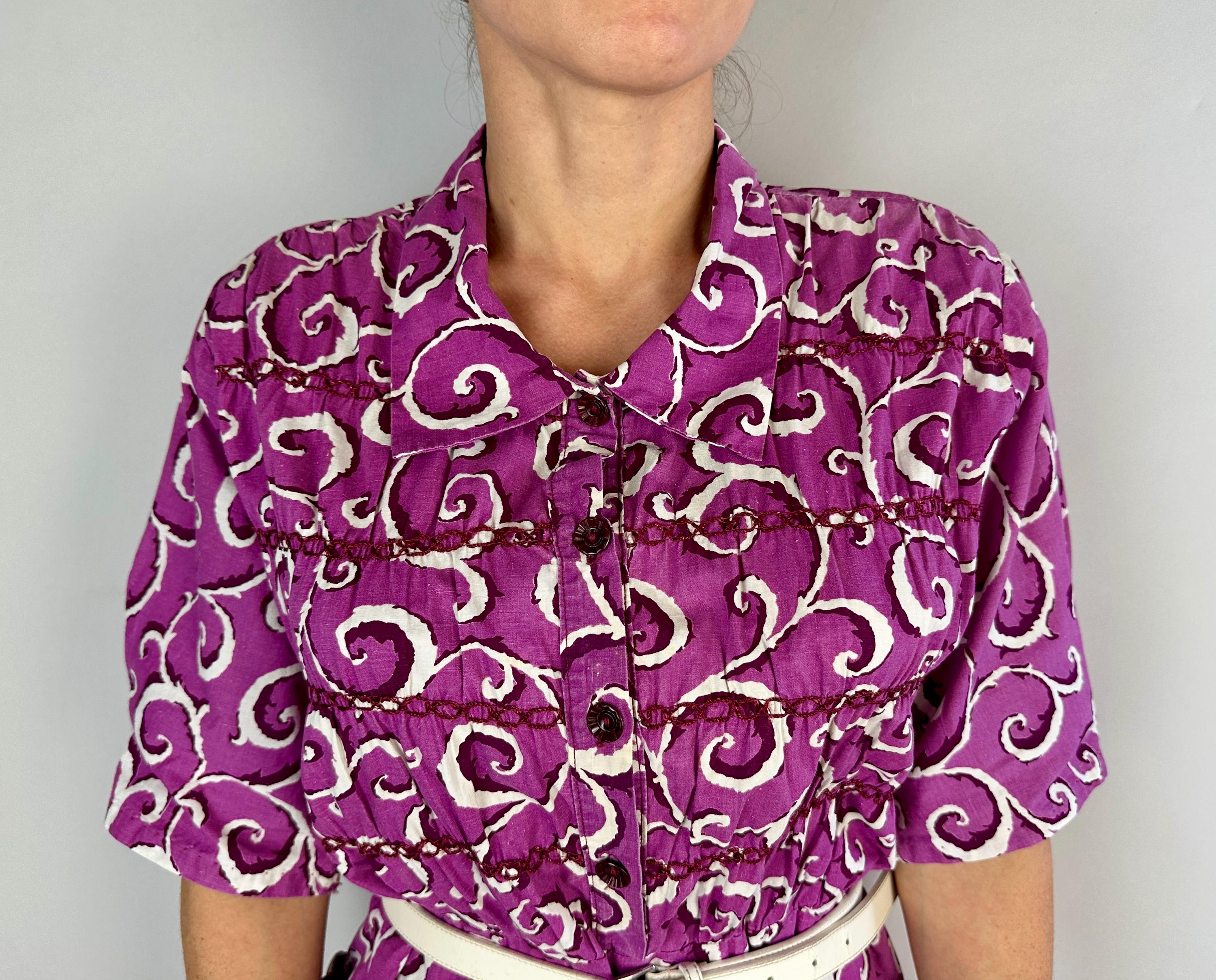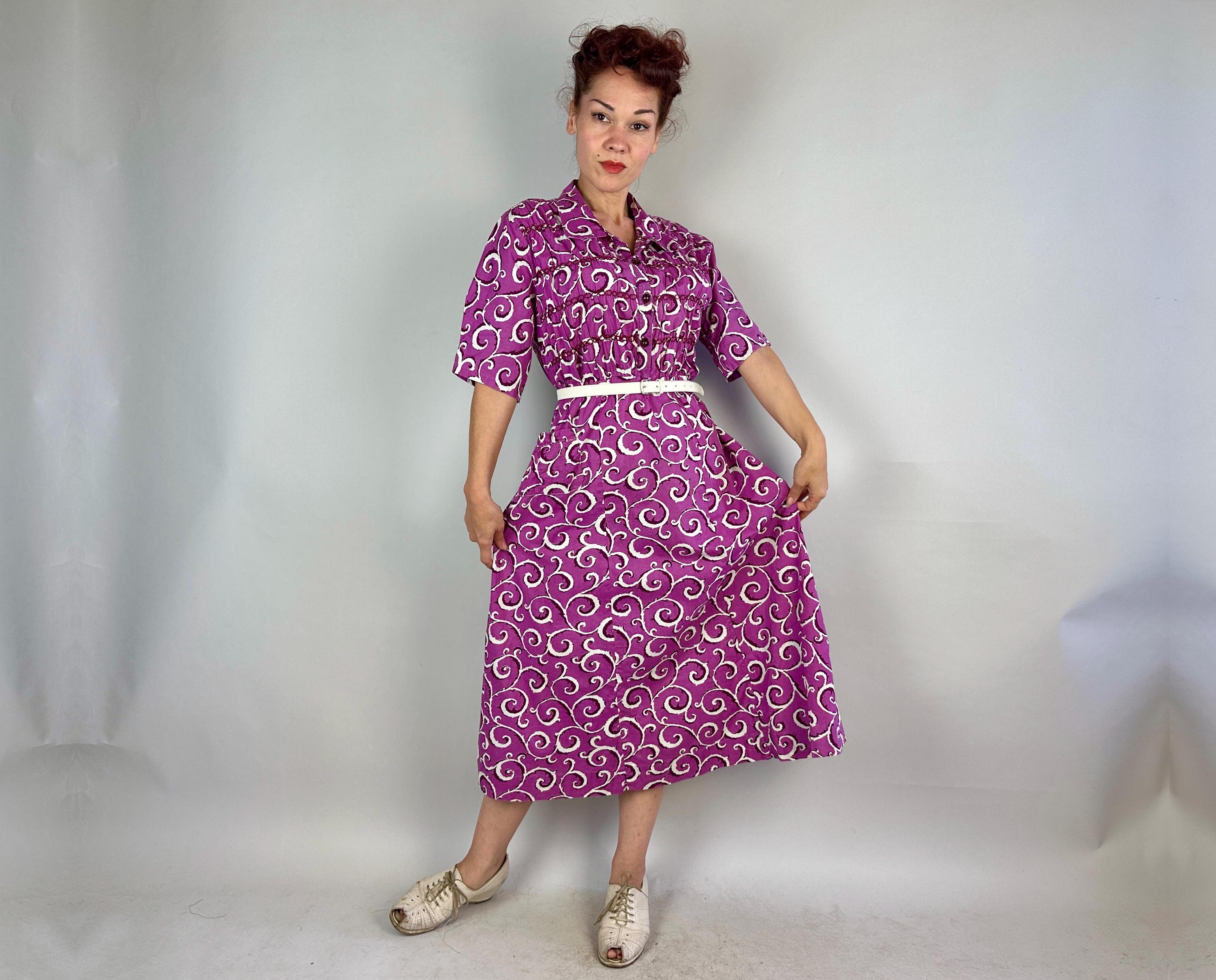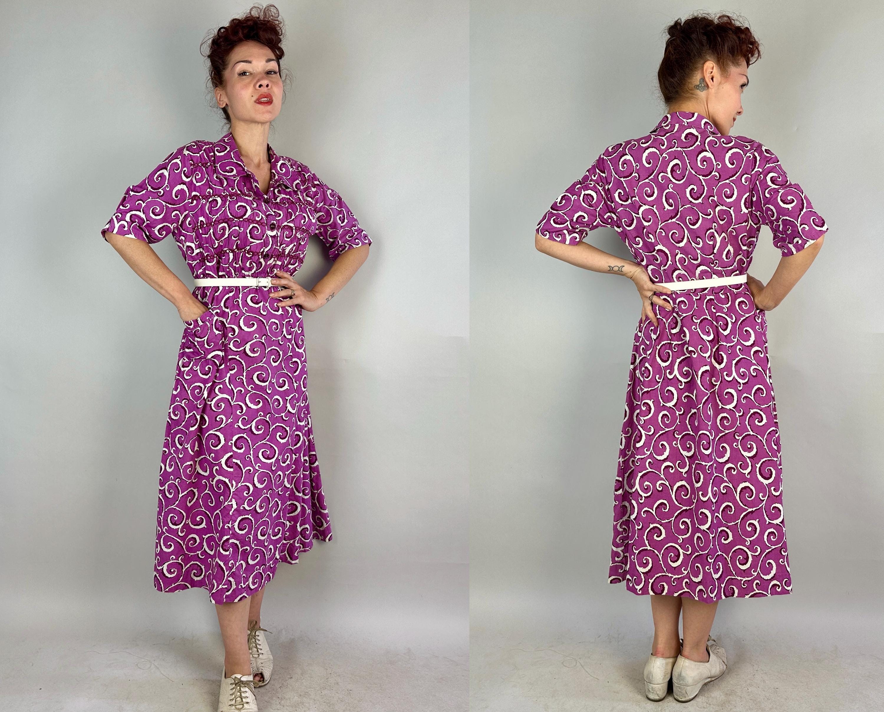 Feel sure fire and swell when you're surrounded in swirls with this 1930s day dress! This shirtwaist style dress is orchid pink cotton with a large pattern of swirling white vines shaded with a mulberry tone. The bodice has rows of chain embroidery that creates gathered panels and the gored skirt is straight cut with a single patch pocket on the hip. bodice fastens with maroon pie shell buttons. This dress is in great vintage condition, with no holes, stains, or odors to note. Please note, belt is model's own.