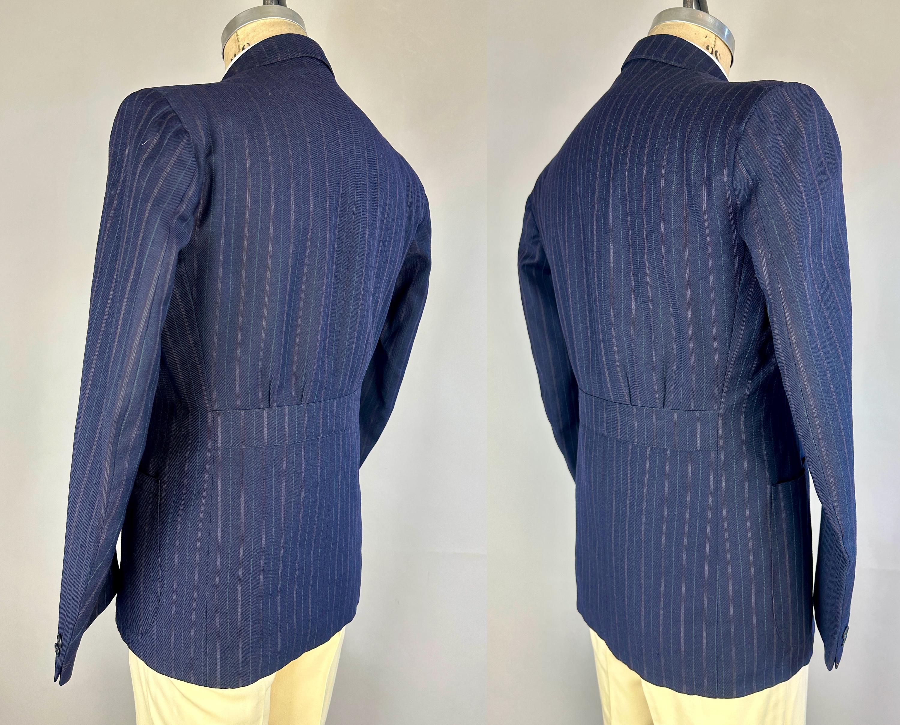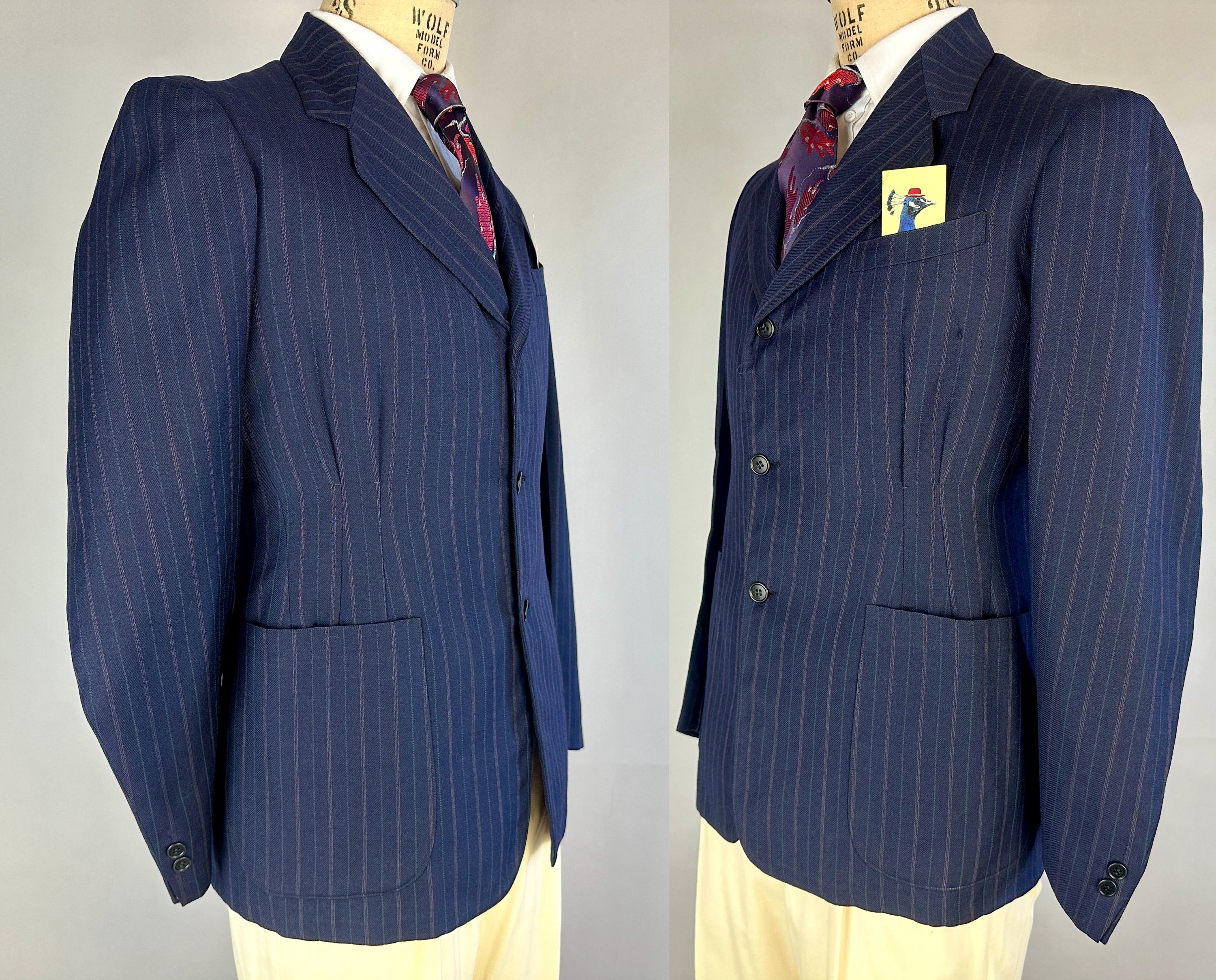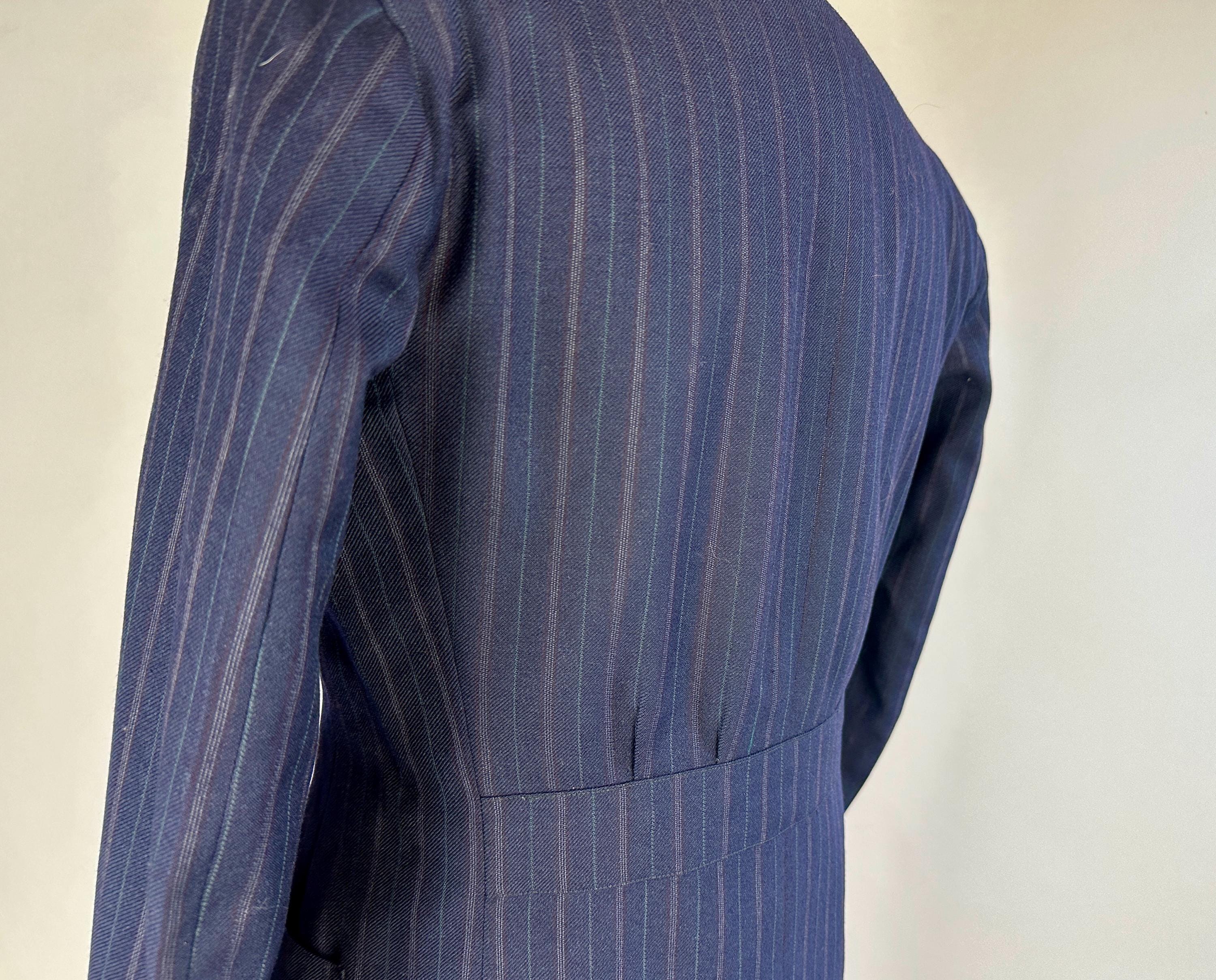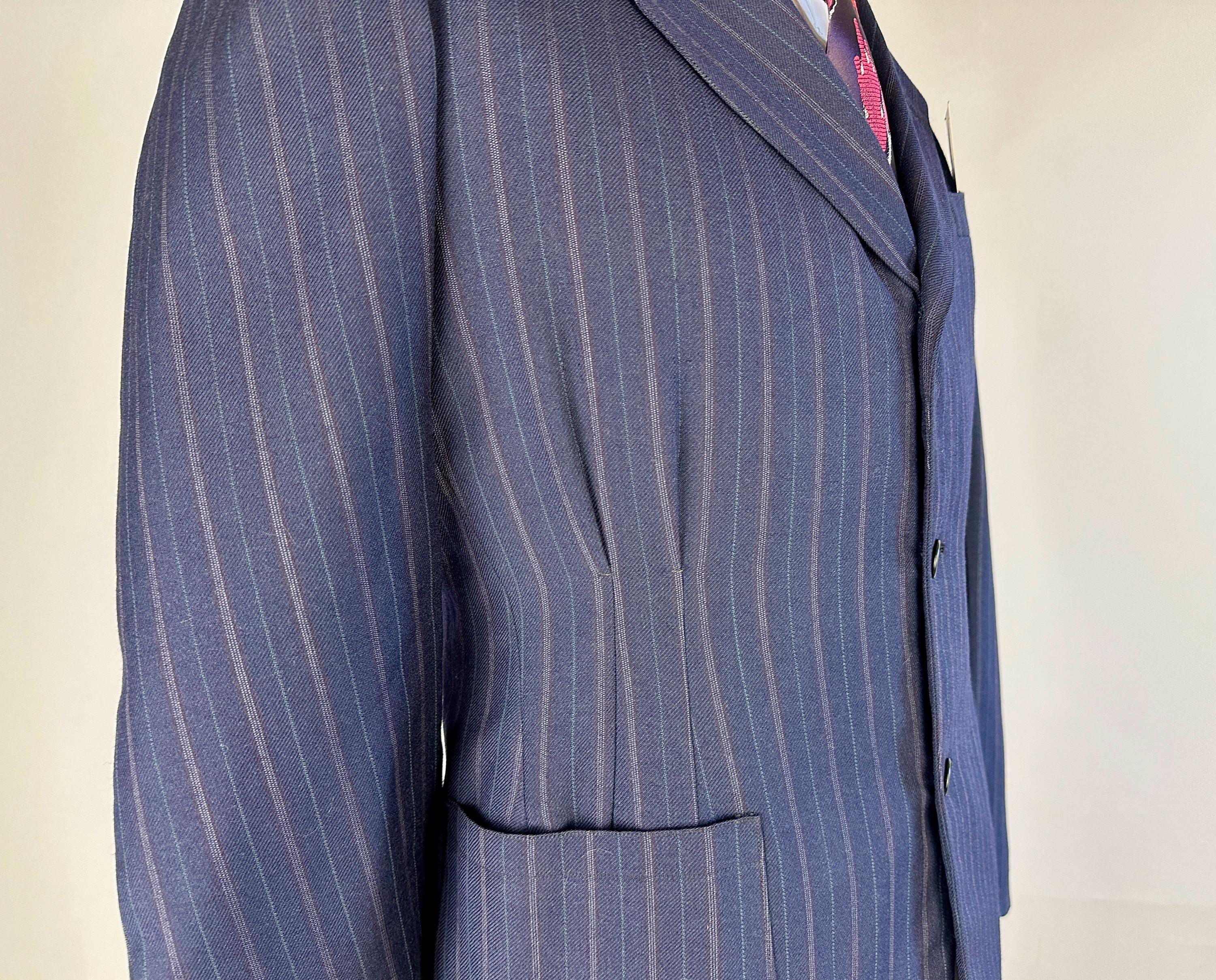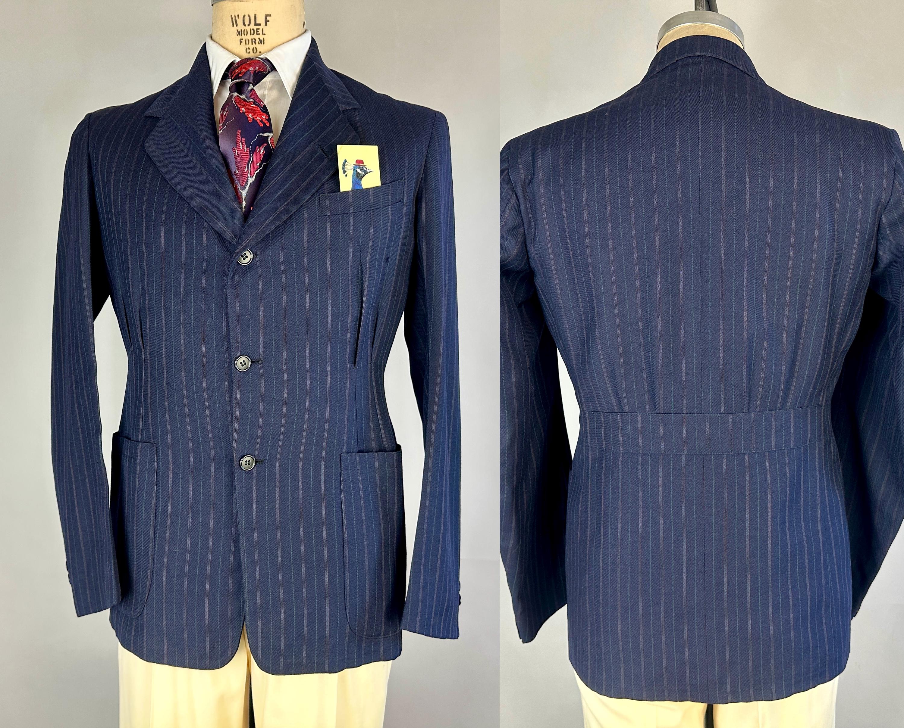 Pleasing to the eye and pleasant to the touch, you'll want to pair this belted back jacket with most of your wardrobe! Dated November 5, 1940 this classic wool is from the finishing-end of the very best era of vintage menswear. Navy blue with pinstripes and chalk stripes of white and steel blue, this single breasted jacket has the added ultra-rare feature of darted pleats on the front that run into the patch pockets and make a lovely compliment to the pleats above the belted back. It has a wide notch lapel, three button front, jetted chest pocket, and one inner pocket. Padded shoulders and full lining. Labeled "Stuart MacQuaid". This jacket is in great vintage condition, with no holes, stains, or odors to note.