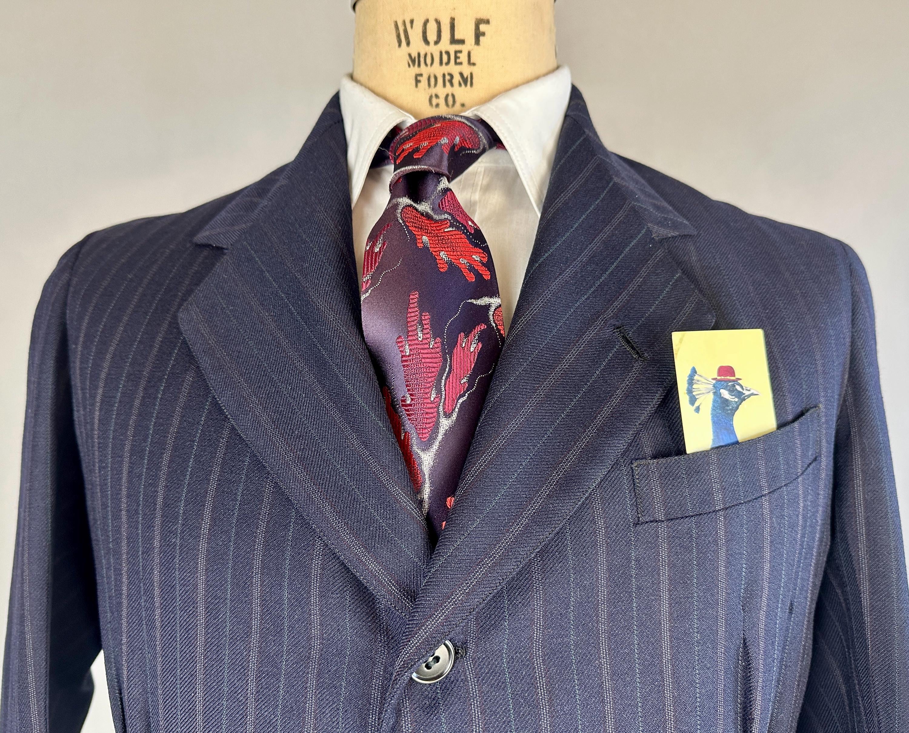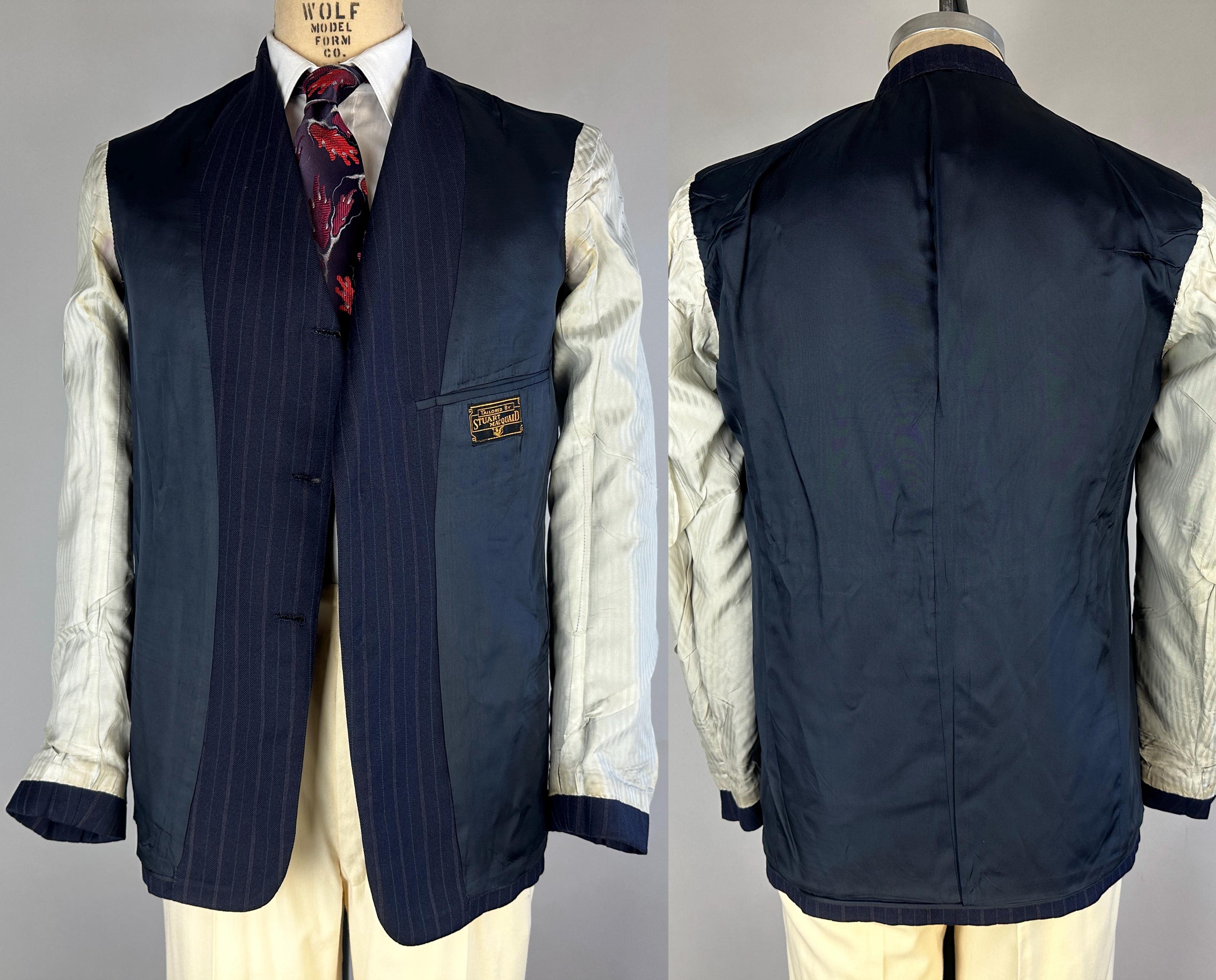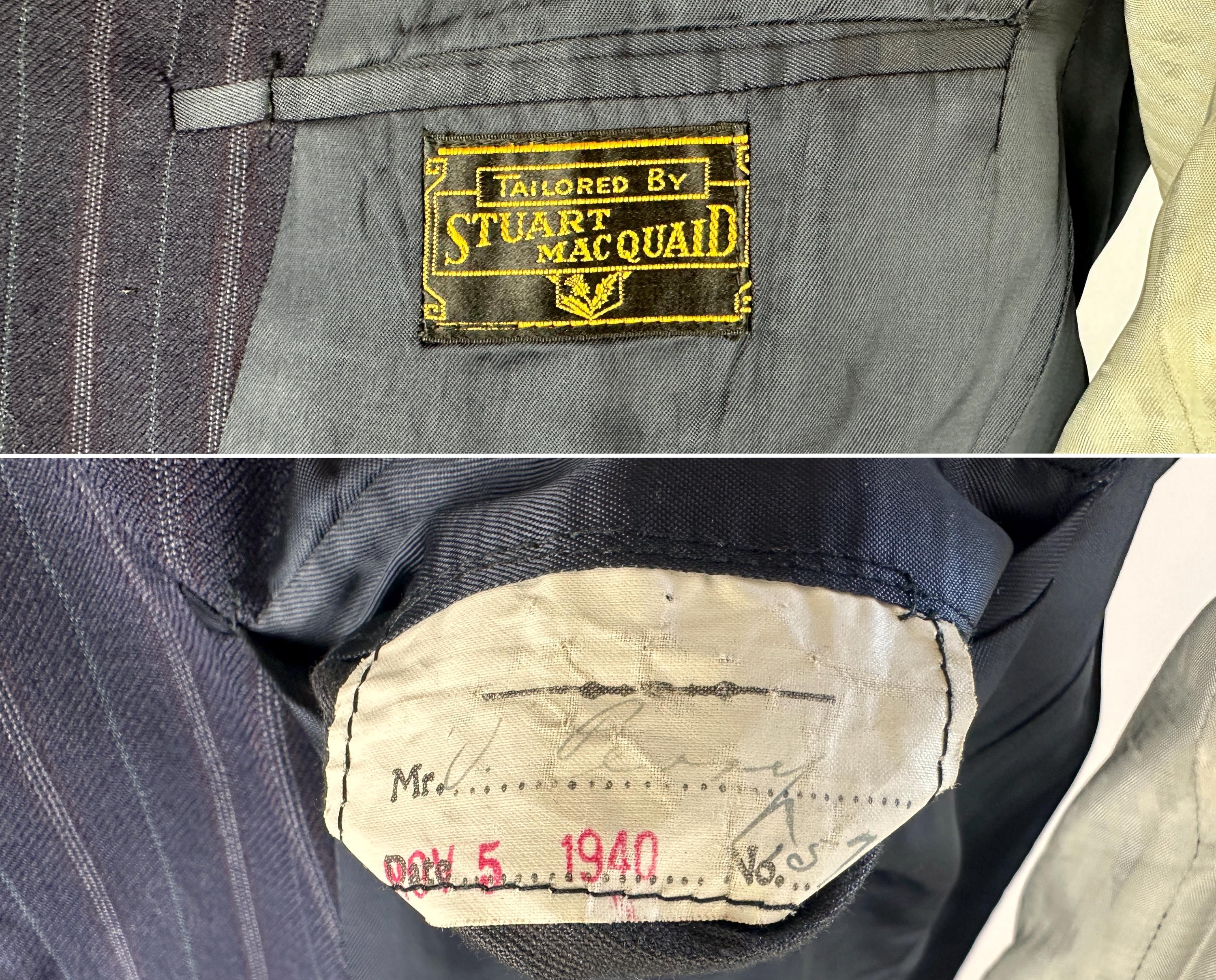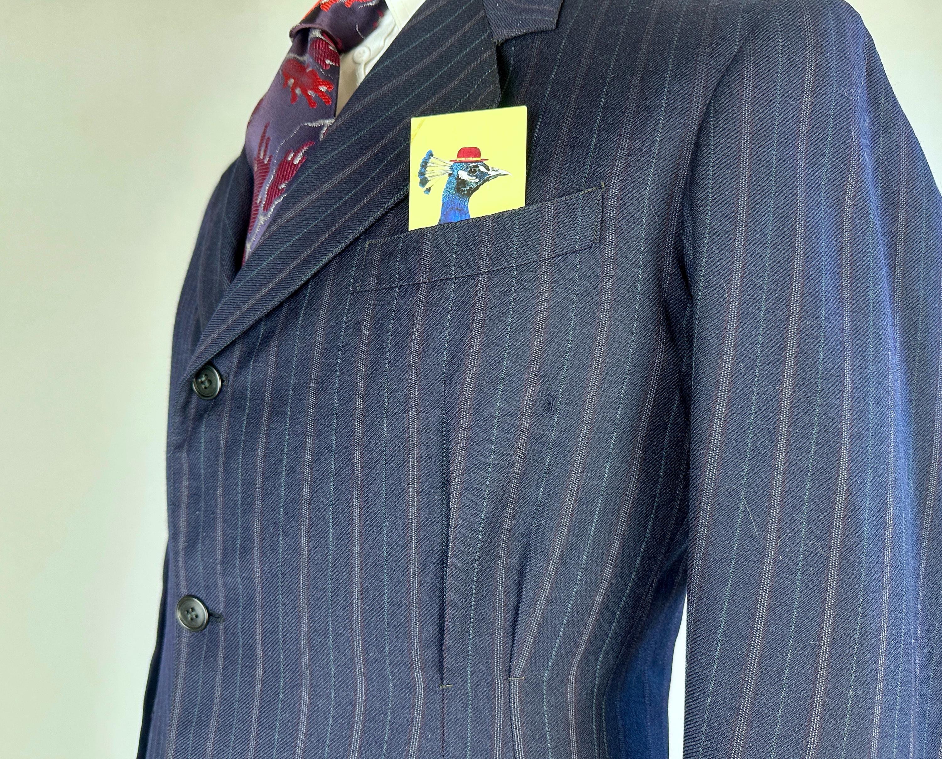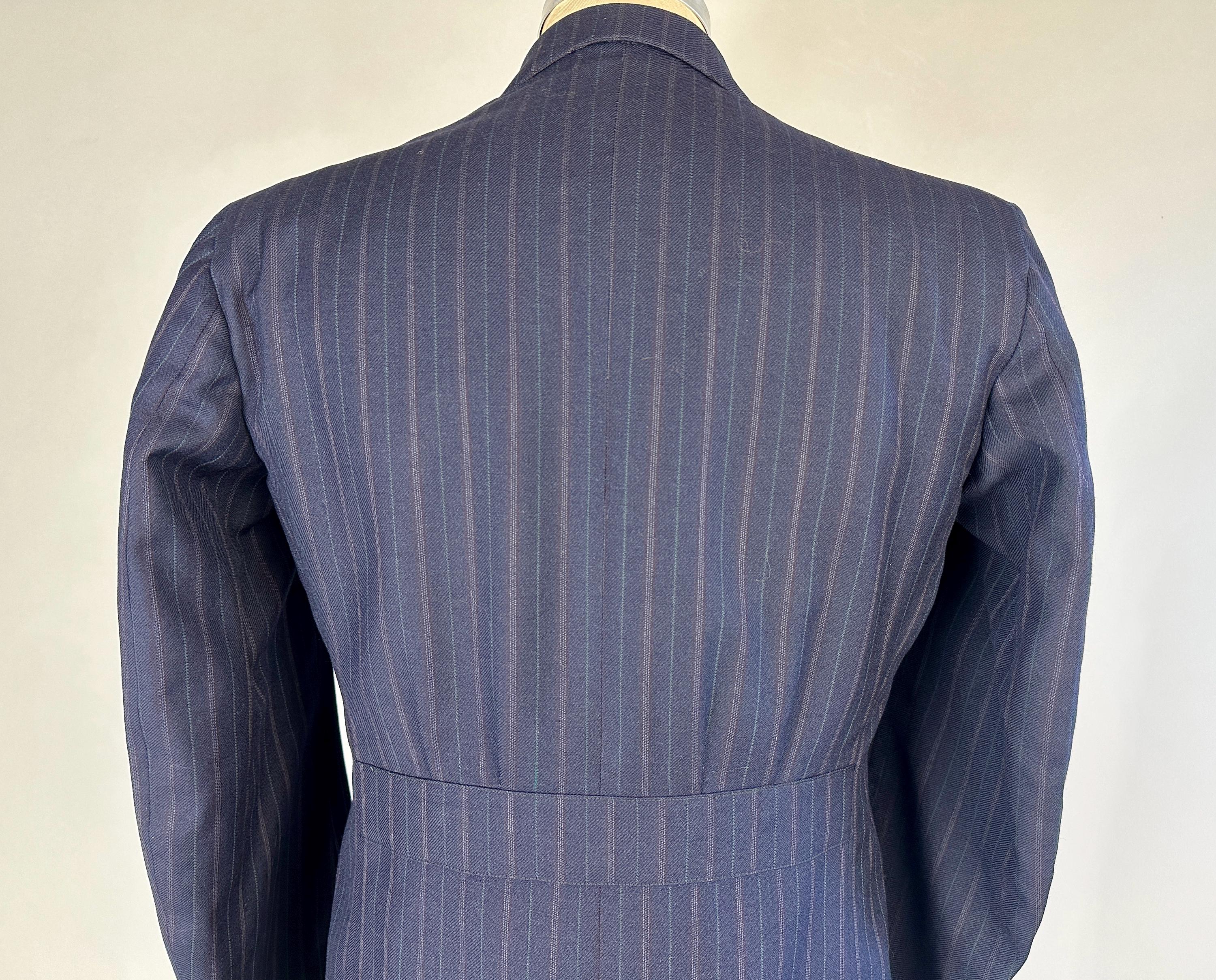Pleasing to the eye and pleasant to the touch, you'll want to pair this belted back jacket with most of your wardrobe! Dated November 5, 1940 this classic wool is from the finishing-end of the very best era of vintage menswear. Navy blue with pinstripes and chalk stripes of white and steel blue, this single breasted jacket has the added ultra-rare feature of darted pleats on the front that run into the patch pockets and make a lovely compliment to the pleats above the belted back. It has a wide notch lapel, three button front, jetted chest pocket, and one inner pocket. Padded shoulders and full lining. Labeled "Stuart MacQuaid". This jacket is in great vintage condition, with no holes, stains, or odors to note.