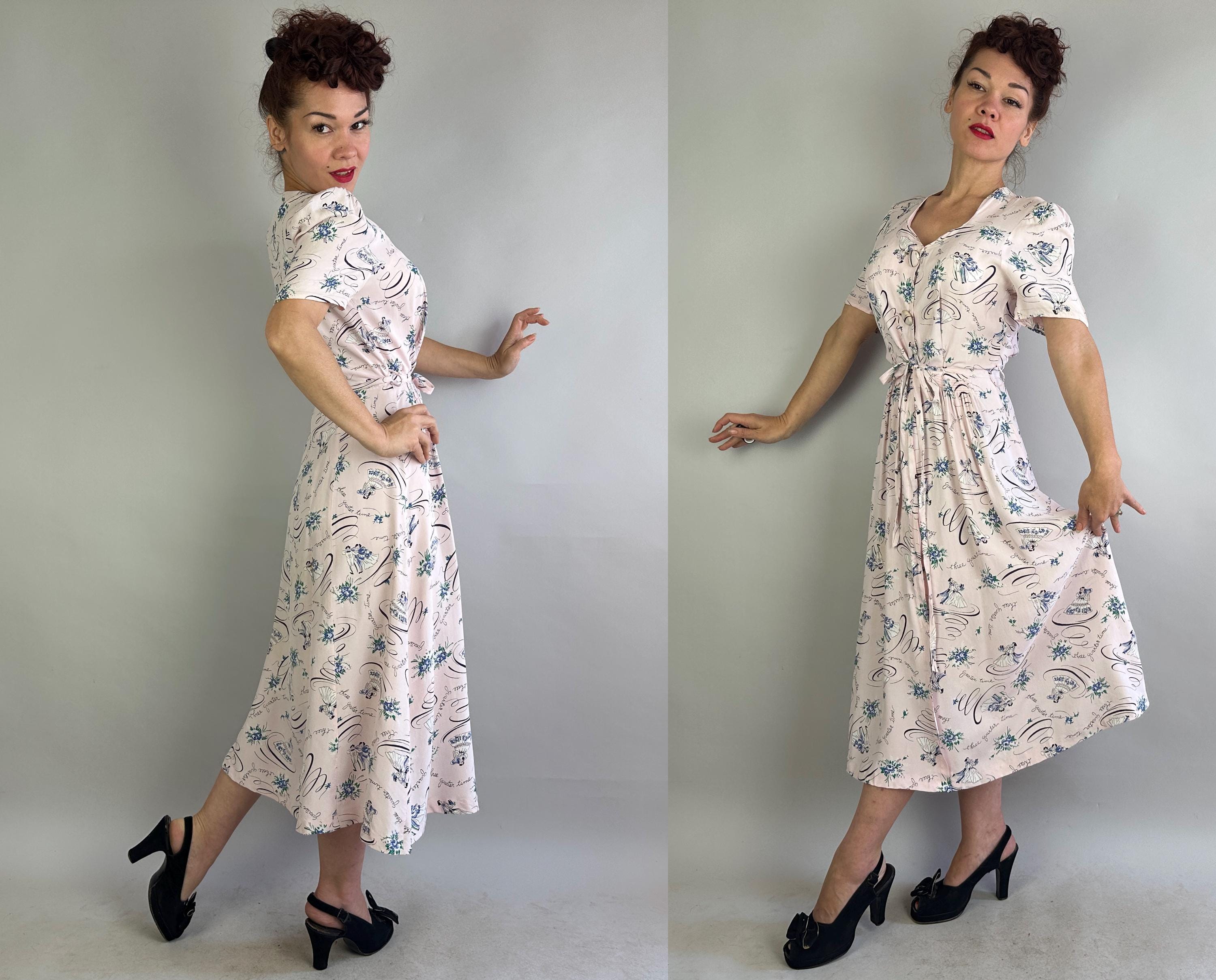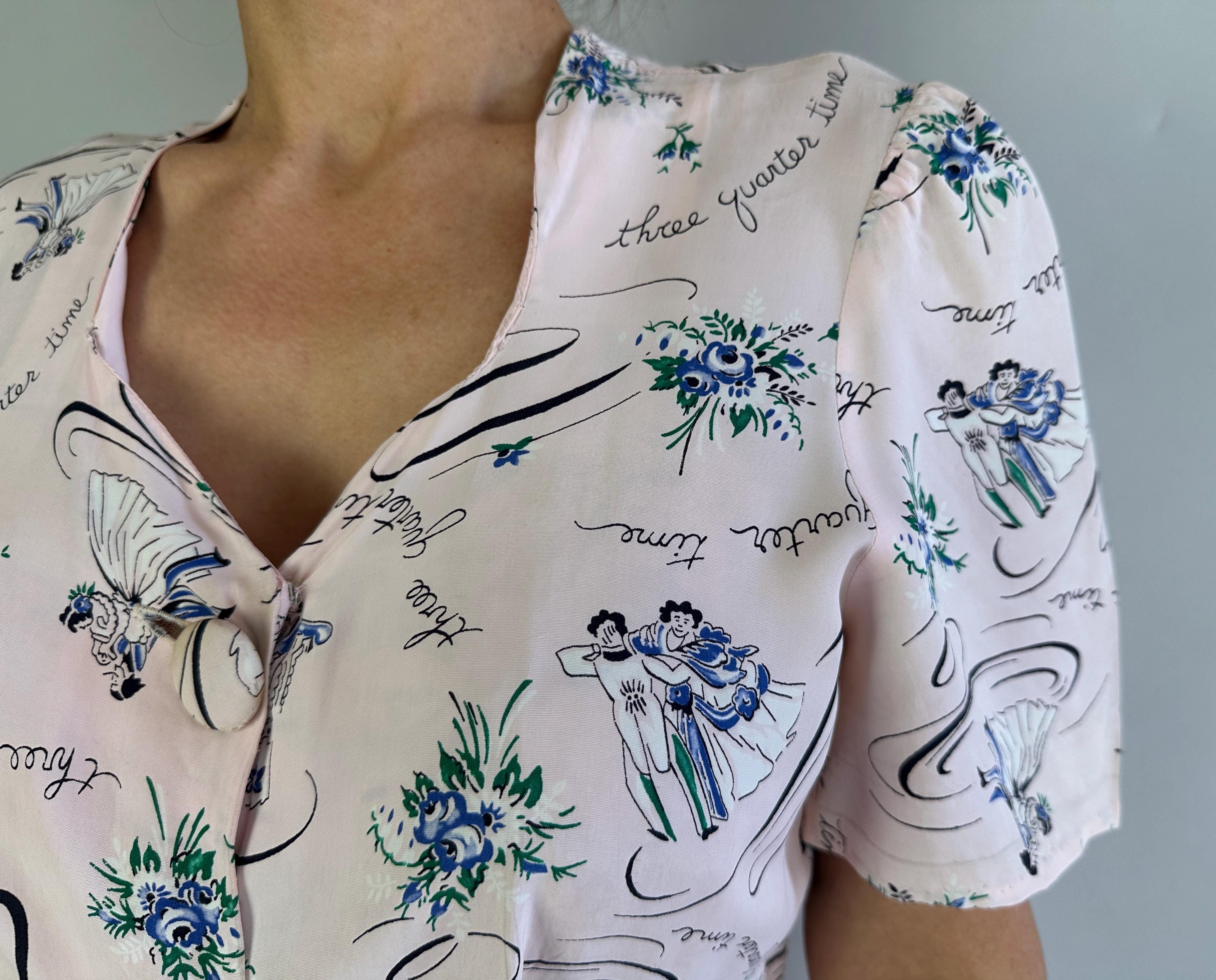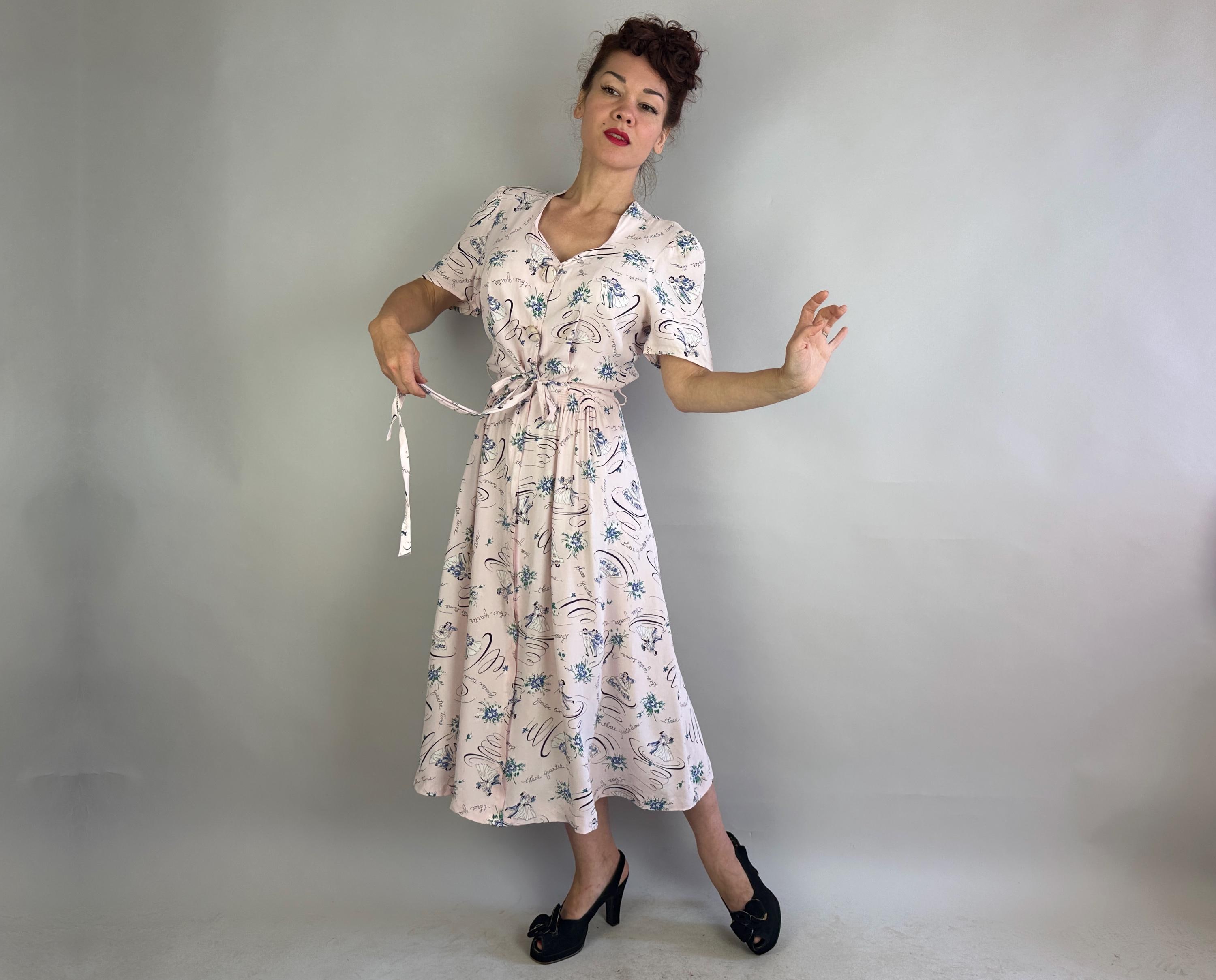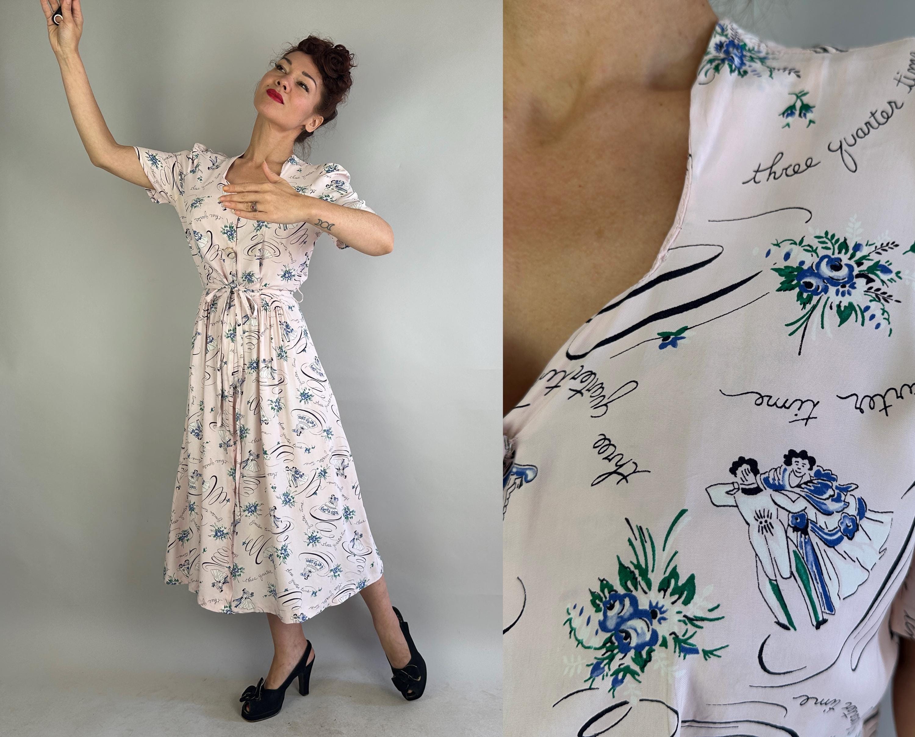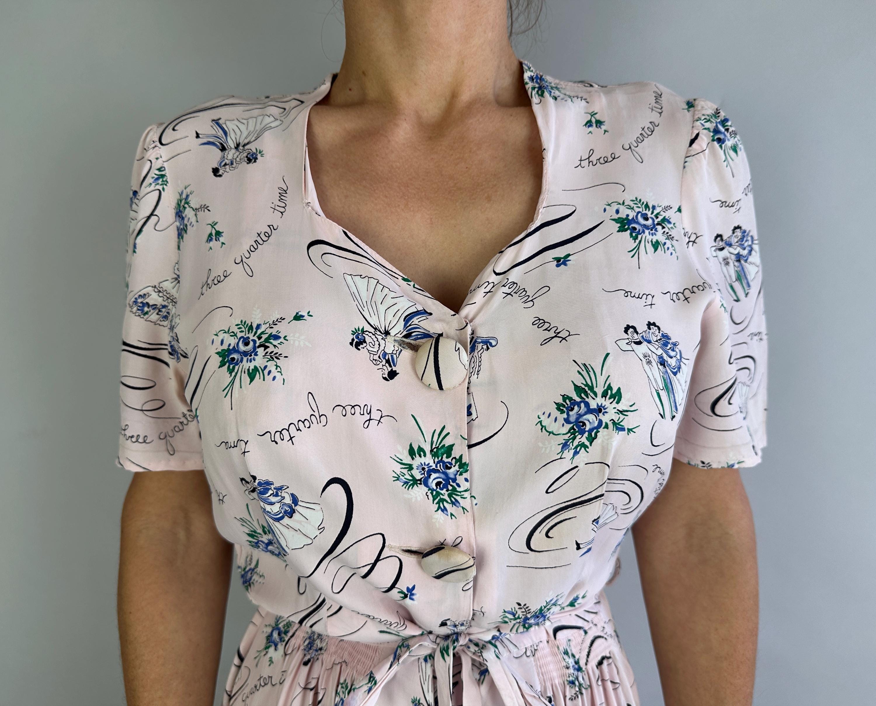 Waltz right in and be a dancer's delight in this 1940s novelty print dress! The palest pink silky rayon has an absolutely darling print of couples dancing, admiral blue and kelly green bouquets, and the words "three quarter time" emblazoned all over. It is styled with sweetheart neckline, self fabric buttons on the bodice, smocking details below the waist, and waist cinching tie belt. A metal "Talon" zipper is hidden behind a placket where it fastens below the button line. Labeled "Lyn Delle". This dress is in good vintage condition, a few faint small marks but no holes or odors to note.