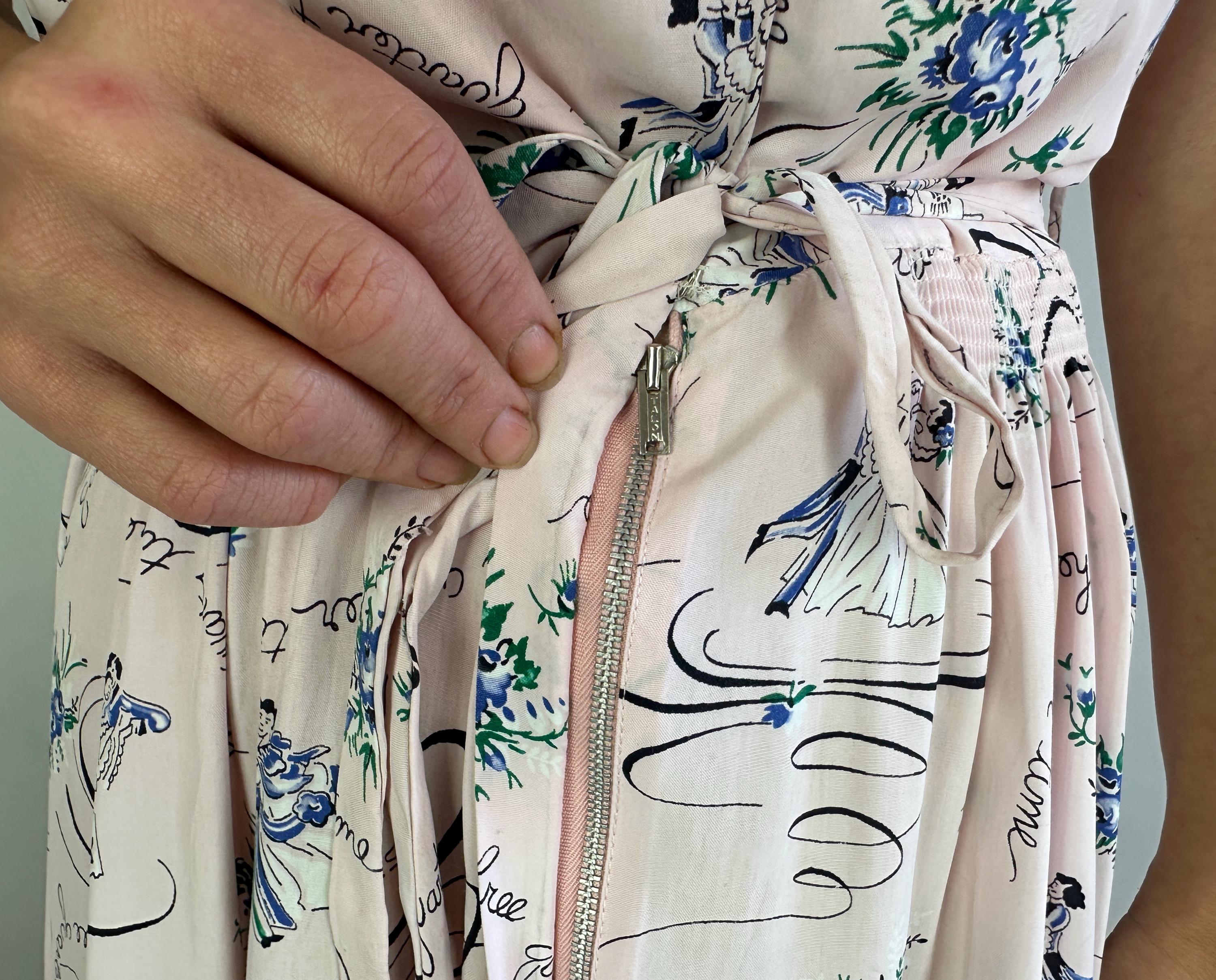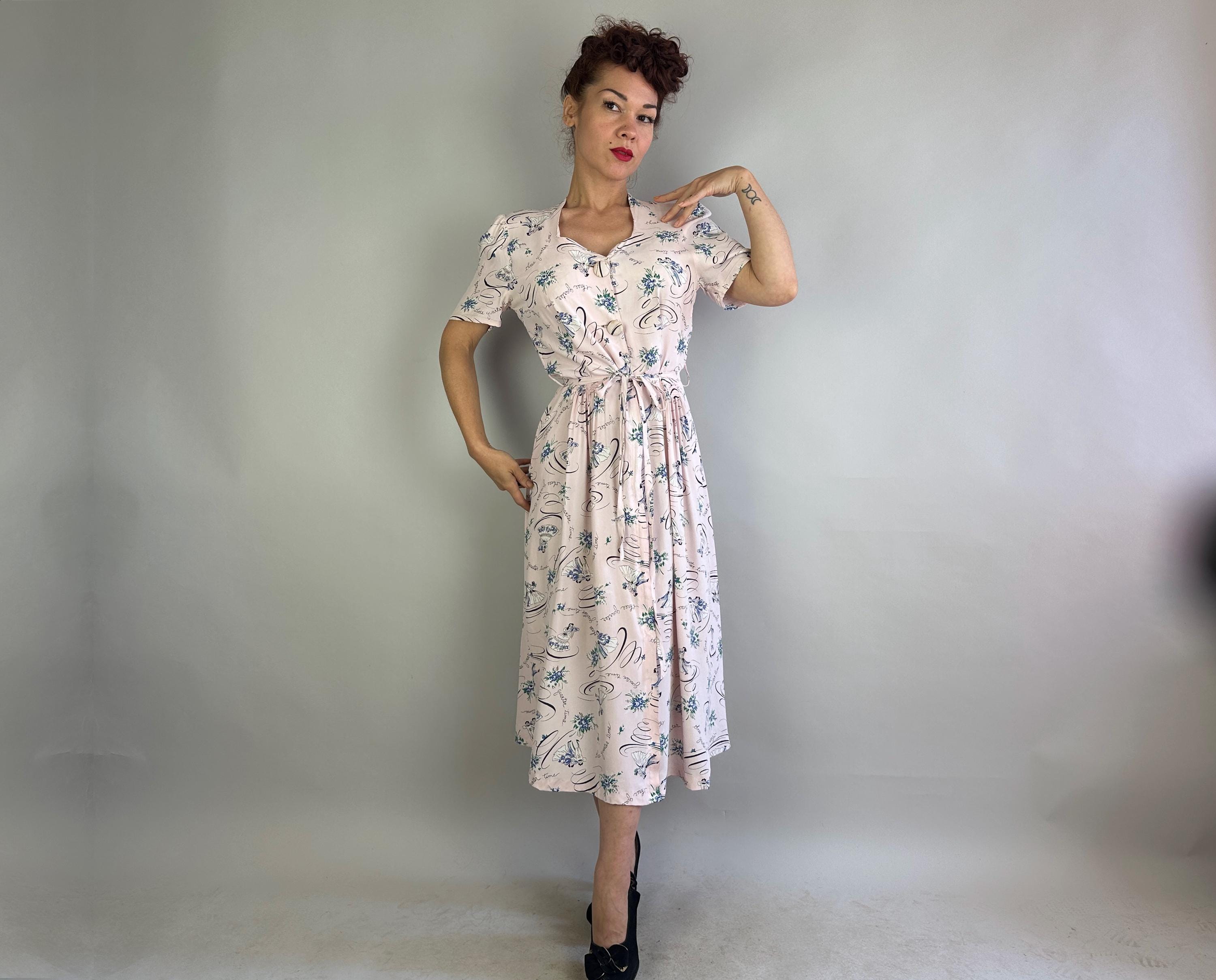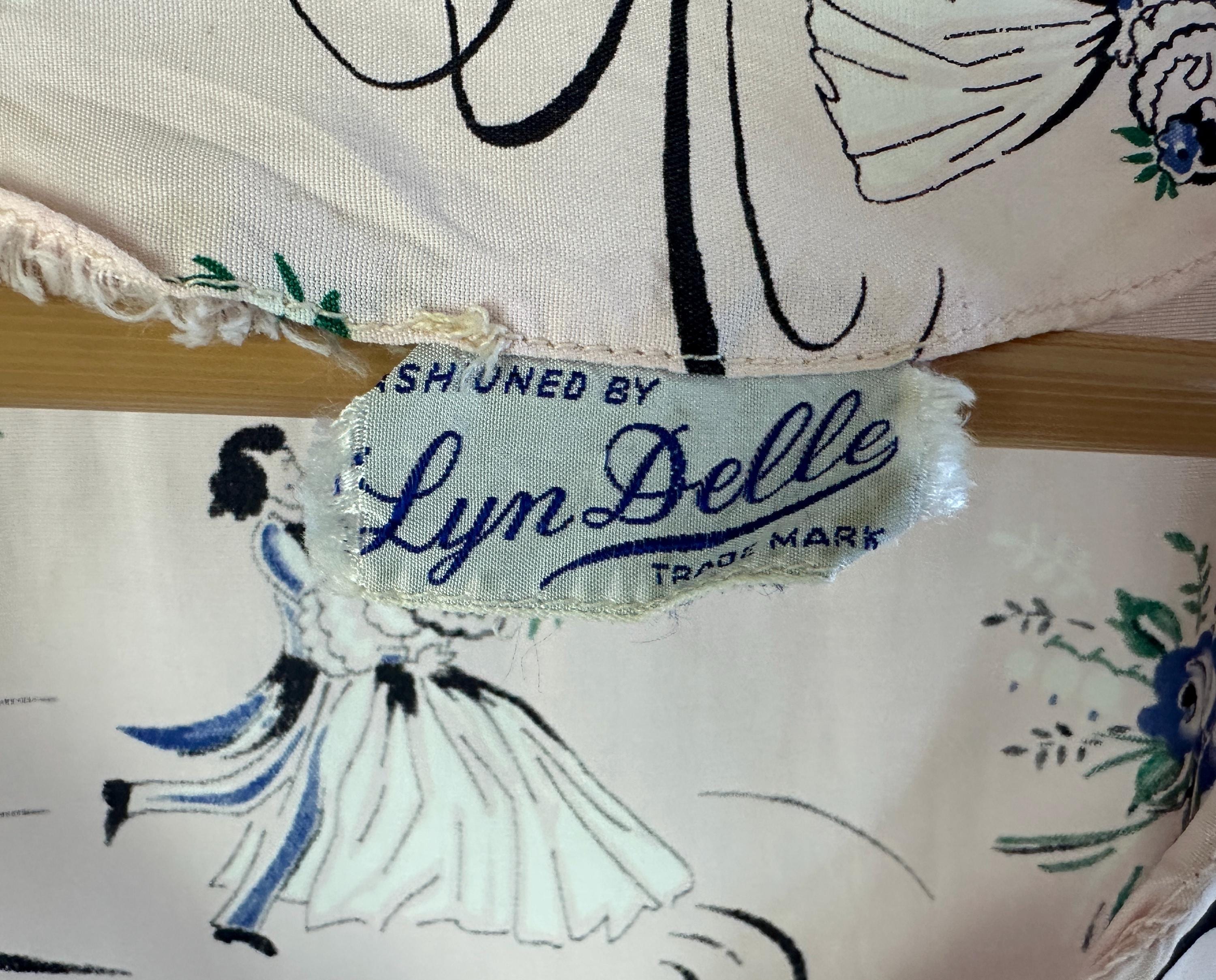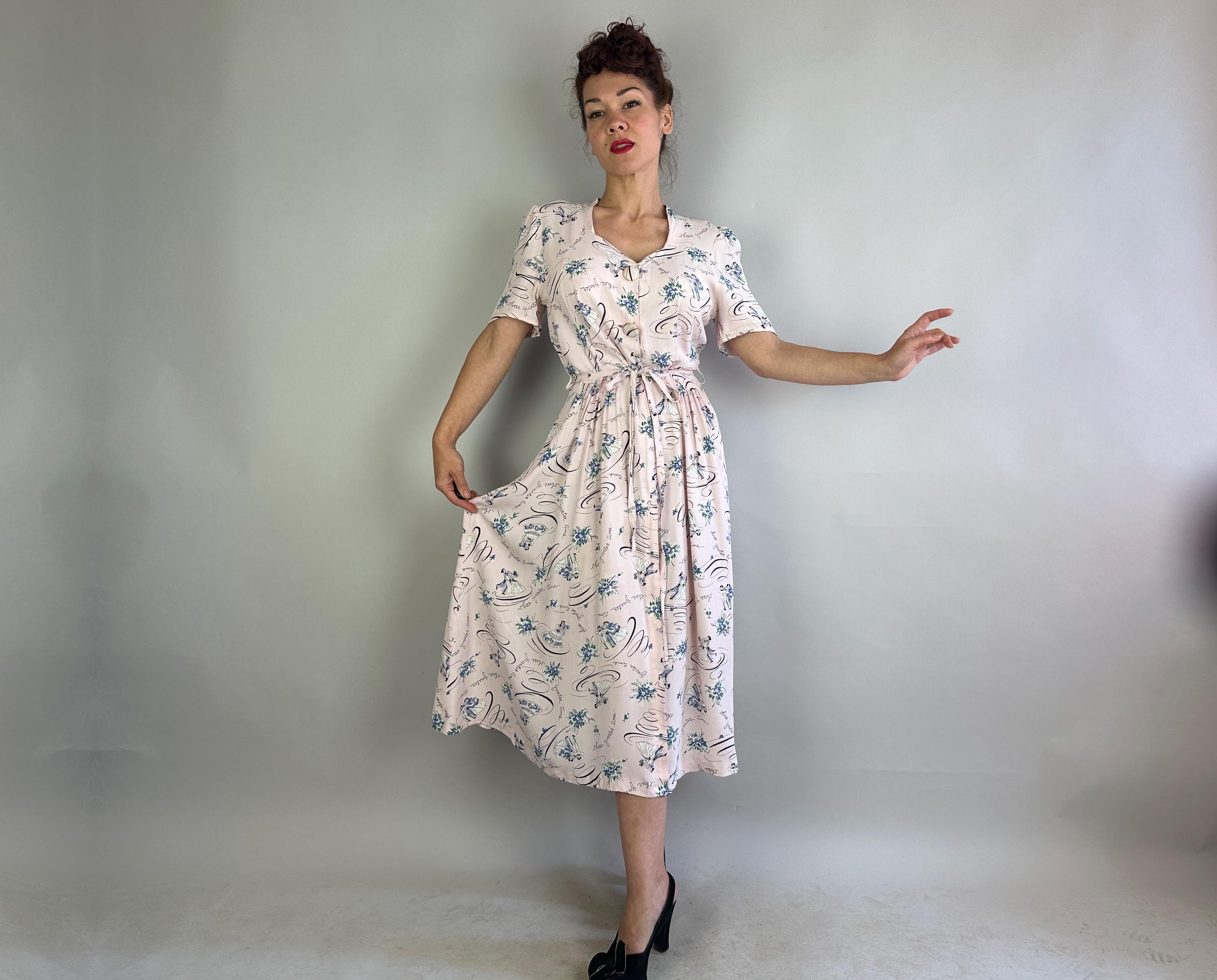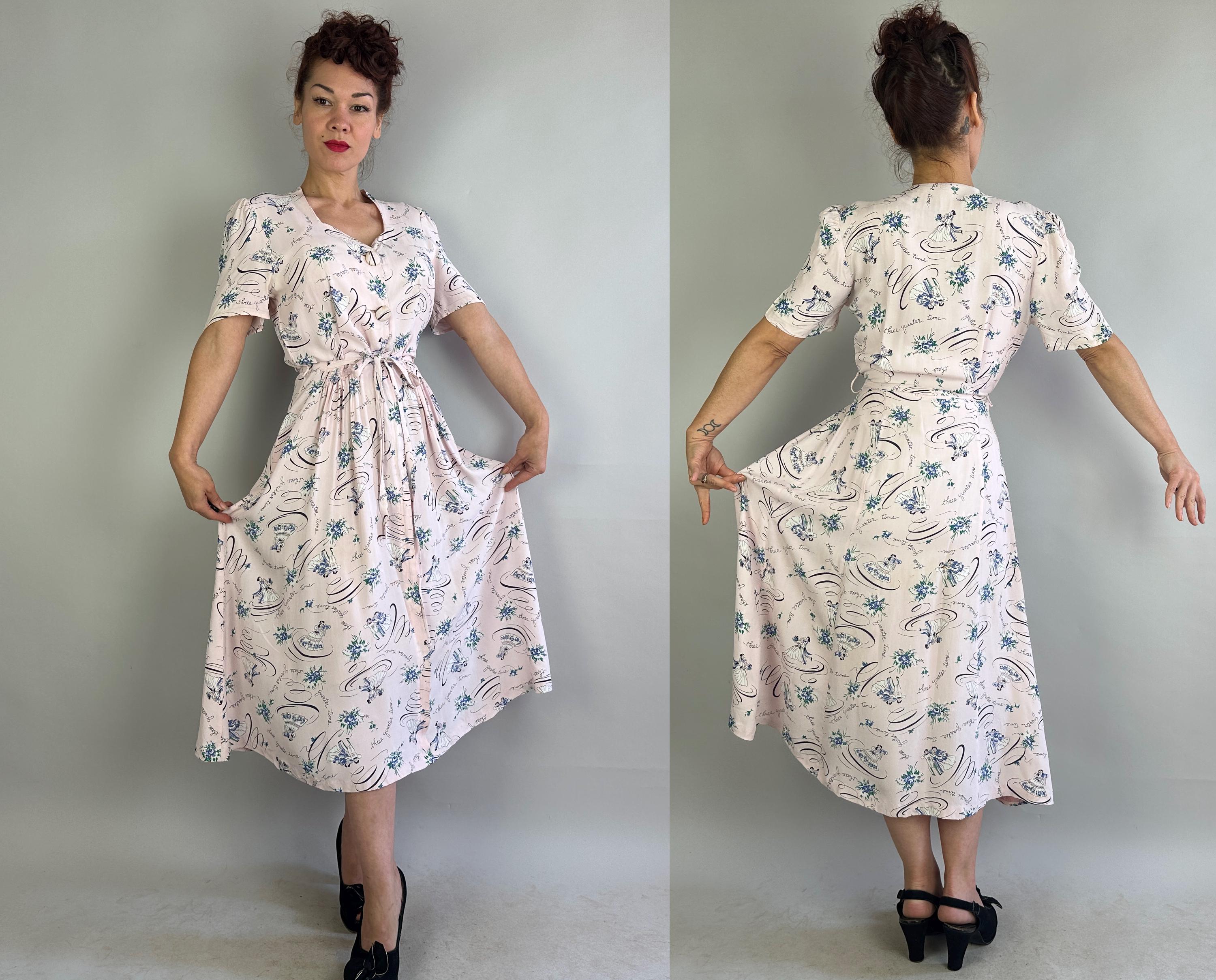 Waltz right in and be a dancer's delight in this 1940s novelty print dress! The palest pink silky rayon has an absolutely darling print of couples dancing, admiral blue and kelly green bouquets, and the words "three quarter time" emblazoned all over. It is styled with sweetheart neckline, self fabric buttons on the bodice, smocking details below the waist, and waist cinching tie belt. A metal "Talon" zipper is hidden behind a placket where it fastens below the button line. Labeled "Lyn Delle". This dress is in good vintage condition, a few faint small marks but no holes or odors to note.