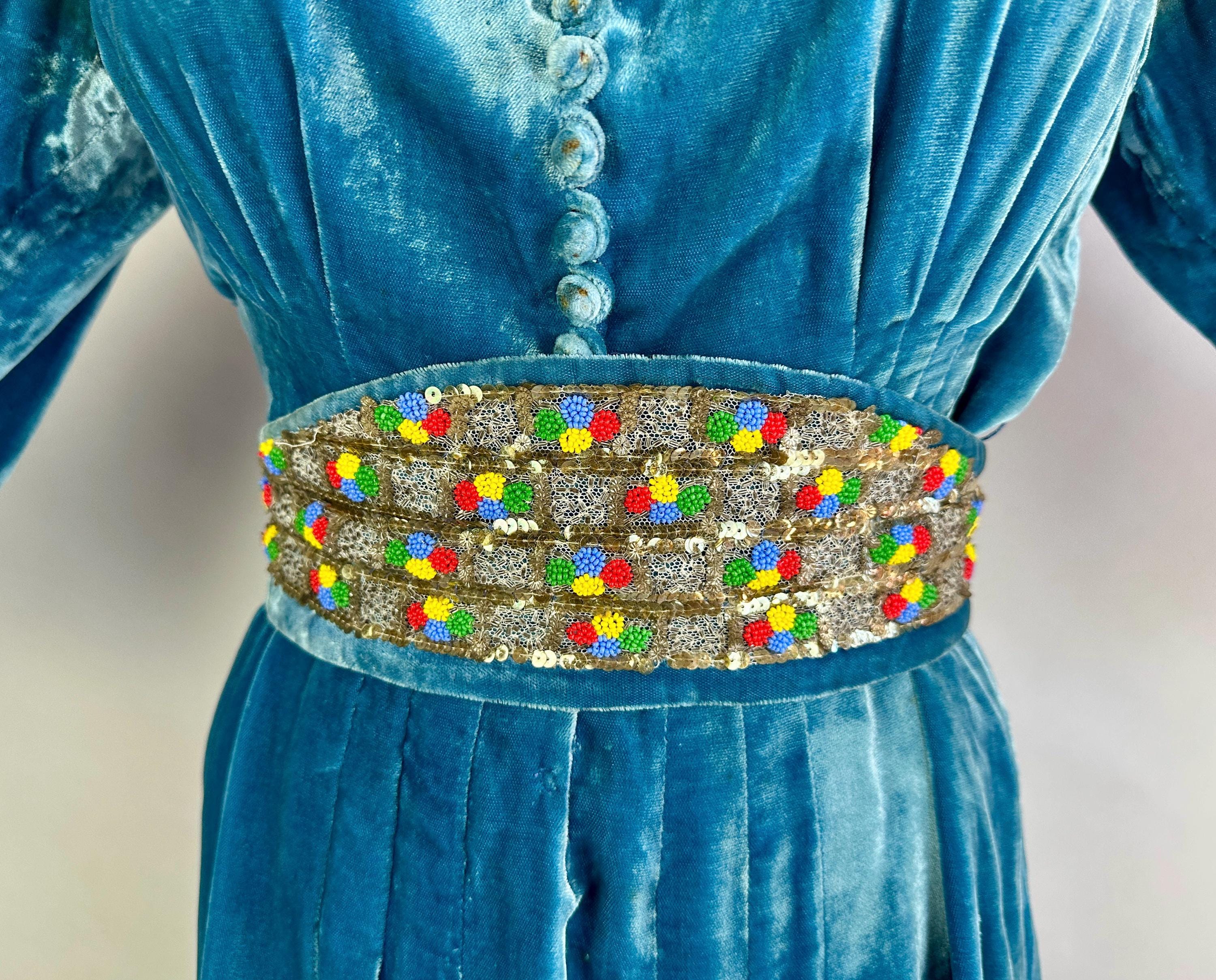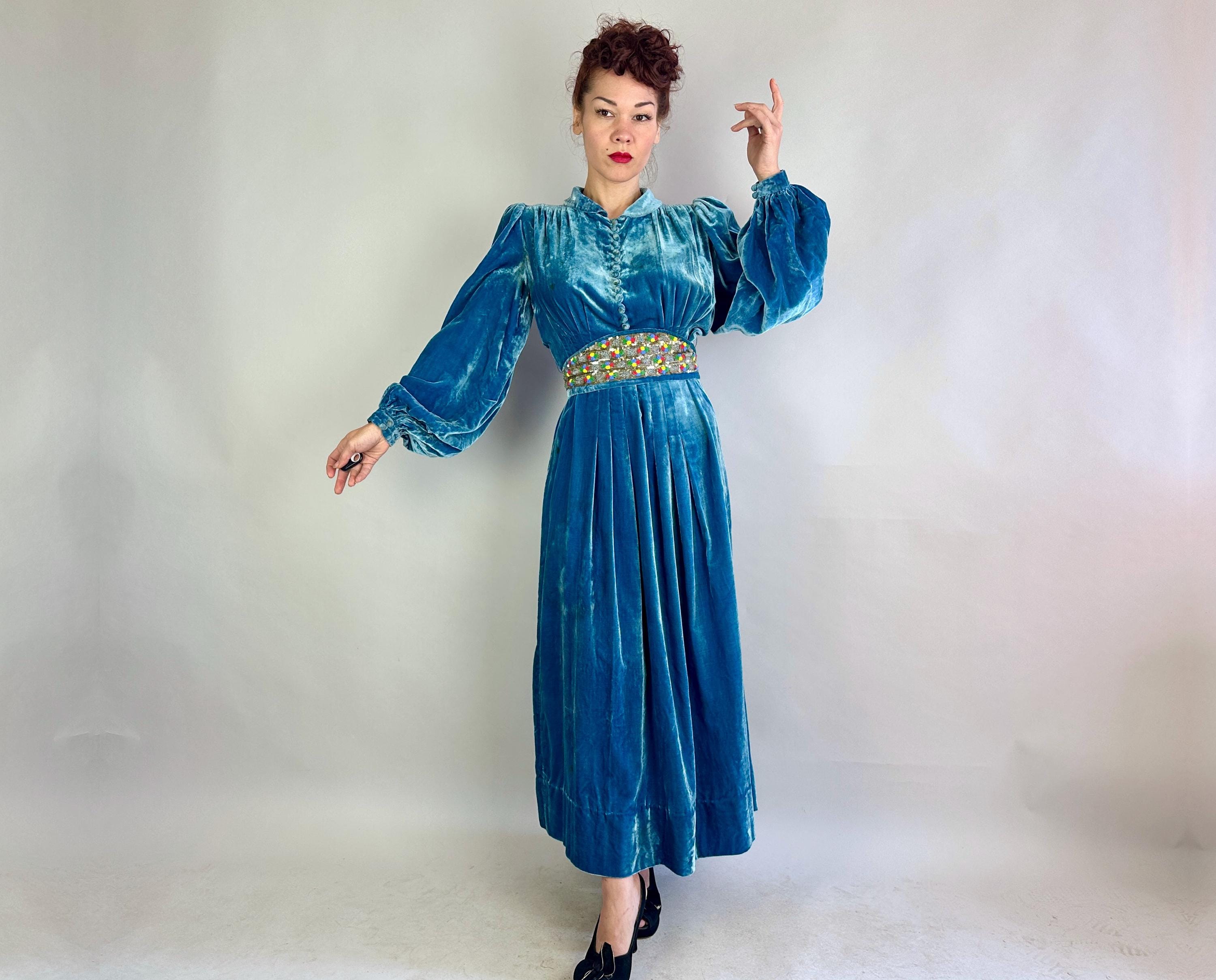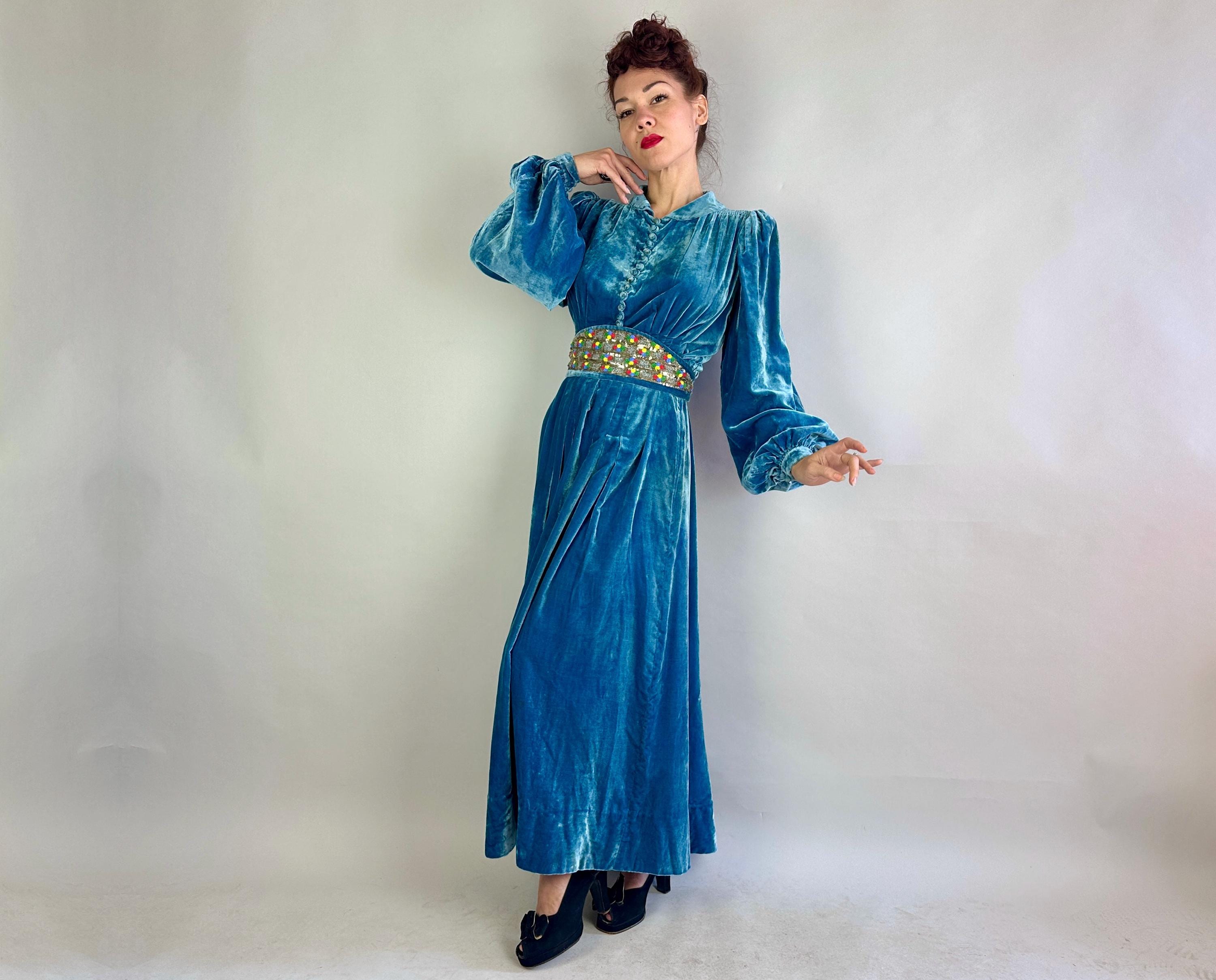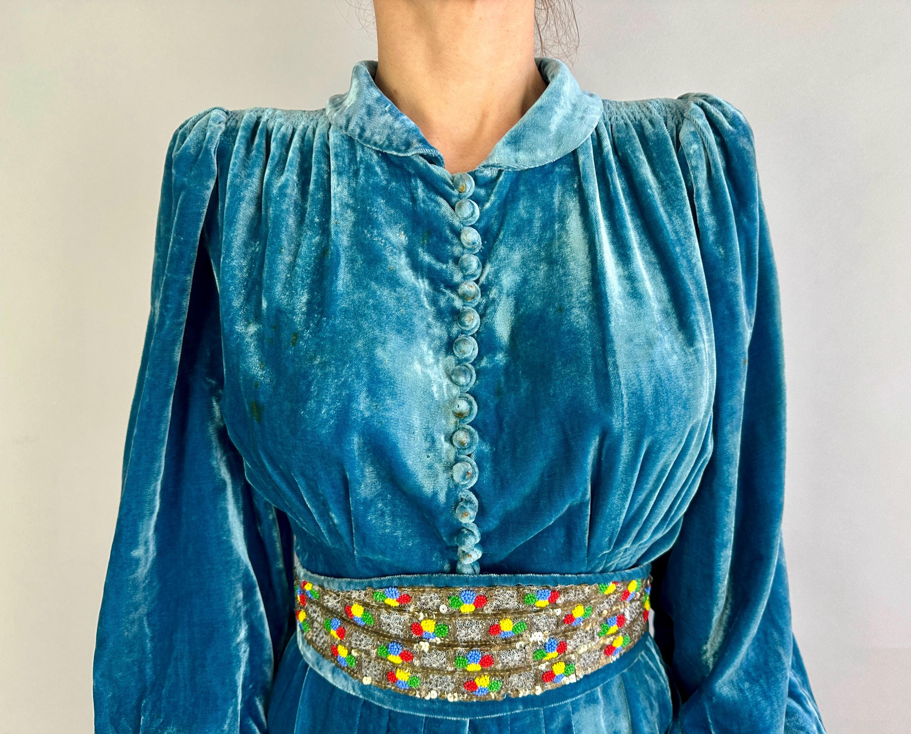 A vision in blue velvet, this 1930s dress will send you to heaven! Silk velvet has an incredible sheen in icy blue while a self fabric cummerbund style belt is covered in netting with silver gelatin sequins and spangles and clusters of seeds beads in primary shades of red, blue, yellow, and green. The dress is beautifully styled with sixteen loop buttons up the bodice, shoulder smocking, poet sleeves with double loop button cuffs, and mirrored pleated darts above and below the waistline. This dress is in good vintage condition, faint small spots here and there that are easily forgotten with the high sheen of the velvet and no odors or holes to note.