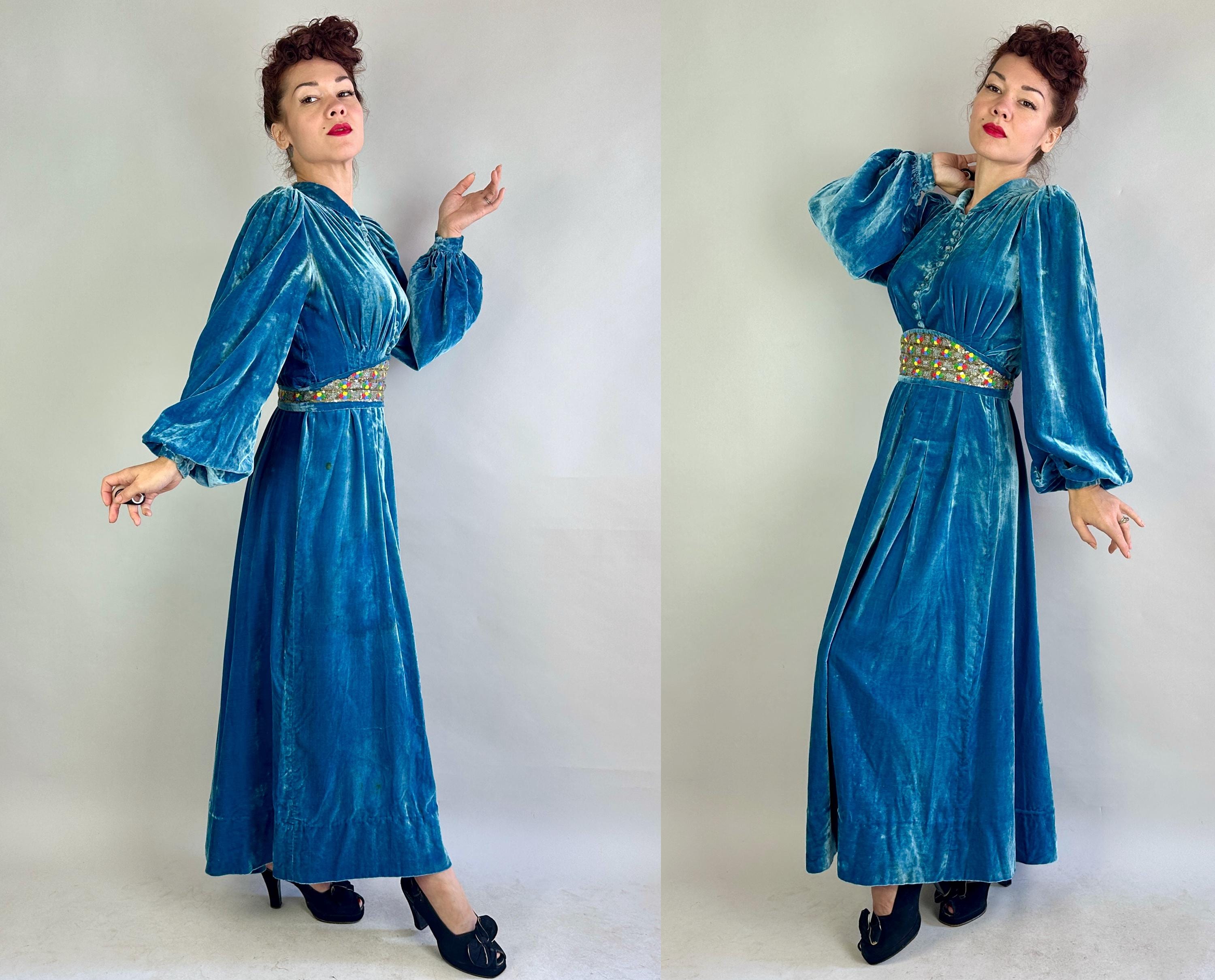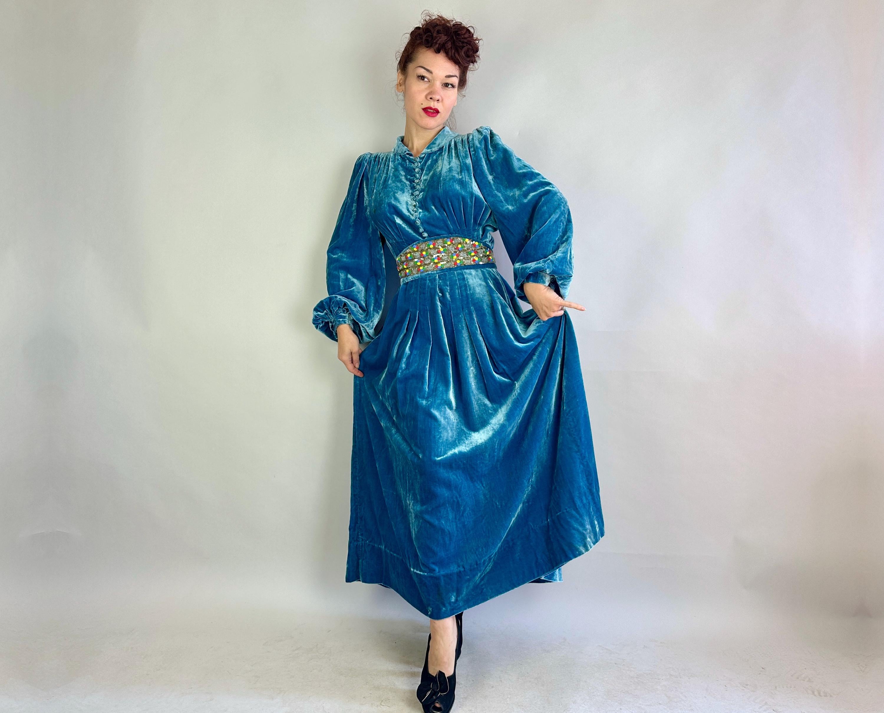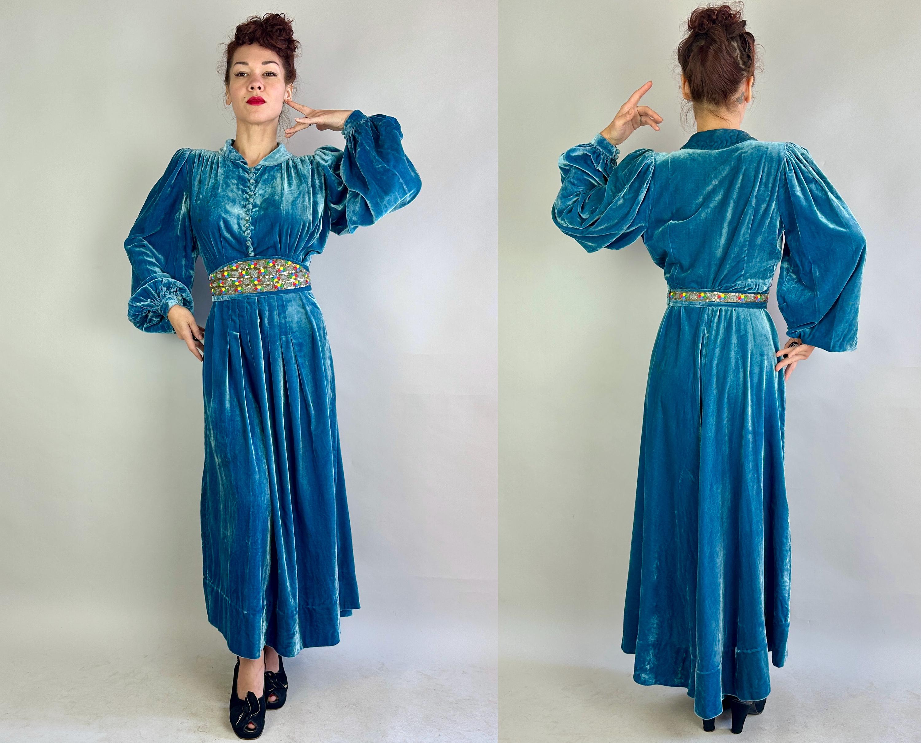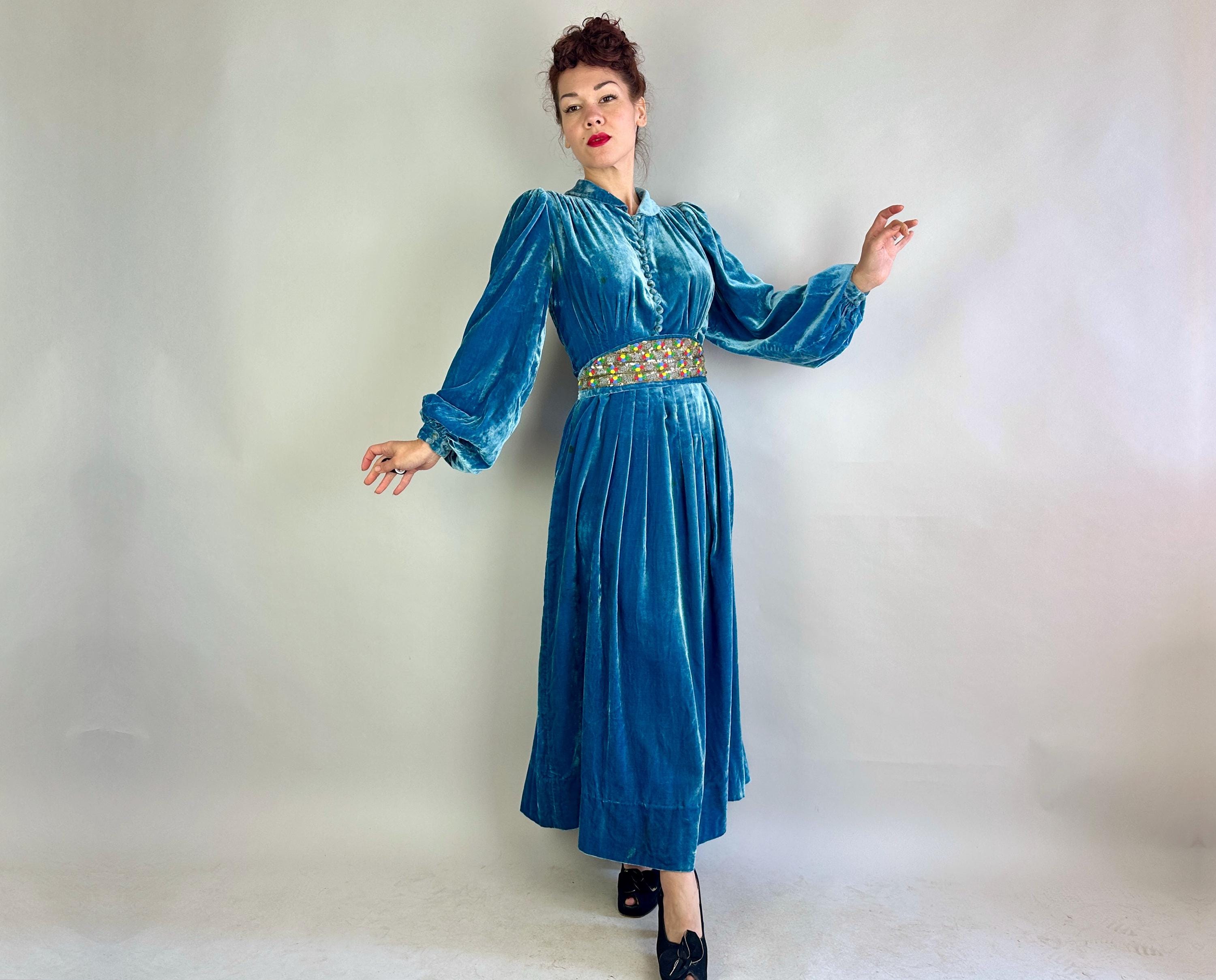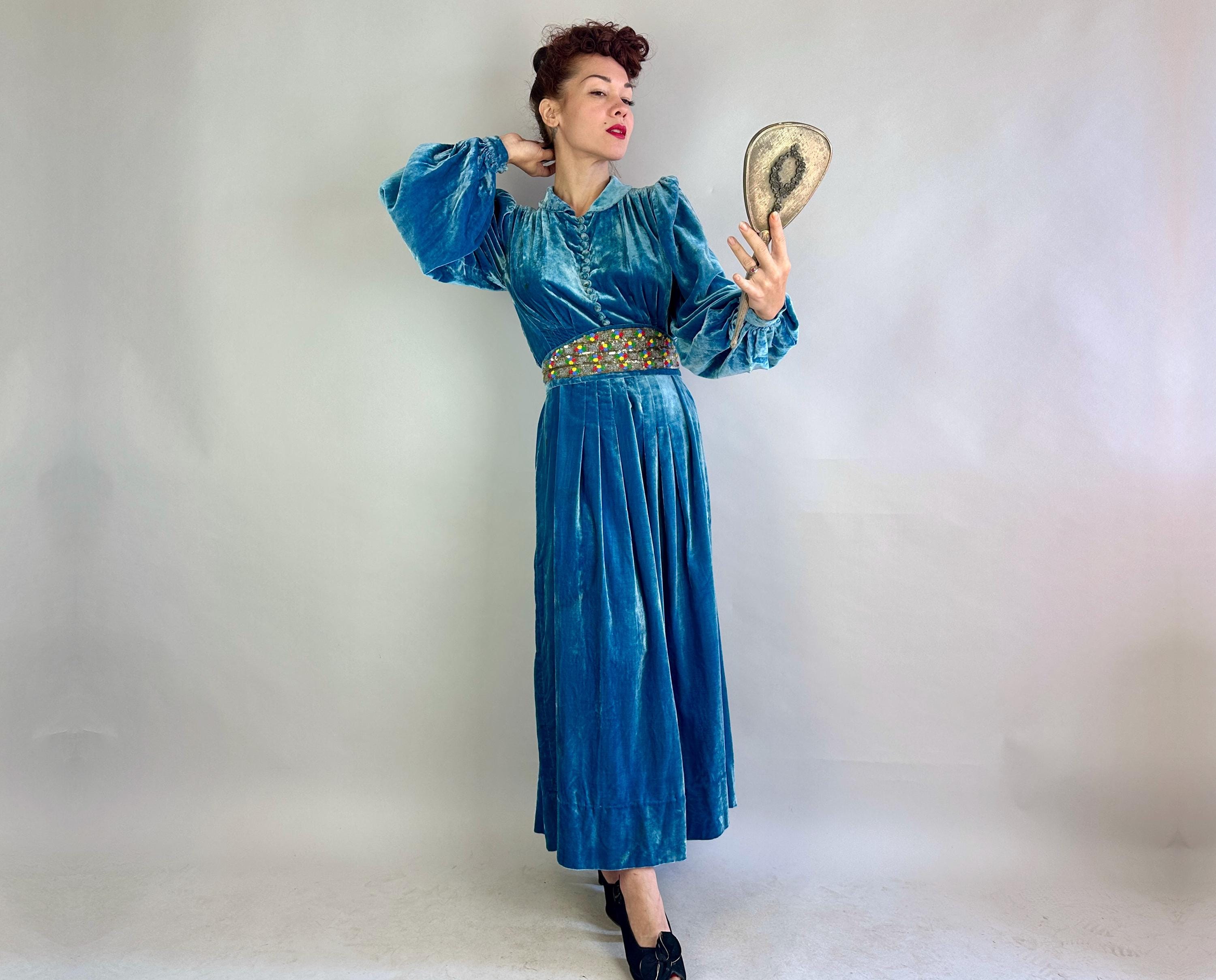 A vision in blue velvet, this 1930s dress will send you to heaven! Silk velvet has an incredible sheen in icy blue while a self fabric cummerbund style belt is covered in netting with silver gelatin sequins and spangles and clusters of seeds beads in primary shades of red, blue, yellow, and green. The dress is beautifully styled with sixteen loop buttons up the bodice, shoulder smocking, poet sleeves with double loop button cuffs, and mirrored pleated darts above and below the waistline. This dress is in good vintage condition, faint small spots here and there that are easily forgotten with the high sheen of the velvet and no odors or holes to note.