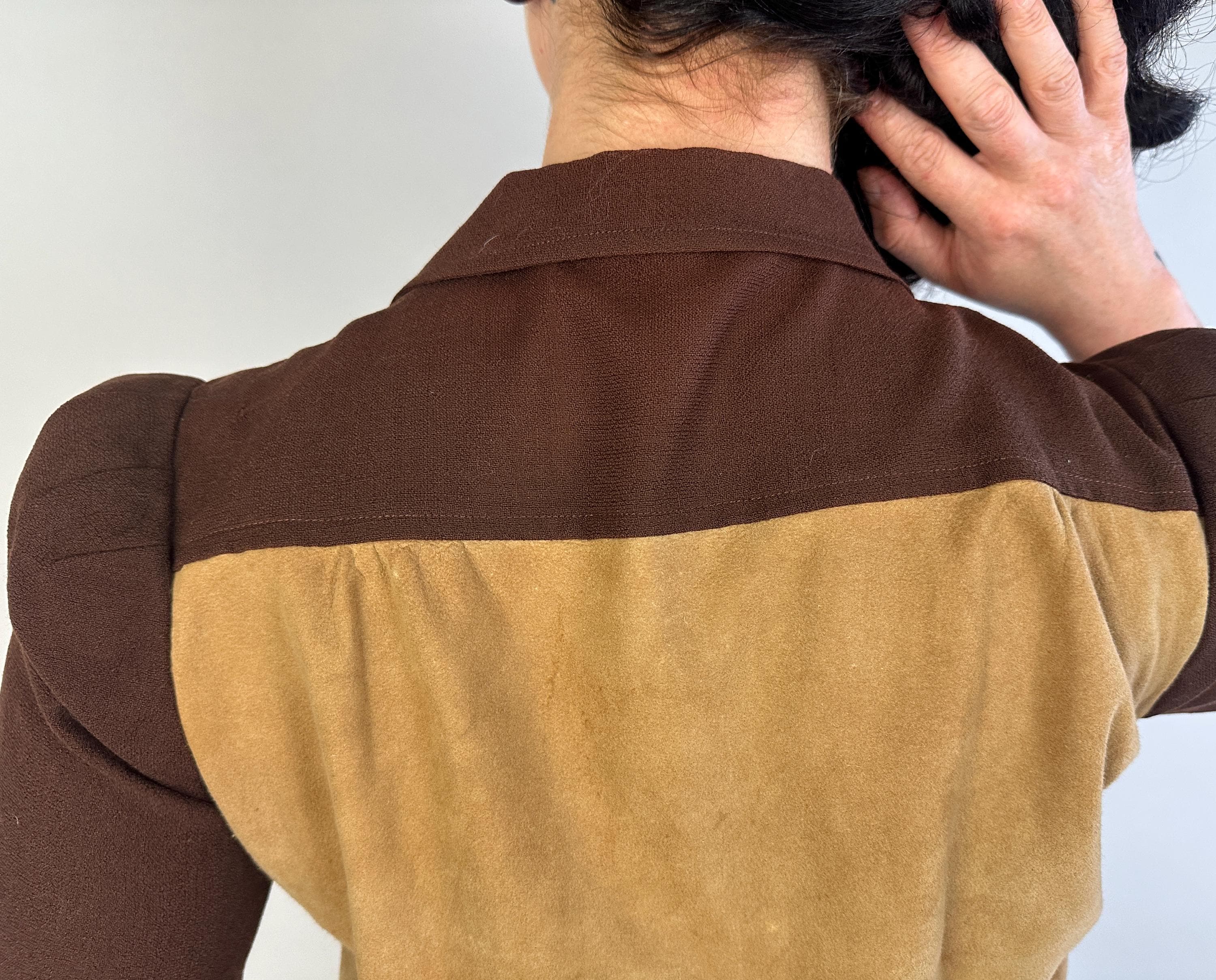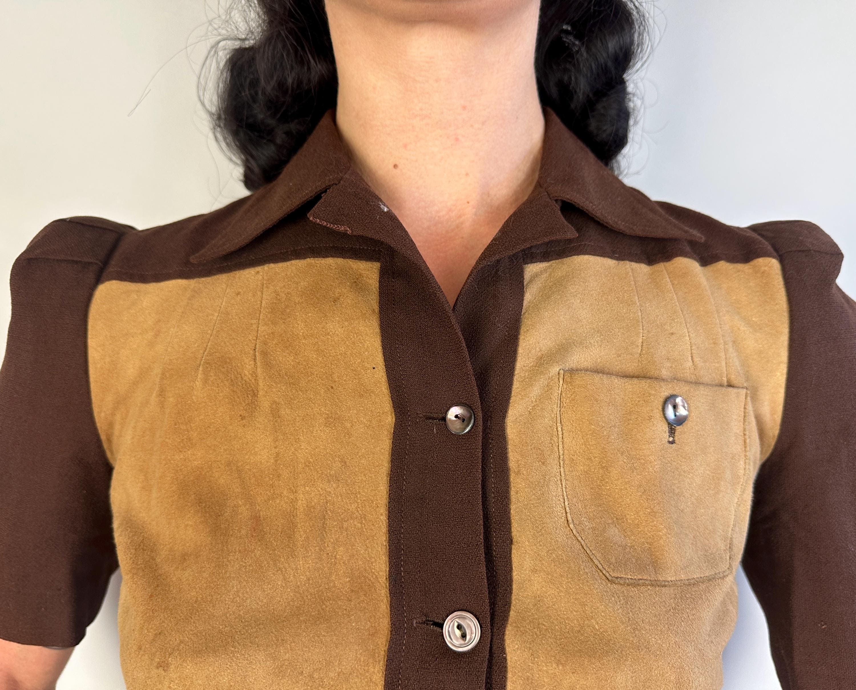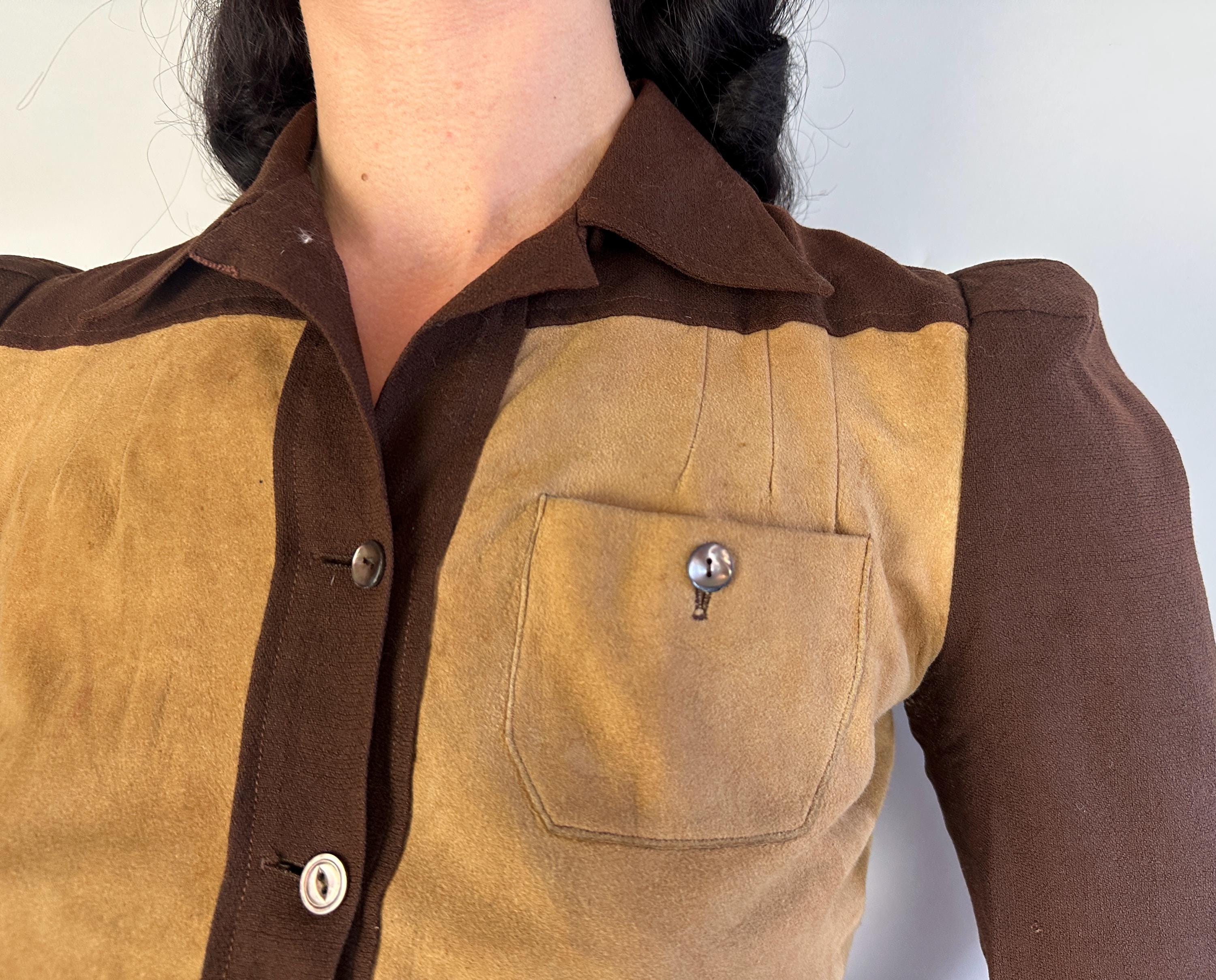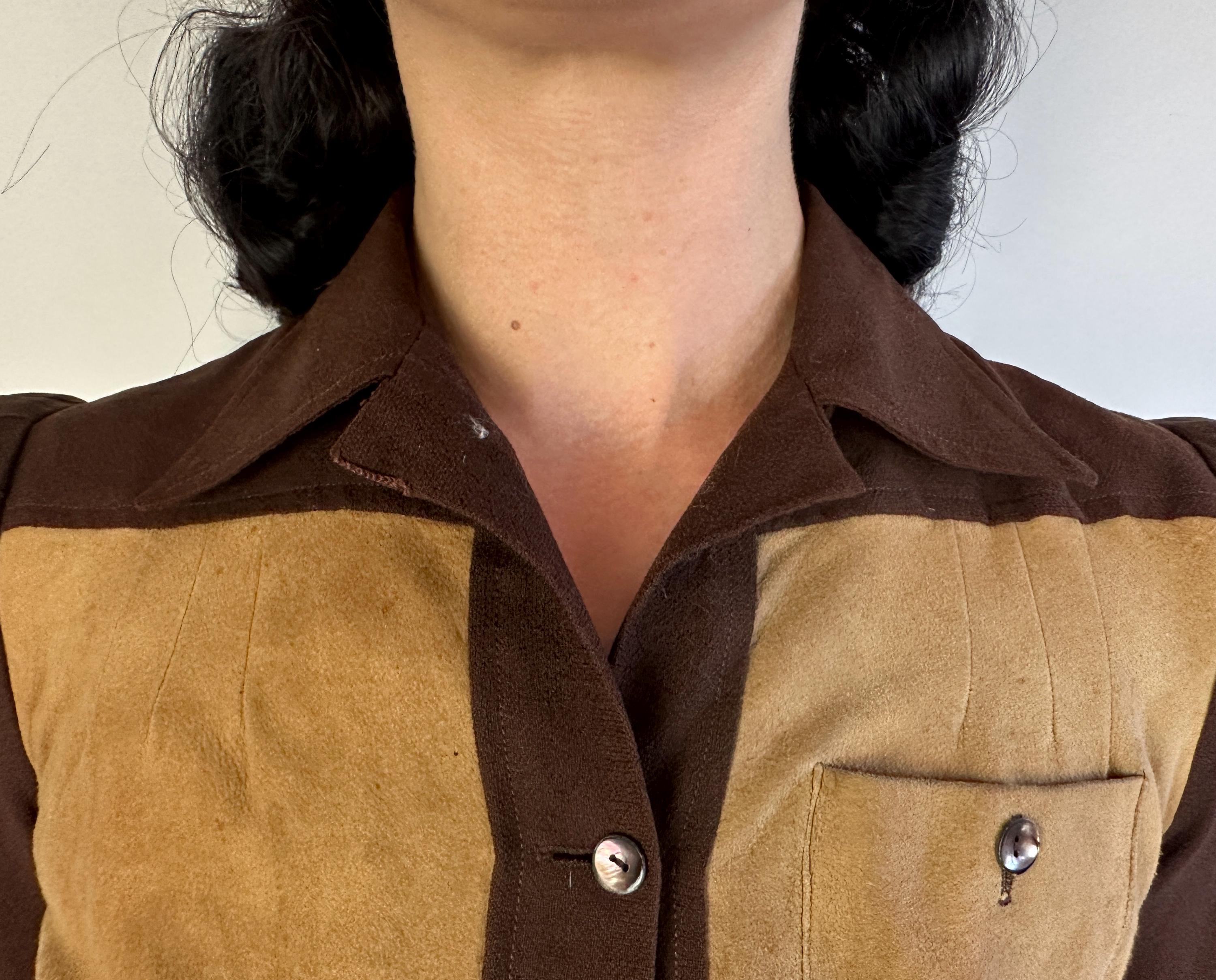 When it's time for a starlet to get playful she would surely keep chic by wearing this 1930s top! The epitome of sporty and stylish, this shirt combines camel beige suede and chocolate brown wool crepe in a colour and fabric block style. Details include padded puff sleeves with pleating, darting below the yoke, and a buttoning patch pocket on the chest. The buttons are made from shell in a lovely oil slick shade. This shirt is in good vintage condition, a bit of very faint marking but no holes or odors to note.