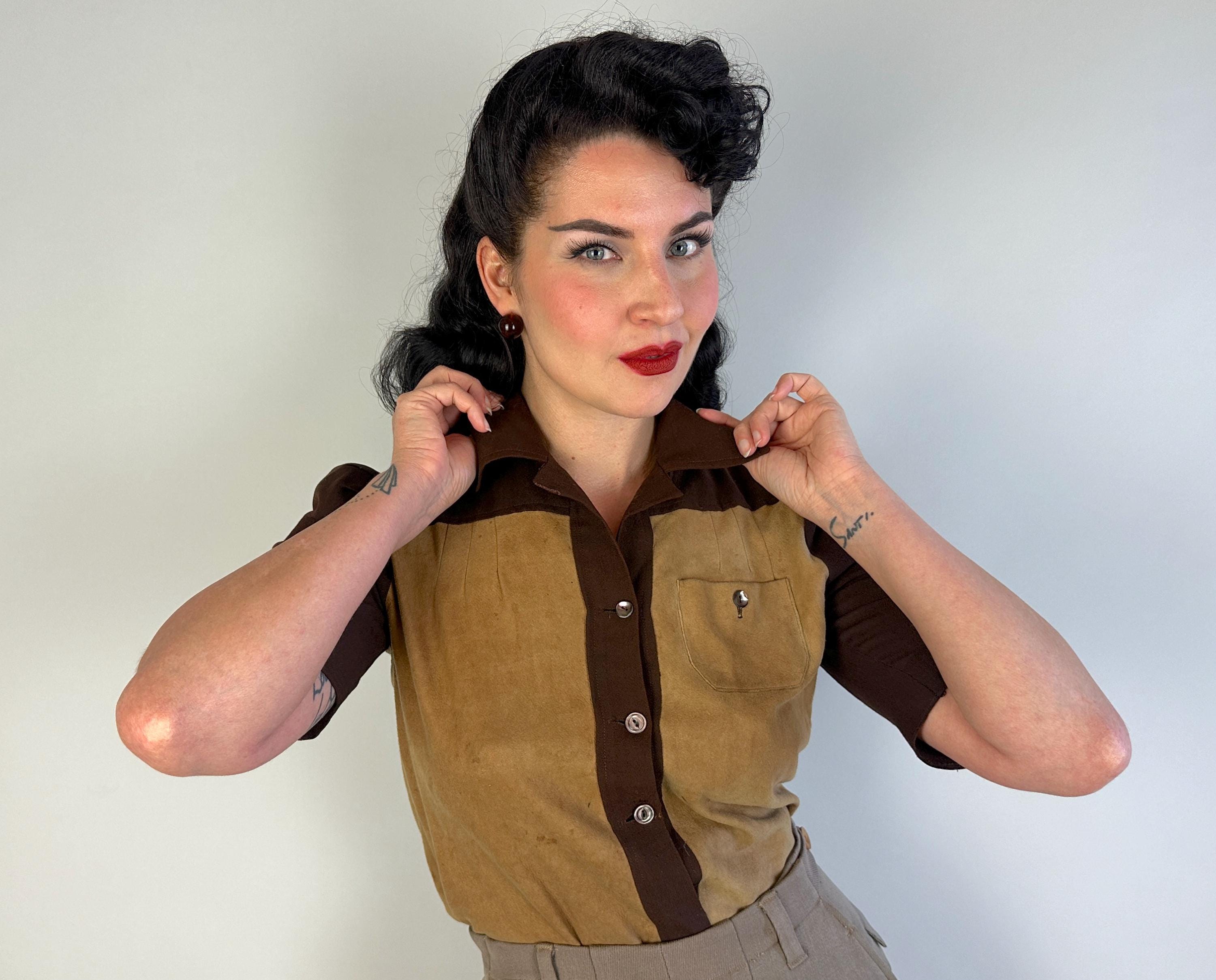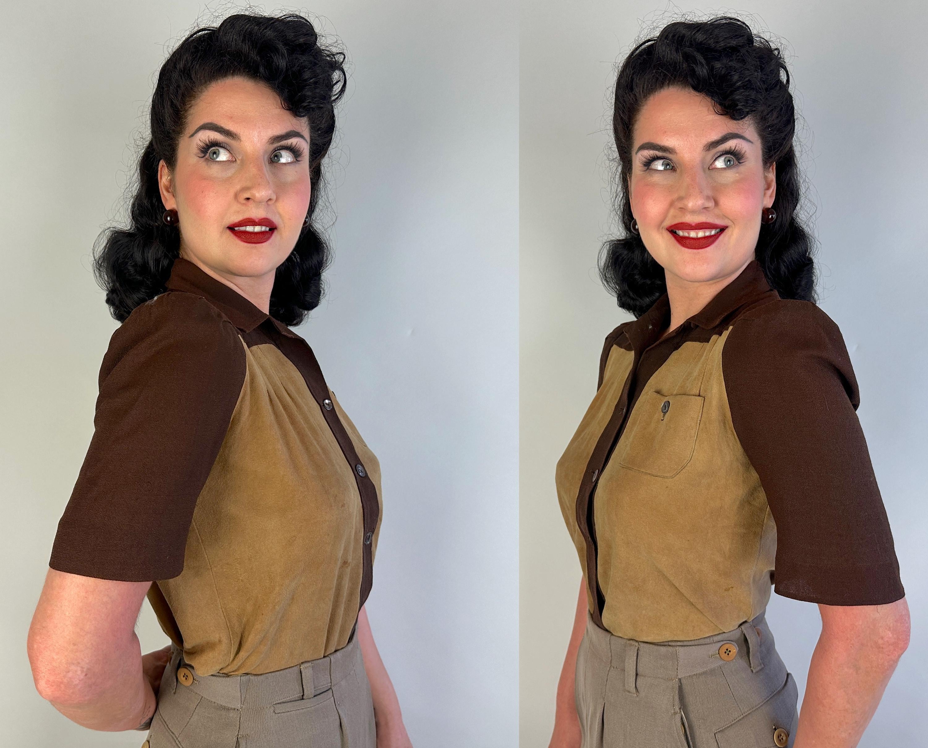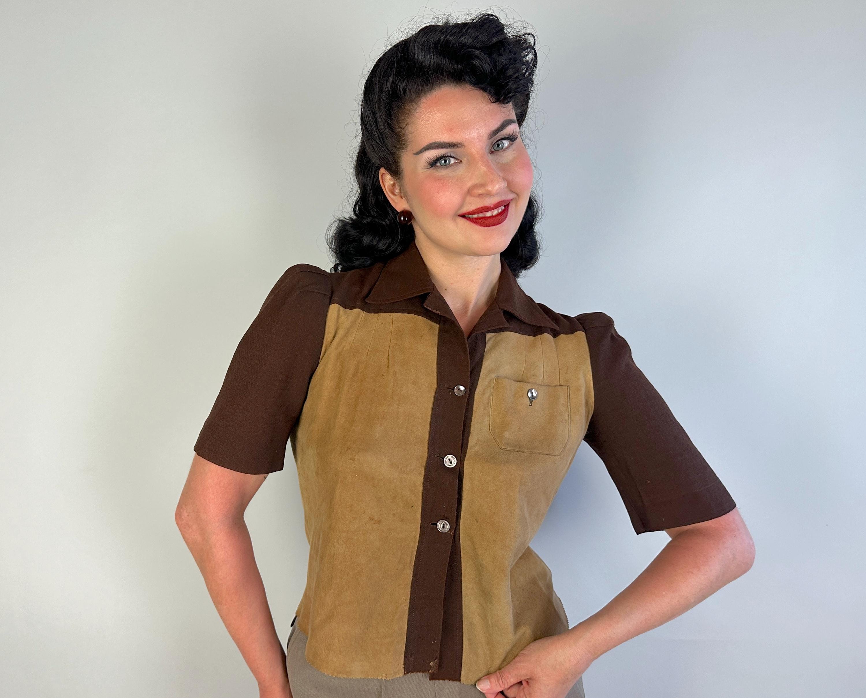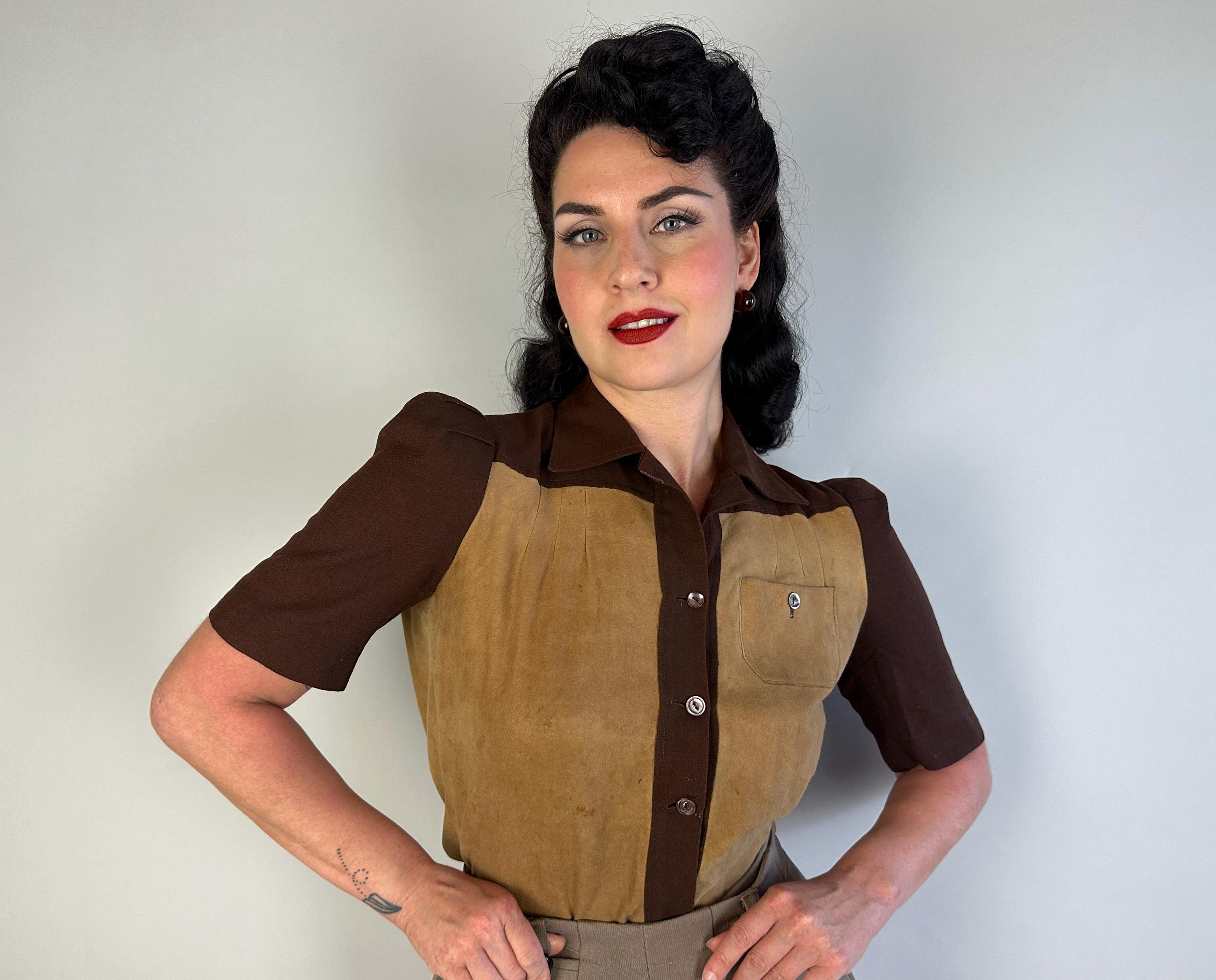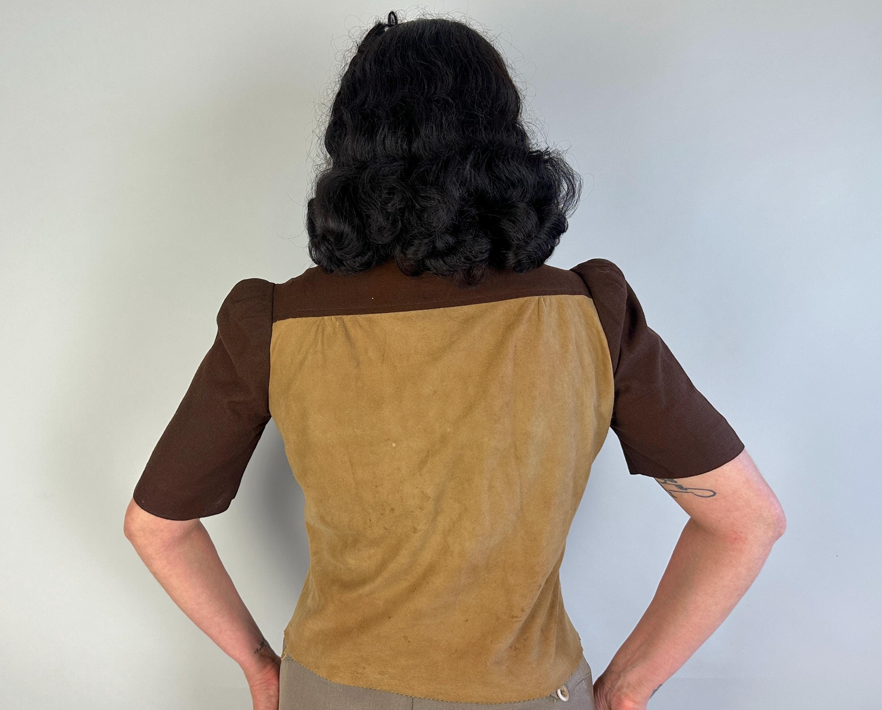 When it's time for a starlet to get playful she would surely keep chic by wearing this 1930s top! The epitome of sporty and stylish, this shirt combines camel beige suede and chocolate brown wool crepe in a colour and fabric block style. Details include padded puff sleeves with pleating, darting below the yoke, and a buttoning patch pocket on the chest. The buttons are made from shell in a lovely oil slick shade. This shirt is in good vintage condition, a bit of very faint marking but no holes or odors to note.