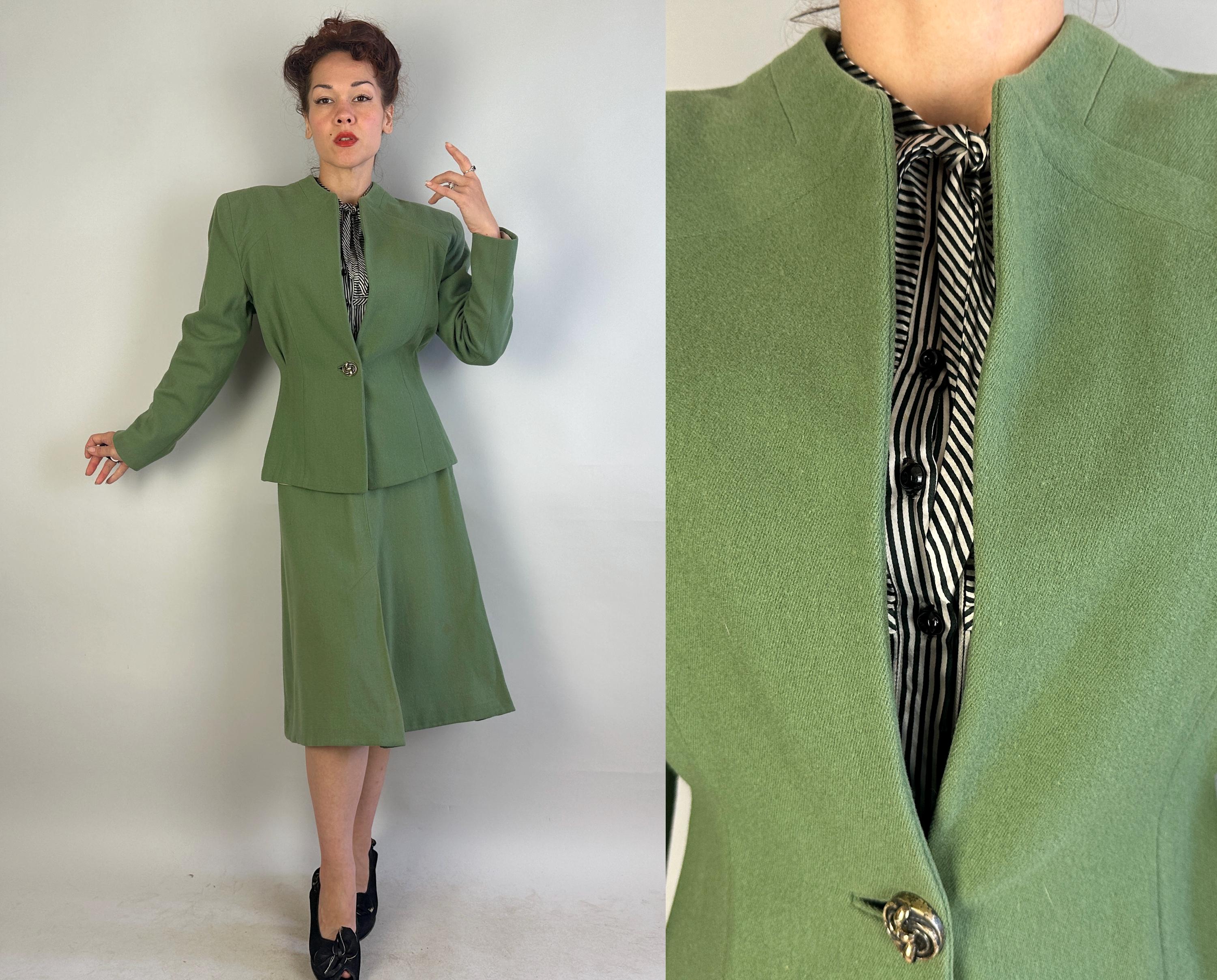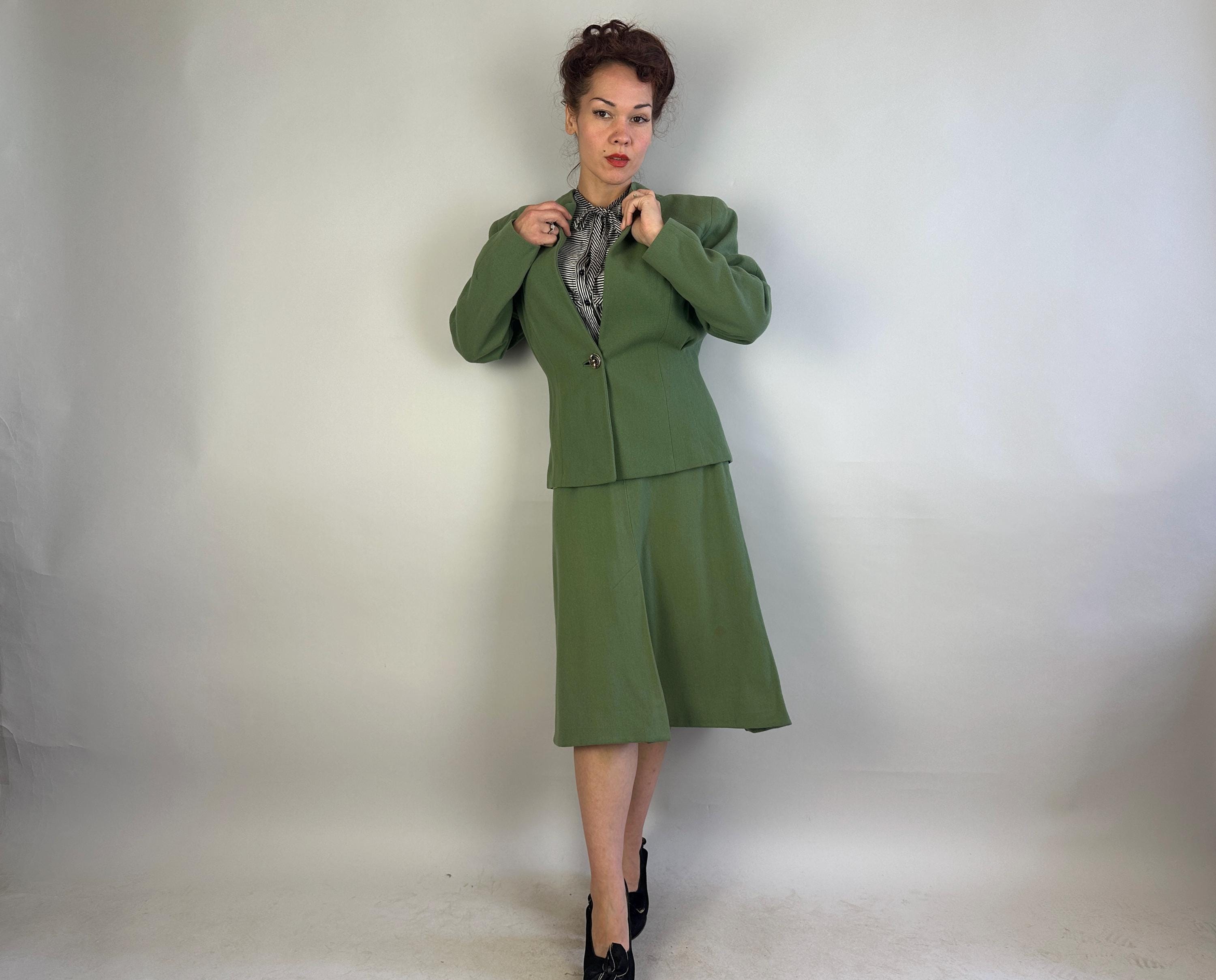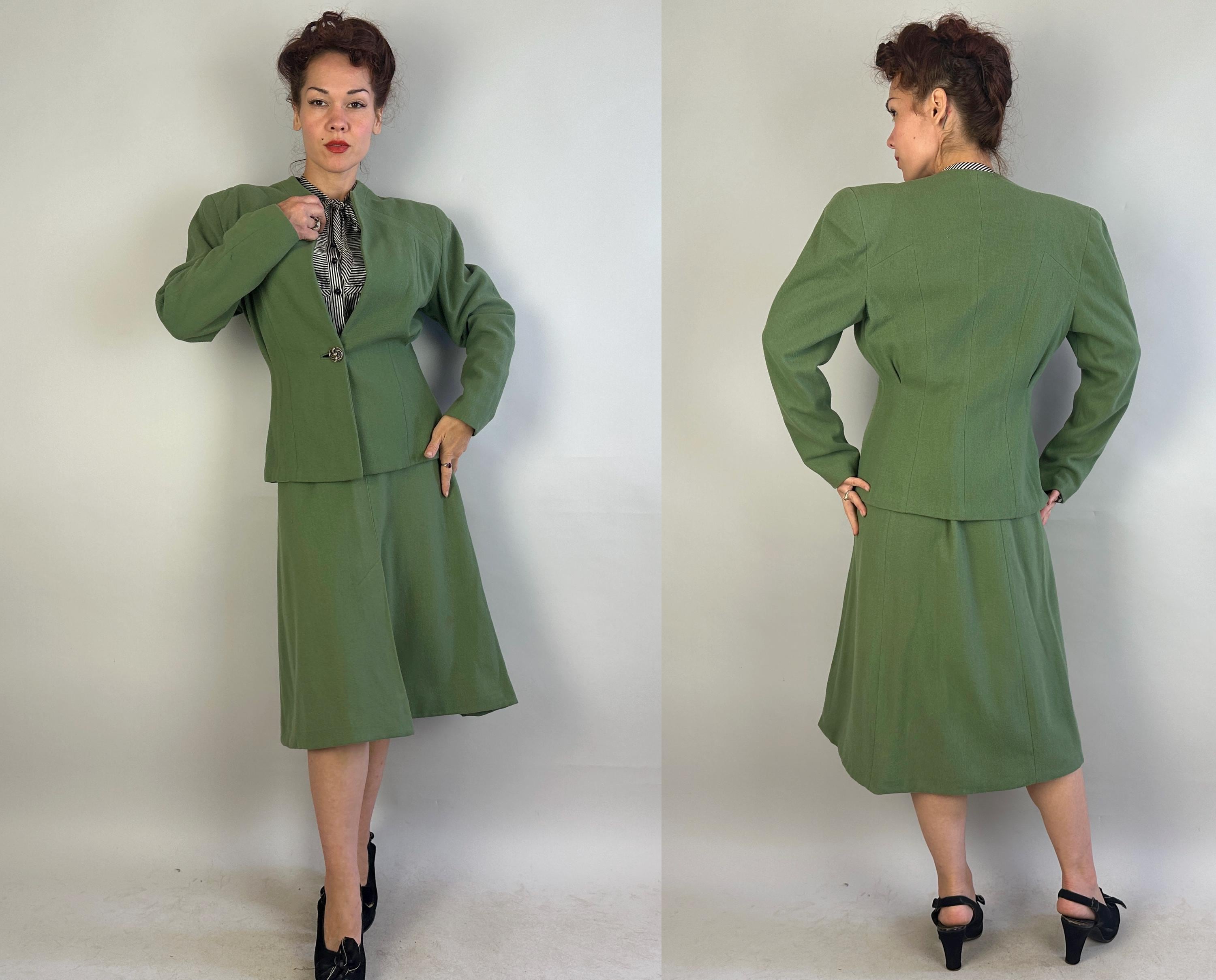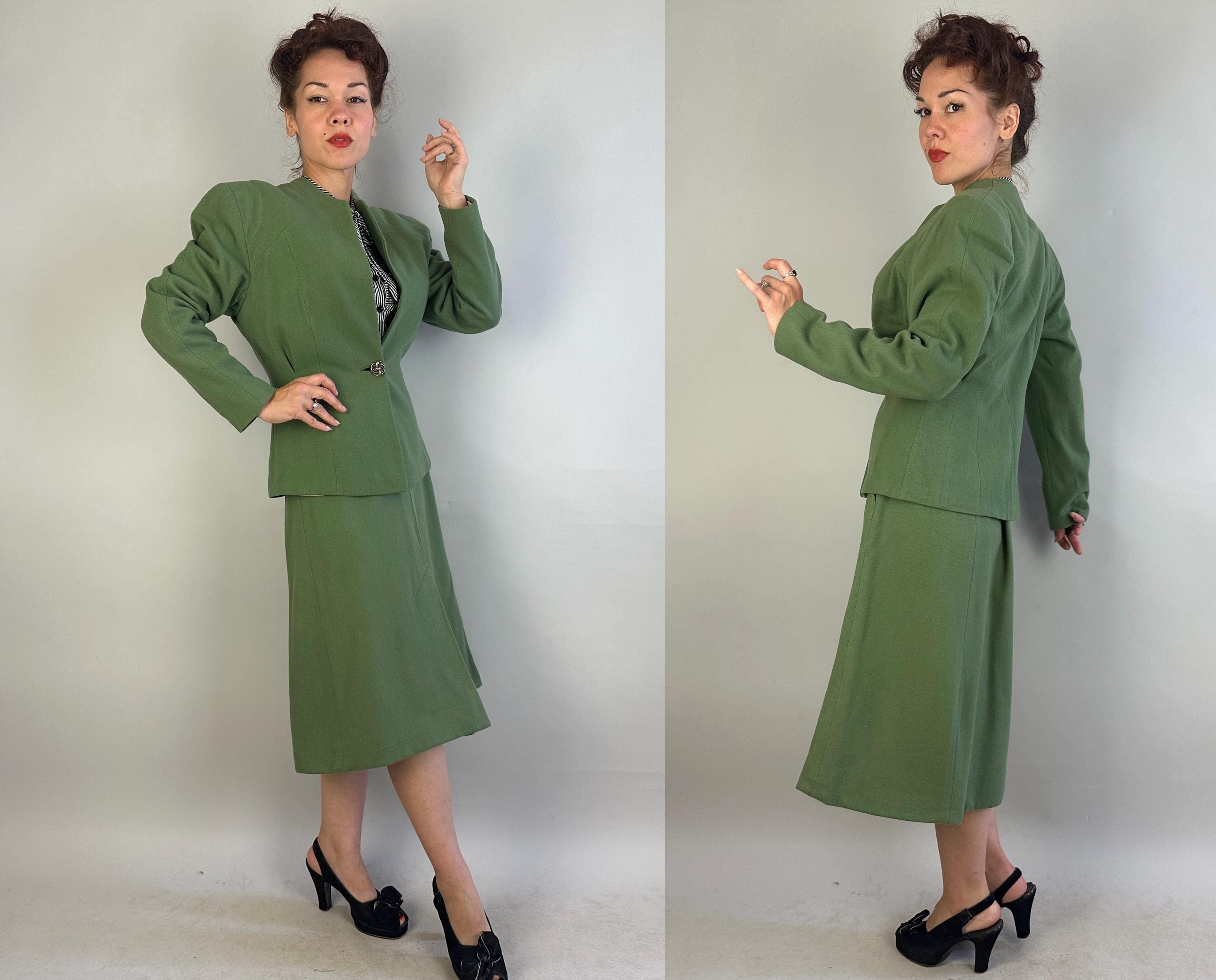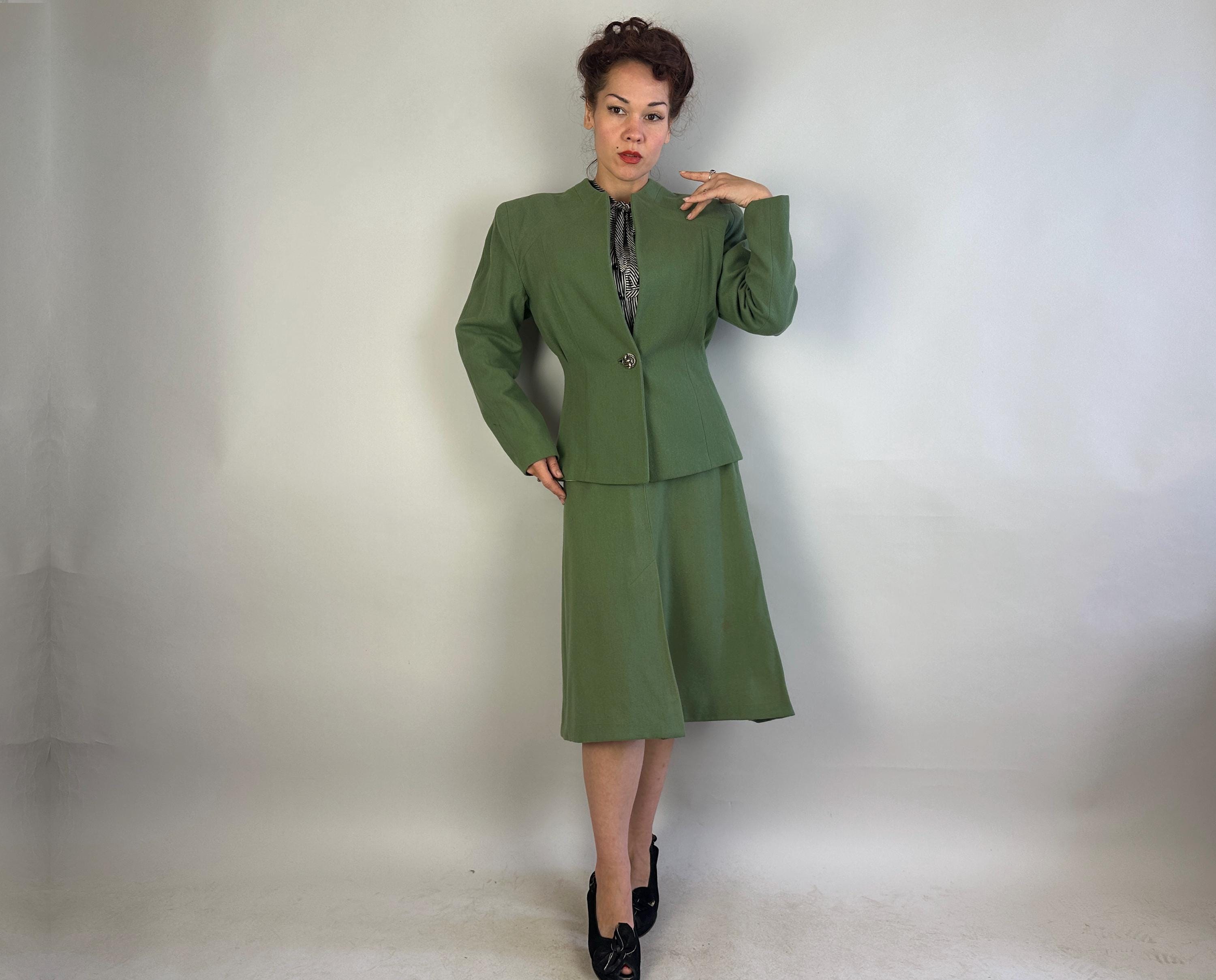 You've got the mind of a sage when it comes to fashion and this smart 1940s suit will make that known! Made of wool in sage green with a classic 40’s silhouette, the jacket has strong padded shoulders and nipped waist fastened by a single metallic button with three dimensional knot element. Geometric seaming plays up the lapel-less neckline and invertd box pleat darts are another shaping detail. Fully lined with rayon crepe. The skirt is lightly flared with a front knife kick pleat and a metal zipper and button fasten on the side. This suit is in good vintage condition, one very subtle mend and a couple extremely faint marks but no holes or odors to note. Suit has been pinned on model to show fit.