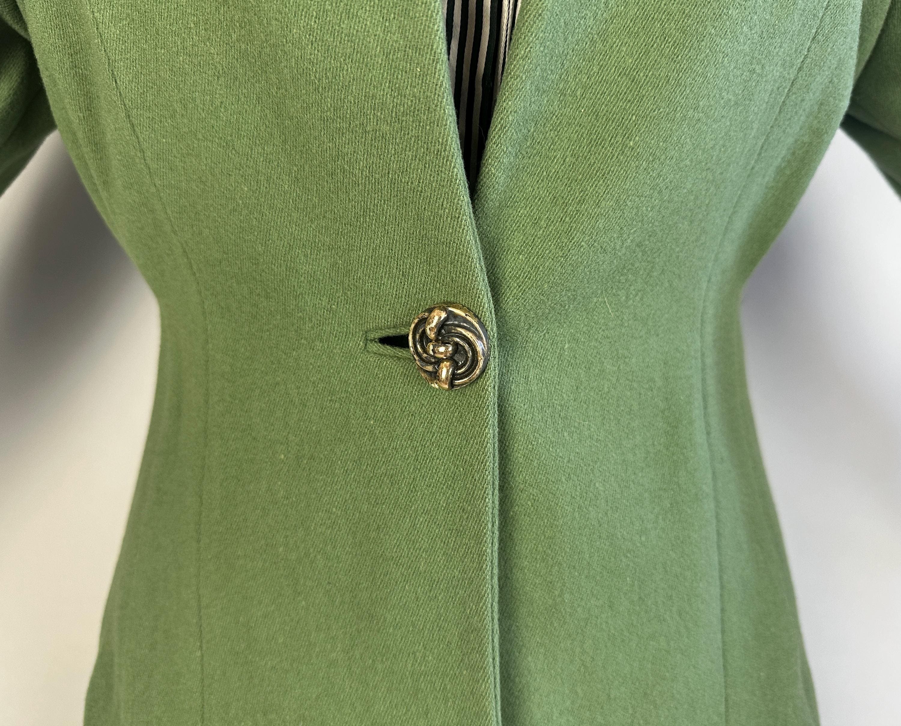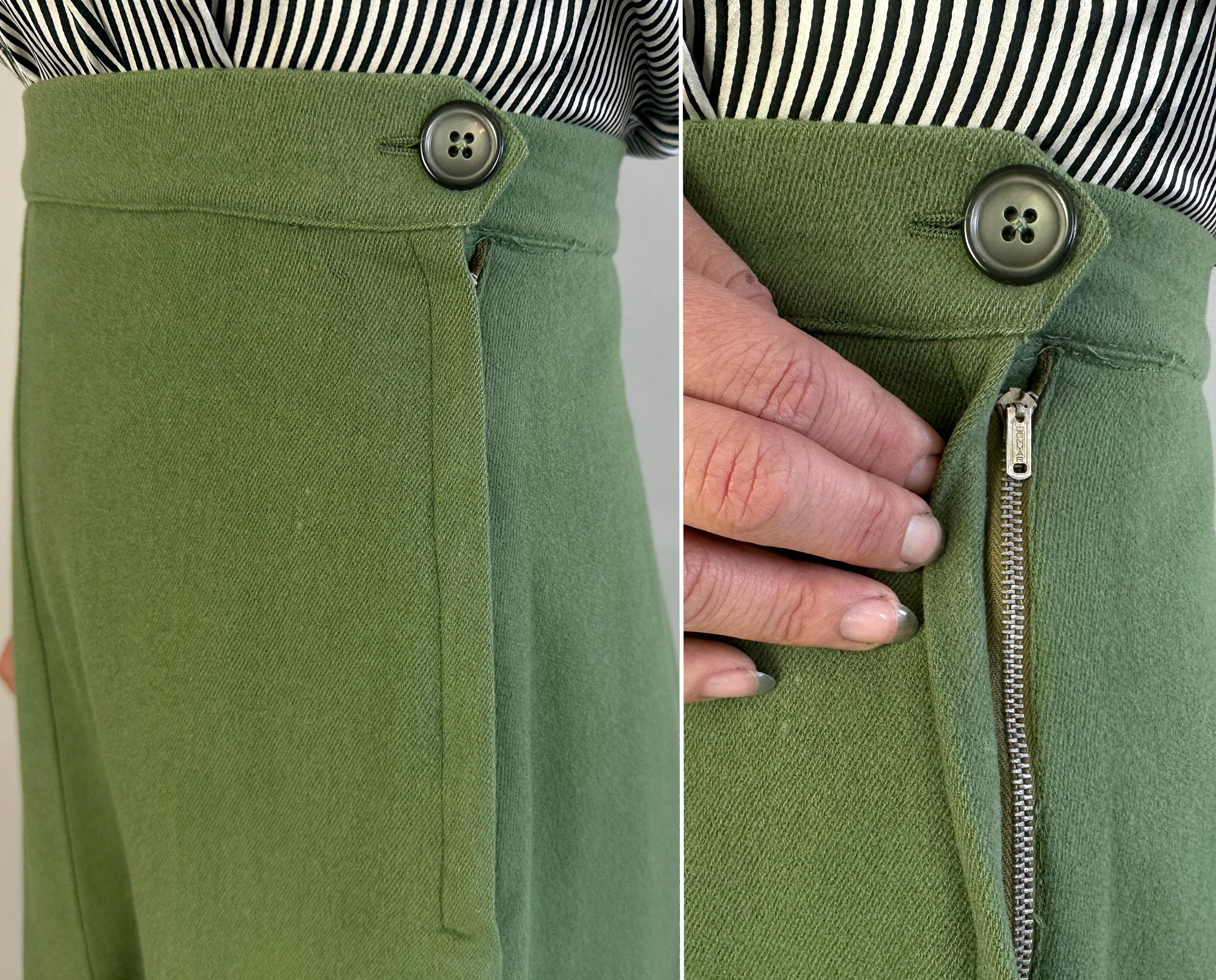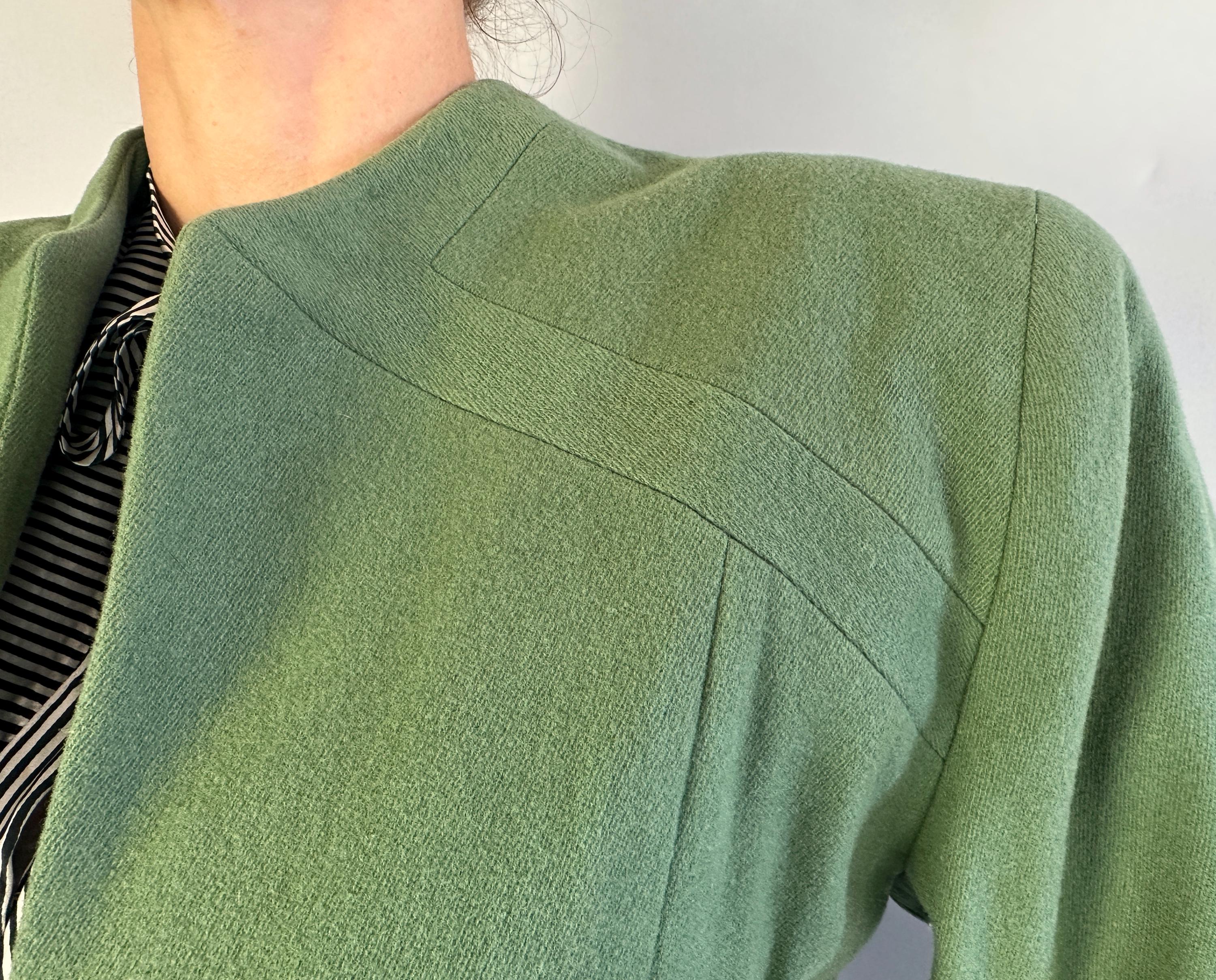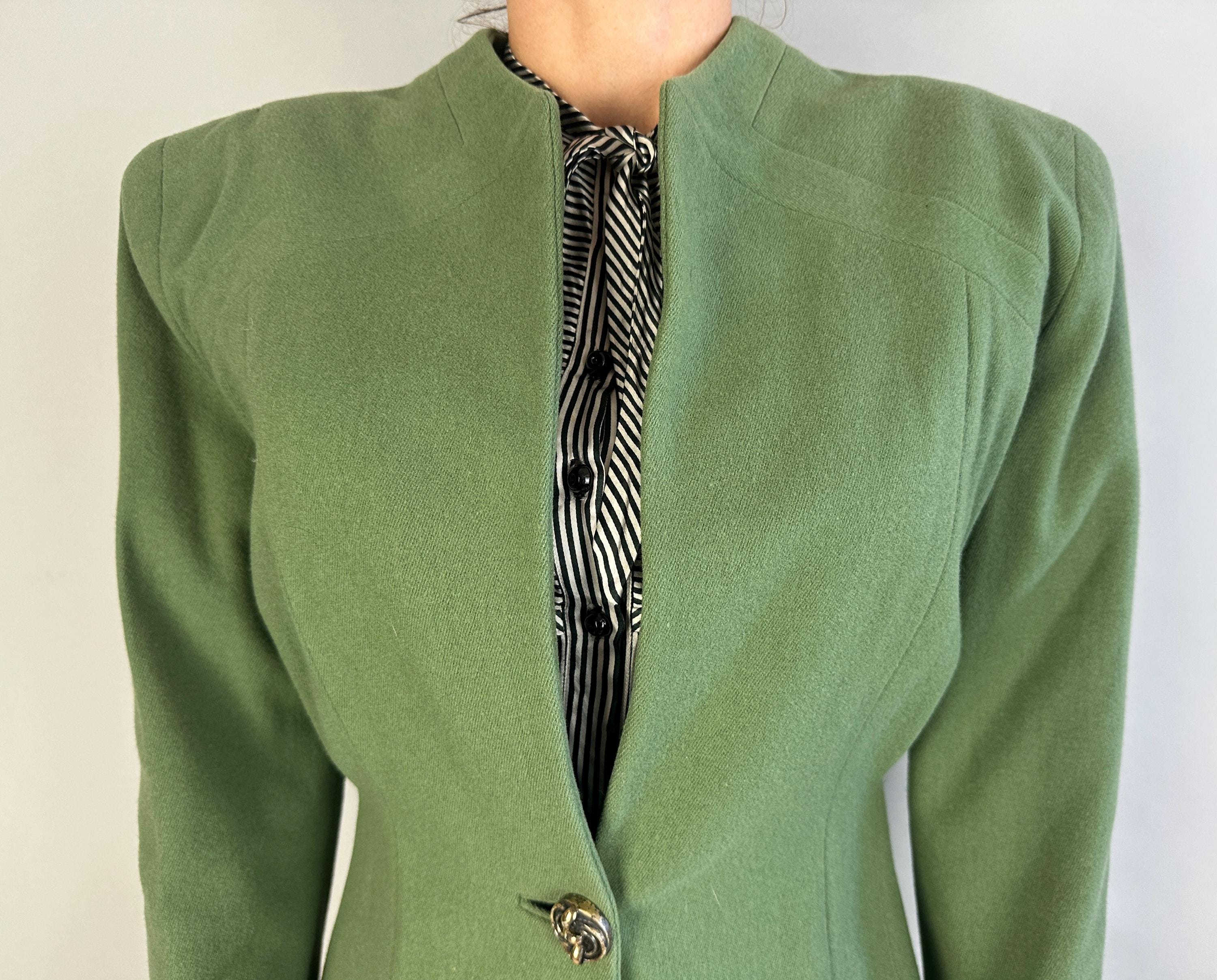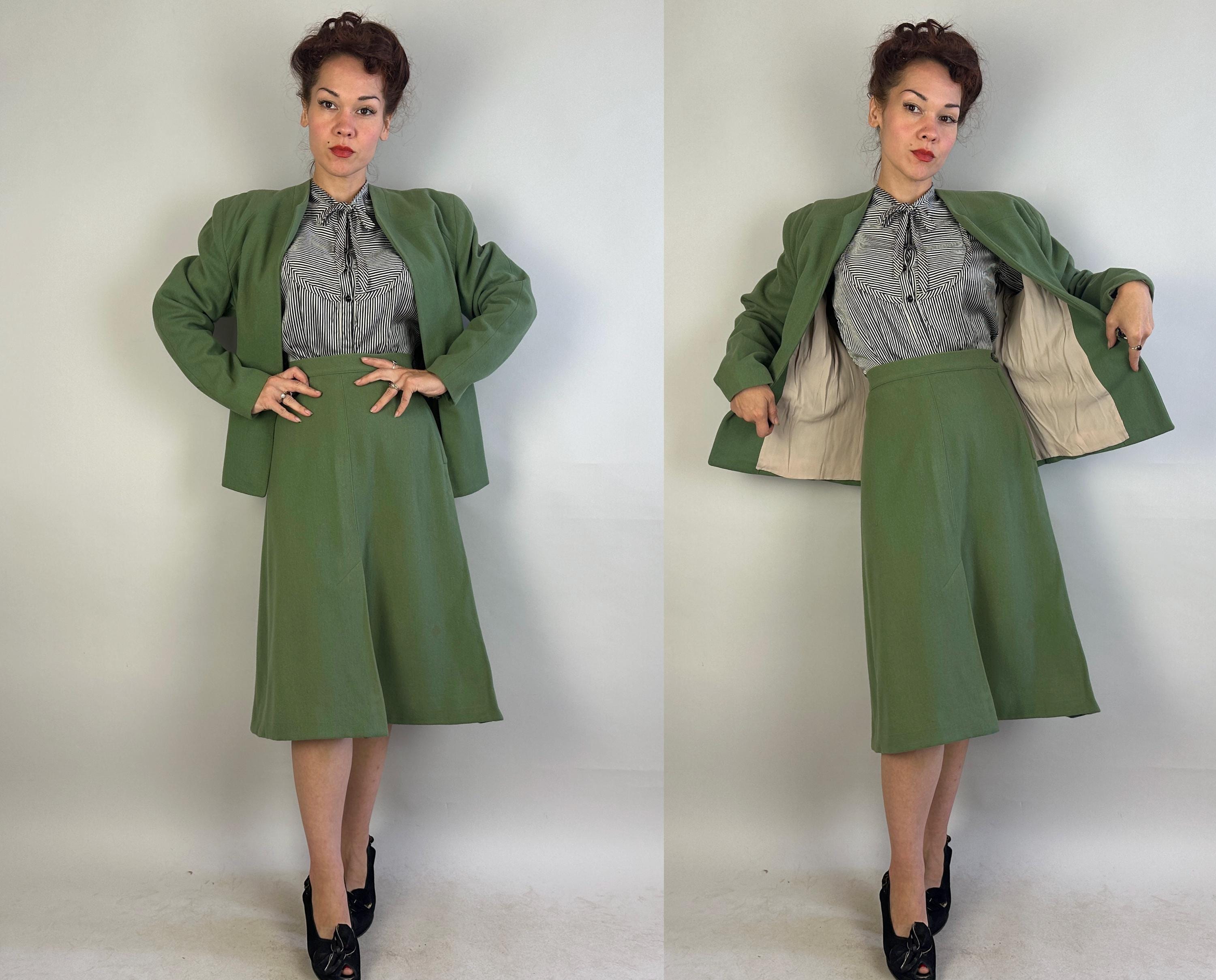 You've got the mind of a sage when it comes to fashion and this smart 1940s suit will make that known! Made of wool in sage green with a classic 40’s silhouette, the jacket has strong padded shoulders and nipped waist fastened by a single metallic button with three dimensional knot element. Geometric seaming plays up the lapel-less neckline and invertd box pleat darts are another shaping detail. Fully lined with rayon crepe. The skirt is lightly flared with a front knife kick pleat and a metal zipper and button fasten on the side. This suit is in good vintage condition, one very subtle mend and a couple extremely faint marks but no holes or odors to note. Suit has been pinned on model to show fit.