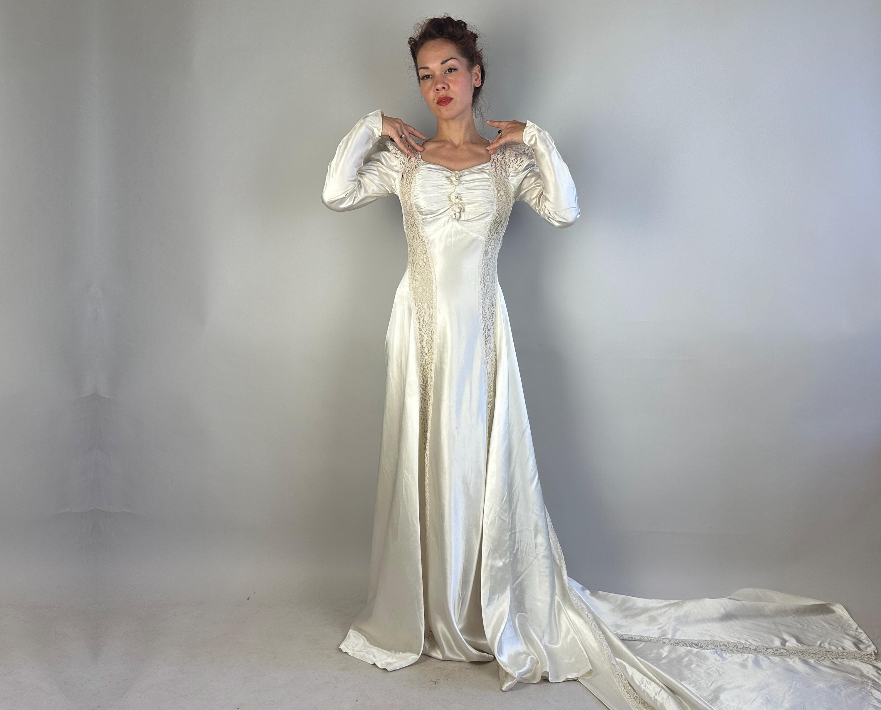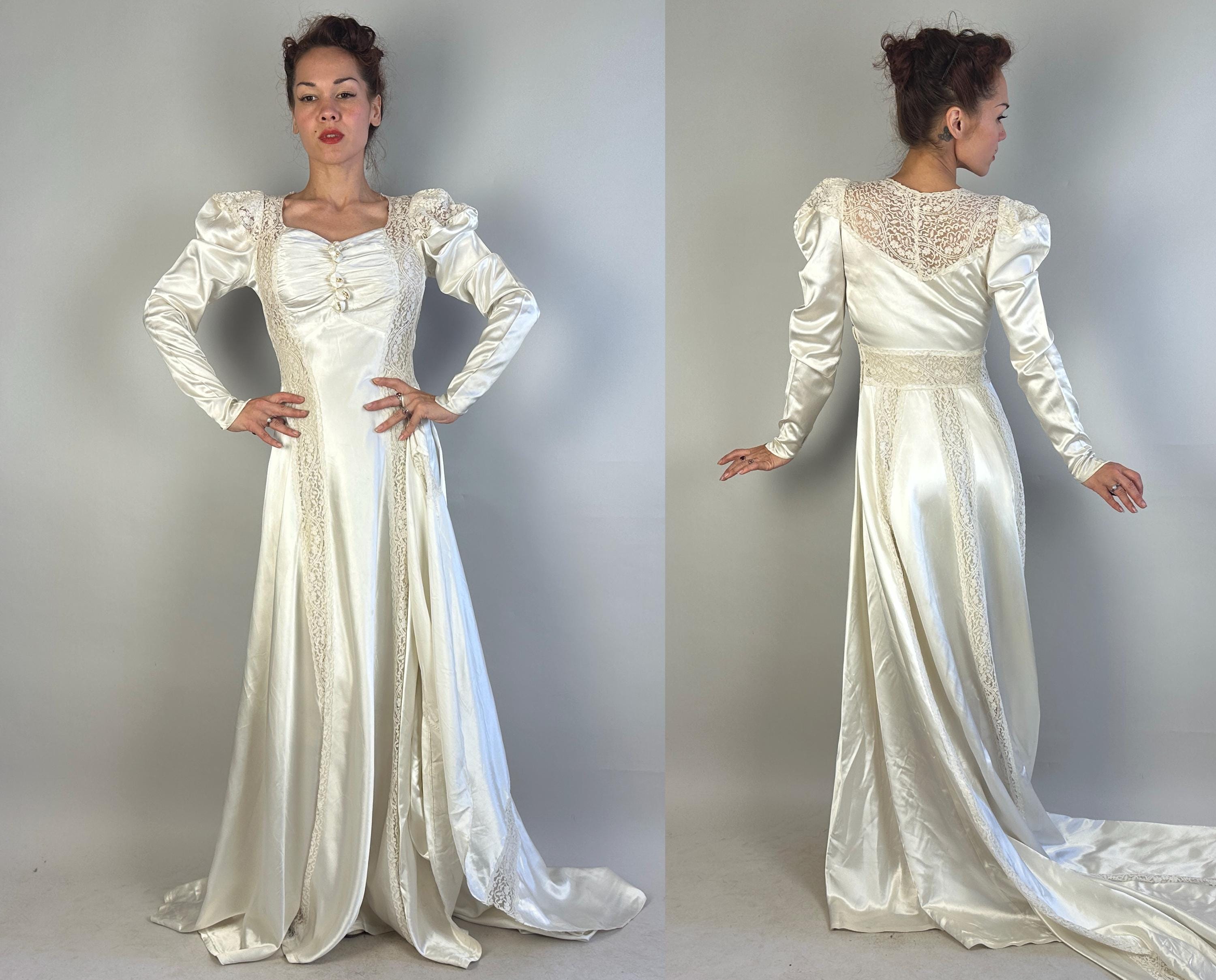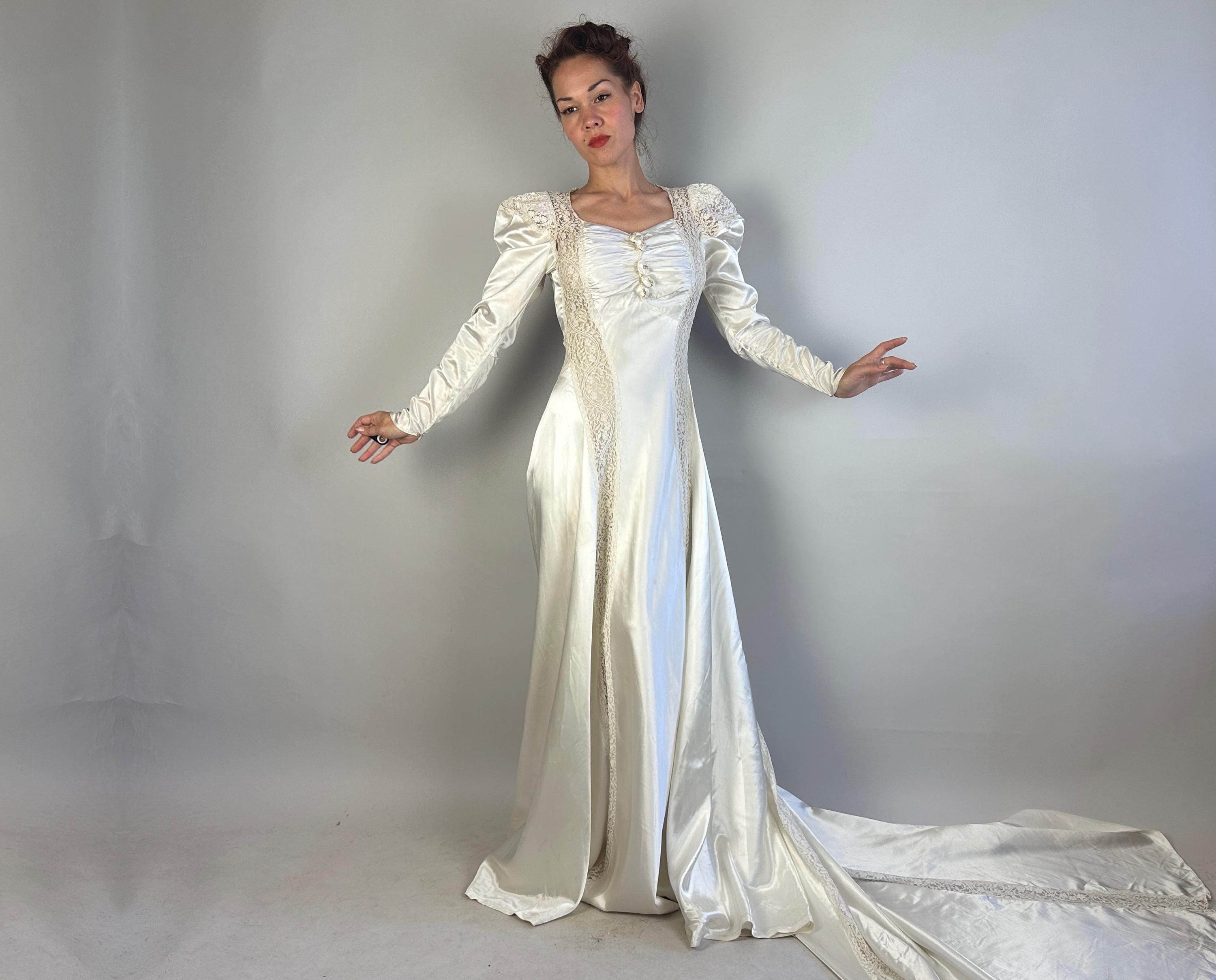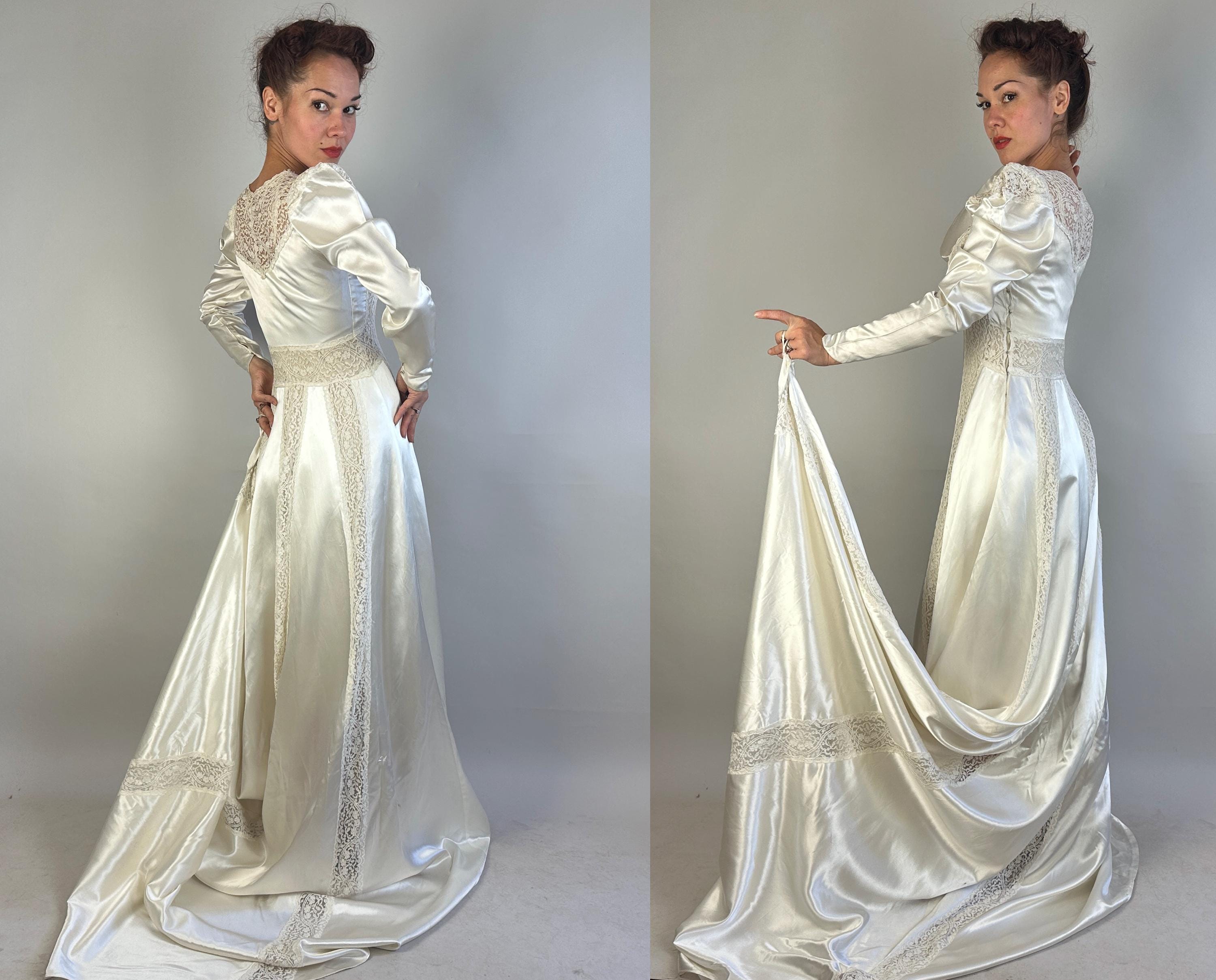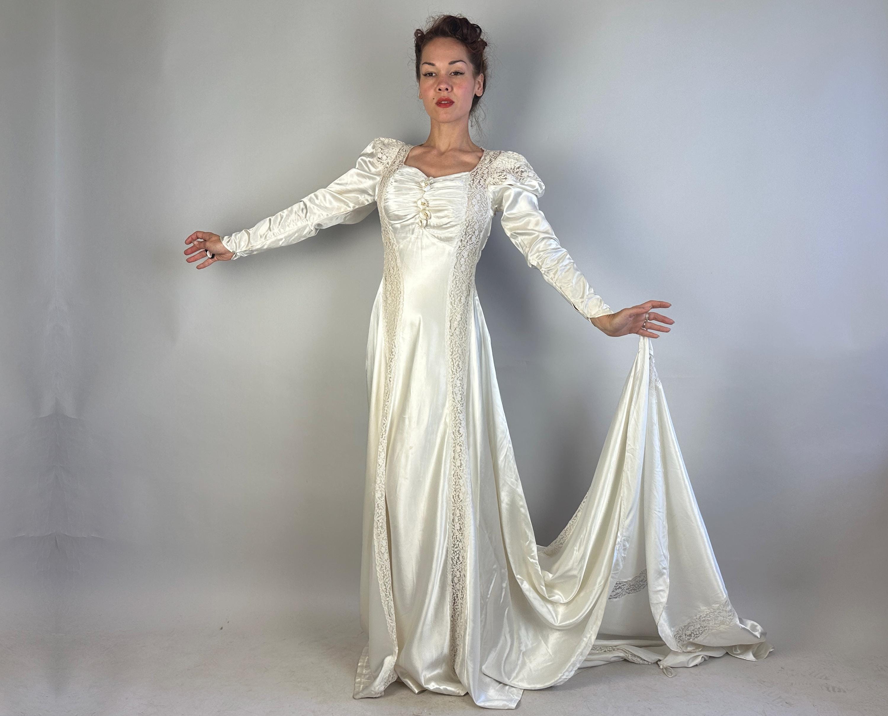 Walk down the aisle in this 1930s gown and feel beyond beautiful! Pure snow white glistening rayon satin cascades to the ground like a waterfall with a long train sure to keep your bridal party busy but multiple wrist loops also offer independence. The bodice is beautifully shaped with a sweetheart neckline and ruched bust with fabric flowers run down the ruched line. The mutton sleeves have a light lining at the shoulder for shaping and the wrists taper to a point with snap for fastening. Gorgeous soft lace is inset on the back of the waist, back yoke, and as wide stripes down each side of the body on the front and in a trio on the back of the skirt. Will you be a daring bride showing some skin or a flashy slip, or keep it demure with a matching white underneath? Snaps fasten on the side. This dress is in great vintage condition, with no stains, holes, nor odors to note.