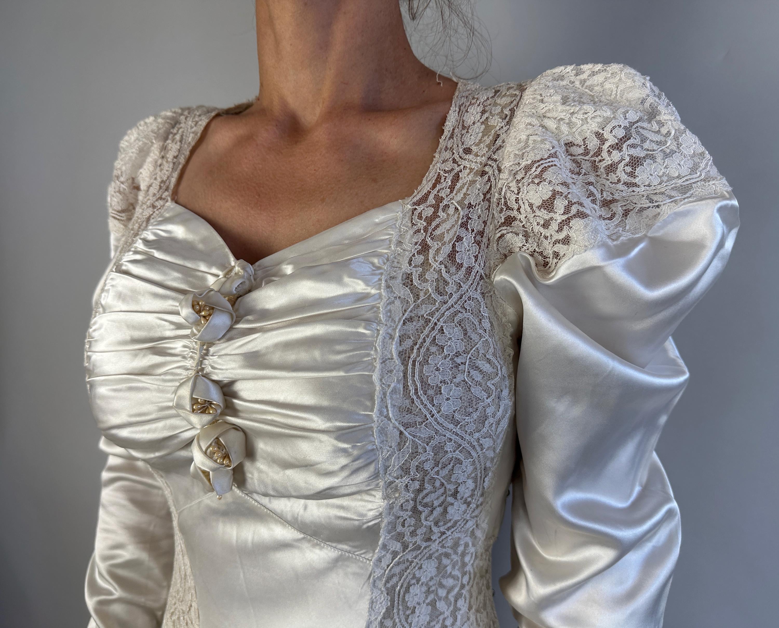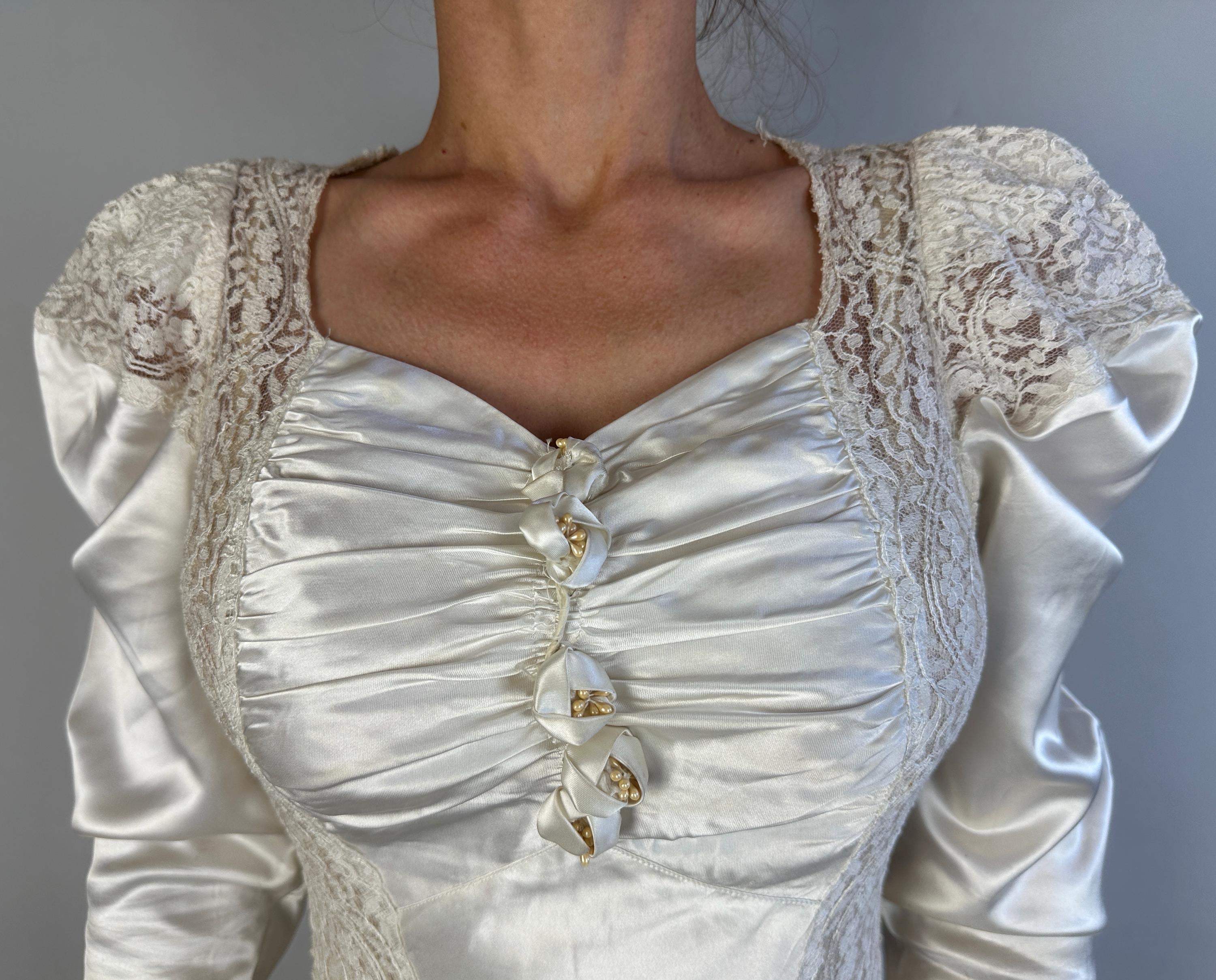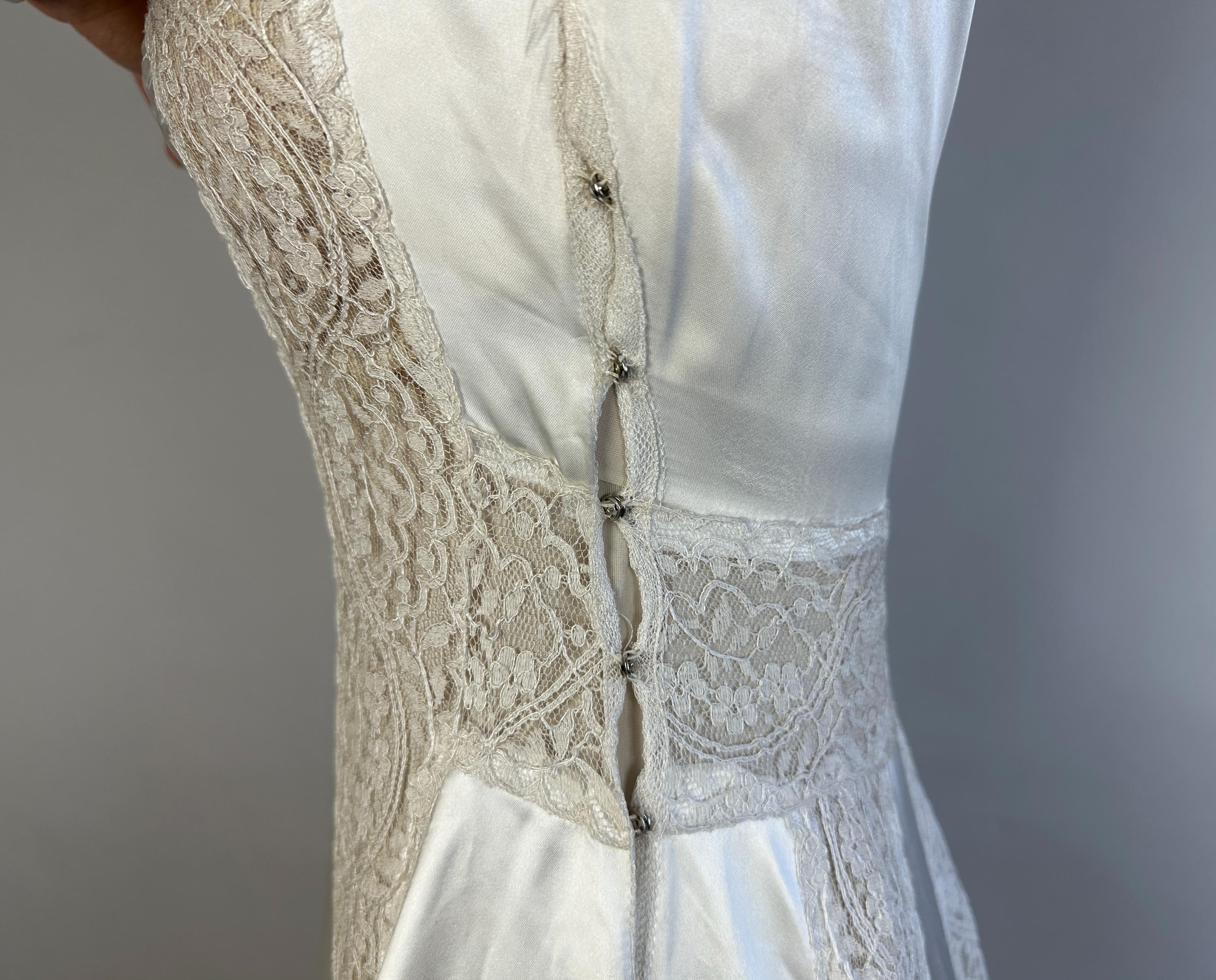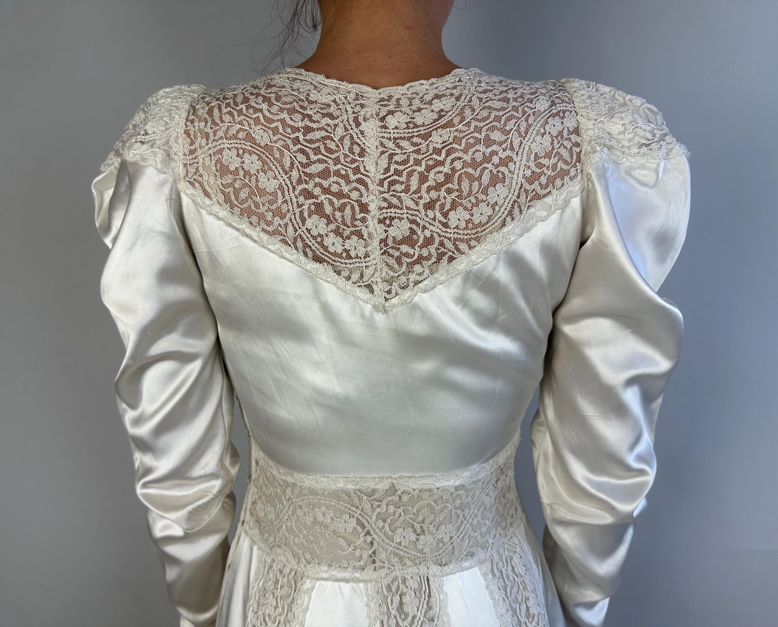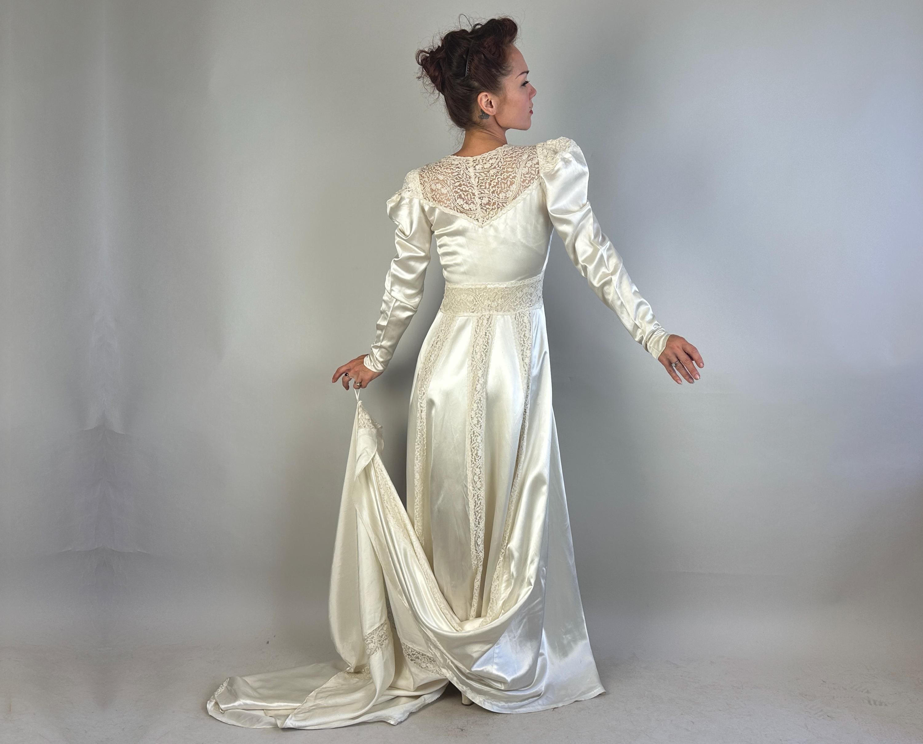 Walk down the aisle in this 1930s gown and feel beyond beautiful! Pure snow white glistening rayon satin cascades to the ground like a waterfall with a long train sure to keep your bridal party busy but multiple wrist loops also offer independence. The bodice is beautifully shaped with a sweetheart neckline and ruched bust with fabric flowers run down the ruched line. The mutton sleeves have a light lining at the shoulder for shaping and the wrists taper to a point with snap for fastening. Gorgeous soft lace is inset on the back of the waist, back yoke, and as wide stripes down each side of the body on the front and in a trio on the back of the skirt. Will you be a daring bride showing some skin or a flashy slip, or keep it demure with a matching white underneath? Snaps fasten on the side. This dress is in great vintage condition, with no stains, holes, nor odors to note.