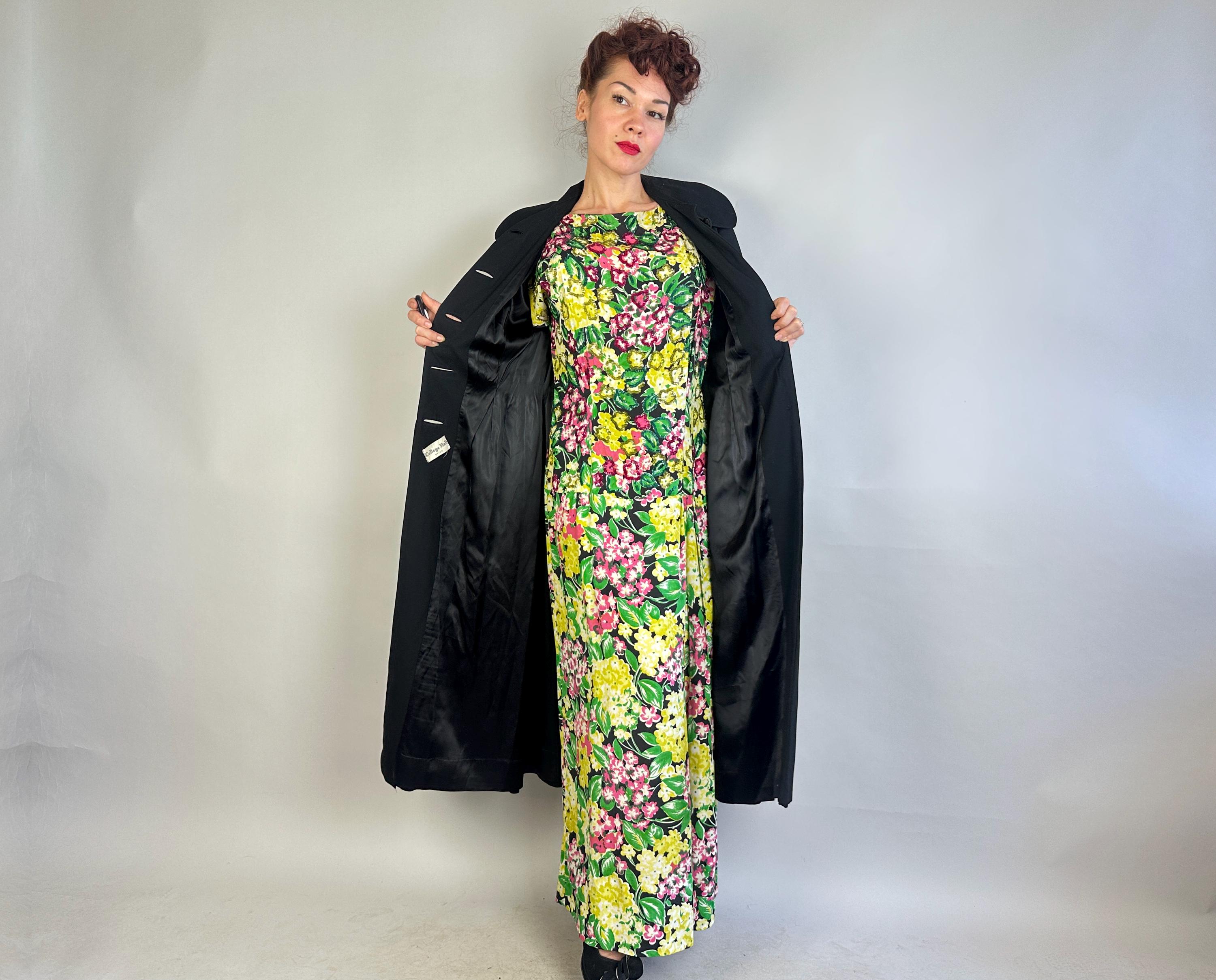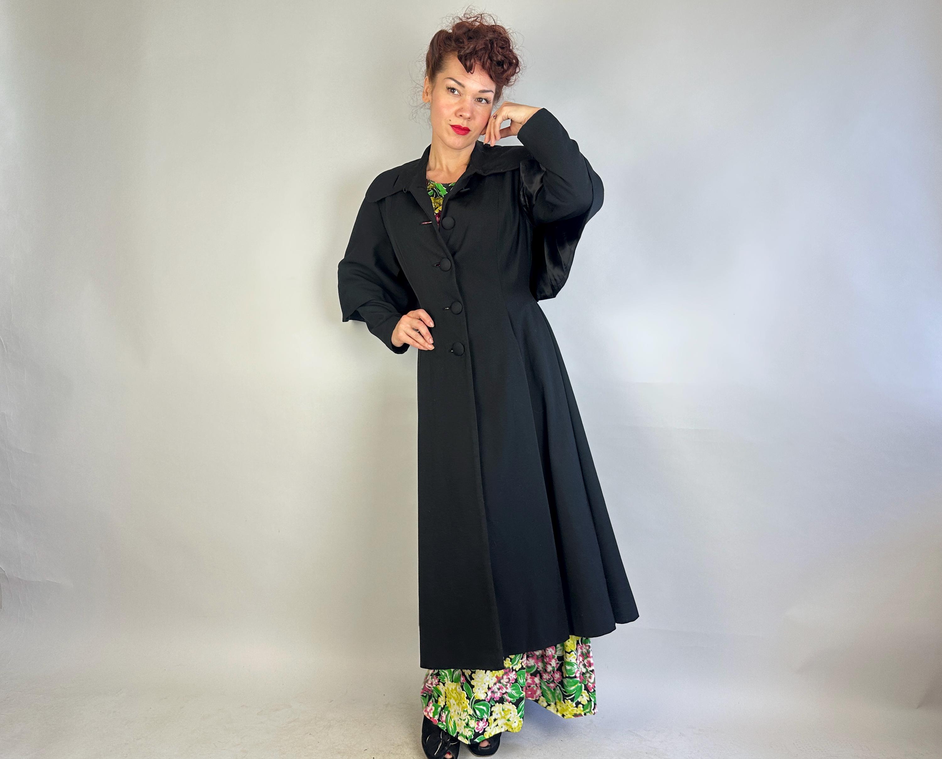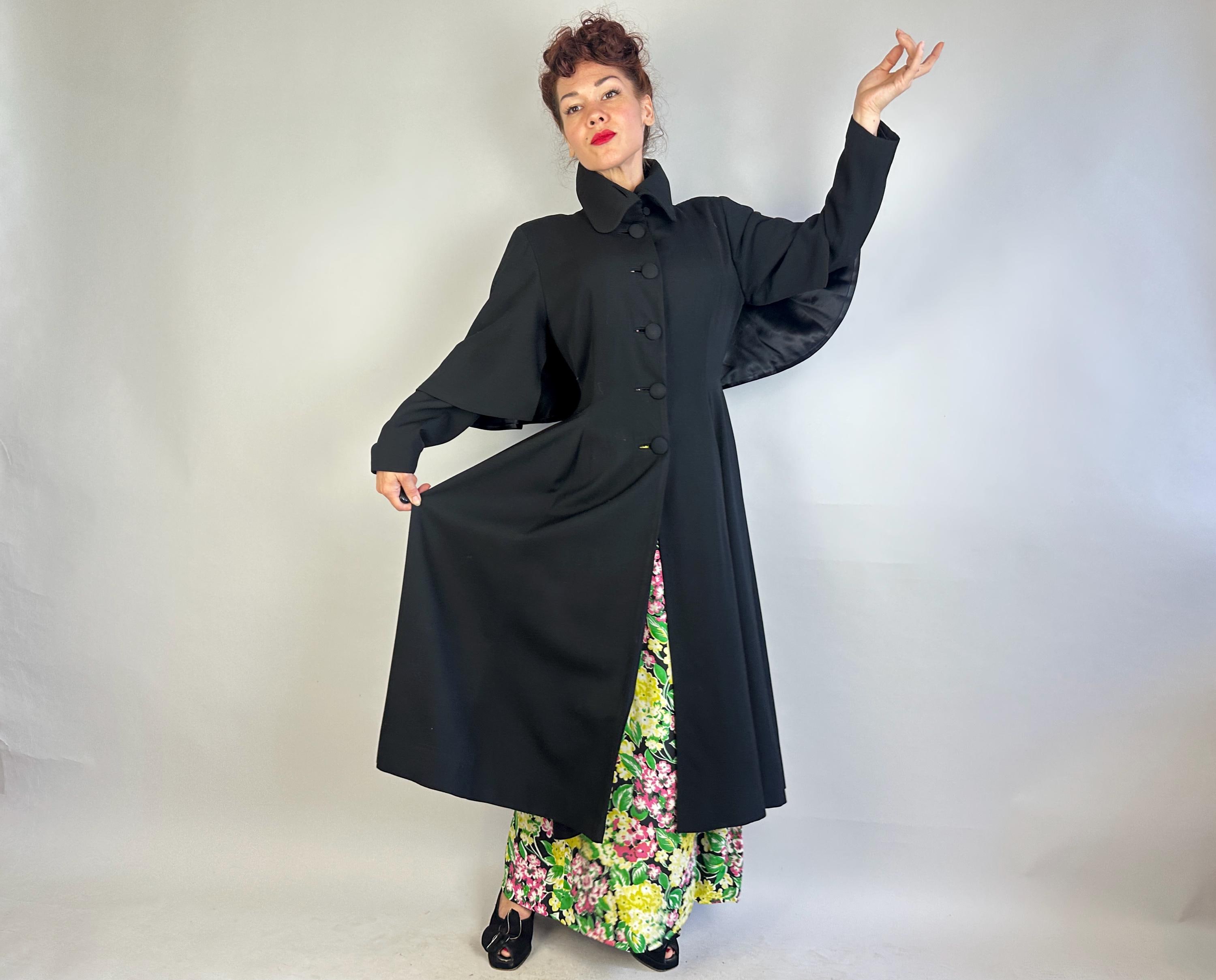 You'll be a magical sight captivating onlookers when you bundle up in this 1940s coat! This black wool gabardine coat is all about the silhouette with a bold hourglass shape created by padded shoulders, waist nipping seamwork flaring to the skirting, and the attached capelet flaring from the strong shoulders. Self fabric buttons can be fastened high to the rounded collar. Fully lined in rayon satin. Labeled "College Hall Utica". This coat is in great vintage condition, with no holes, stains, or odors to note.