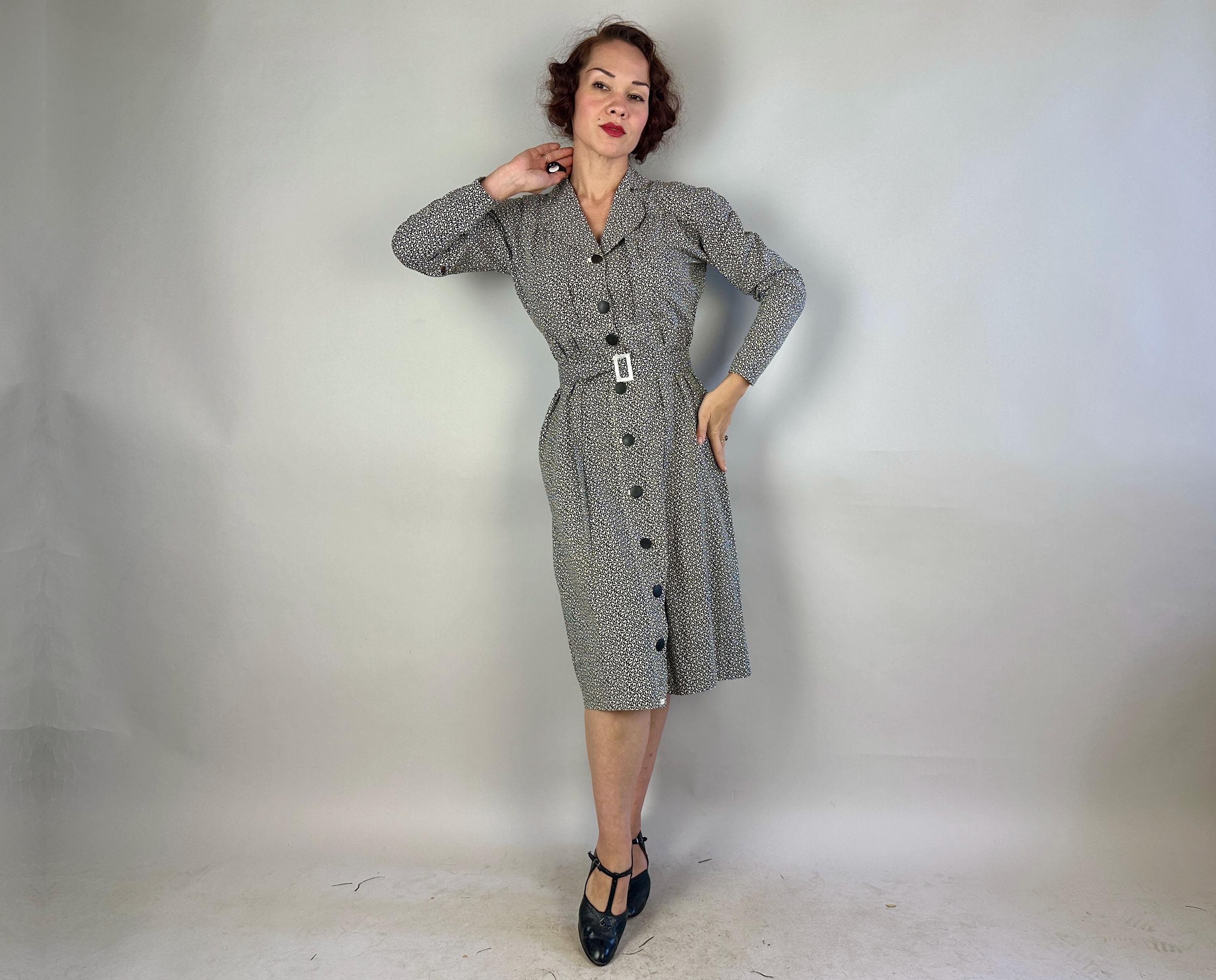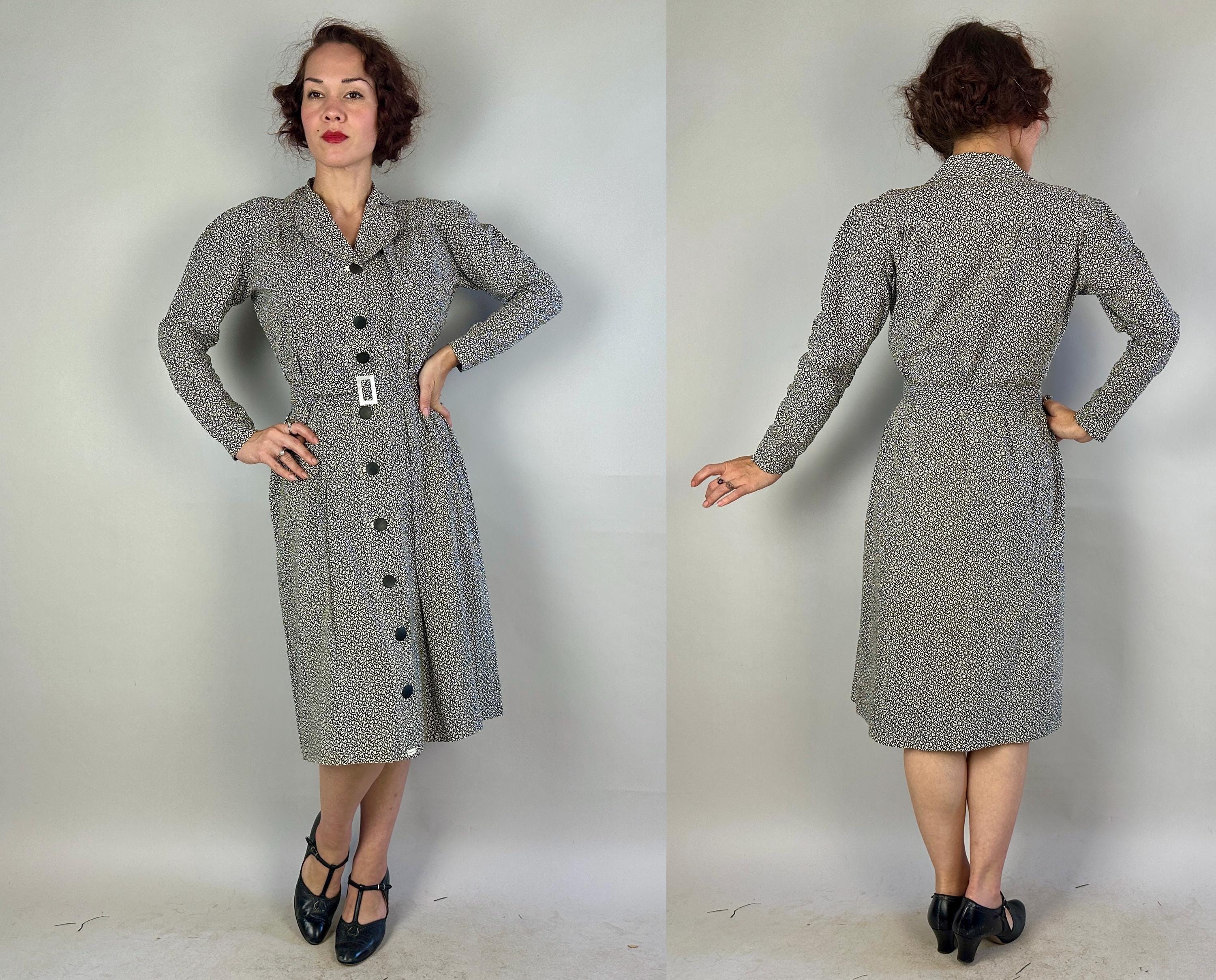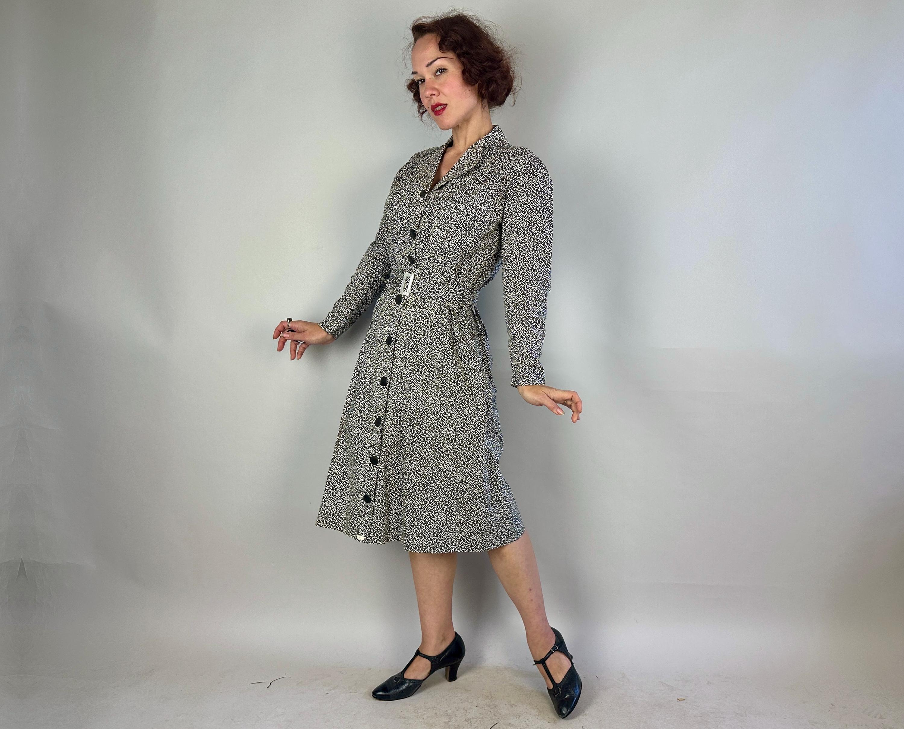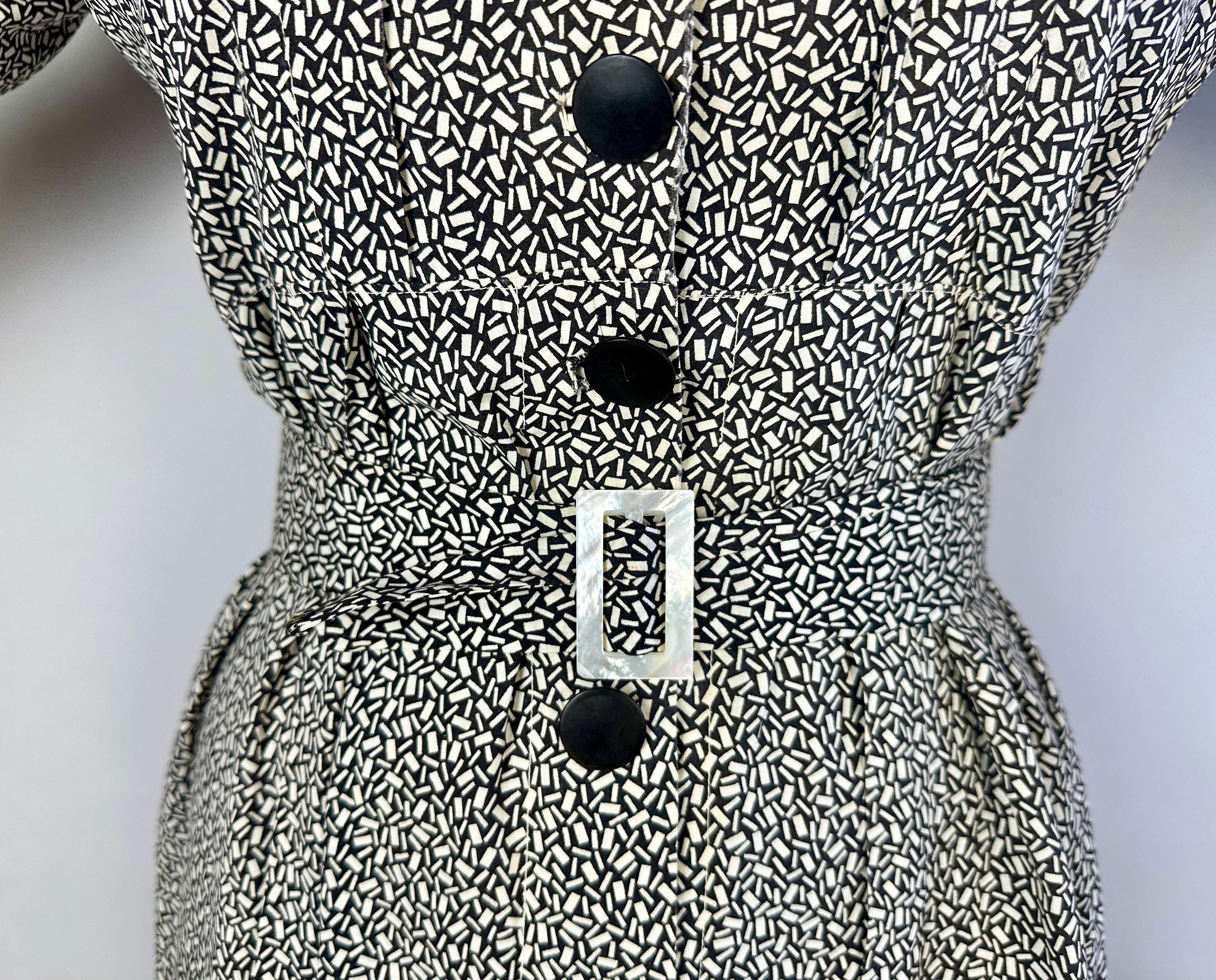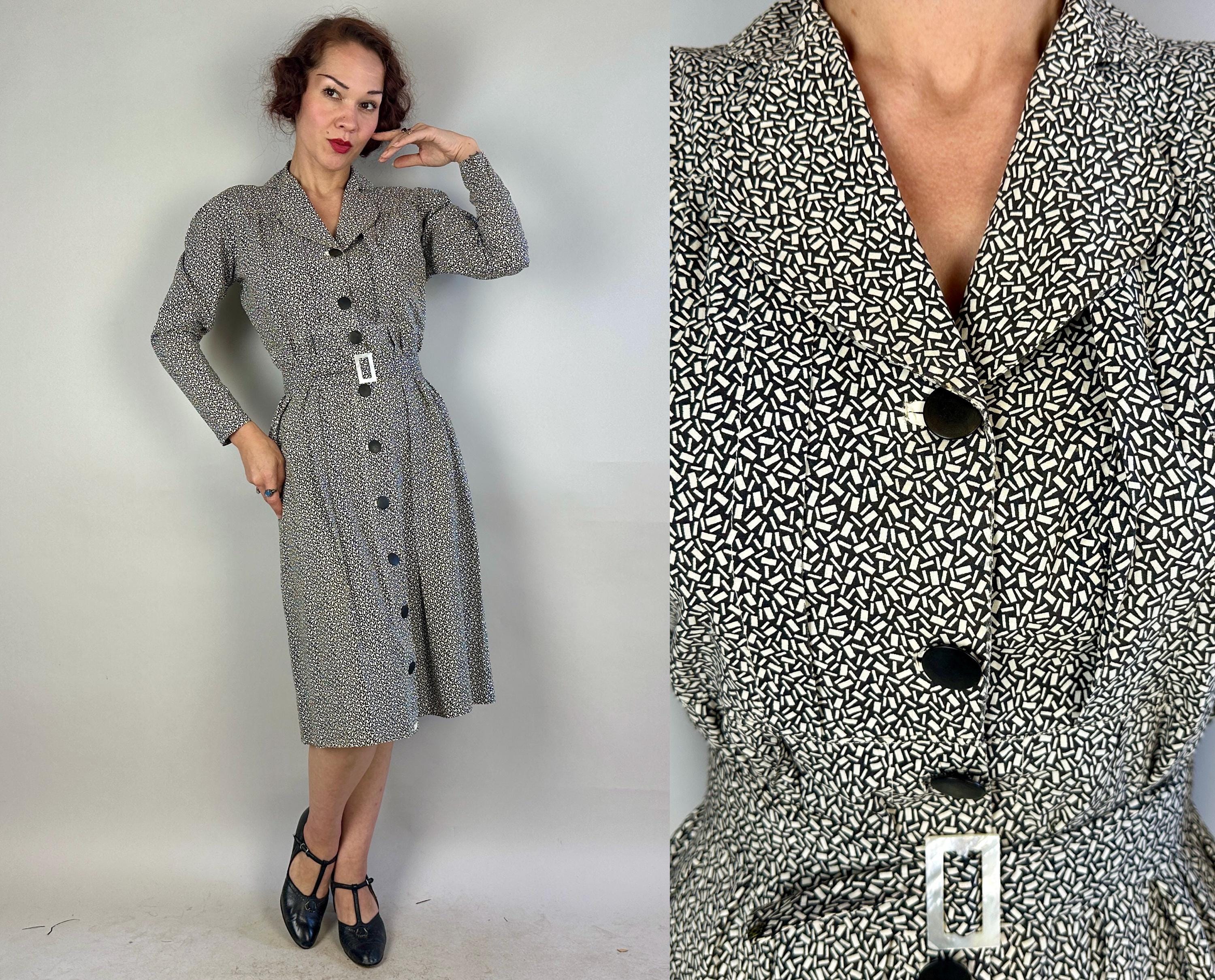 Make a day's outing a ticker tape parde in this 1930s dress! The monochromatic cotton frock features a confetti like pattern in white on black perfectly accented with large black buttons fully down the front and a pearly shell slide buckle on the matching belt. It has a rounded lobe notch collar, lightly gathered yoke, and mirrored knife pleats. This frock is in great vintage condition, with no holes, stains, odors to note.