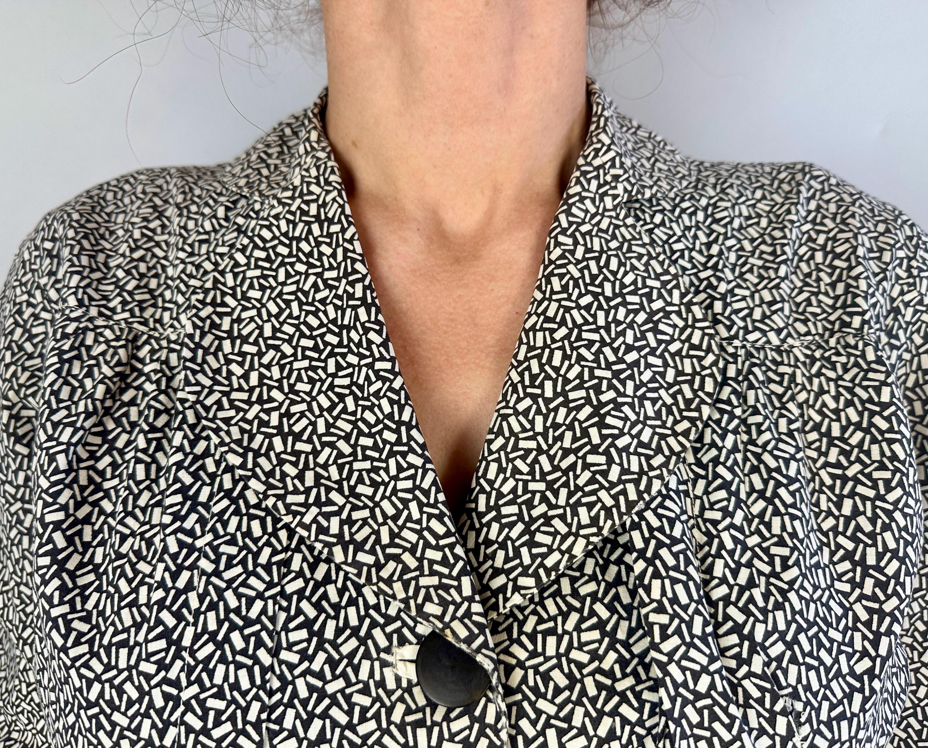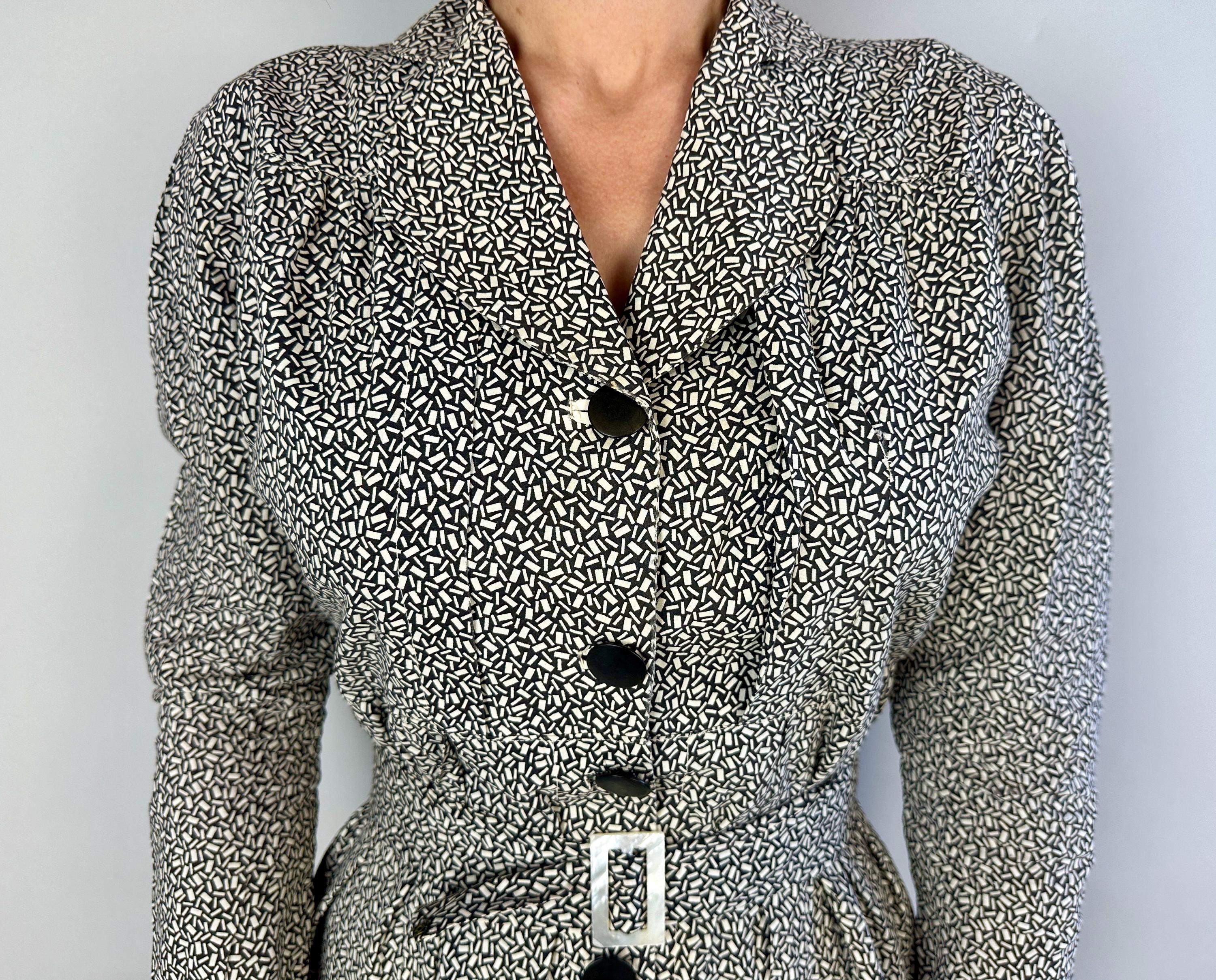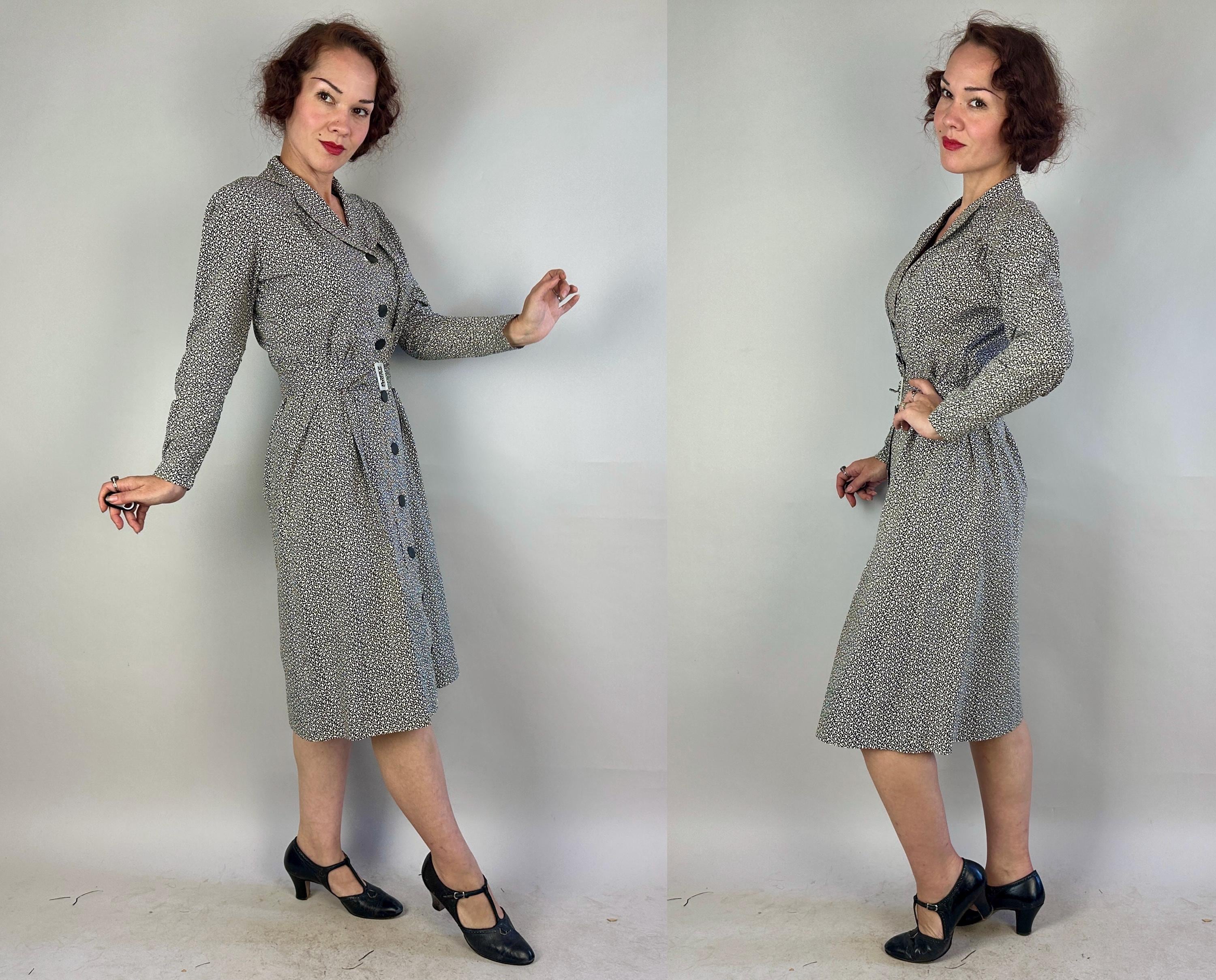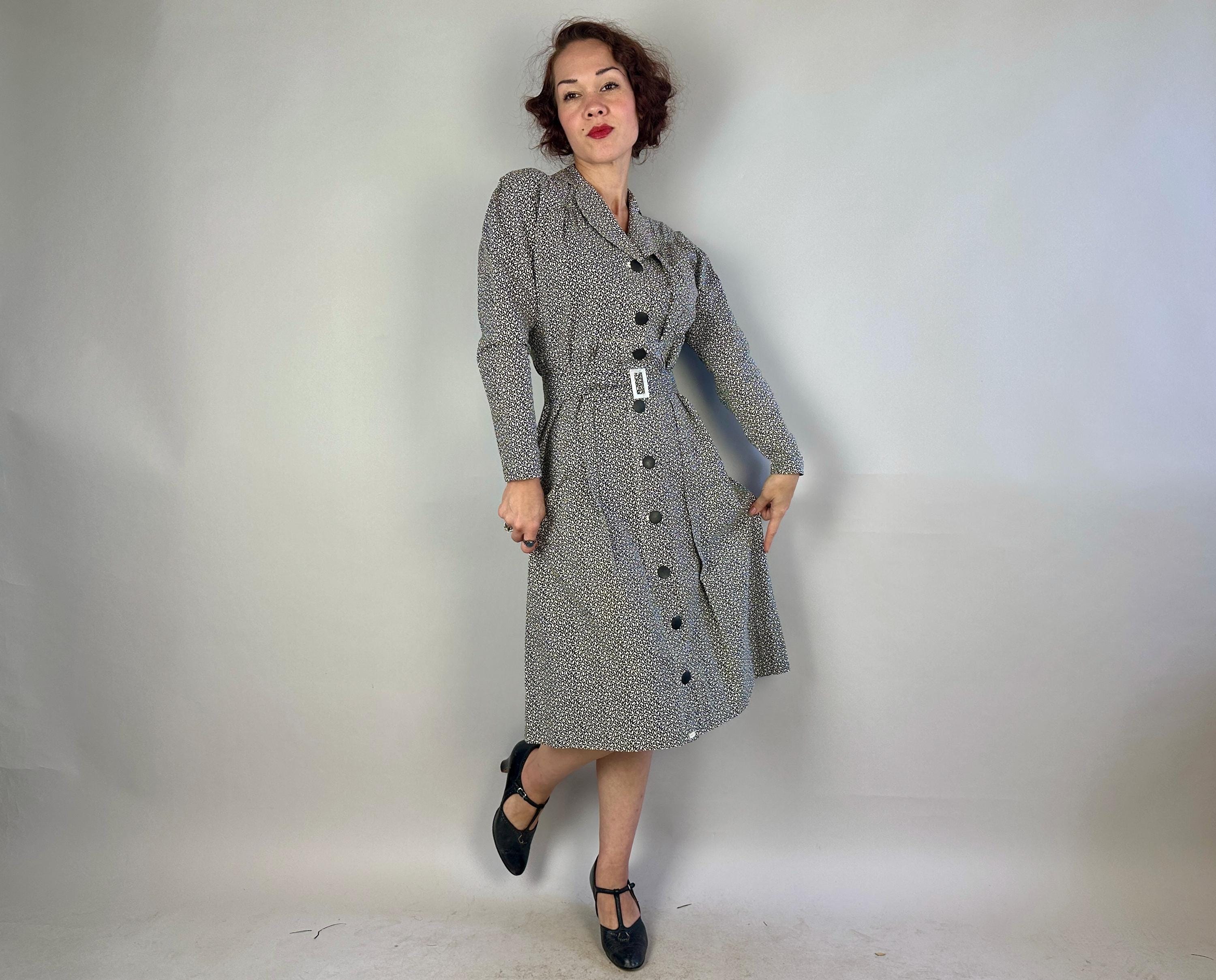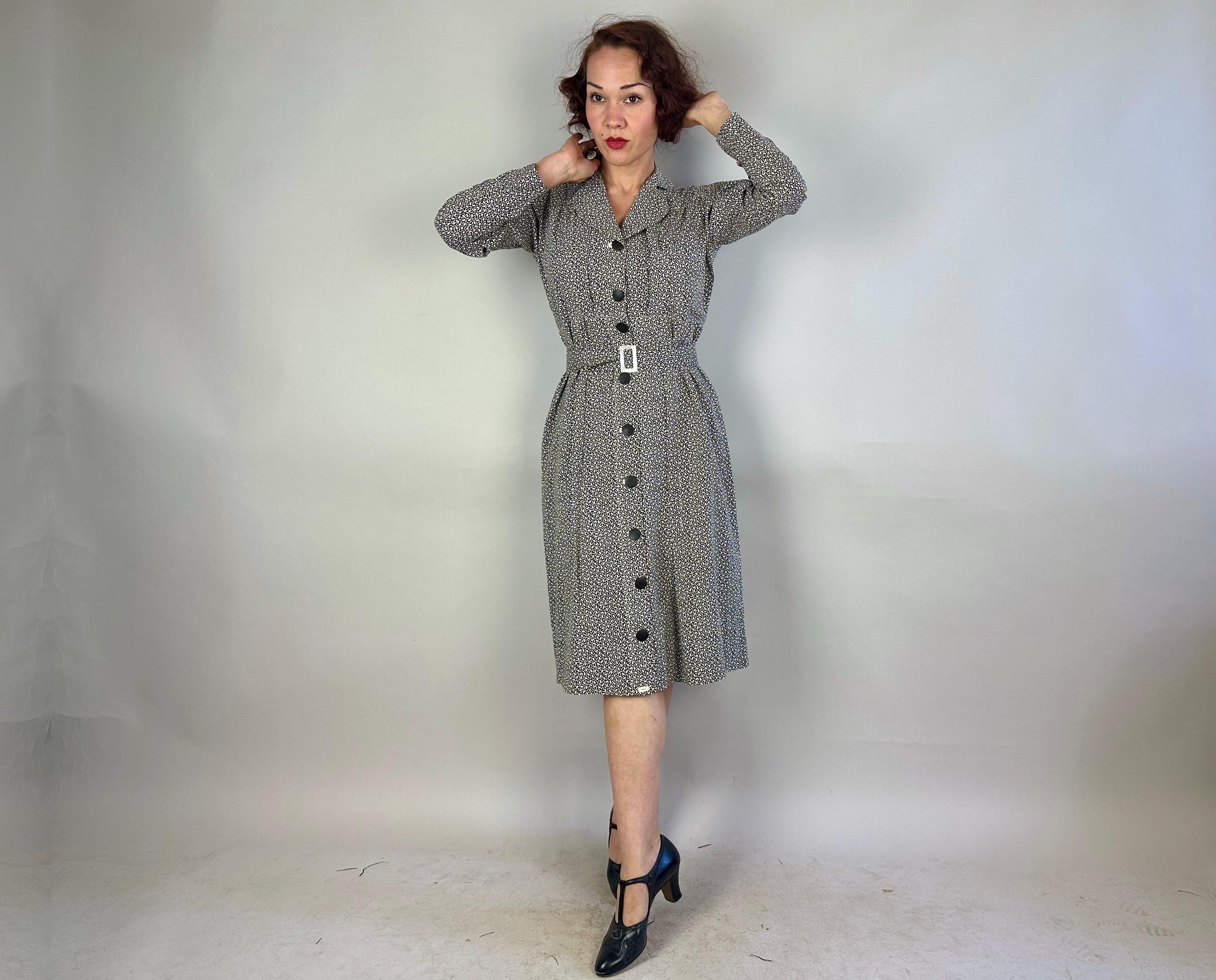 Make a day's outing a ticker tape parde in this 1930s dress! The monochromatic cotton frock features a confetti like pattern in white on black perfectly accented with large black buttons fully down the front and a pearly shell slide buckle on the matching belt. It has a rounded lobe notch collar, lightly gathered yoke, and mirrored knife pleats. This frock is in great vintage condition, with no holes, stains, odors to note.