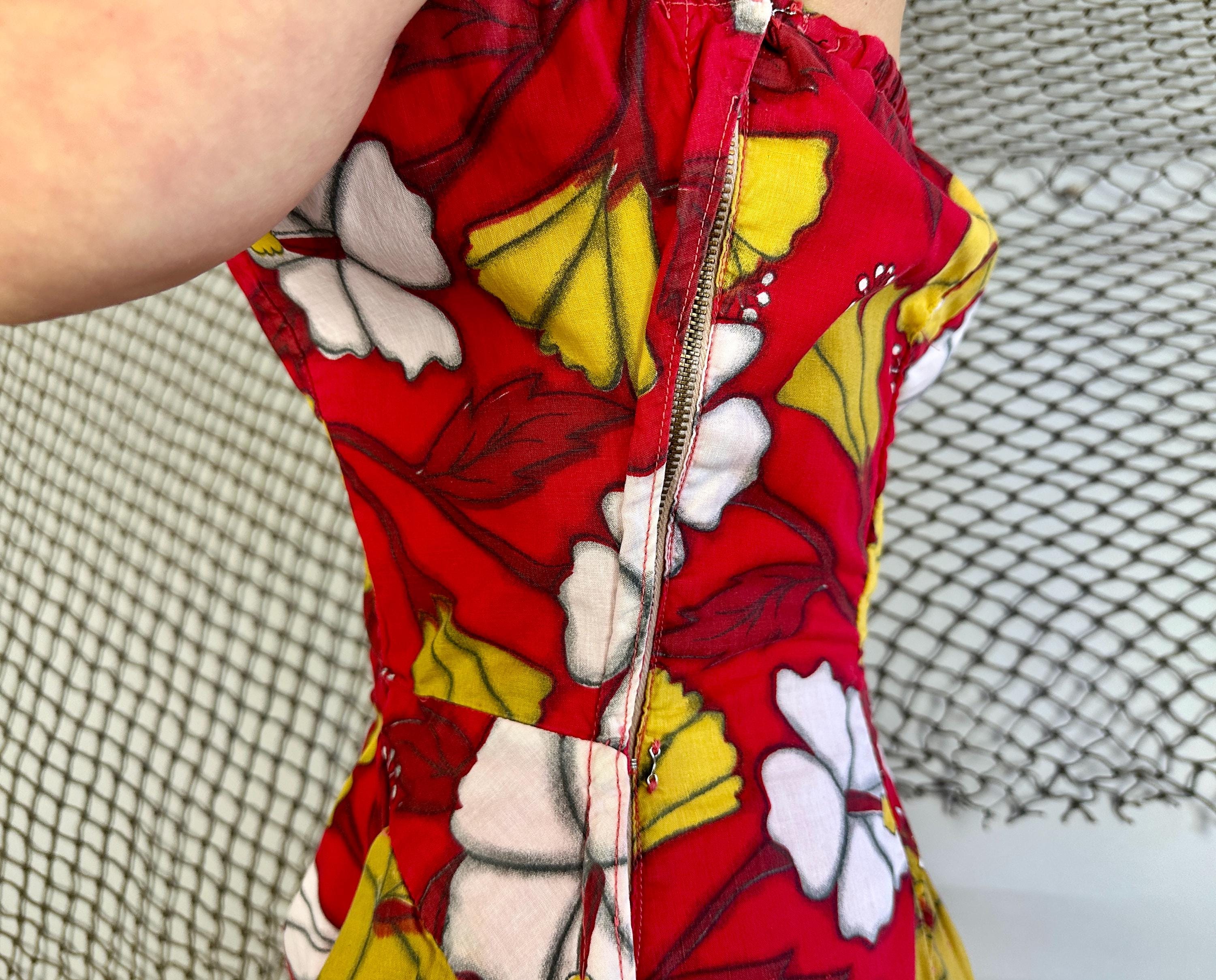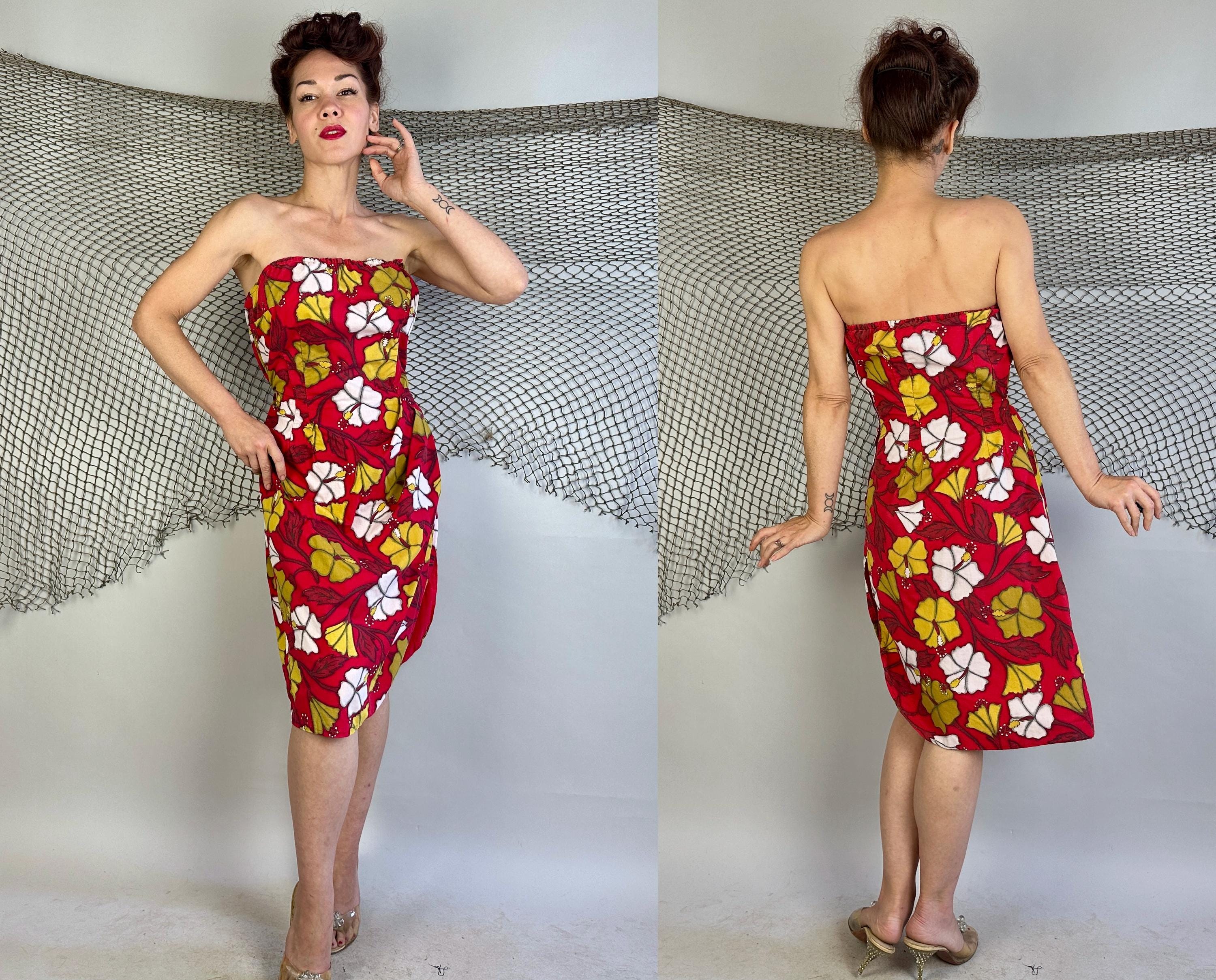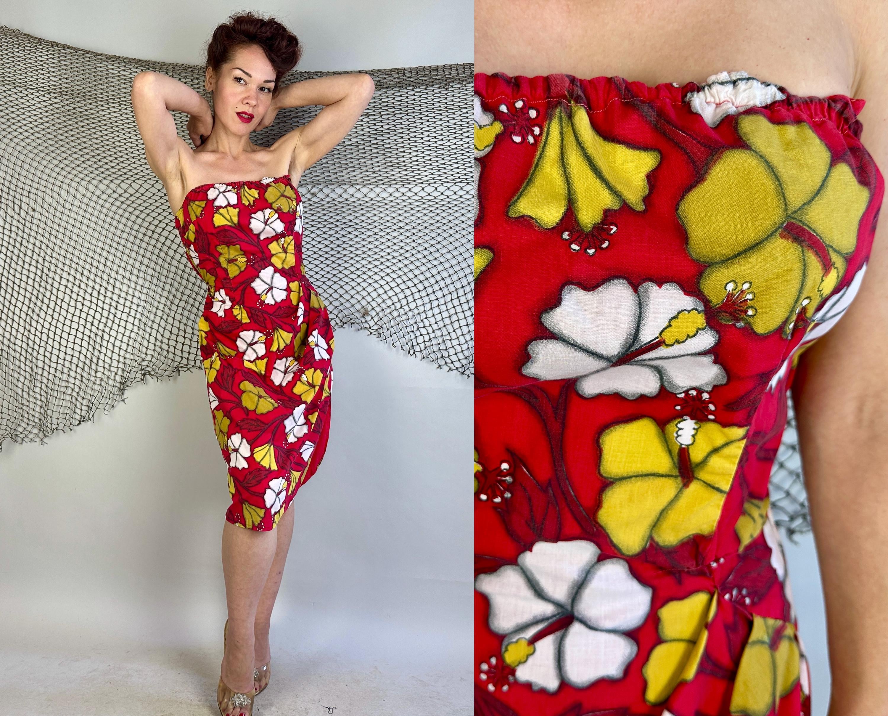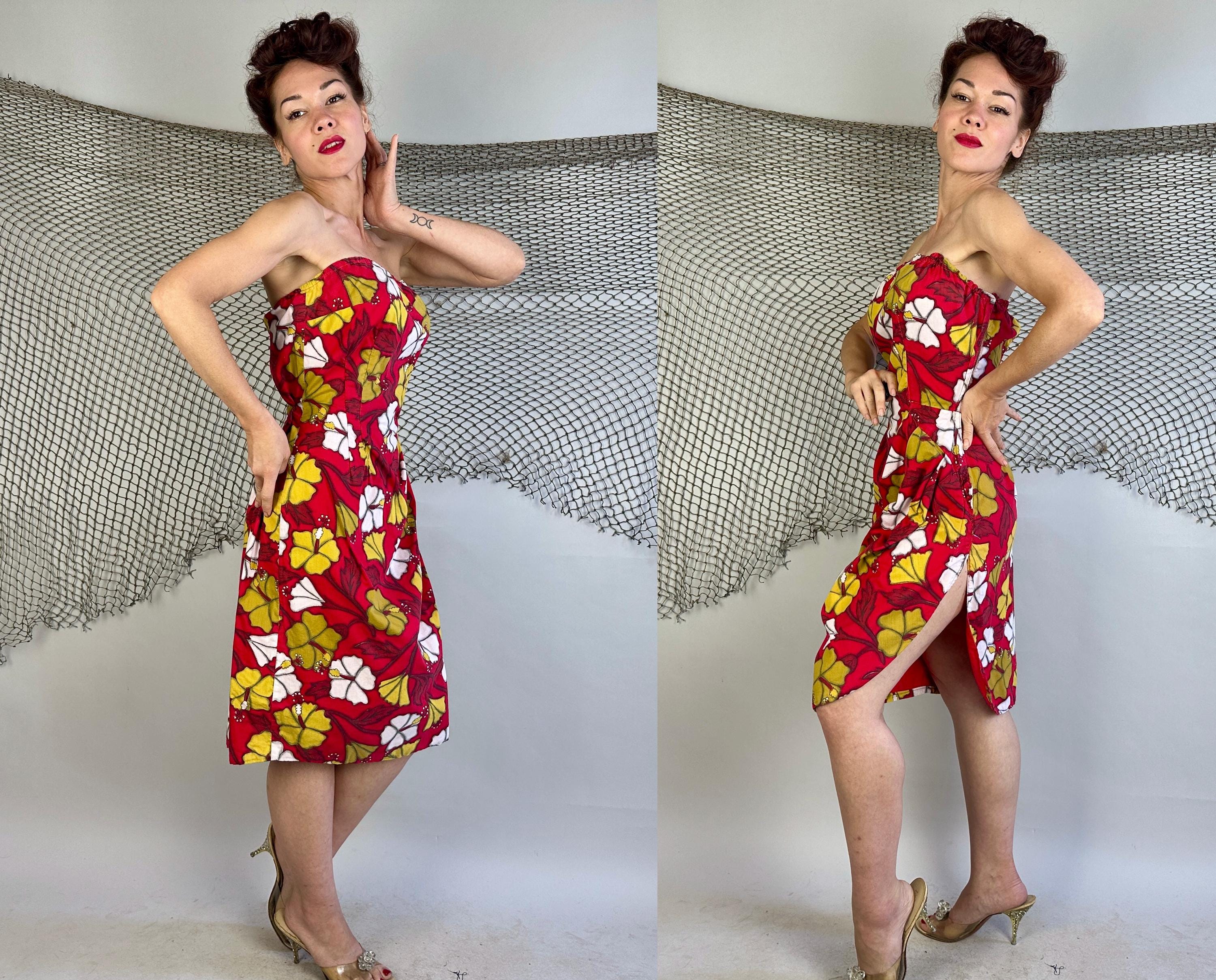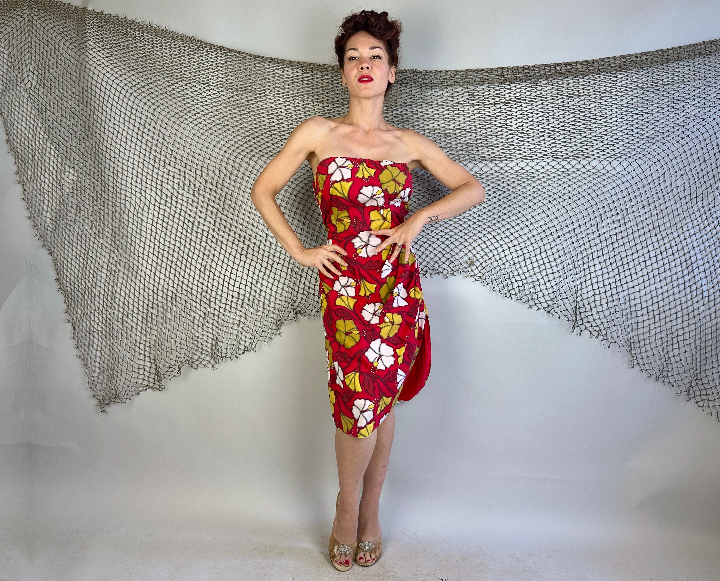 You're gonna cause a heat wave showing up in this 1950s vacation ready dress! A strapless sarong style dress, it has elastic fully around the top and well placed darts to get that hourglass shape. Double layered cotton also helps hold the shape and you're sure to stand out with the bold hibiscus print in white and yellow ochre on a fiery red background. Asymmetric pleating on the left hip leads to a saucy side slit. Metal zipper on the side. This dress is in great vintage condition, with no holes, stains, or odors to note.