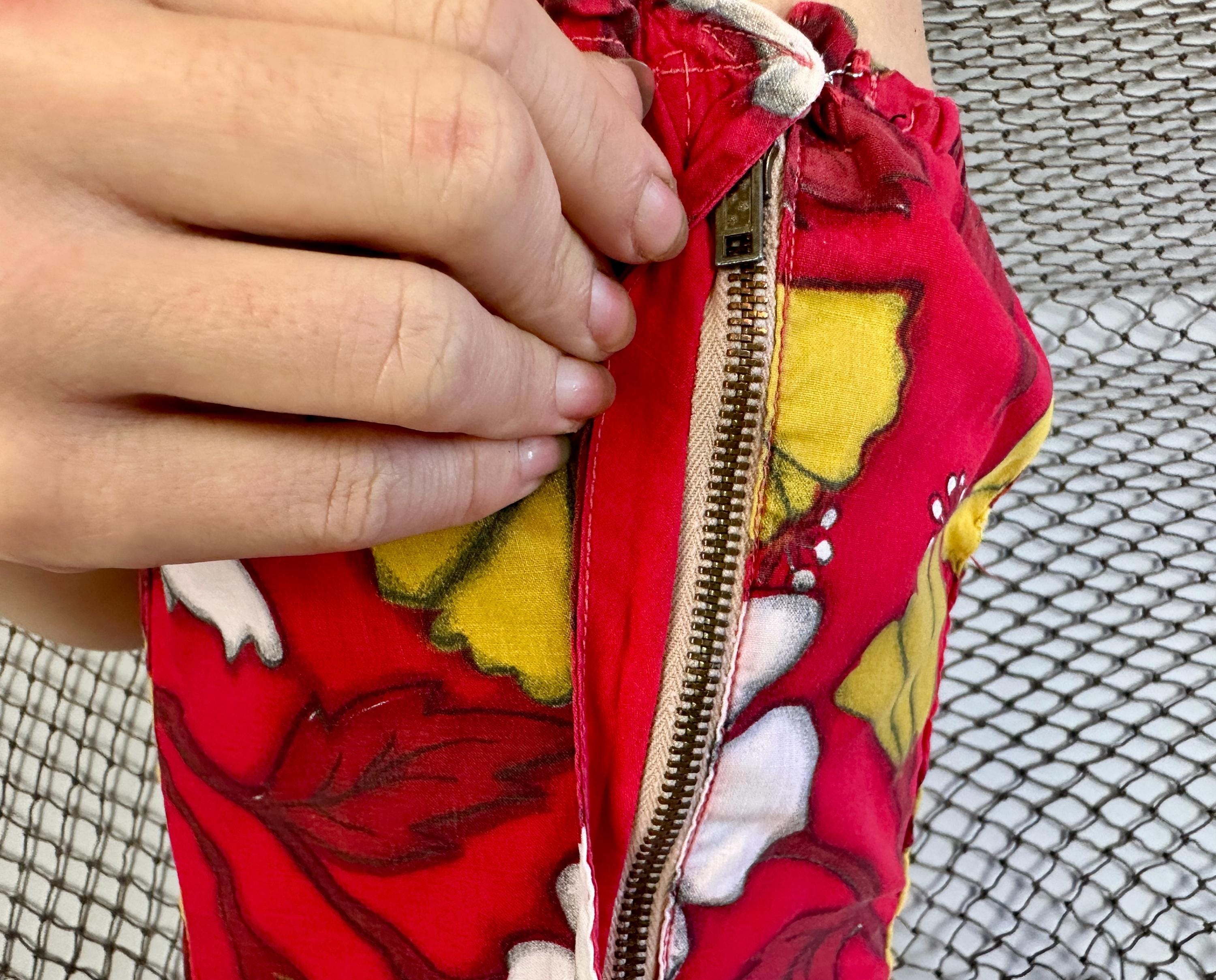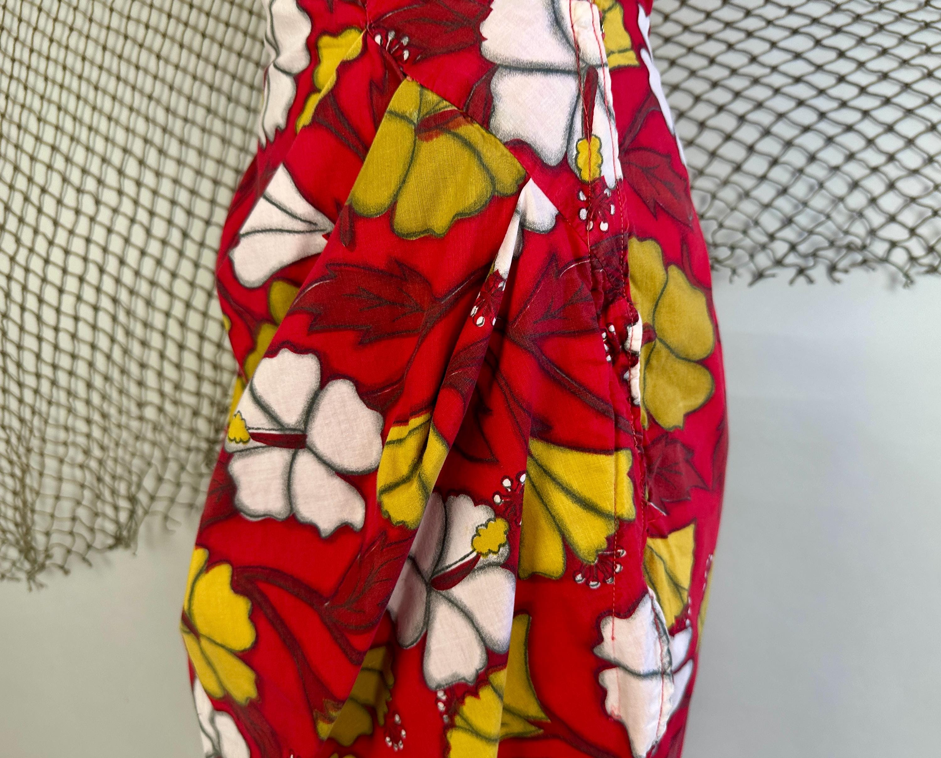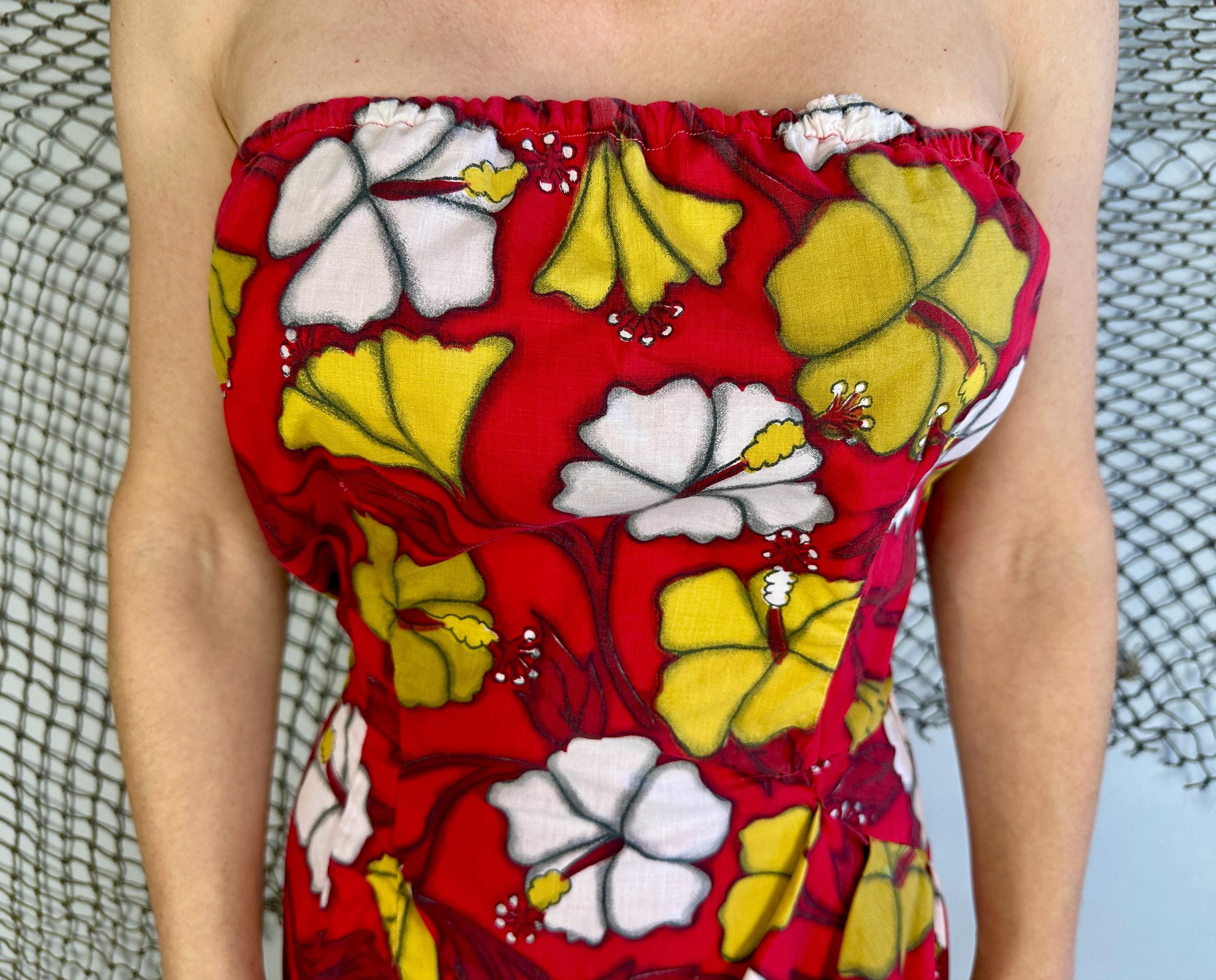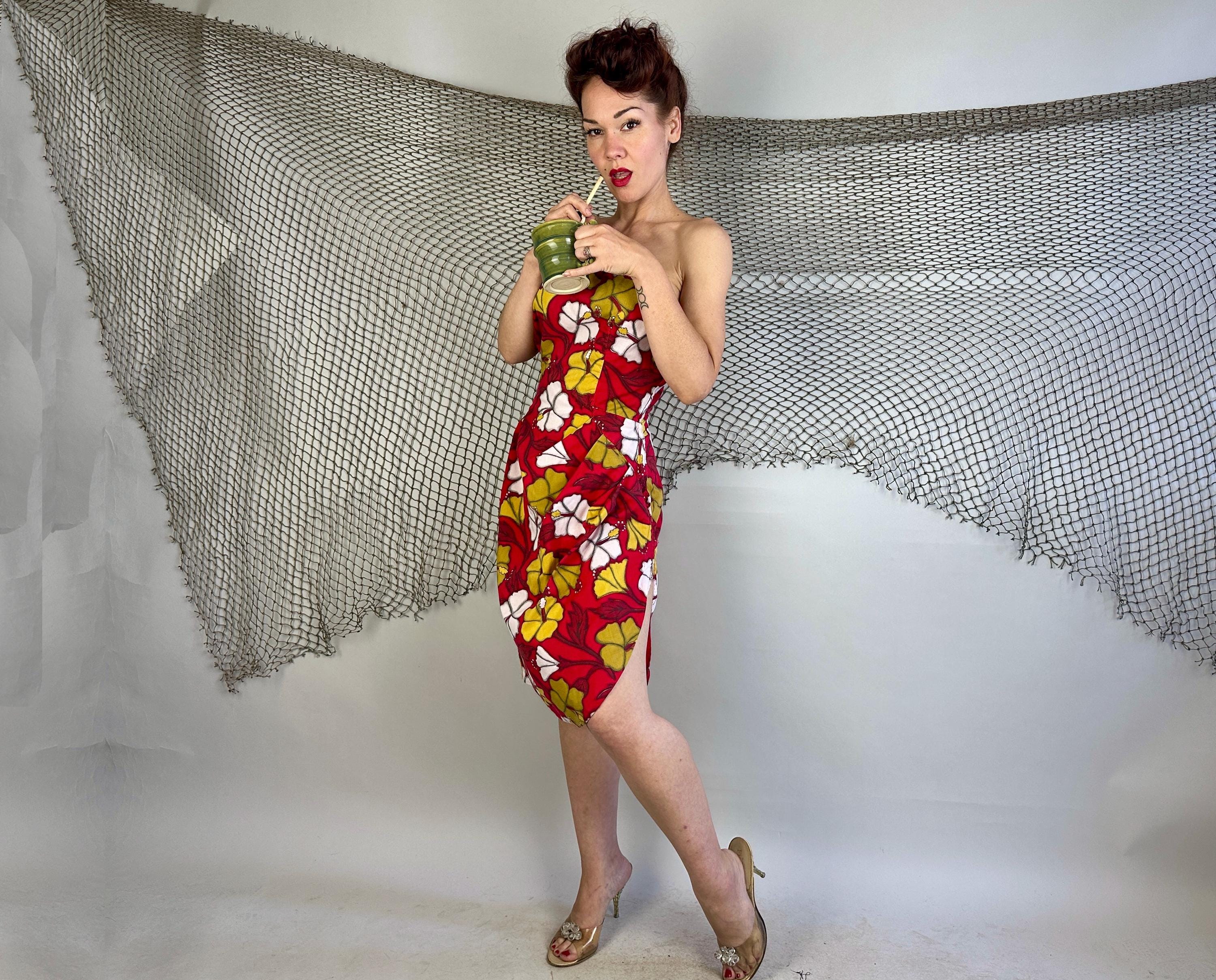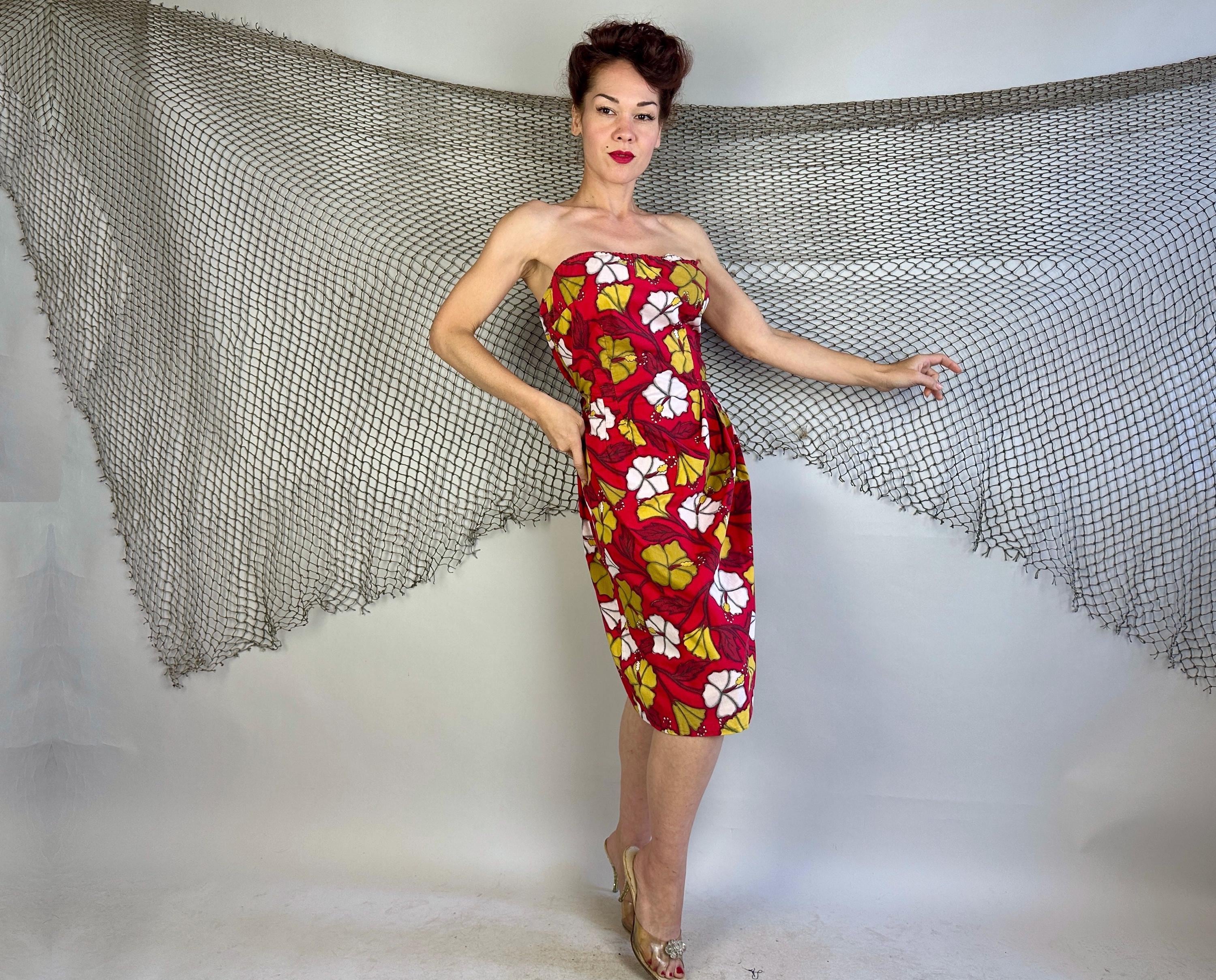 You're gonna cause a heat wave showing up in this 1950s vacation ready dress! A strapless sarong style dress, it has elastic fully around the top and well placed darts to get that hourglass shape. Double layered cotton also helps hold the shape and you're sure to stand out with the bold hibiscus print in white and yellow ochre on a fiery red background. Asymmetric pleating on the left hip leads to a saucy side slit. Metal zipper on the side. This dress is in great vintage condition, with no holes, stains, or odors to note.