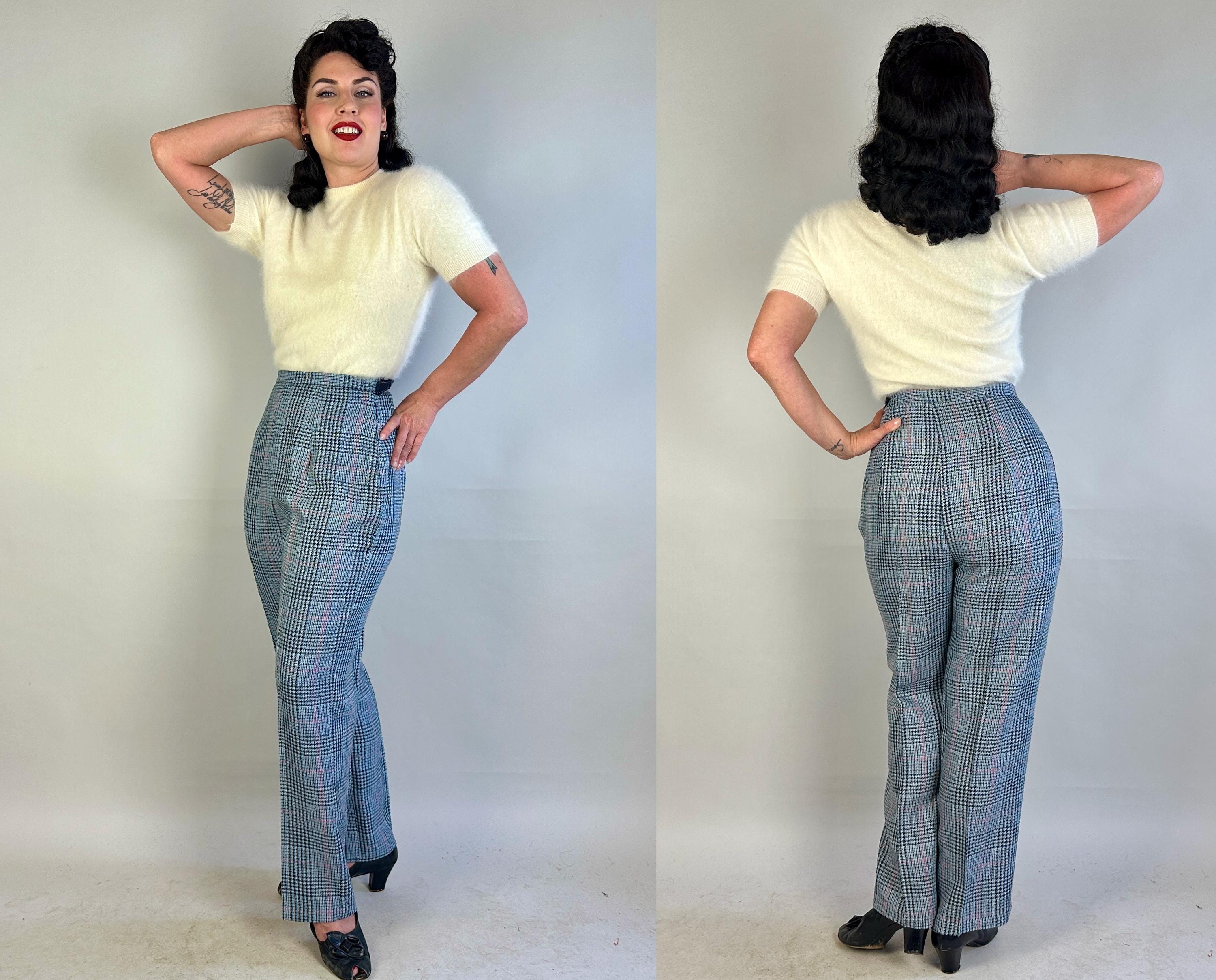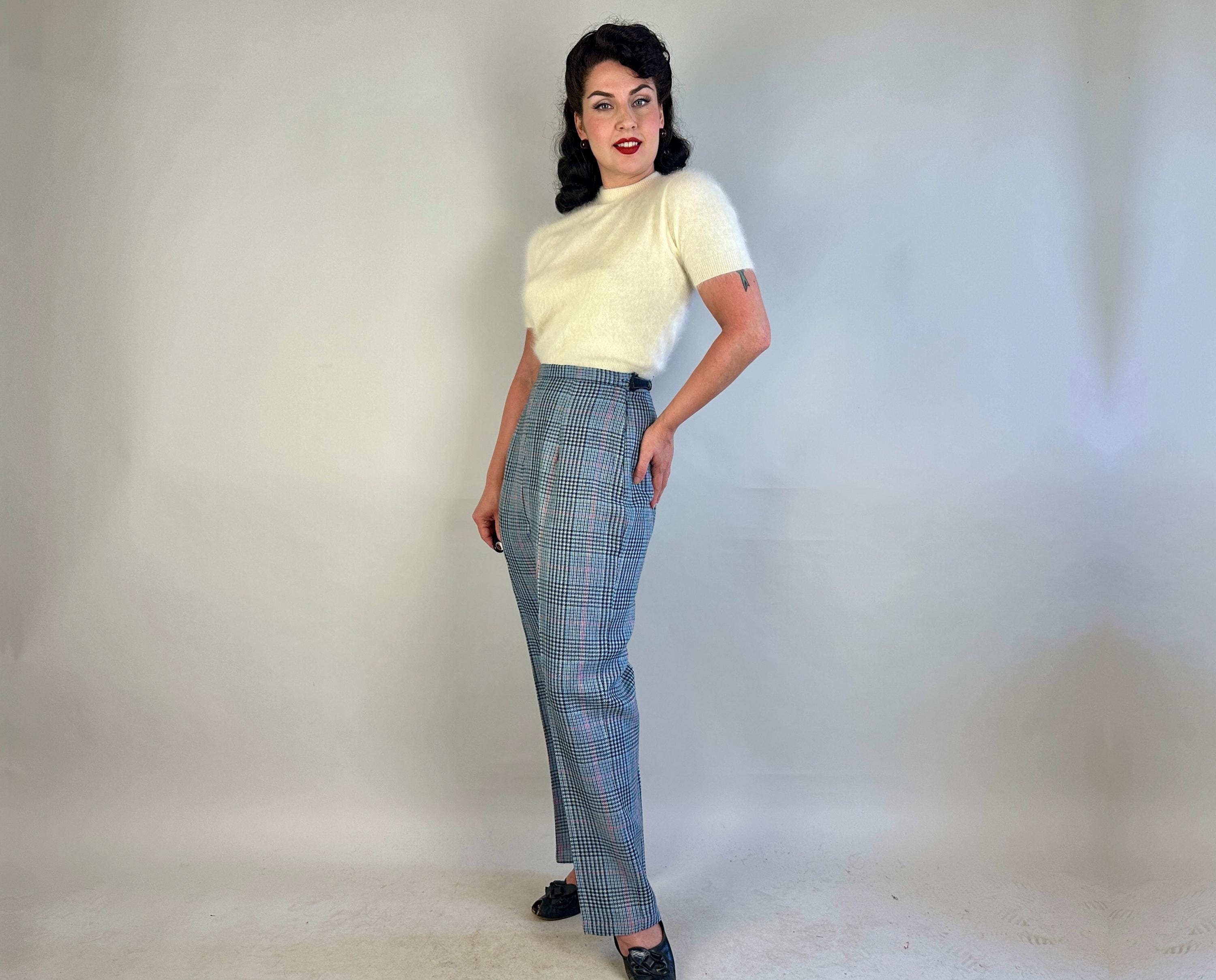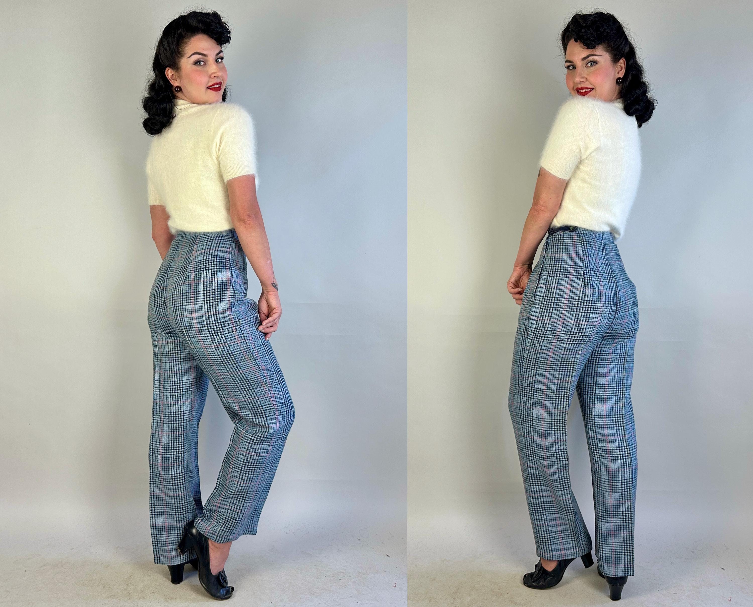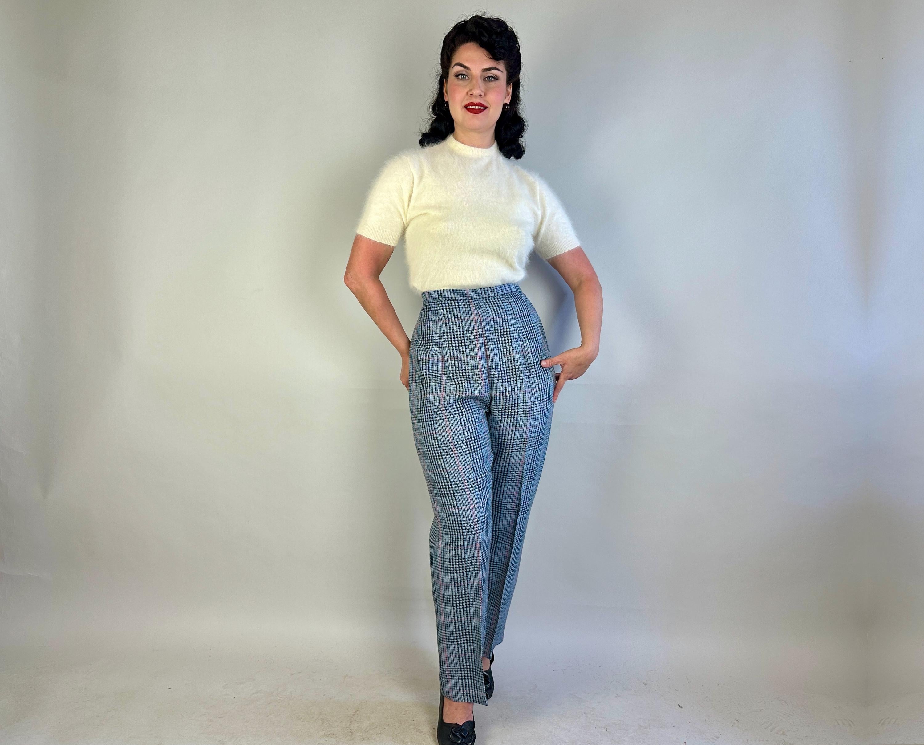 You'll be a plucky pinup in these plaid trousers! Shaped for the ladies but inspired by classic menswear, these wool trousers are woven in a Glen plaid or Prince of Wales check in black, sky blue, scarlet, and dove grey. The high waist is shaped with darts and pressed creases leave you looking polished. Metal zipper and double buton tab fasten on the side. These trousers are in great vintage condition, with no stains, holes, or odors to note.