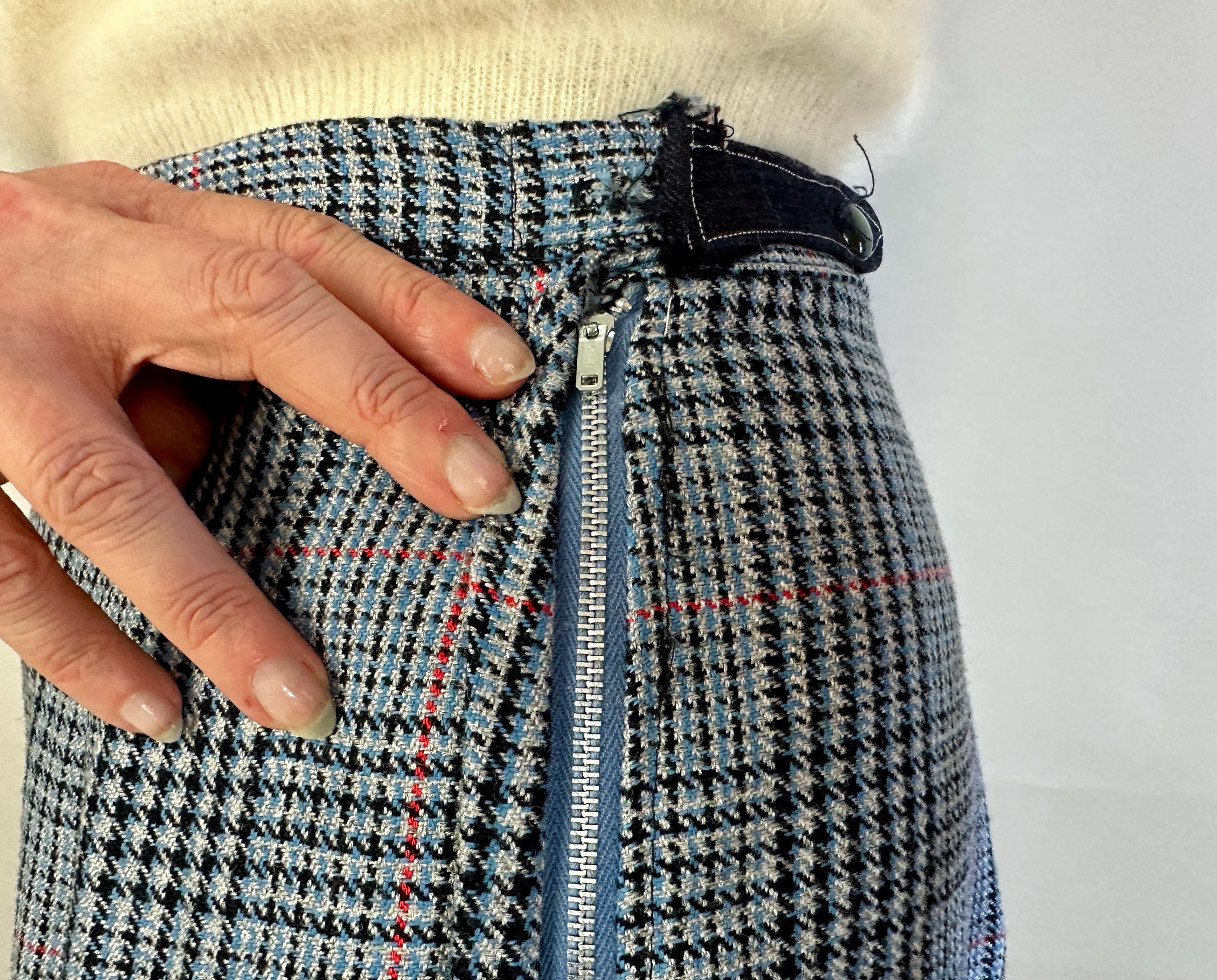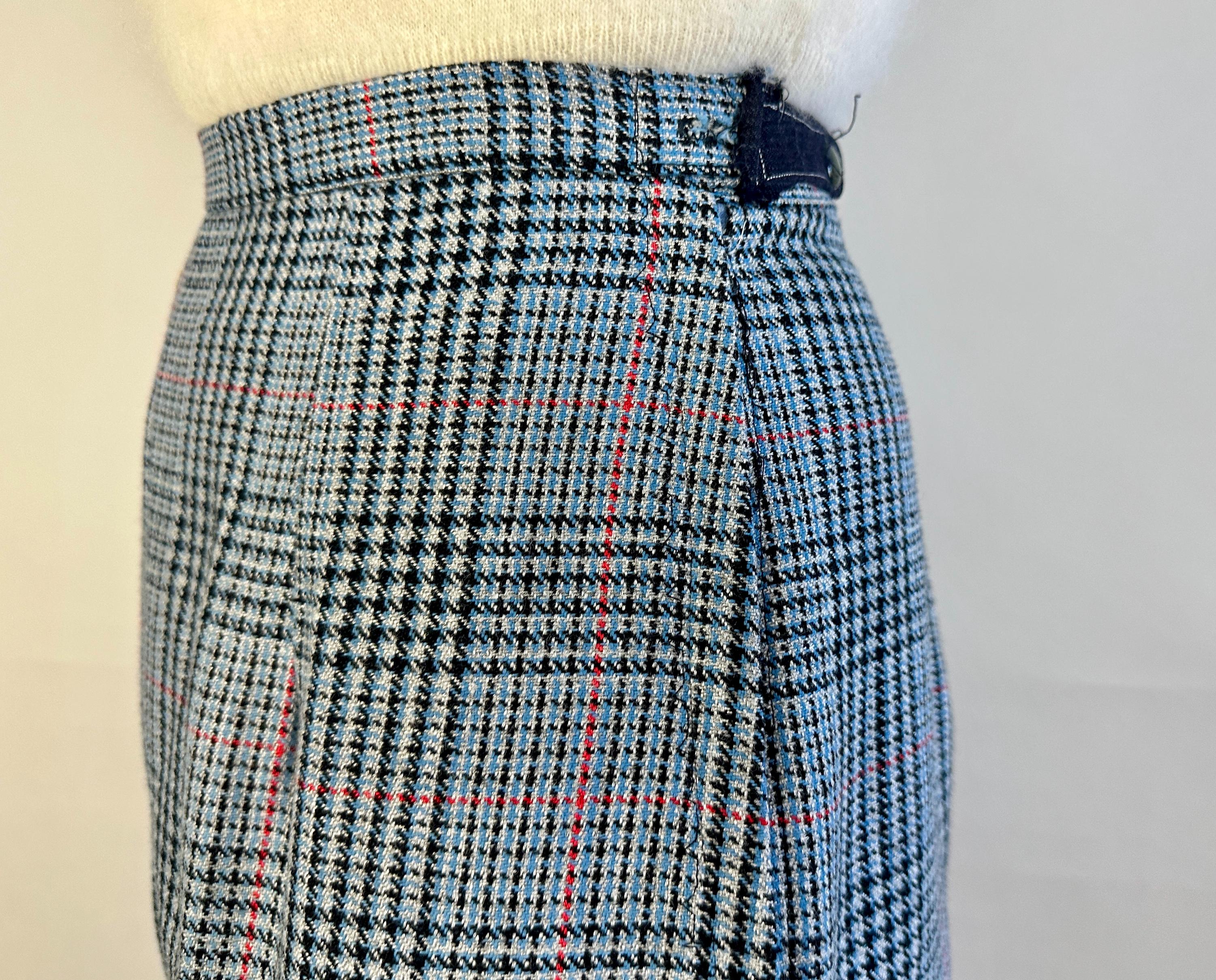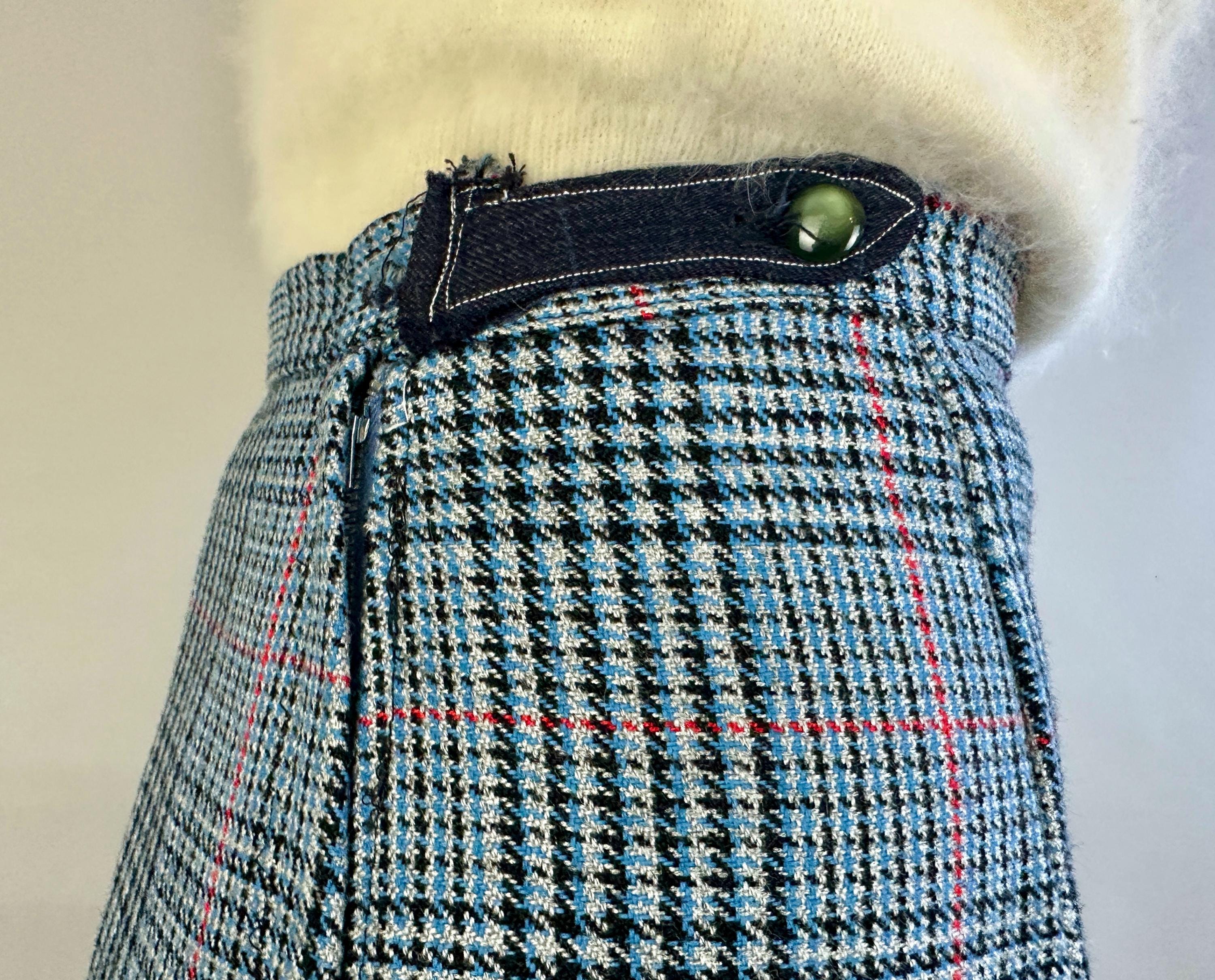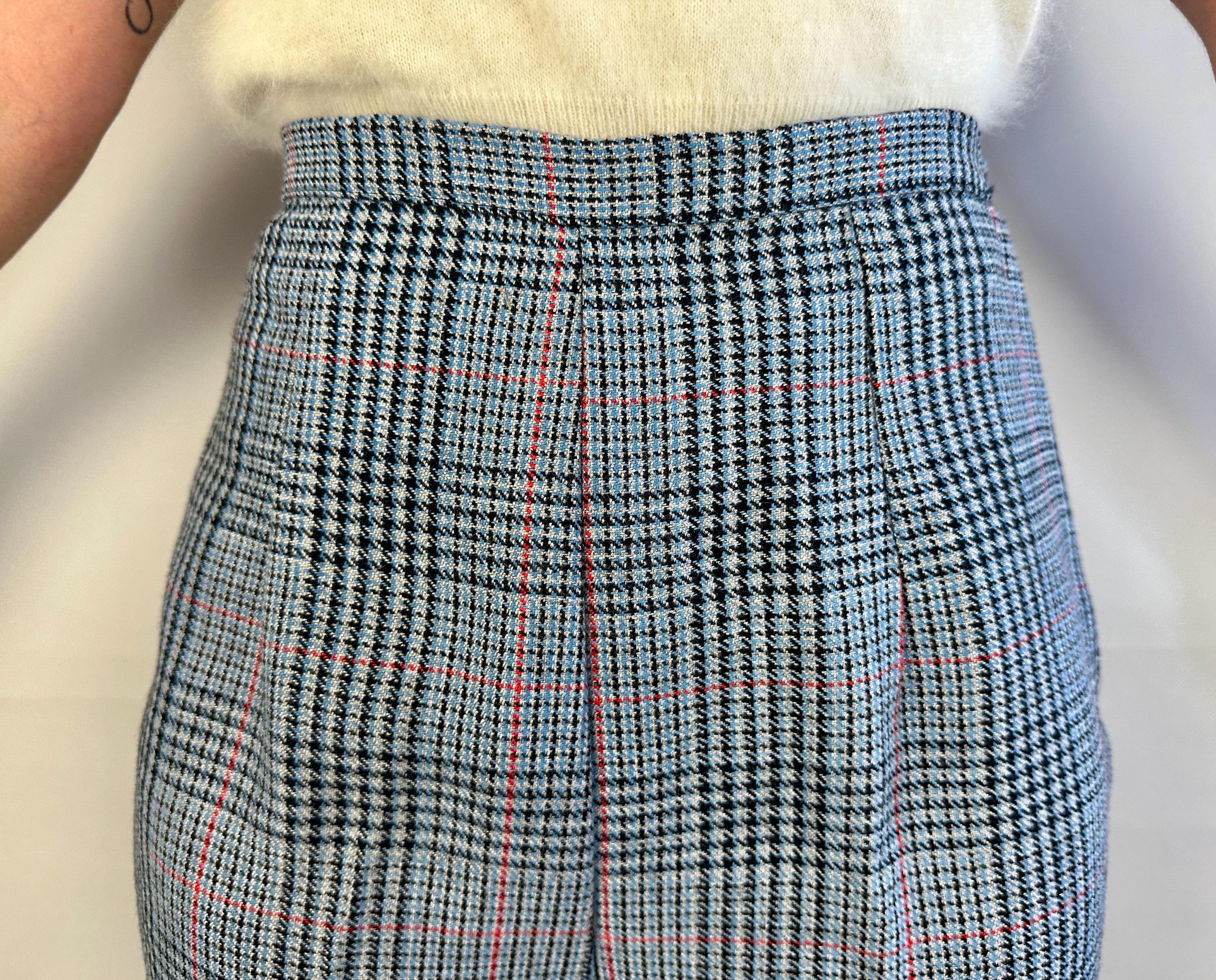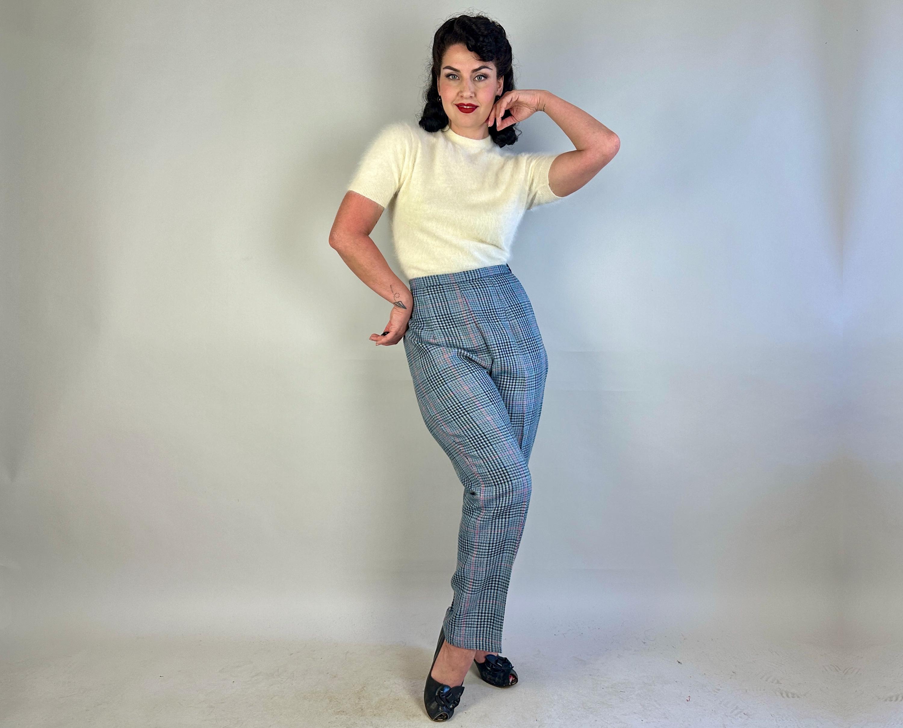 You'll be a plucky pinup in these plaid trousers! Shaped for the ladies but inspired by classic menswear, these wool trousers are woven in a Glen plaid or Prince of Wales check in black, sky blue, scarlet, and dove grey. The high waist is shaped with darts and pressed creases leave you looking polished. Metal zipper and double buton tab fasten on the side. These trousers are in great vintage condition, with no stains, holes, or odors to note.
