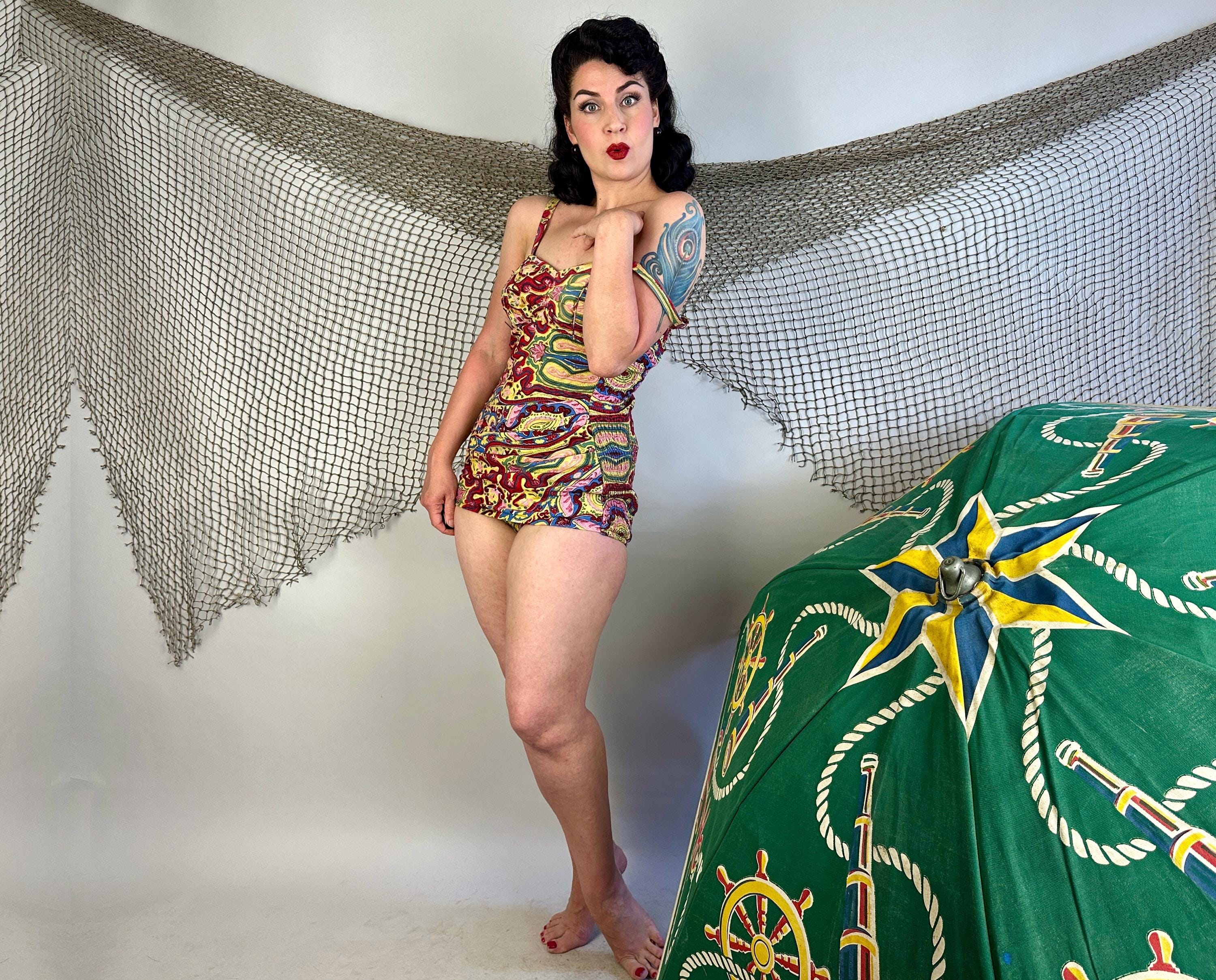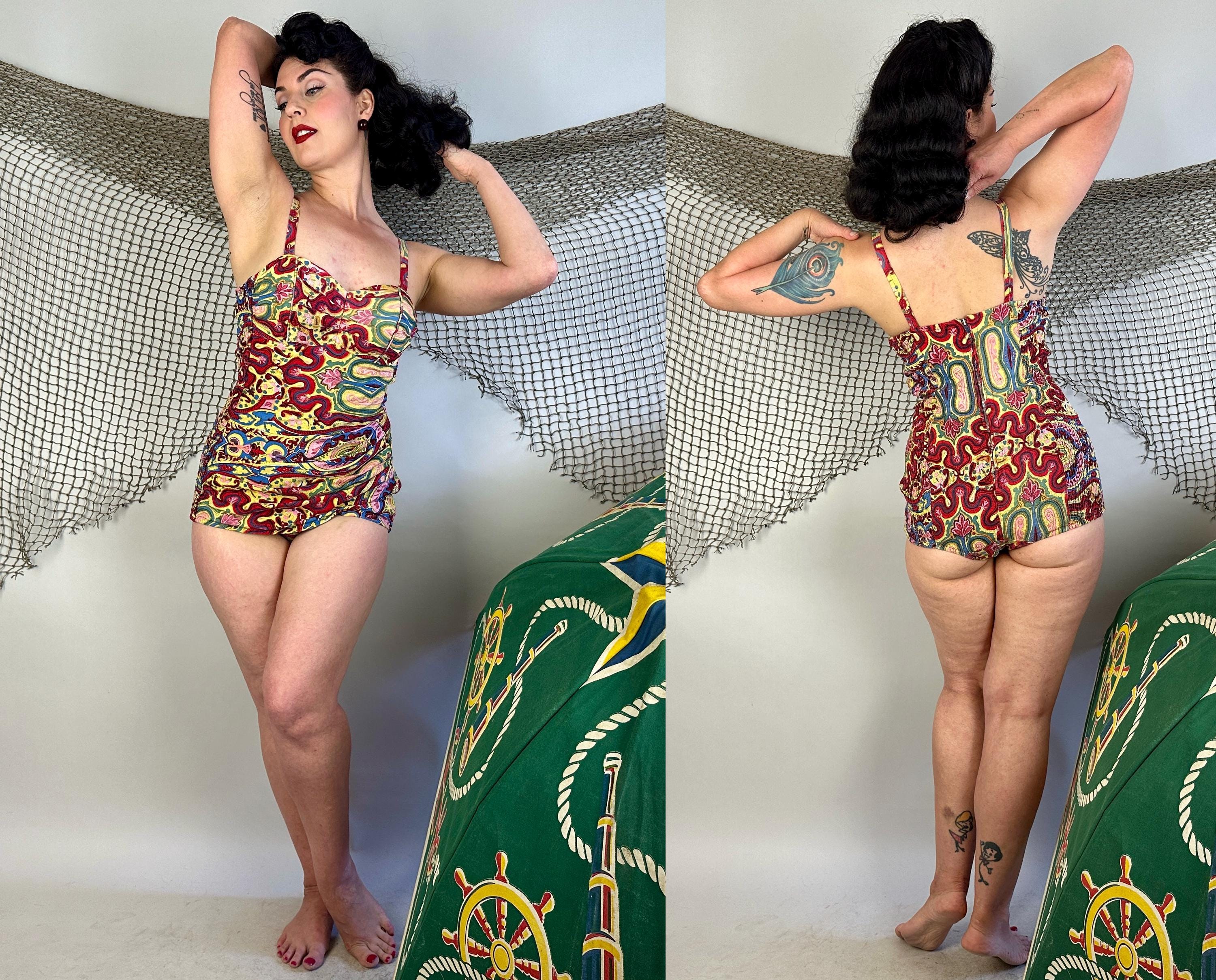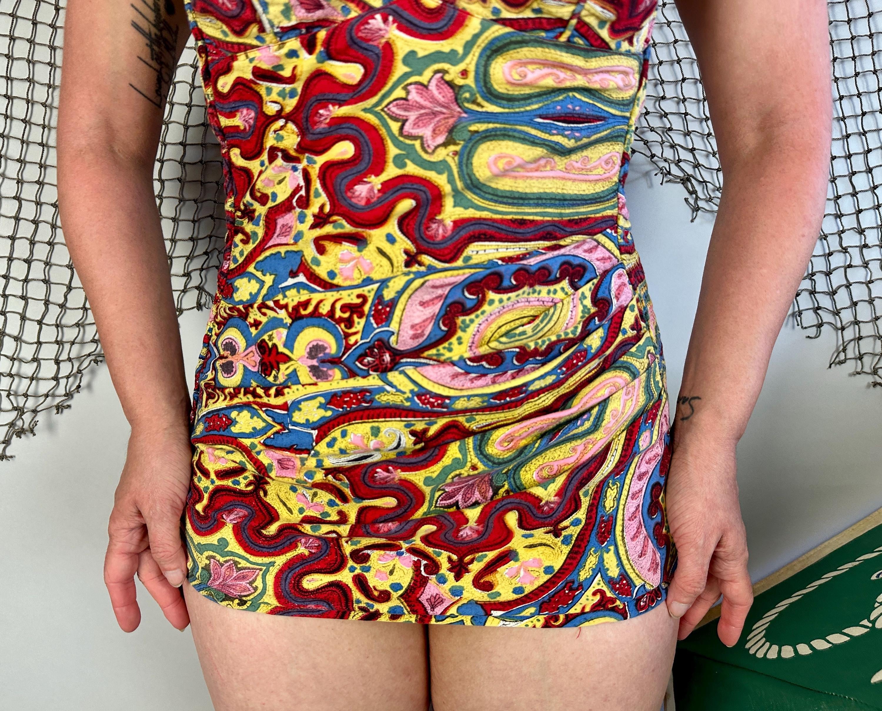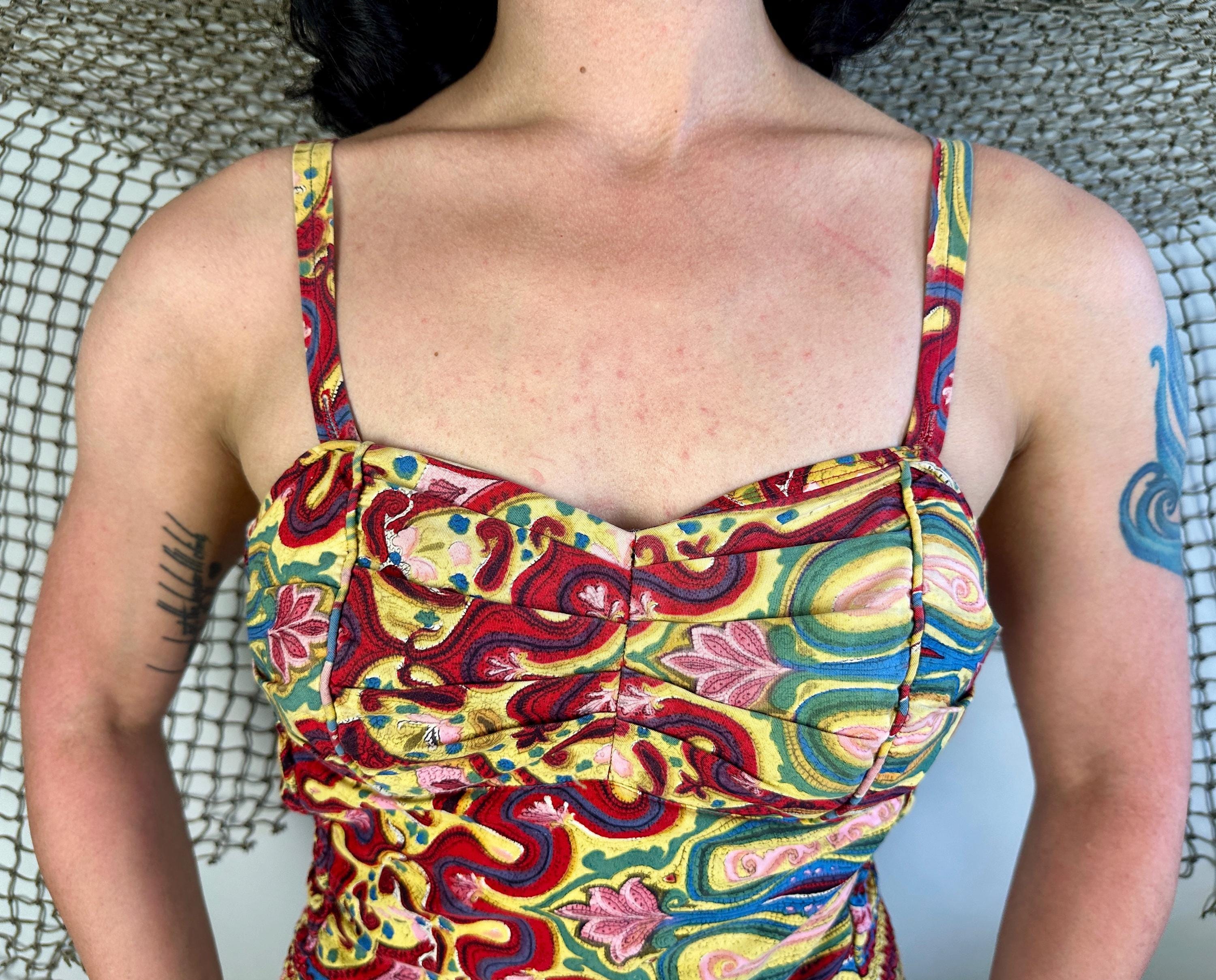 Get some sun and sand with a paisley twist when you visit paradise in this 1950s bathing suit! This cotton one piece has a fantastical paisley print in eye catching shades of crimson, daffodil yellow, azure blue, spruce green, and bubblegum pink. With a sweetheart neckline, piping and pleats shaped cups, asymmetric pleating below the left waist, and fully shirred back, you'll feel confident in these flattering elements. Buttoning straps for customization, and metal “Talon” zip up the back. This playsuit is in great vintage condition, with no holes, stains, or odors to note.