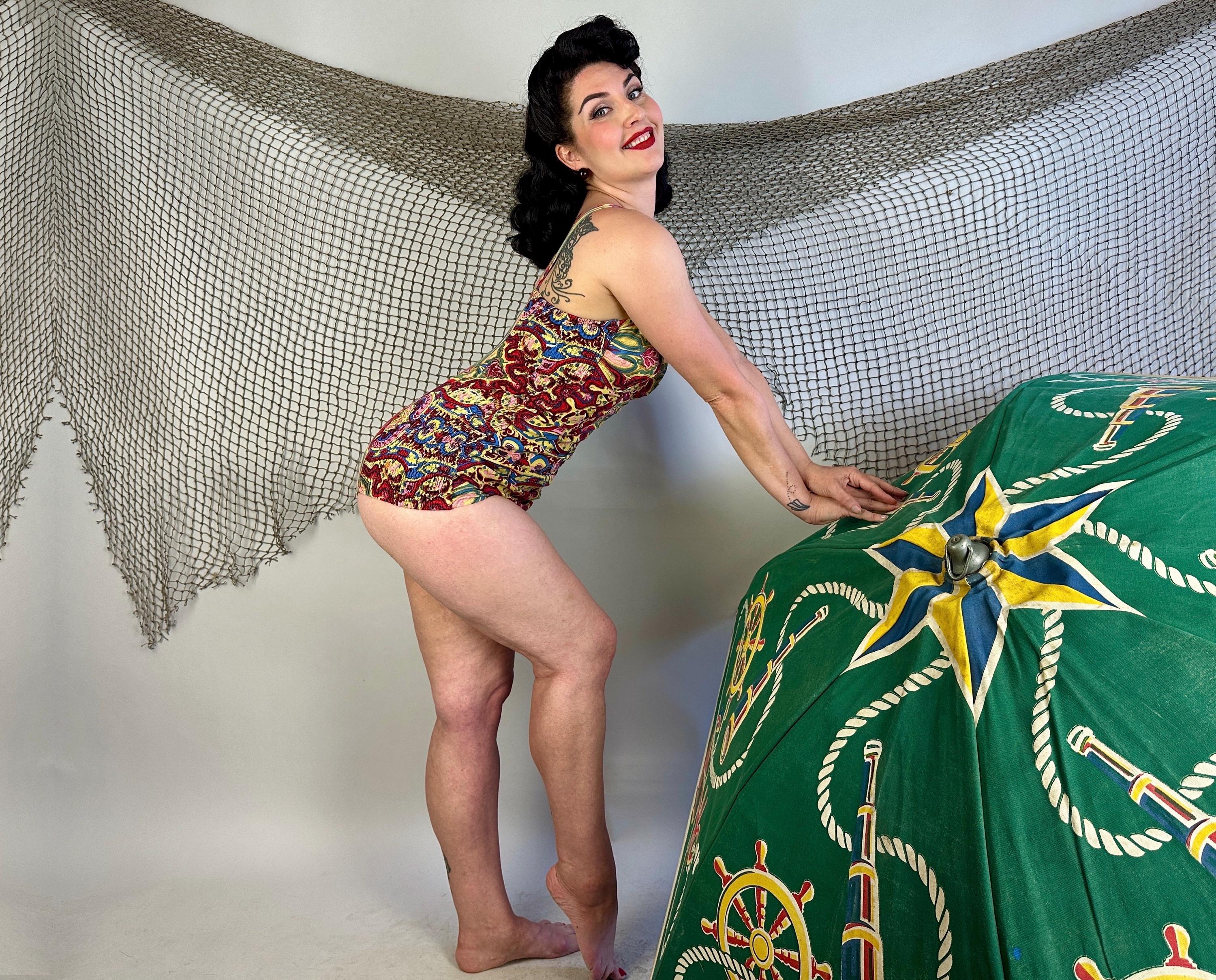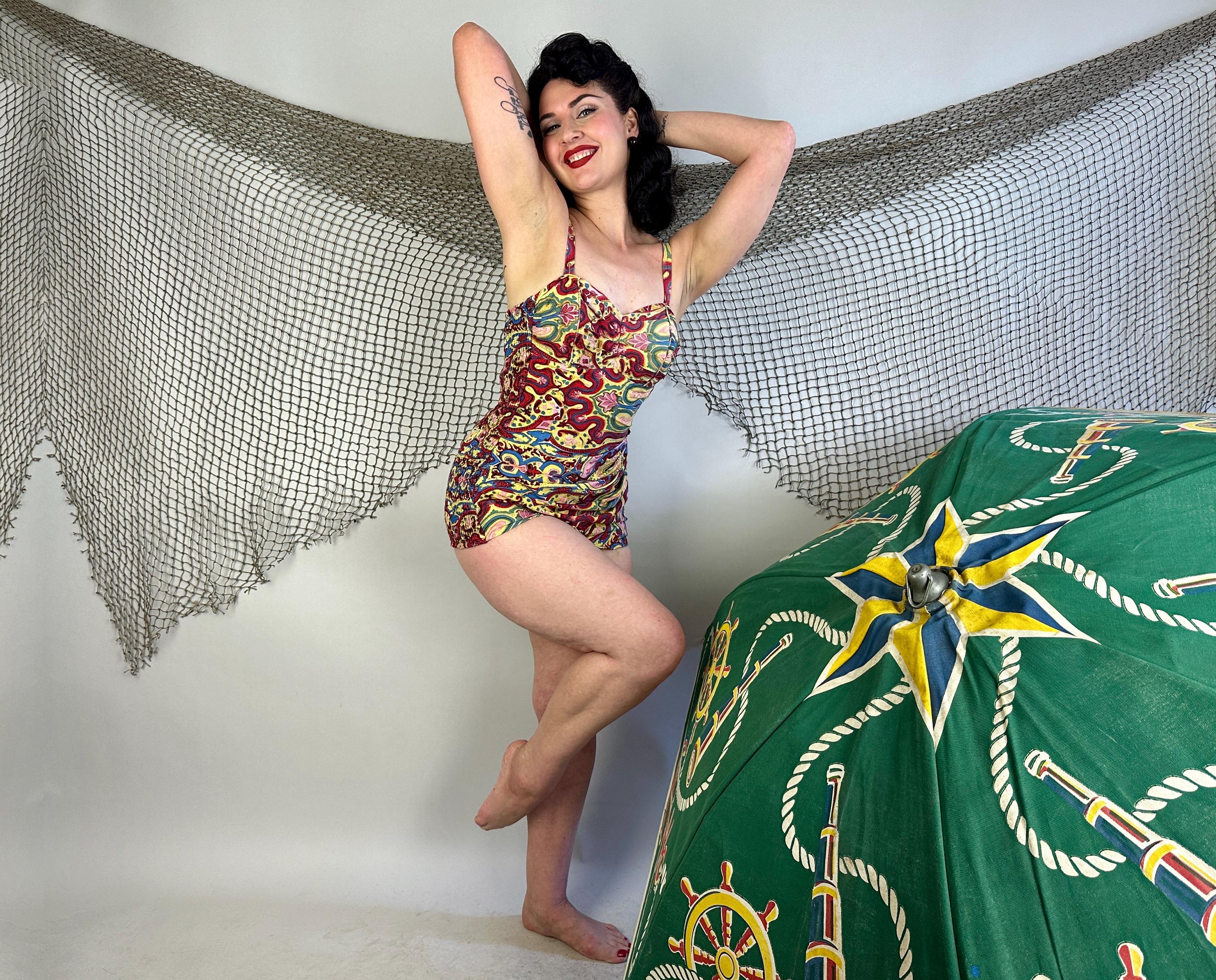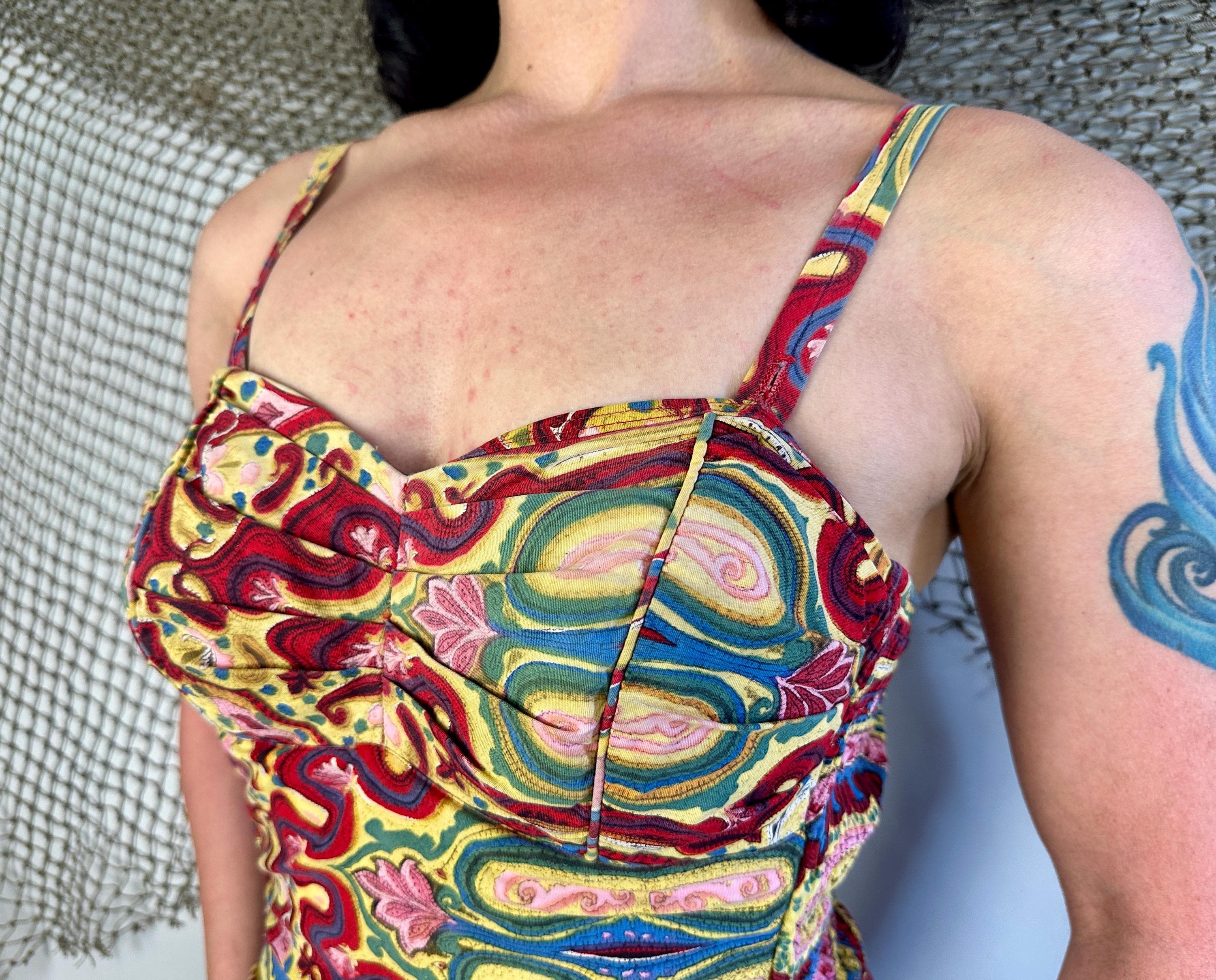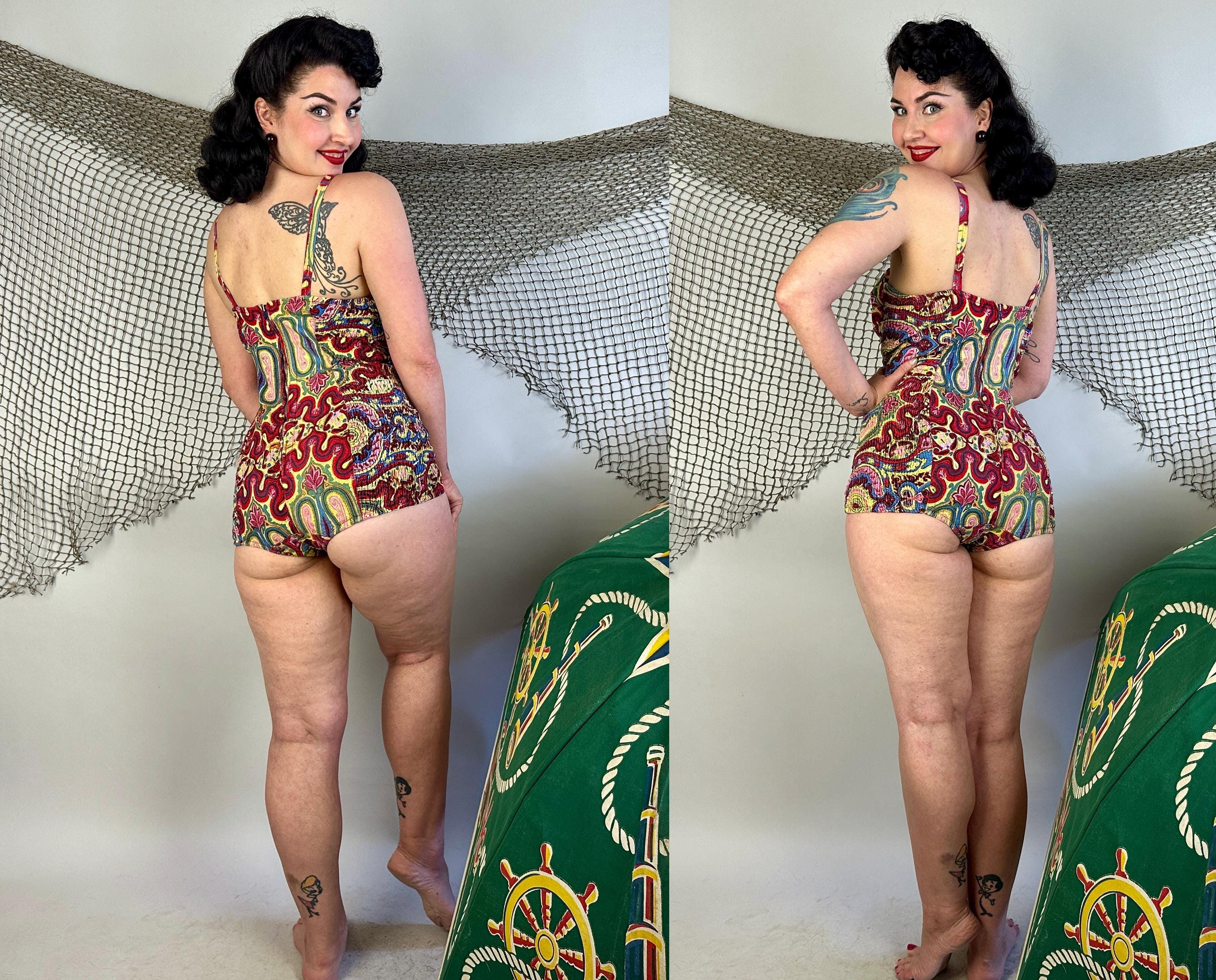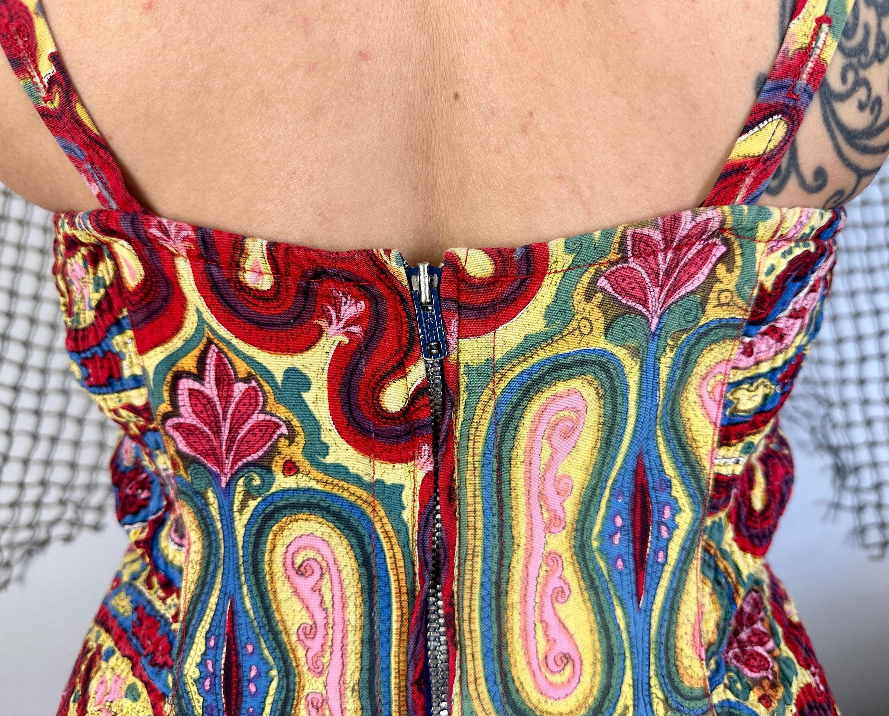 Get some sun and sand with a paisley twist when you visit paradise in this 1950s bathing suit! This cotton one piece has a fantastical paisley print in eye catching shades of crimson, daffodil yellow, azure blue, spruce green, and bubblegum pink. With a sweetheart neckline, piping and pleats shaped cups, asymmetric pleating below the left waist, and fully shirred back, you'll feel confident in these flattering elements. Buttoning straps for customization, and metal “Talon” zip up the back. This playsuit is in great vintage condition, with no holes, stains, or odors to note.