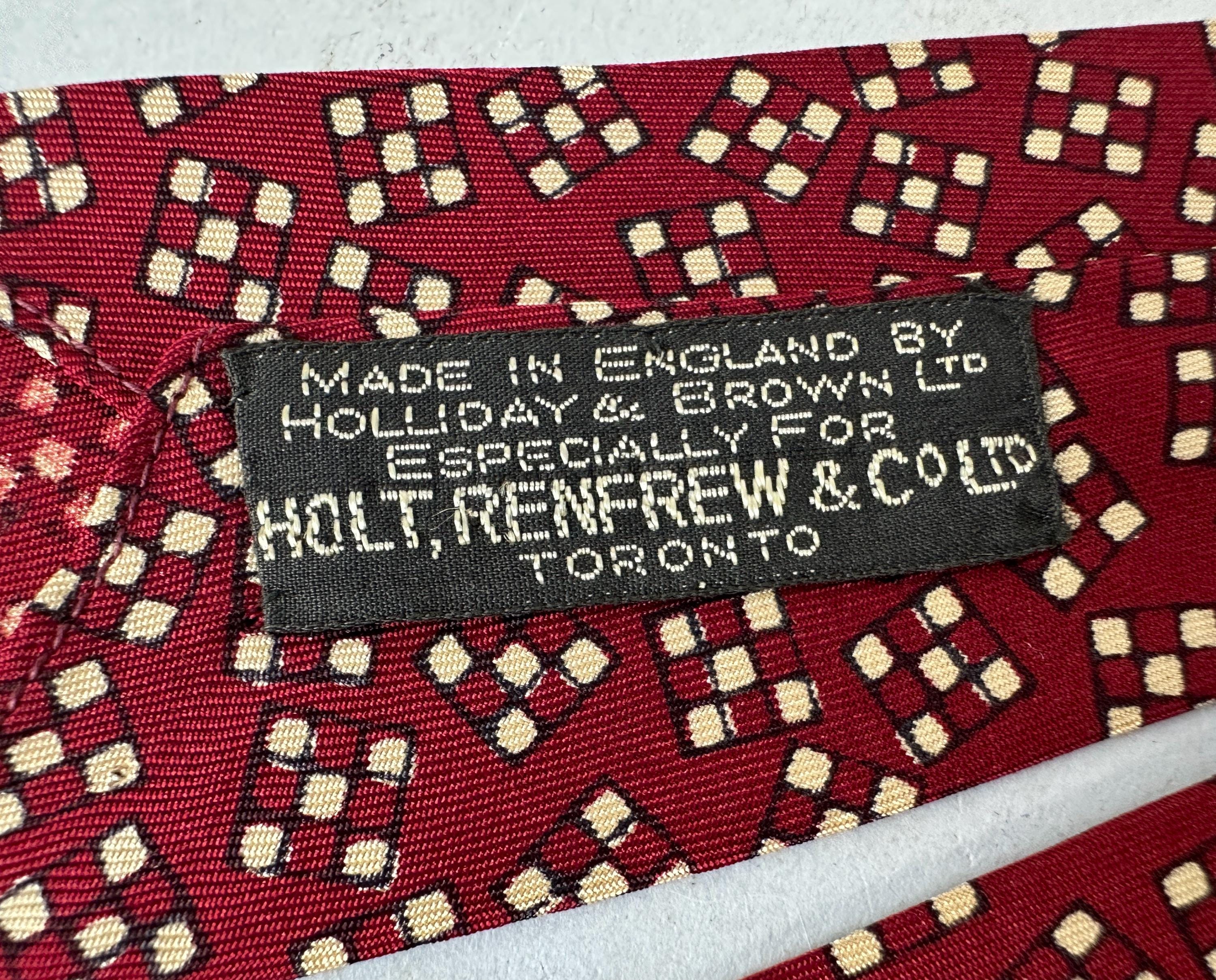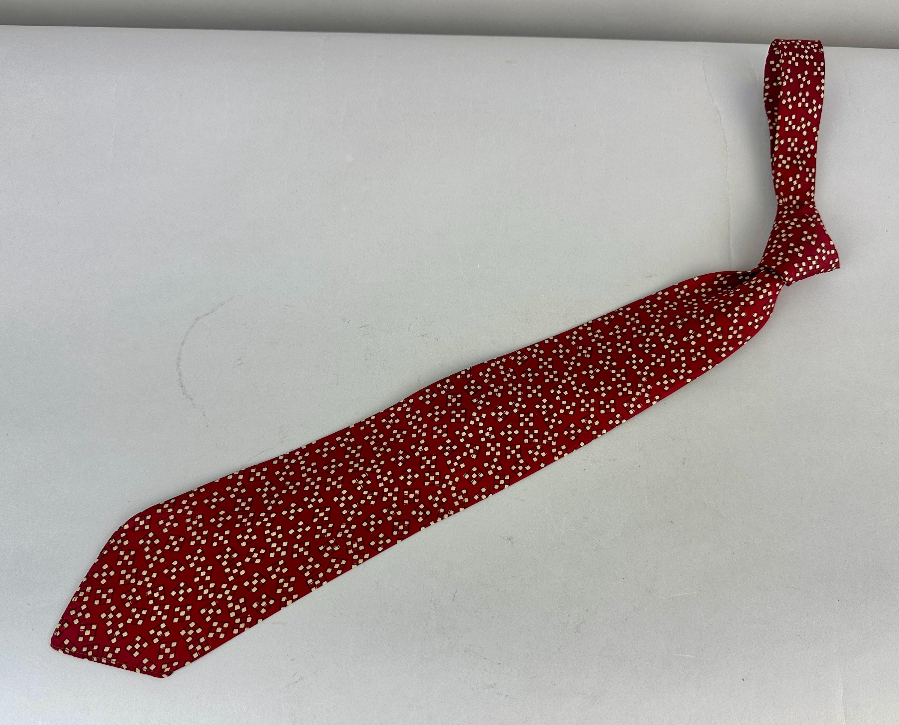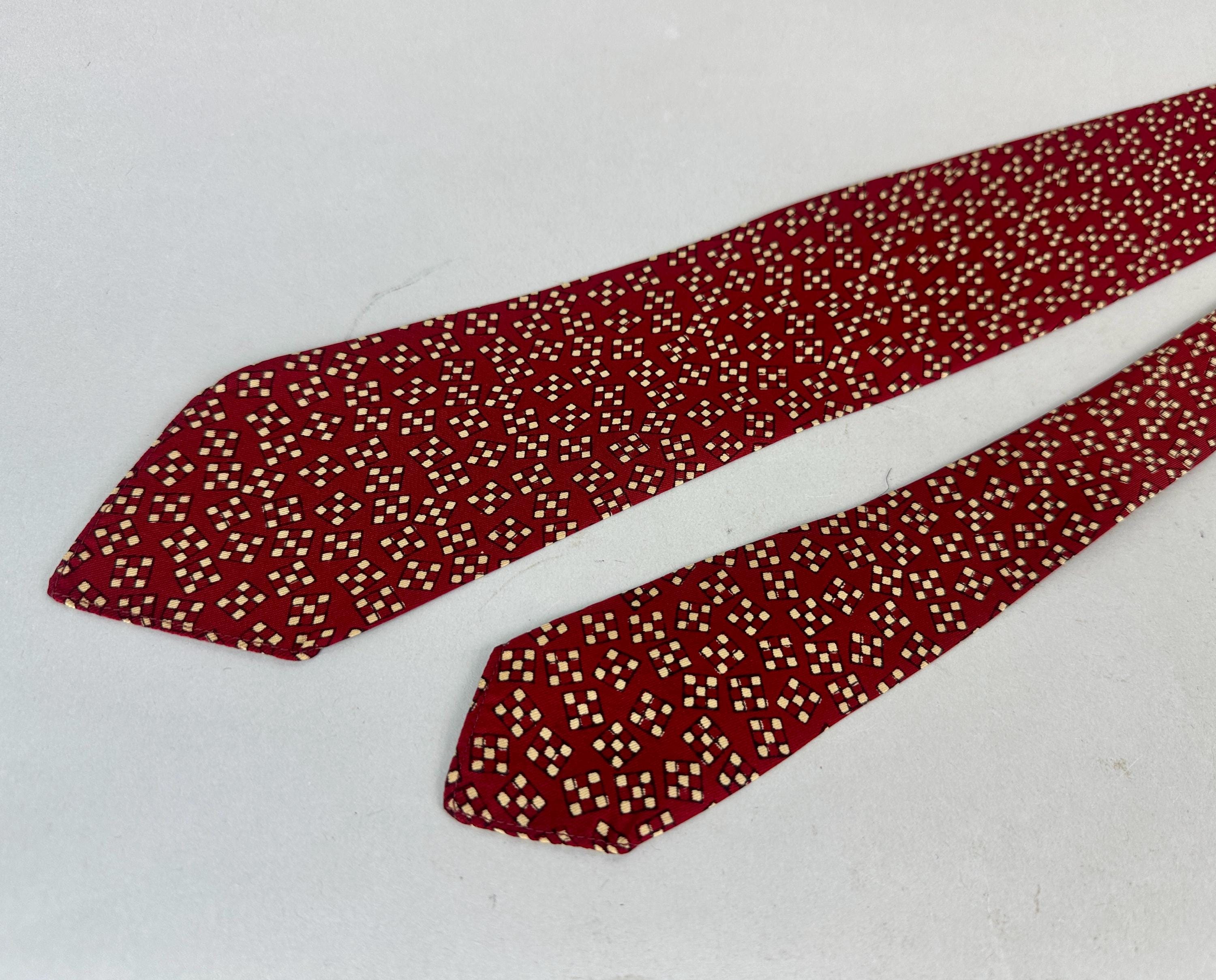 Check out this checkered 1930's tie! The silk is deep crimson dotted with ivory in the pattern of individual checkerboards. Unlined and labeled "Made in England by Holliday & Brown For Holt, Renfrew & Co". Pairs well with a wide variety of Art Deco and Mid-Century suit colors and fabric types. This tie is in great vintage condition with no flaws found!