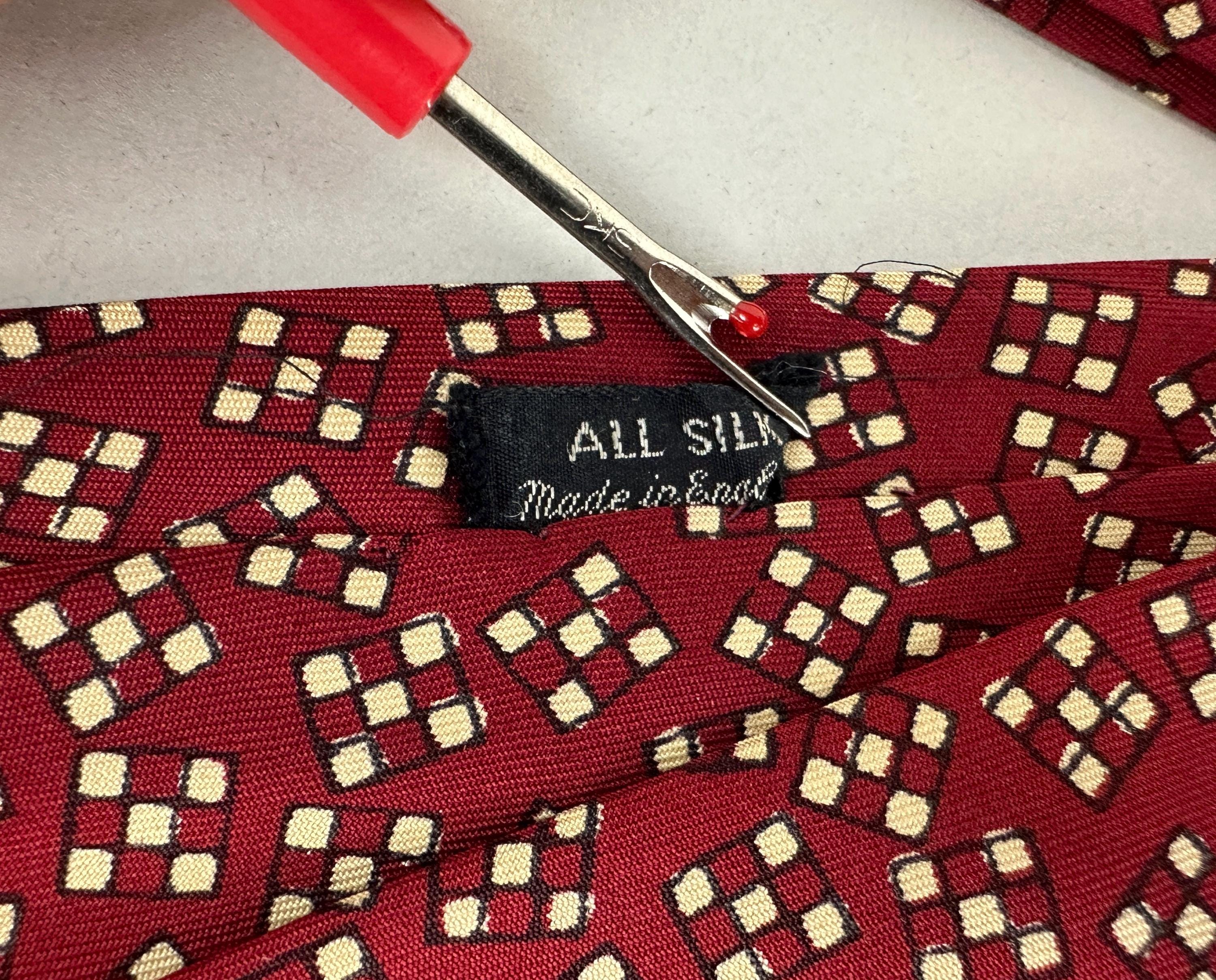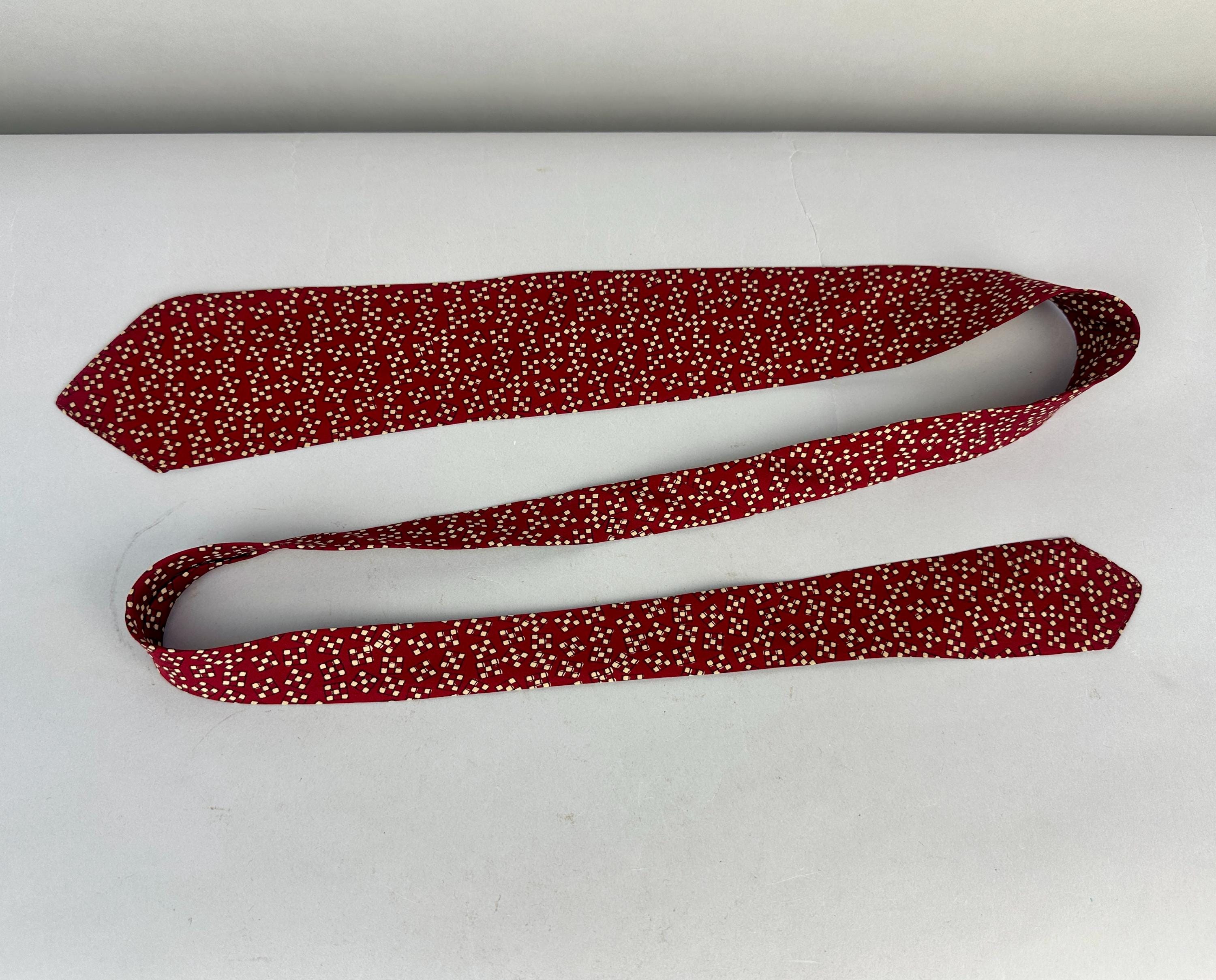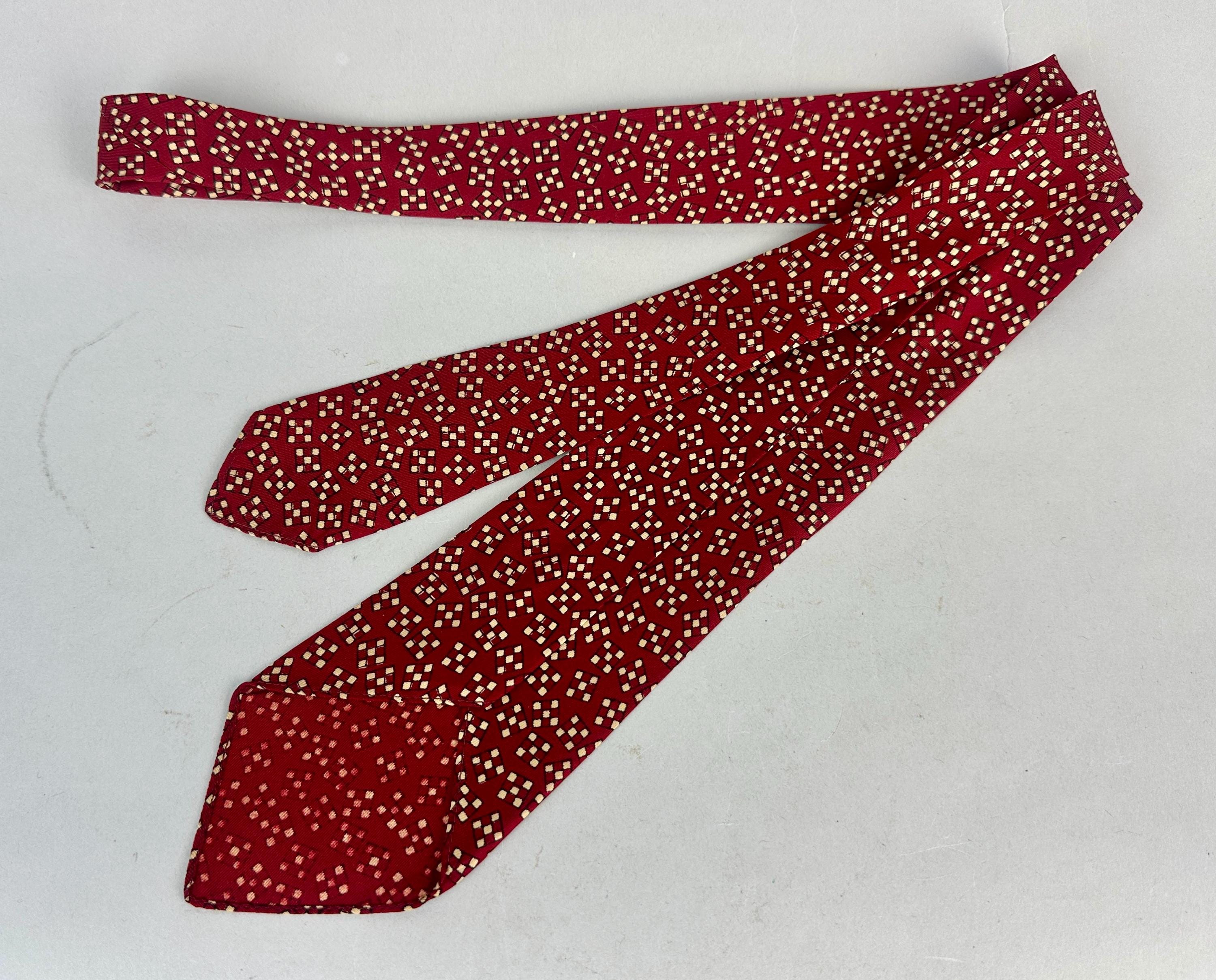 Check out this checkered 1930's tie! The silk is deep crimson dotted with ivory in the pattern of individual checkerboards. Unlined and labeled "Made in England by Holliday & Brown For Holt, Renfrew & Co". Pairs well with a wide variety of Art Deco and Mid-Century suit colors and fabric types. This tie is in great vintage condition with no flaws found!