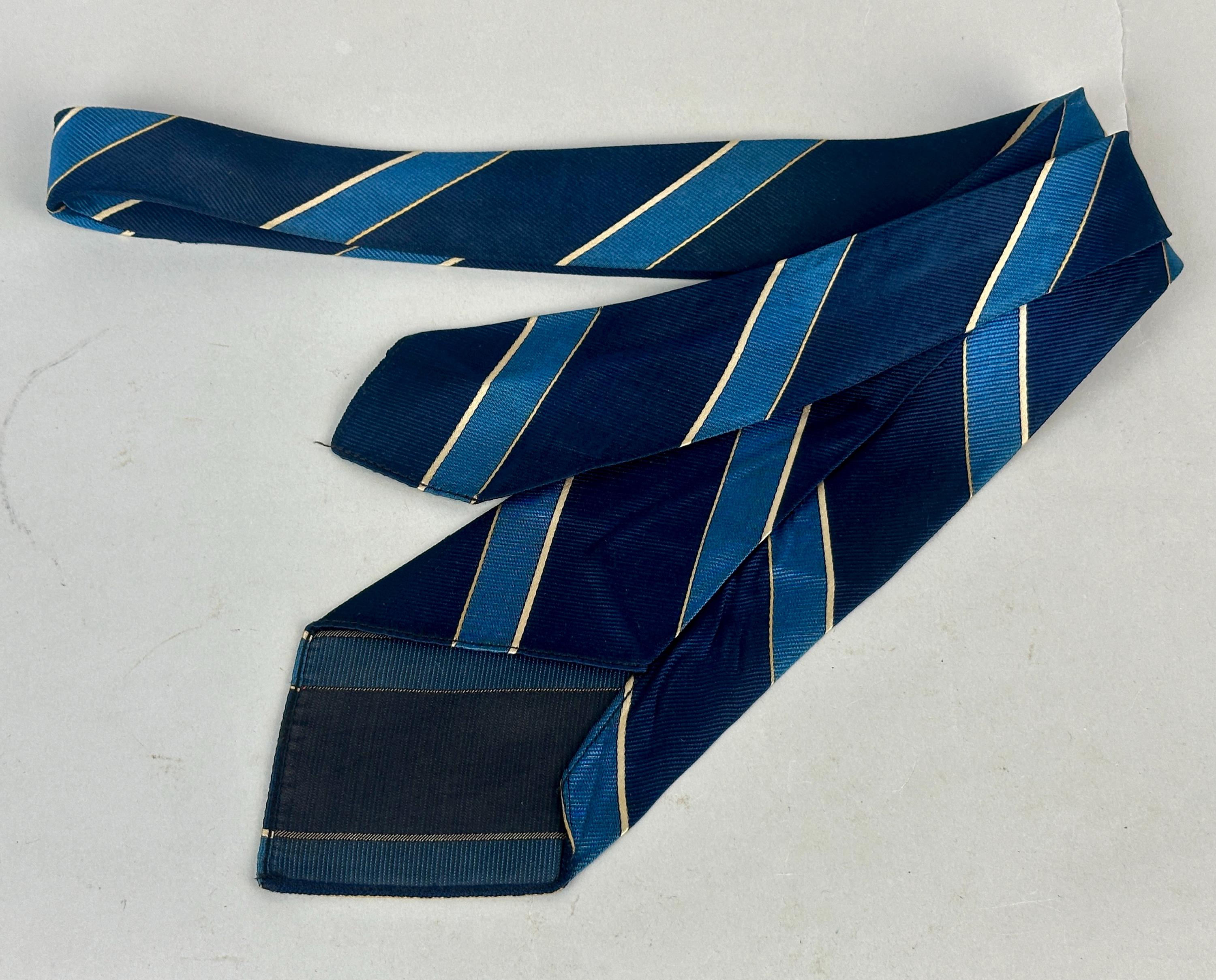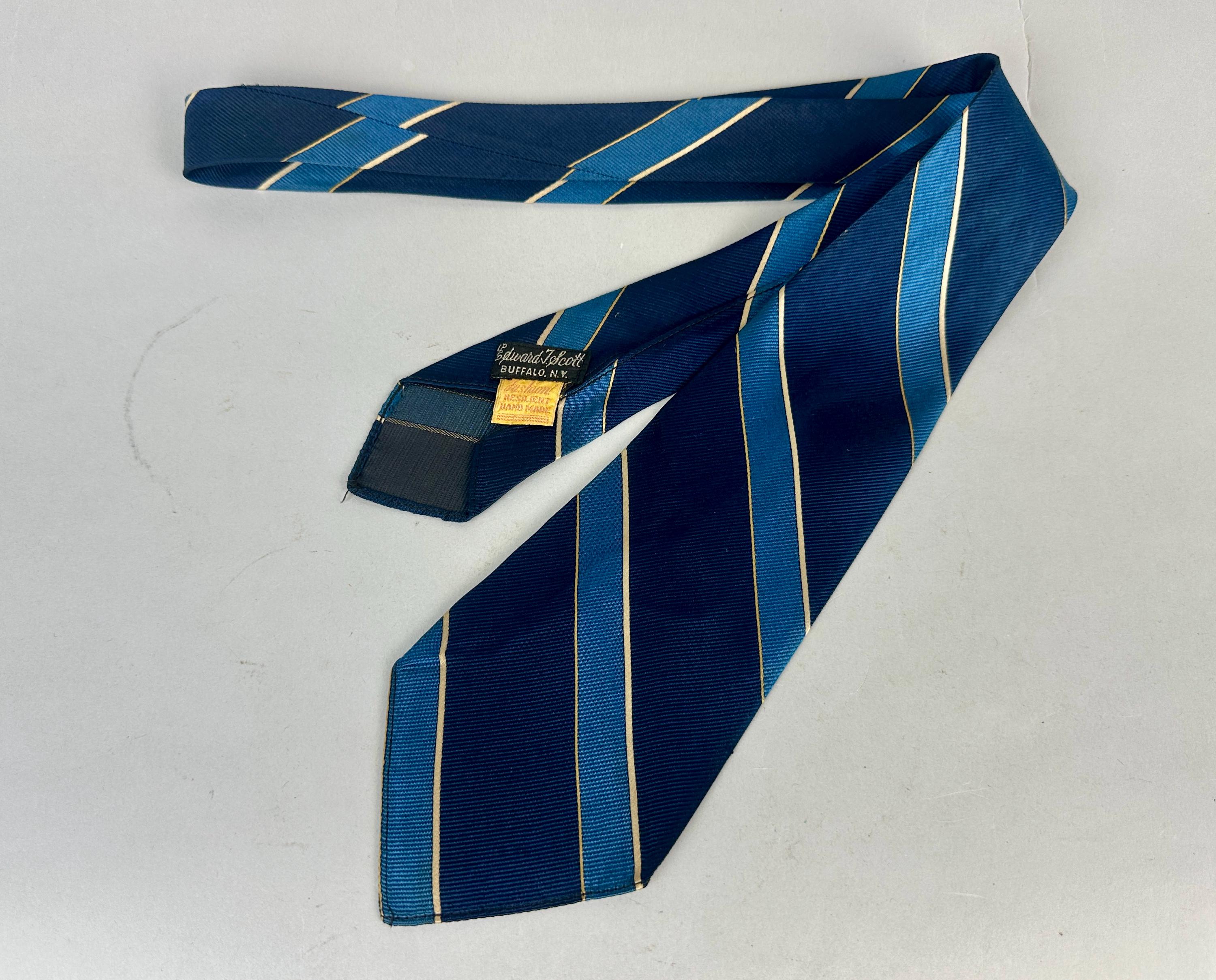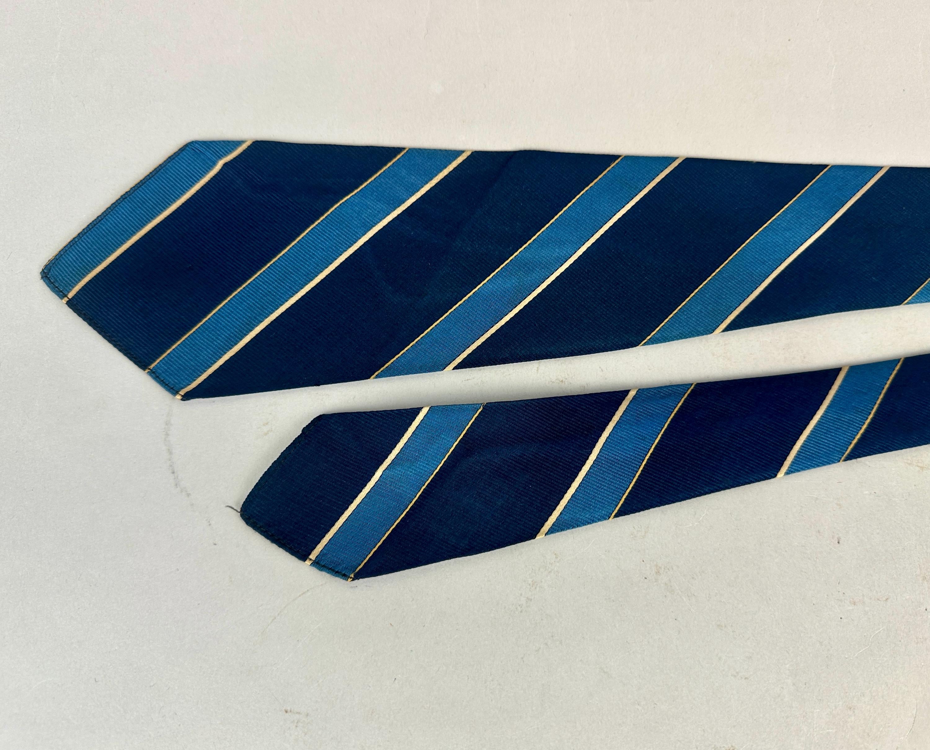 You’ll be stoic and steady in this 1930’s tie! This silk tie has diagonal bias stripes of navy blue, azure blue, and silver, truly classic that never goes out of style. Unlined and labeled "Edward T. Scott" of New York. This tie pairs well with a wide variety of Art Deco and Mid-Century suit colors and fabric types. This tie is in great vintage condition with no flaws found!
