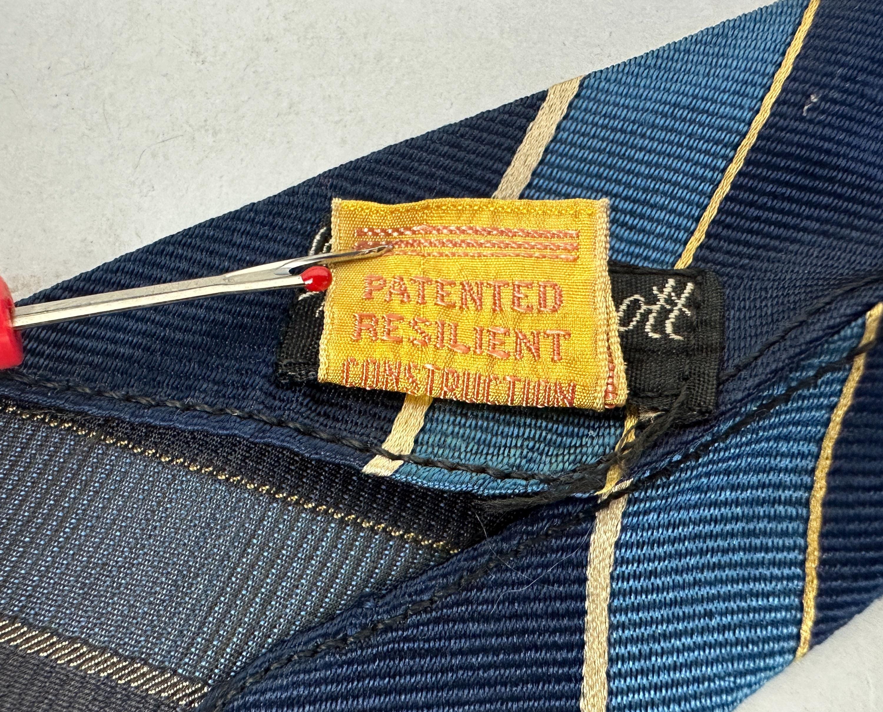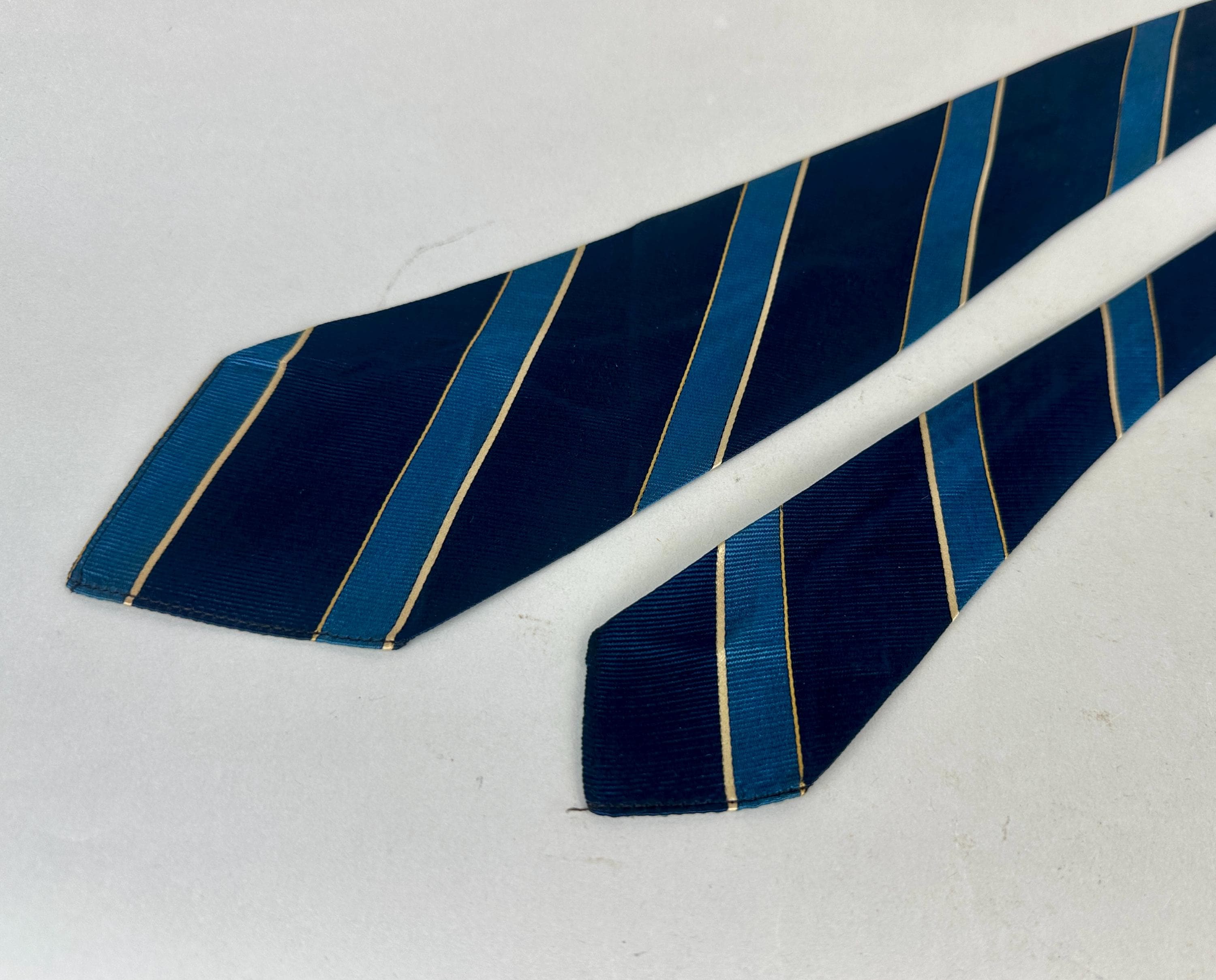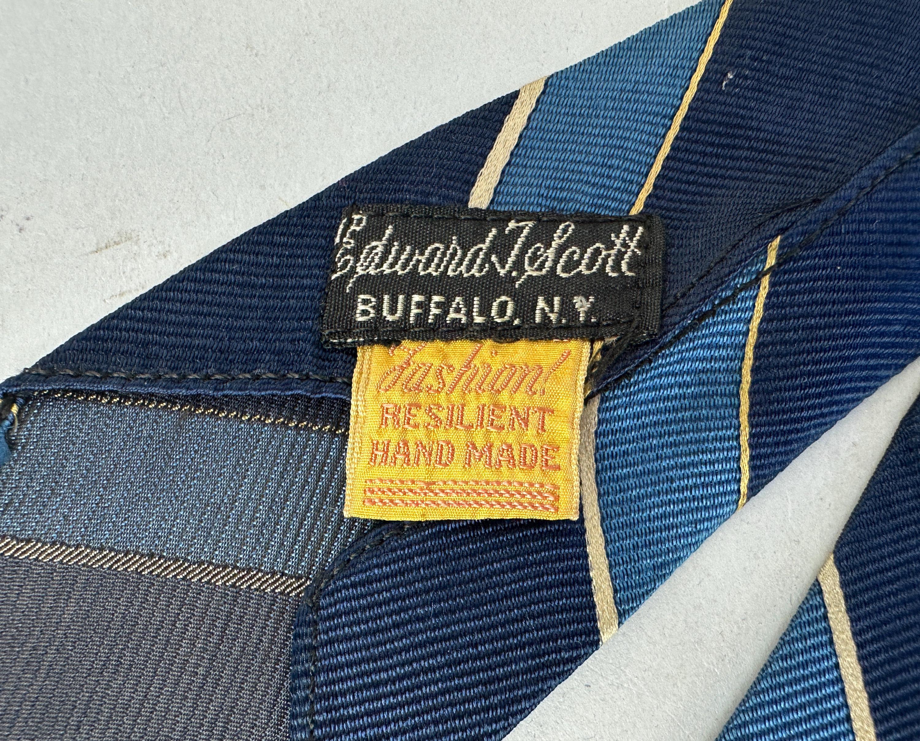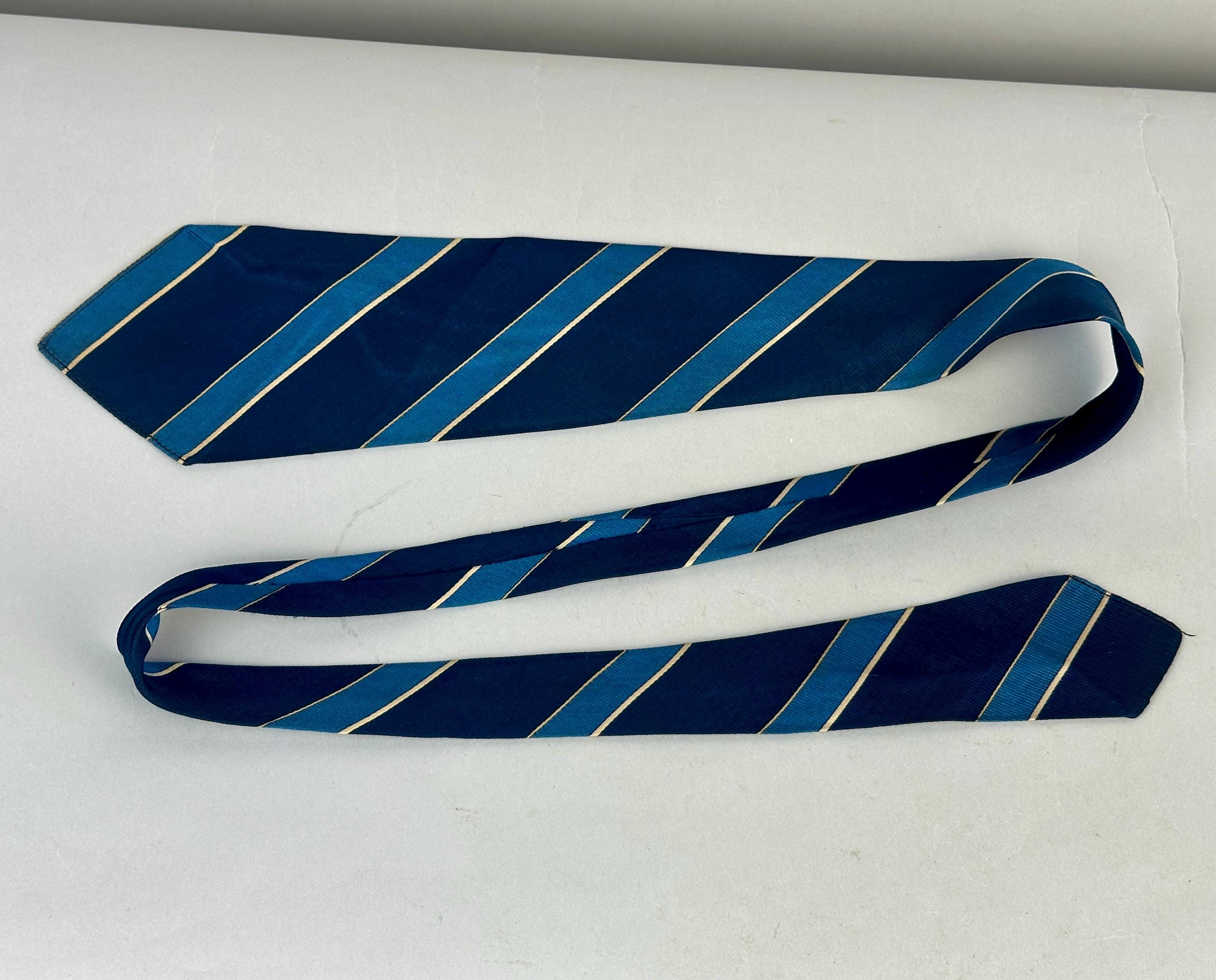 You’ll be stoic and steady in this 1930’s tie! This silk tie has diagonal bias stripes of navy blue, azure blue, and silver, truly classic that never goes out of style. Unlined and labeled "Edward T. Scott" of New York. This tie pairs well with a wide variety of Art Deco and Mid-Century suit colors and fabric types. This tie is in great vintage condition with no flaws found!