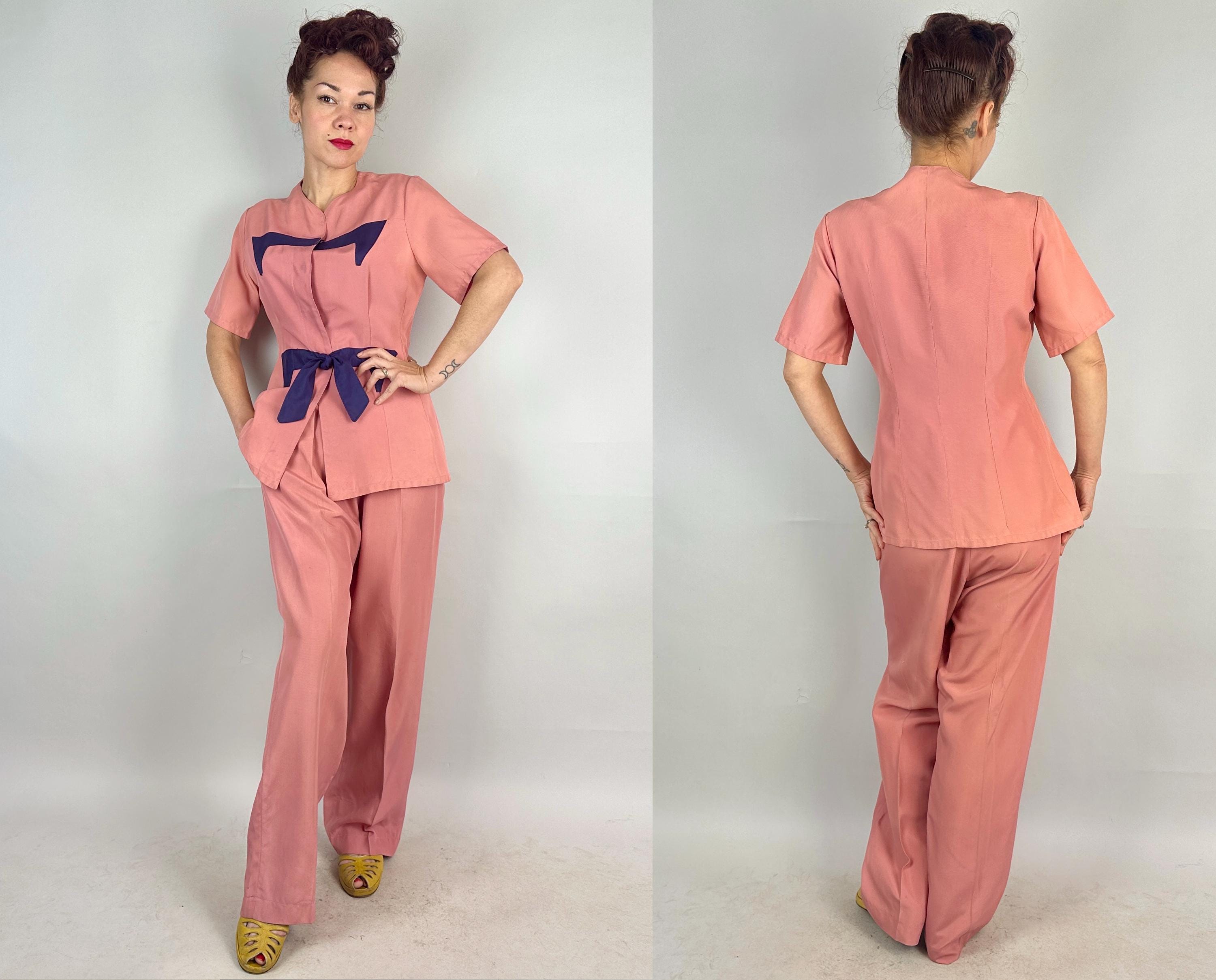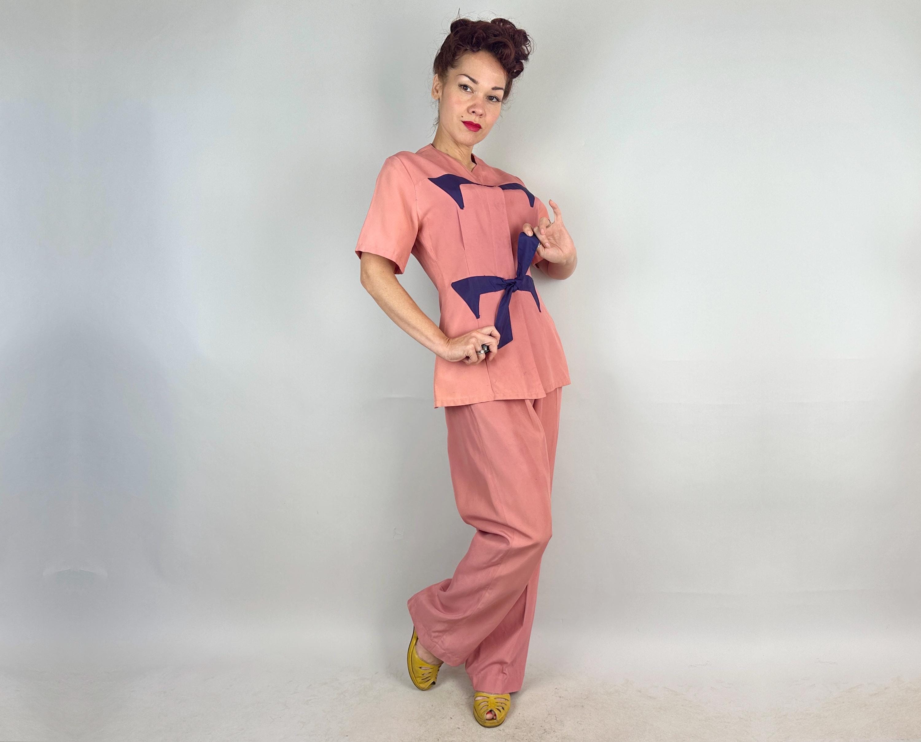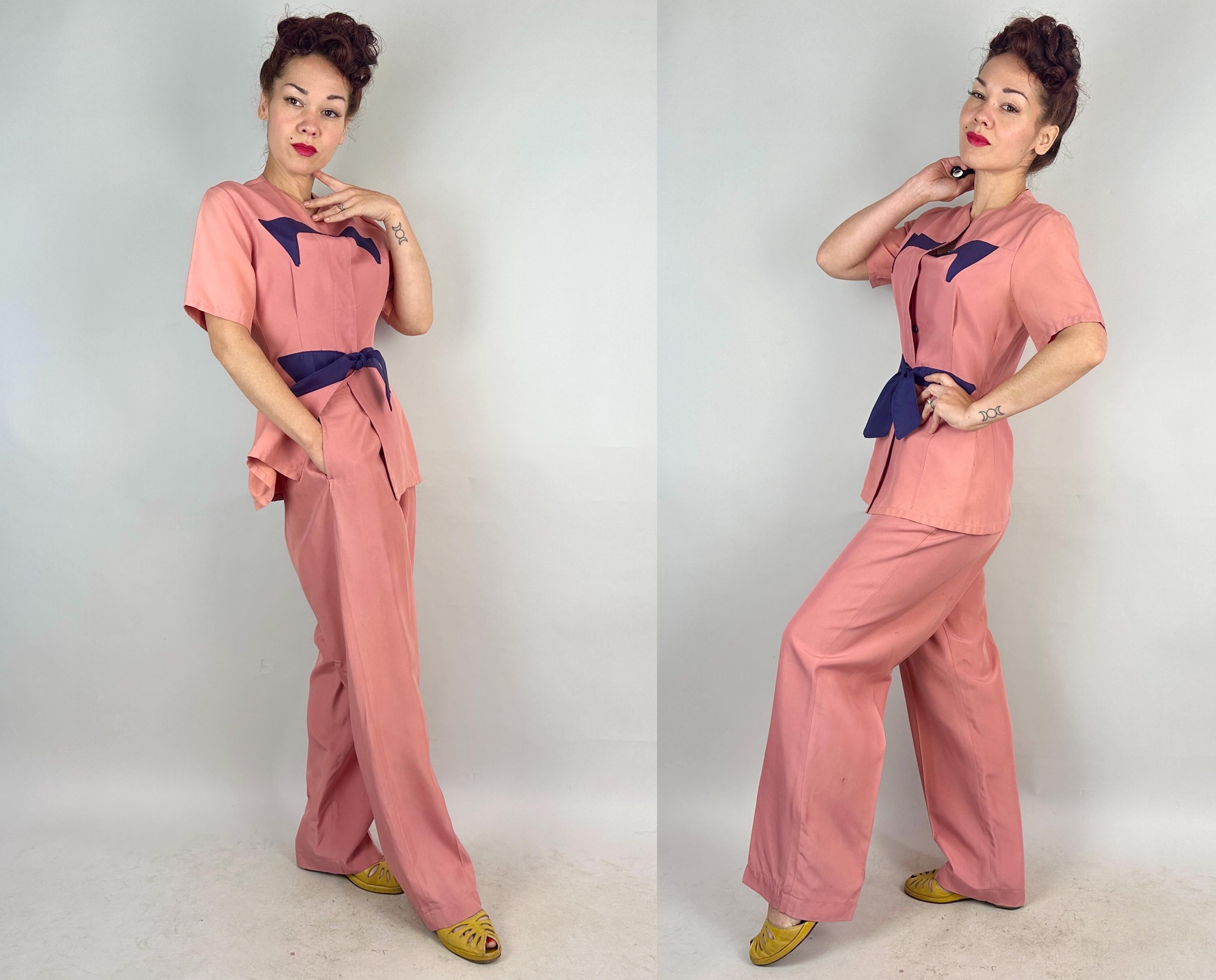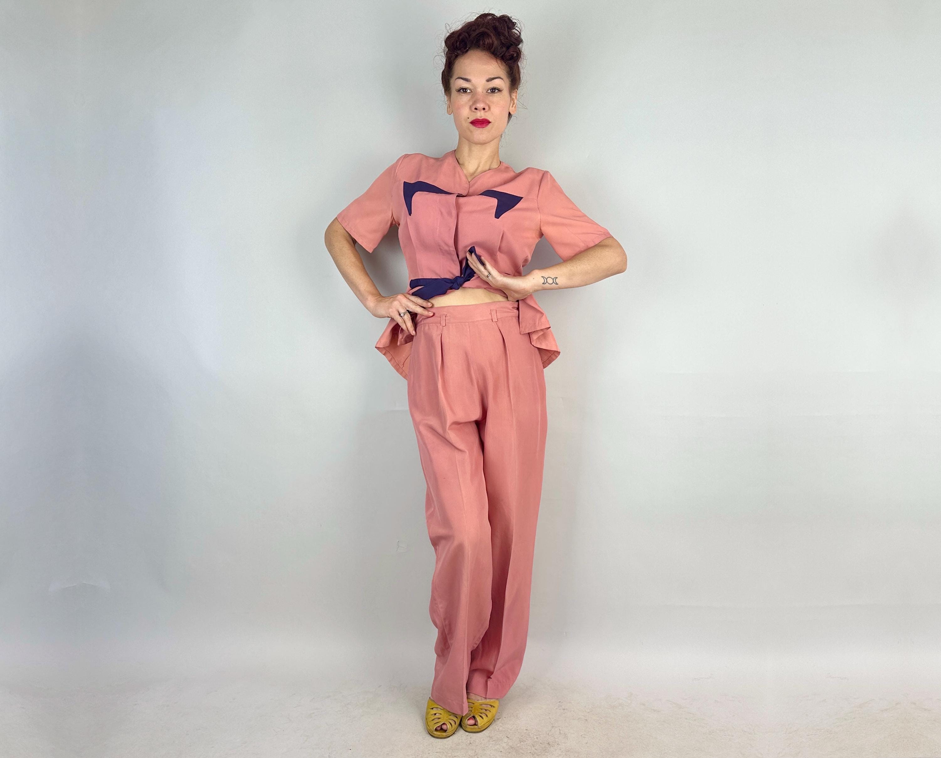 Playful and practical, purple and pink, what's not to love about this 1940s ensemble! Made of a rayon celanese in a sturdy weight, both pieces are a rose shade while a colour block element is brought to the blouse with spearpoint stripe panels in deep eggplant. The blouse fastens with buttons hidden by a placket to give the blocks of purple room to shine while also providing function as the waist cinching ties. Designed to be worn untucked, a feminine shape is achieved with darts and curved seams. The high waisted trousers feature dropped belt loops, mirrored knife pleats at the waist, and right hand pocket. Metal zipper and button on the side. This set is in great vintage condition, a little very subtle marking but no holes or odors to note.