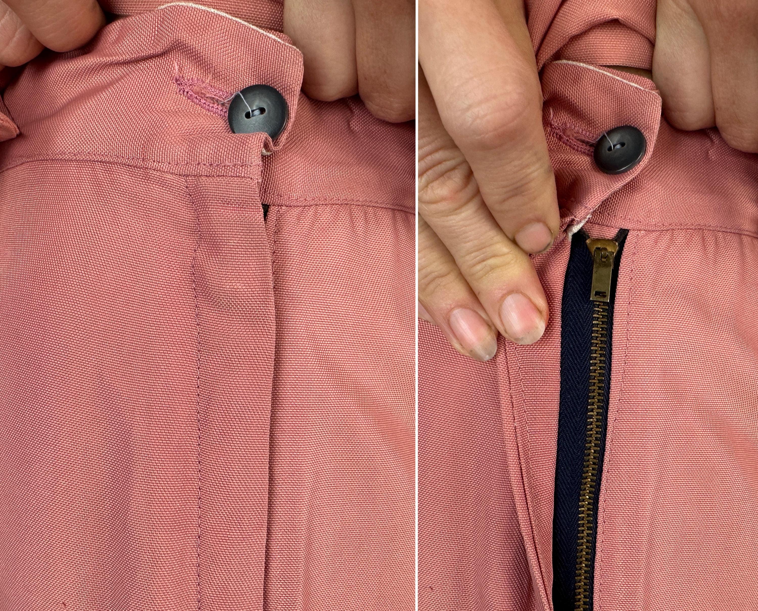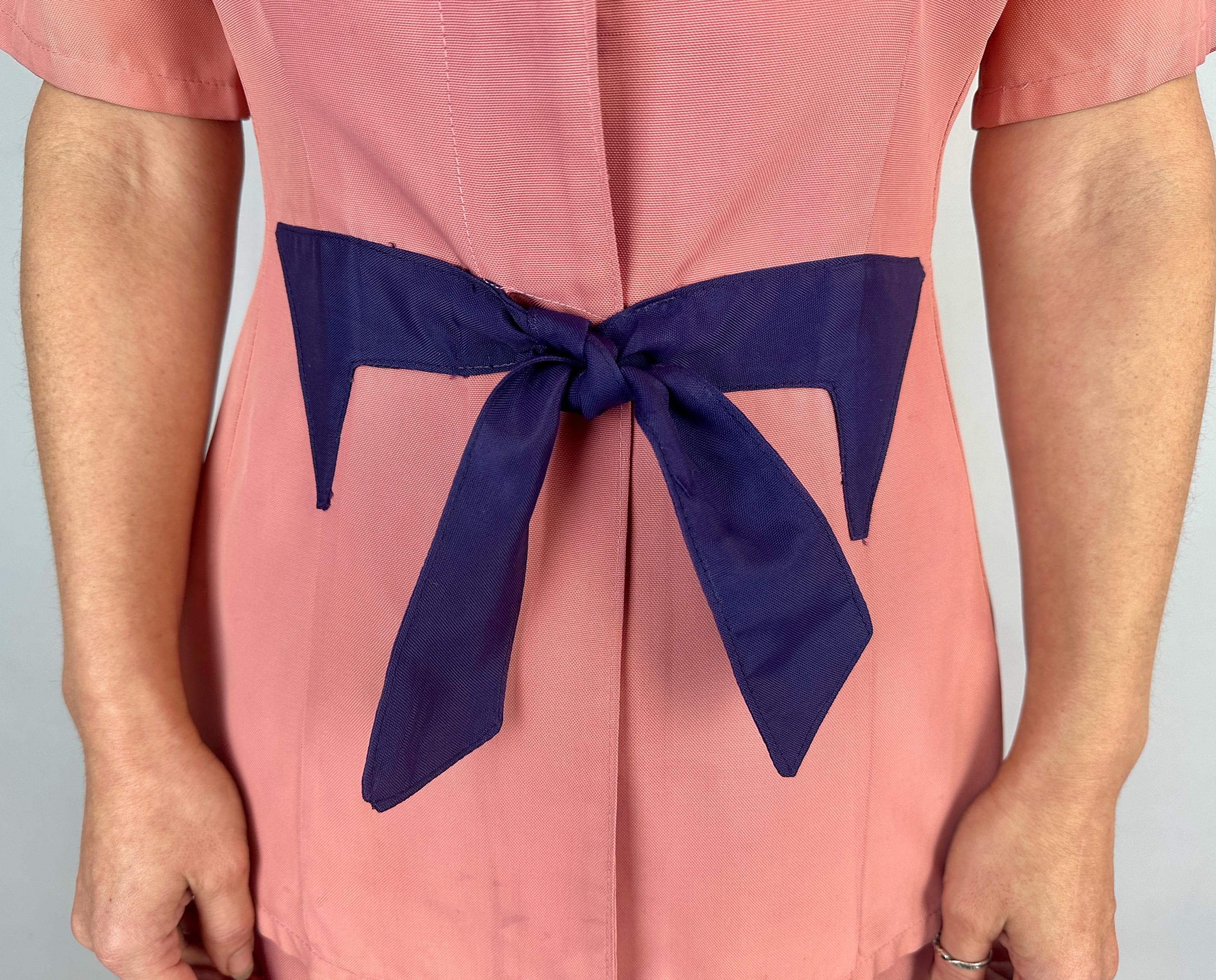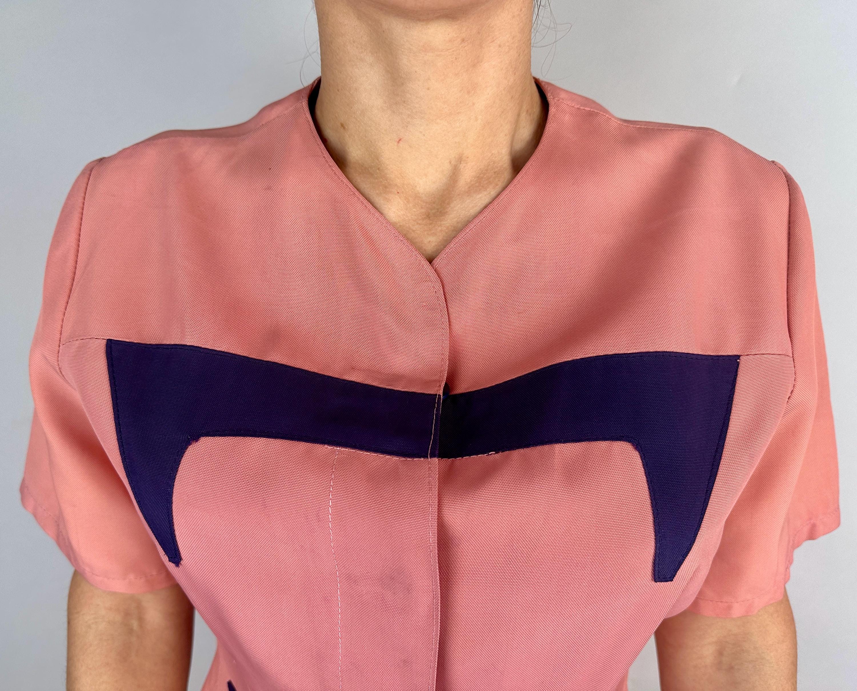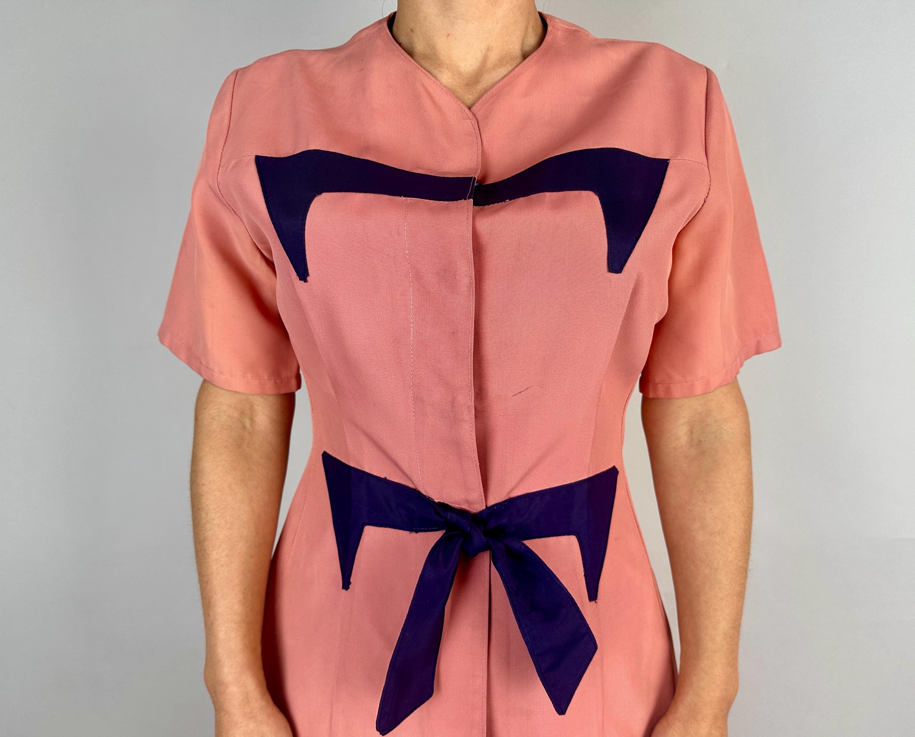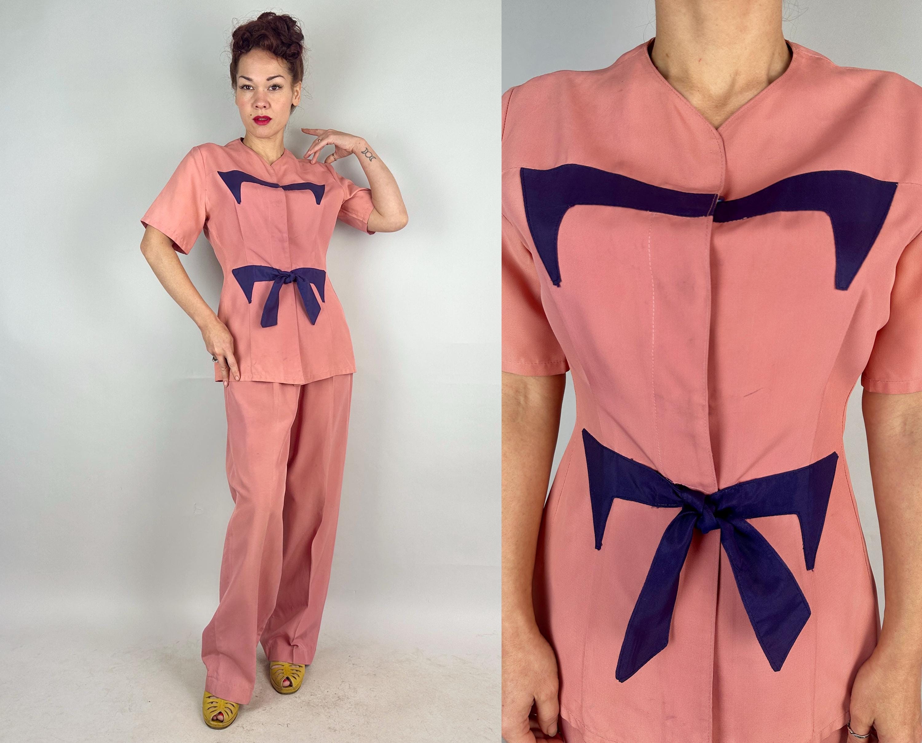 Playful and practical, purple and pink, what's not to love about this 1940s ensemble! Made of a rayon celanese in a sturdy weight, both pieces are a rose shade while a colour block element is brought to the blouse with spearpoint stripe panels in deep eggplant. The blouse fastens with buttons hidden by a placket to give the blocks of purple room to shine while also providing function as the waist cinching ties. Designed to be worn untucked, a feminine shape is achieved with darts and curved seams. The high waisted trousers feature dropped belt loops, mirrored knife pleats at the waist, and right hand pocket. Metal zipper and button on the side. This set is in great vintage condition, a little very subtle marking but no holes or odors to note.