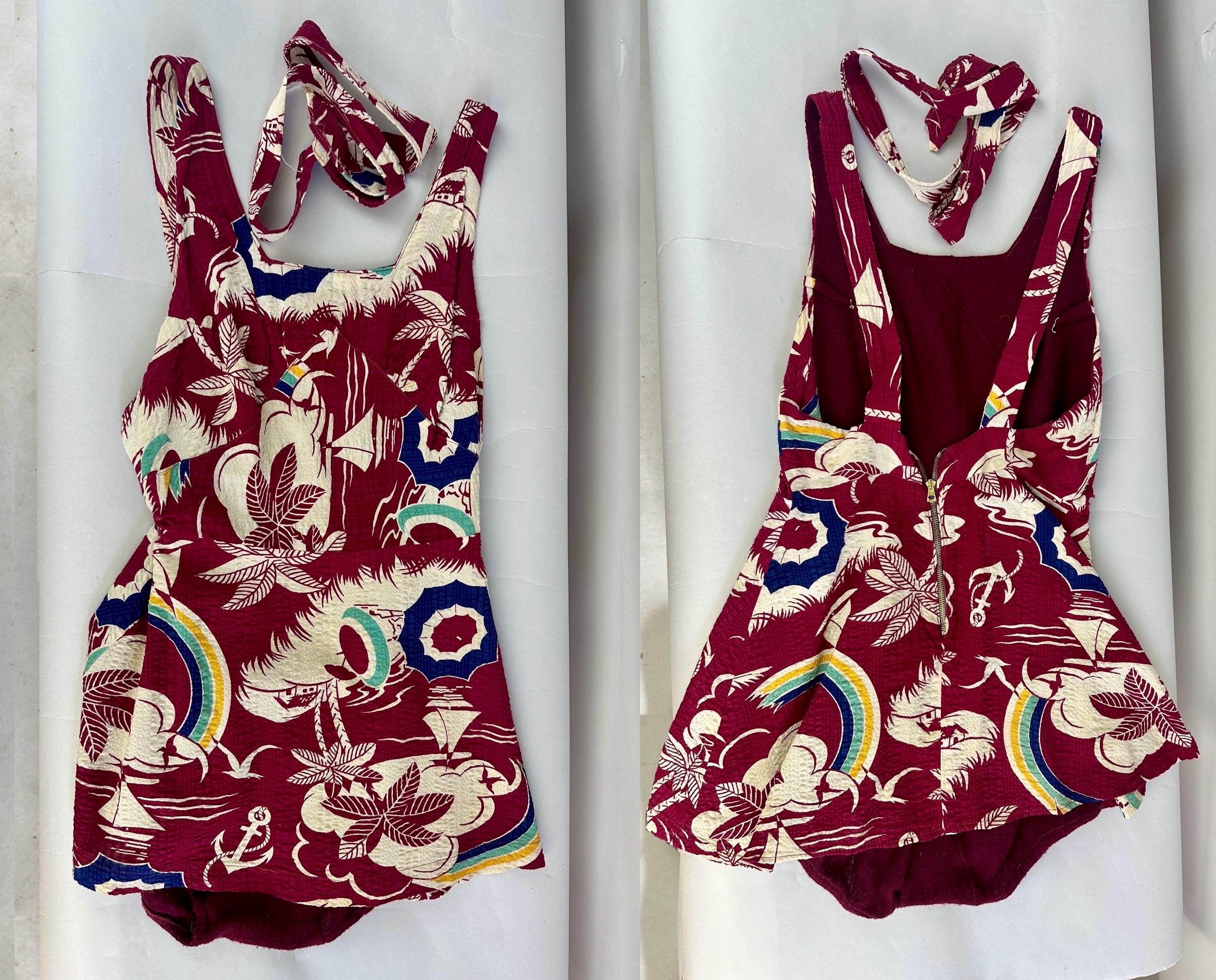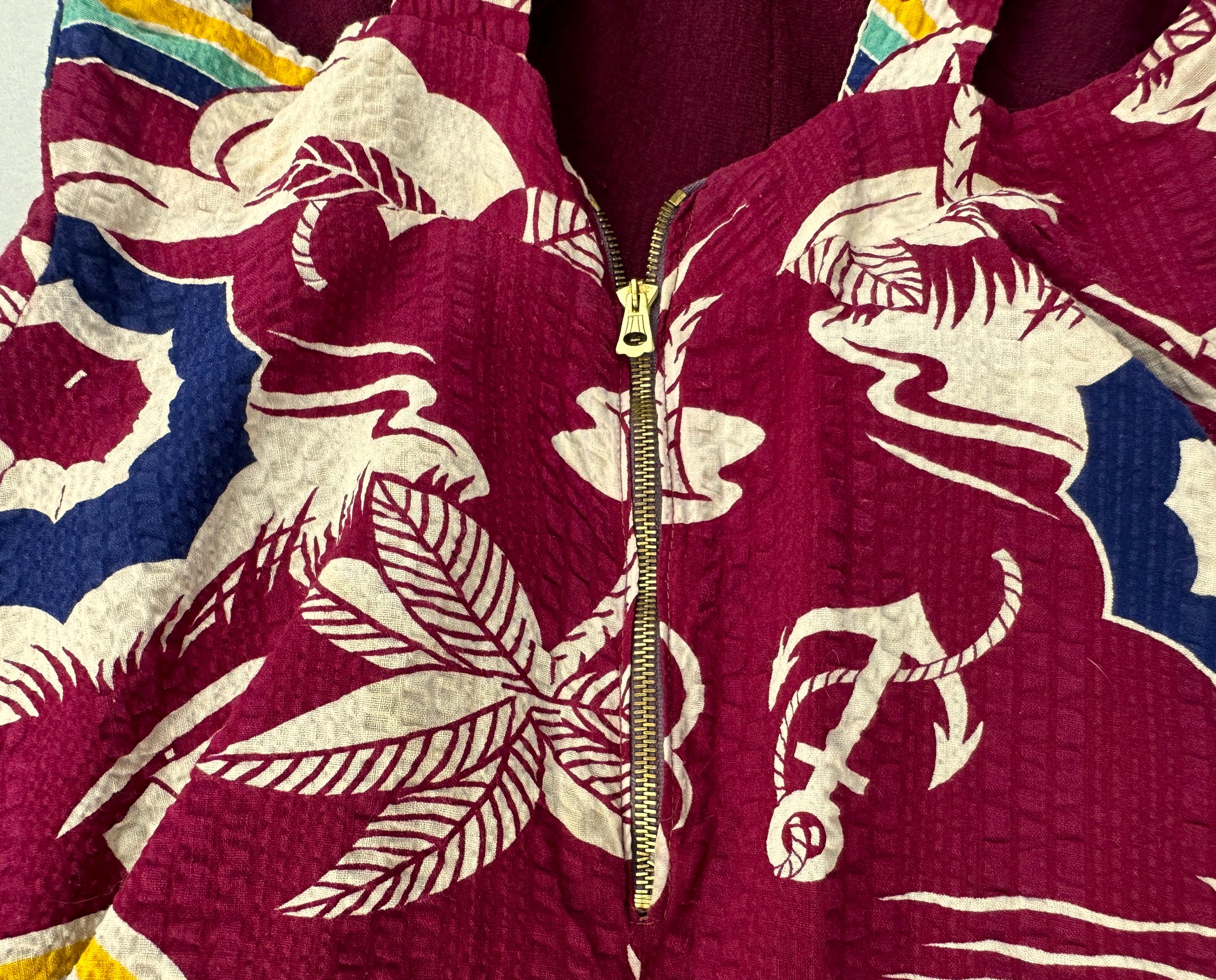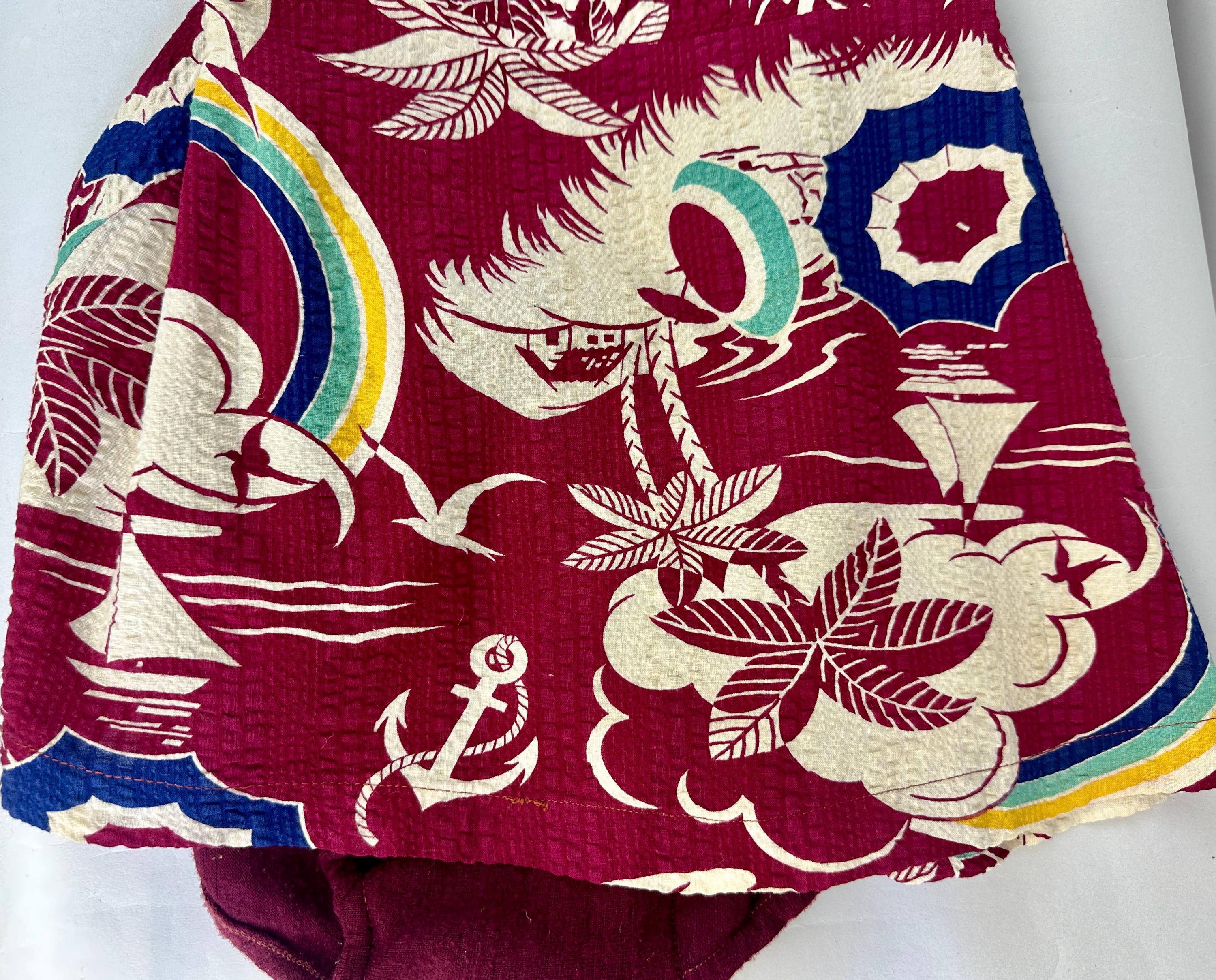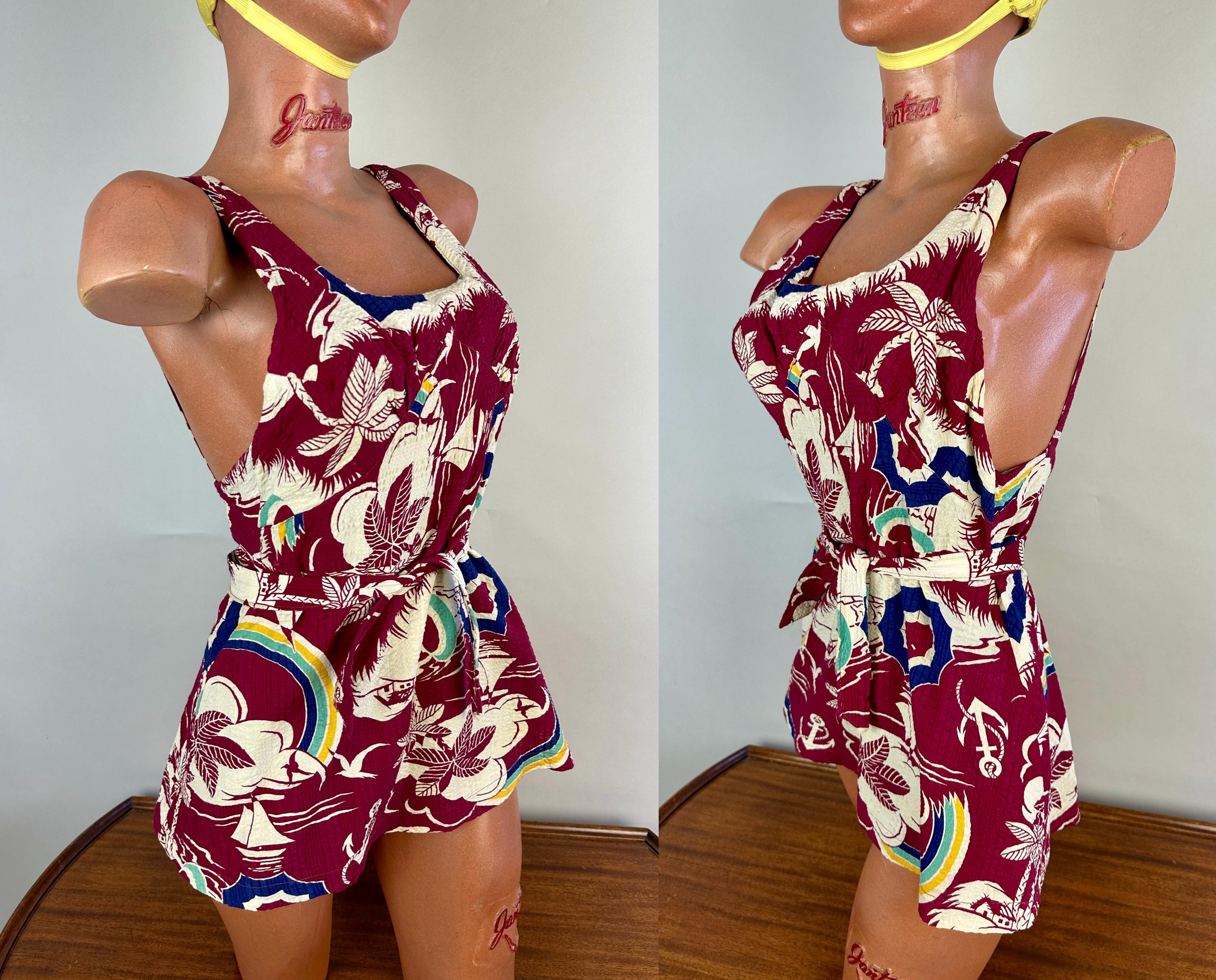 Sail away to a tropical island and spend your days sunning in this 1930s romper! The outer dress of seersucker cotton has a dreamy novelty print of palm trees, sail boats, umbrellas, anchors, and gulls flying towards rainbows. Mainly maroon, the print is played up in white, navy, turquoise, and canary yellow. A wool knit lining is fitted like a traditional one piece swimsuit and matches the marroon cotton. Styled with a square neckline, diamond bustline, flared skirt, and low back, a self belt in a sash style cinches the waist. Early brass fan-pull zipper up the back. This playsuit is in great vintage condition, a couple tiny holes in the knit liner but no outer holes, stains, or odors to note.