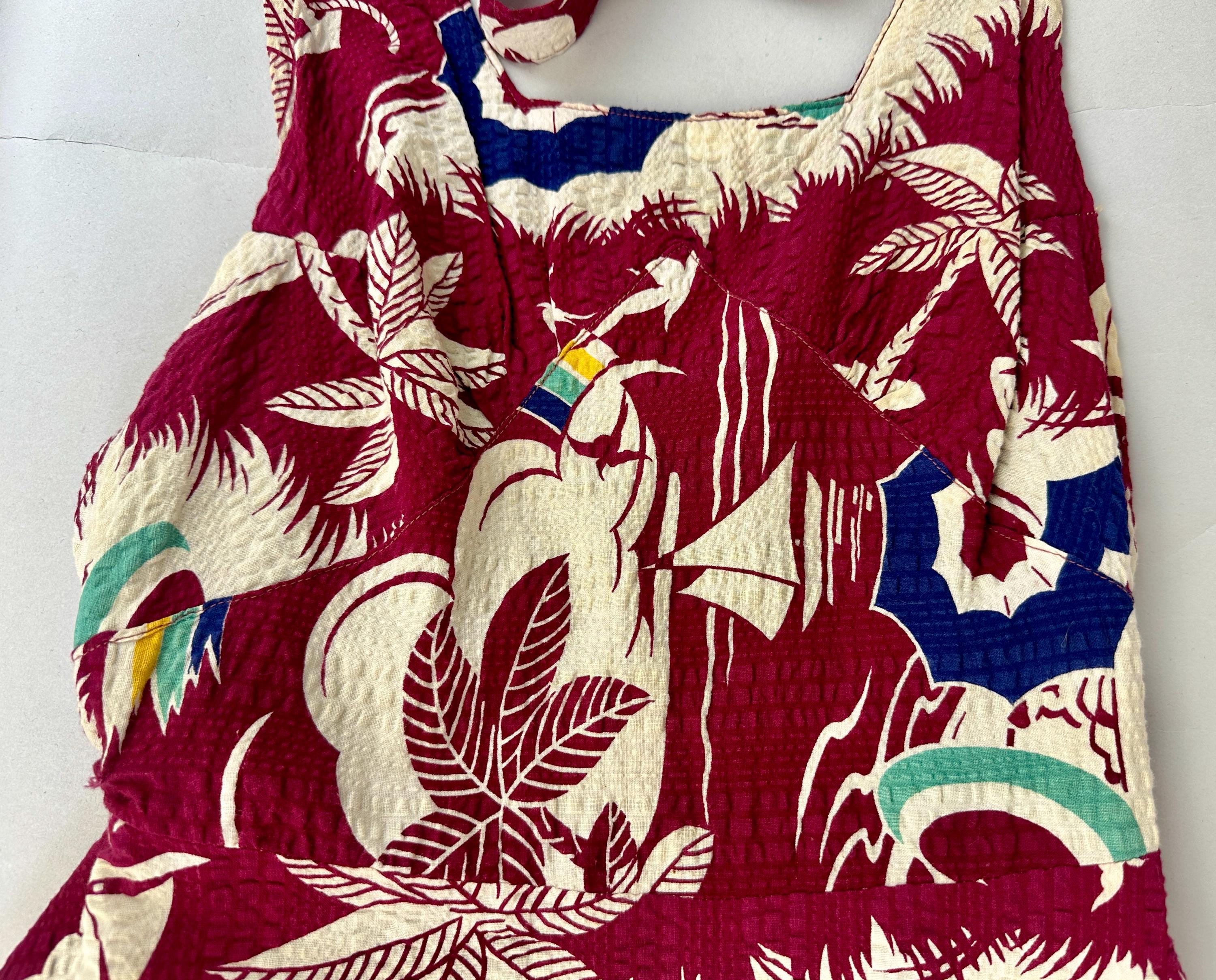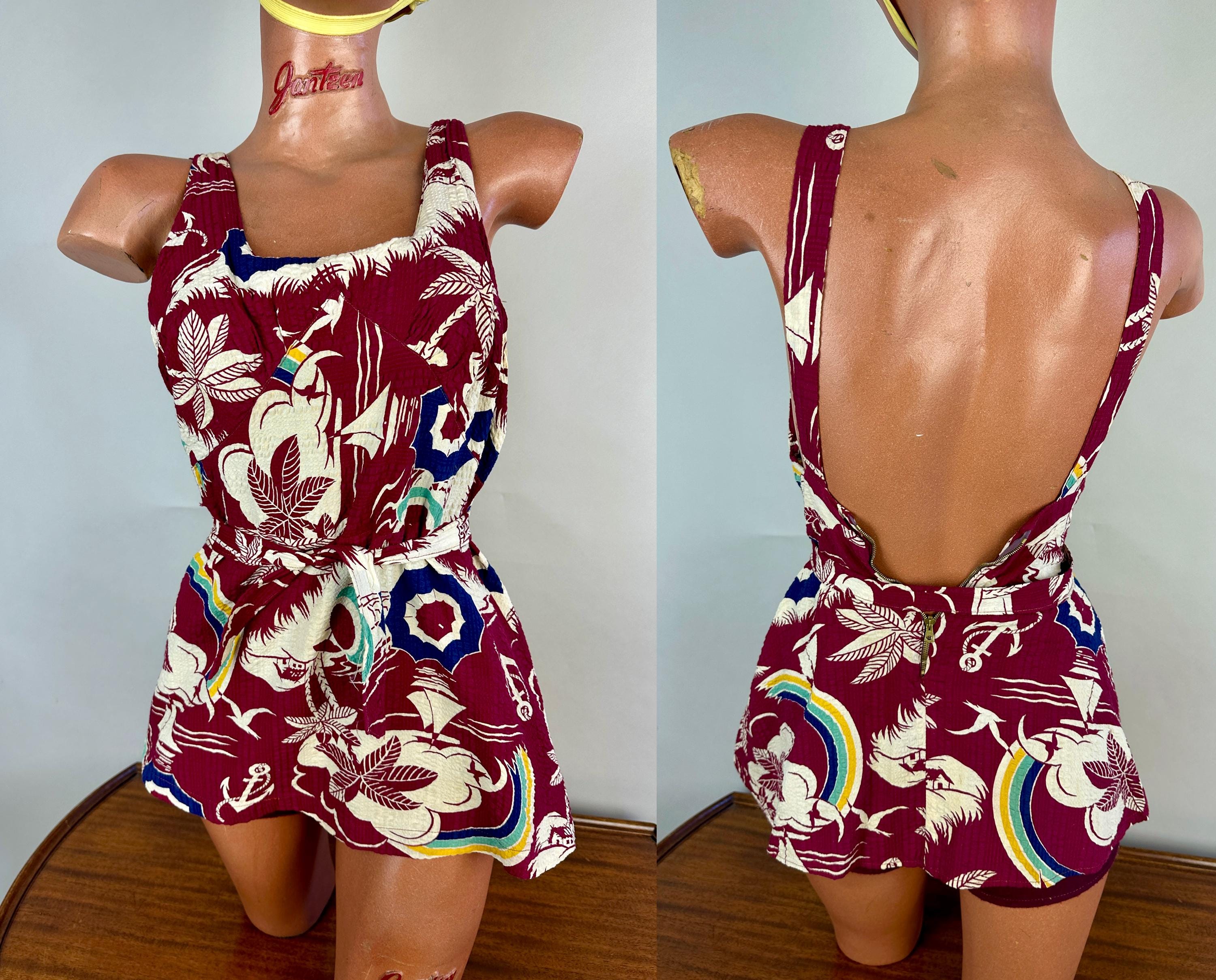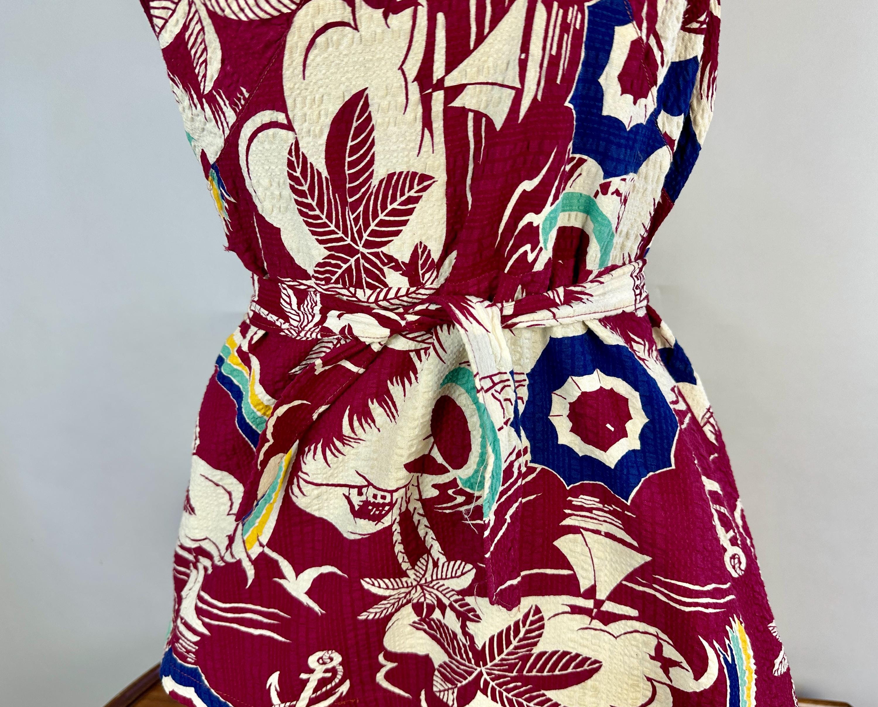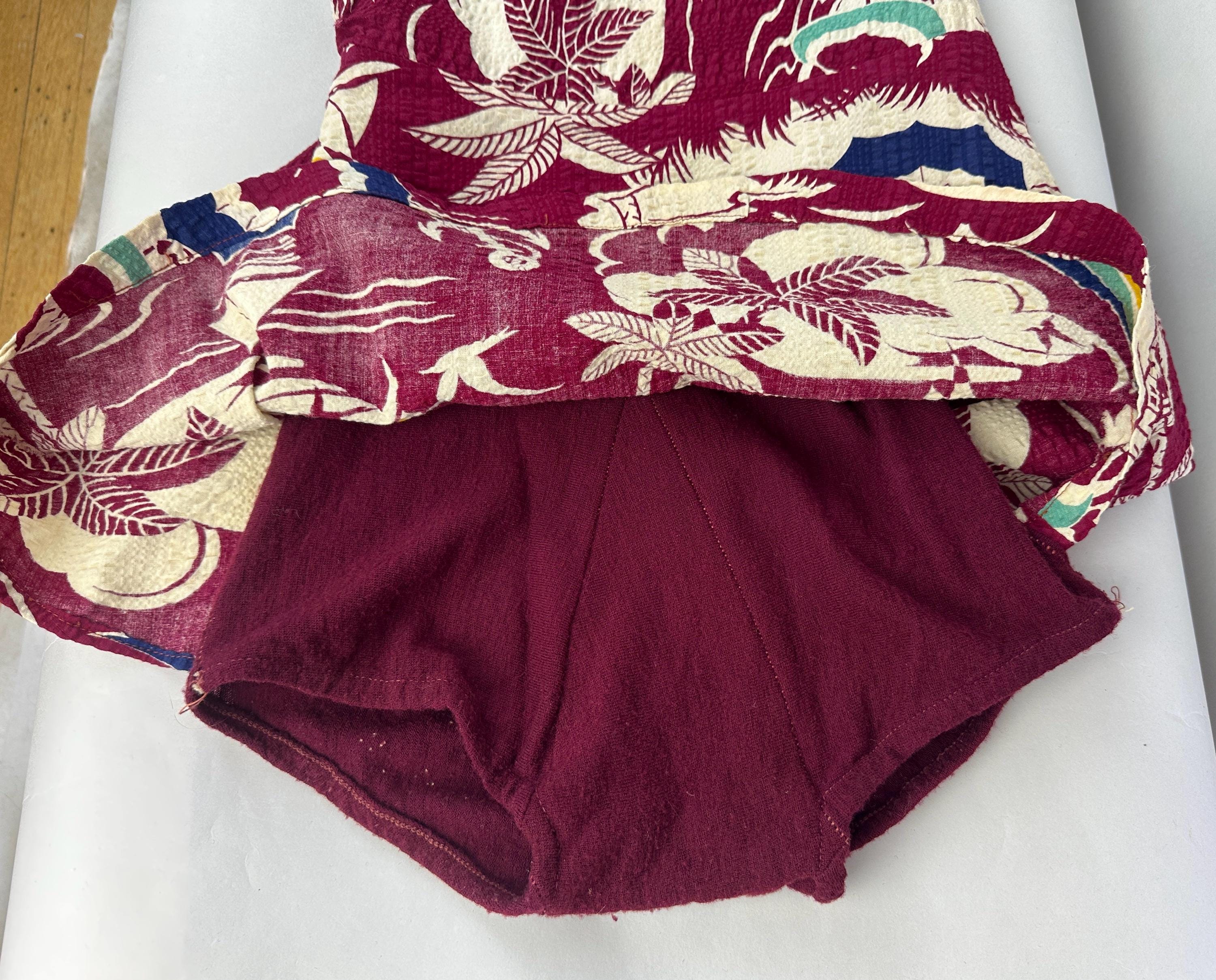 Sail away to a tropical island and spend your days sunning in this 1930s romper! The outer dress of seersucker cotton has a dreamy novelty print of palm trees, sail boats, umbrellas, anchors, and gulls flying towards rainbows. Mainly maroon, the print is played up in white, navy, turquoise, and canary yellow. A wool knit lining is fitted like a traditional one piece swimsuit and matches the marroon cotton. Styled with a square neckline, diamond bustline, flared skirt, and low back, a self belt in a sash style cinches the waist. Early brass fan-pull zipper up the back. This playsuit is in great vintage condition, a couple tiny holes in the knit liner but no outer holes, stains, or odors to note.
