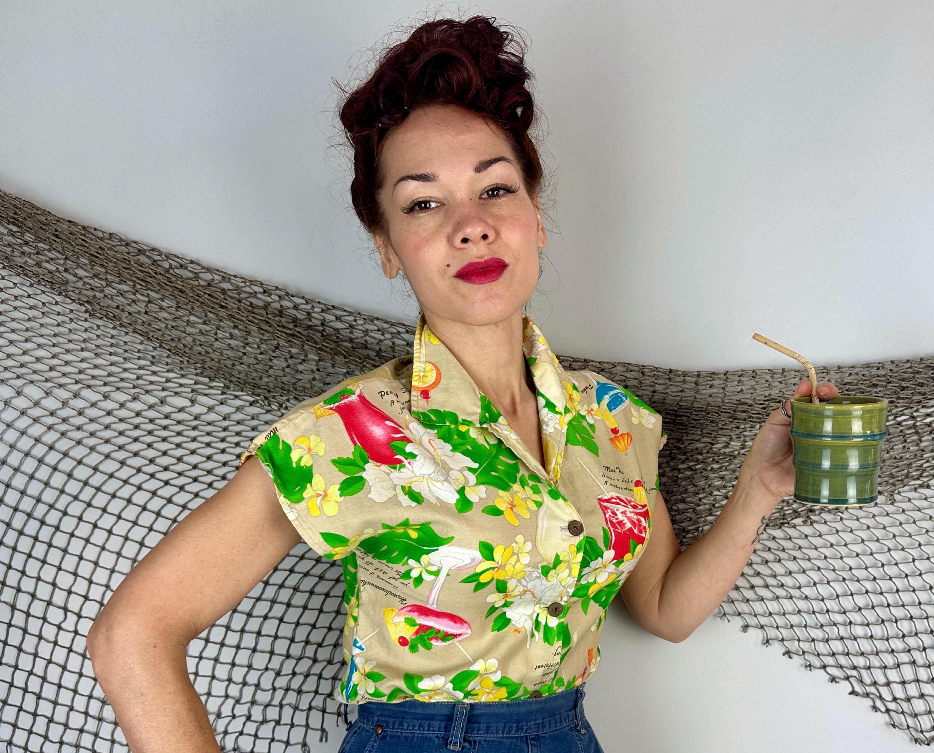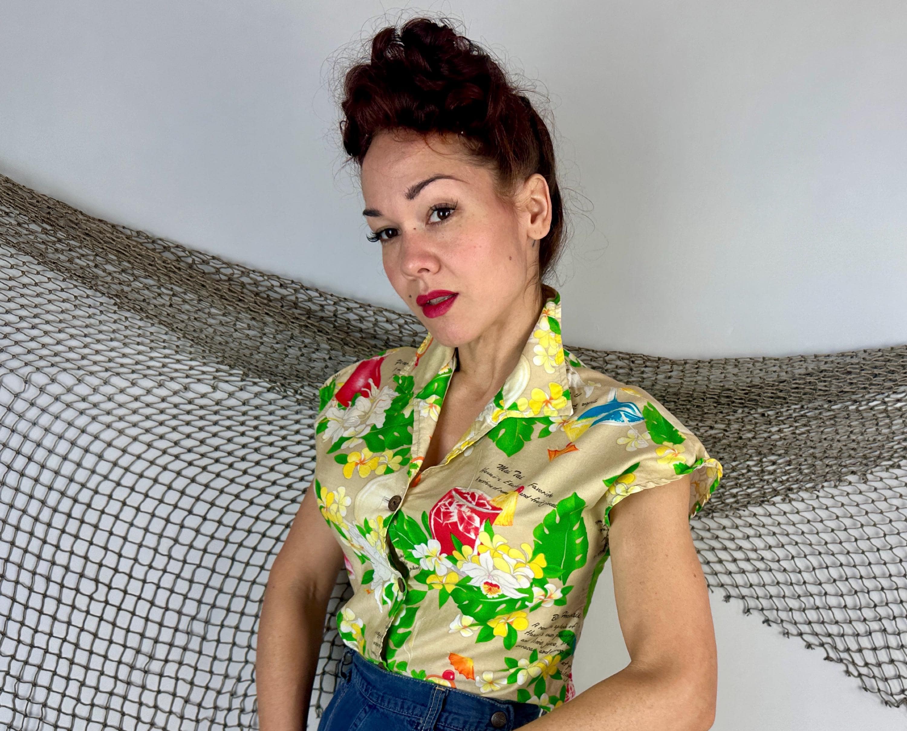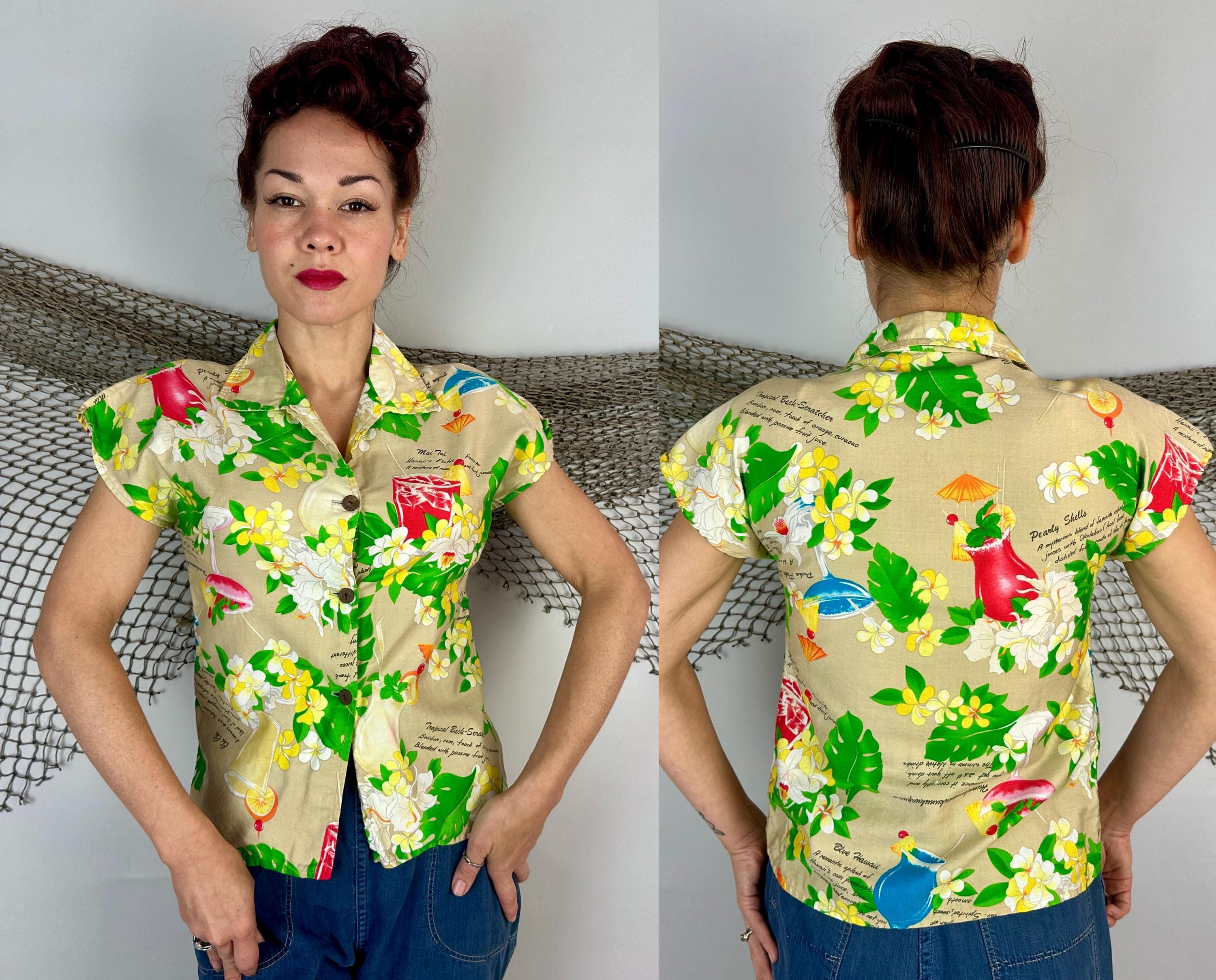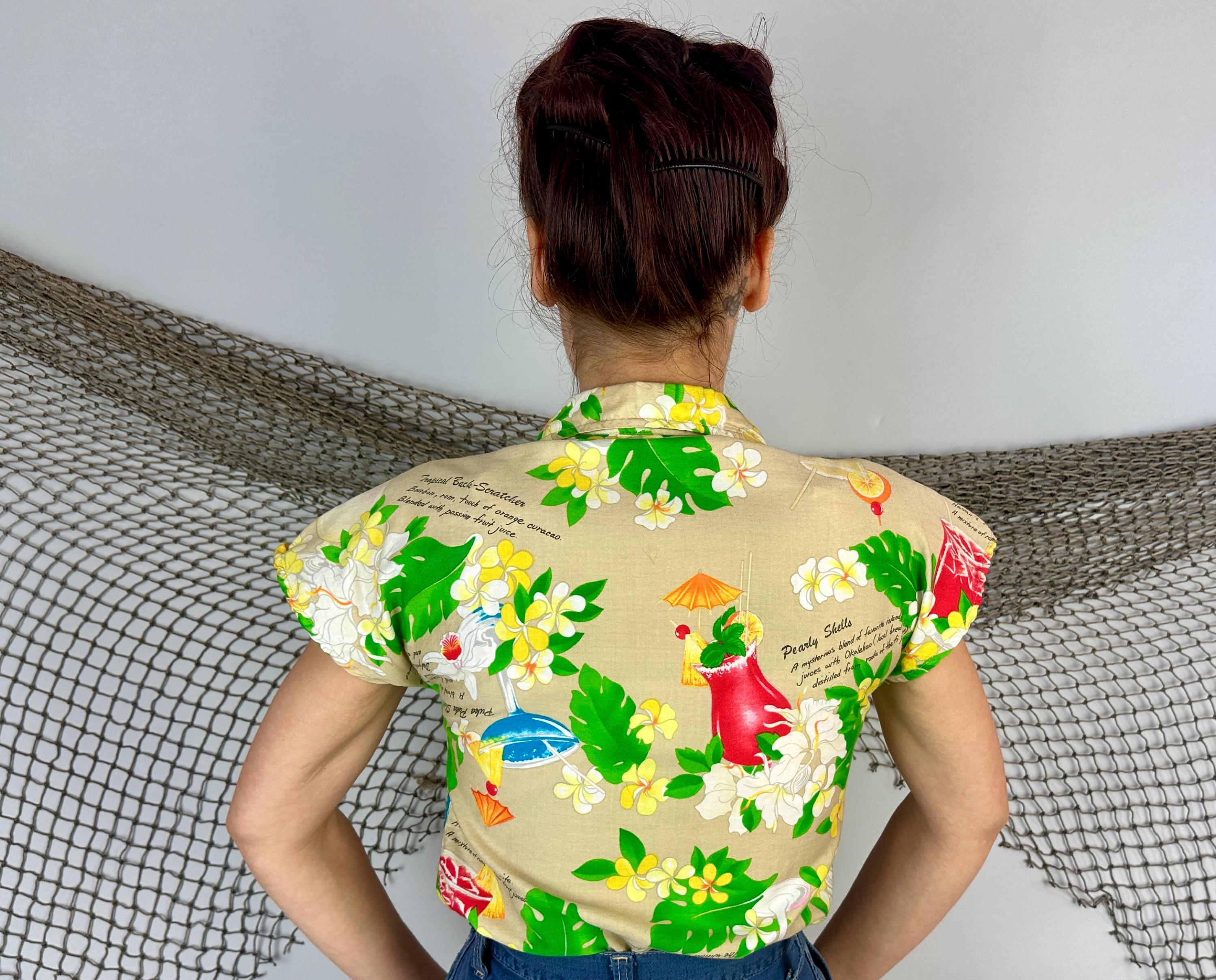 Mix it up with this 1950s top and liven any party with these cocktail recipes on hand! Soft cotton of white sand beige features famous tropical tiki drinks and their ingredients along with plumeria blossoms, orchids, and monstera leaves adding bright pops of grassy green, sunny yellow, scarlet, and azure blue. Styled with cap sleeves and coconut shell buttons, this piece will always have your back for those tiki bar adventures. Labeled "Hawaiian Palm". This shirt is in great vintage condition, with no holes, stains, or odors to note.