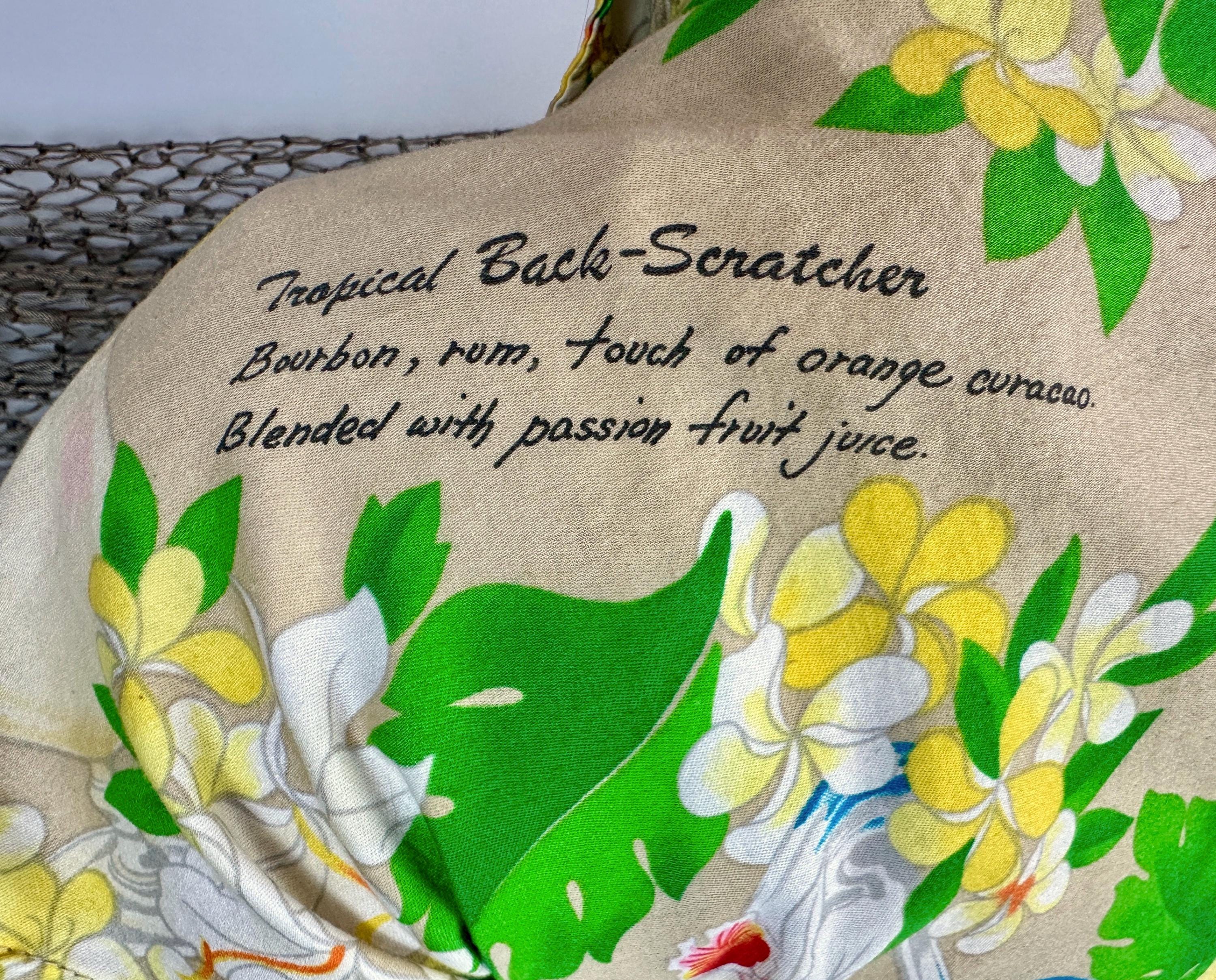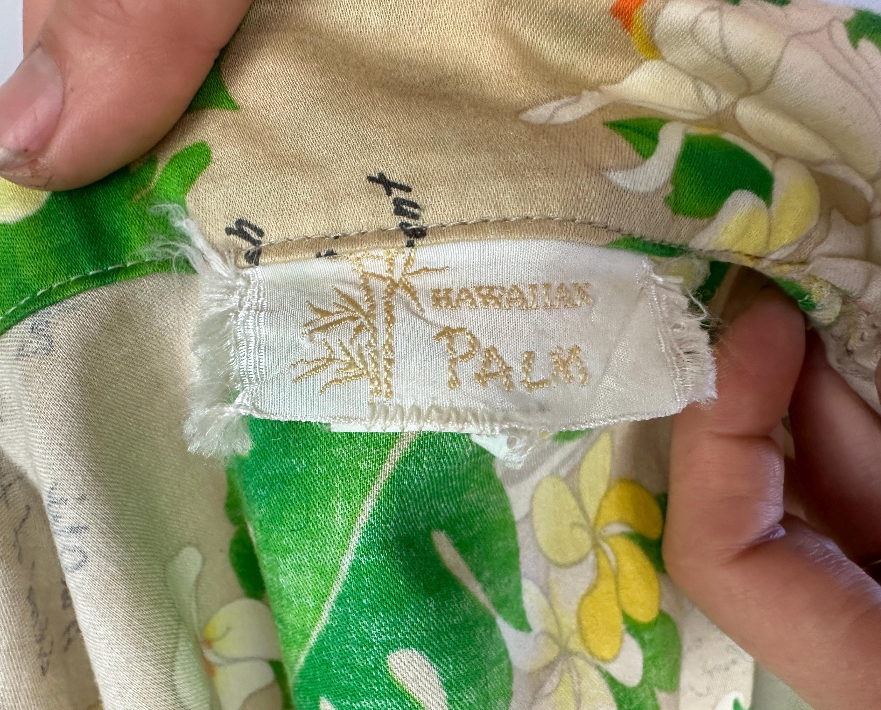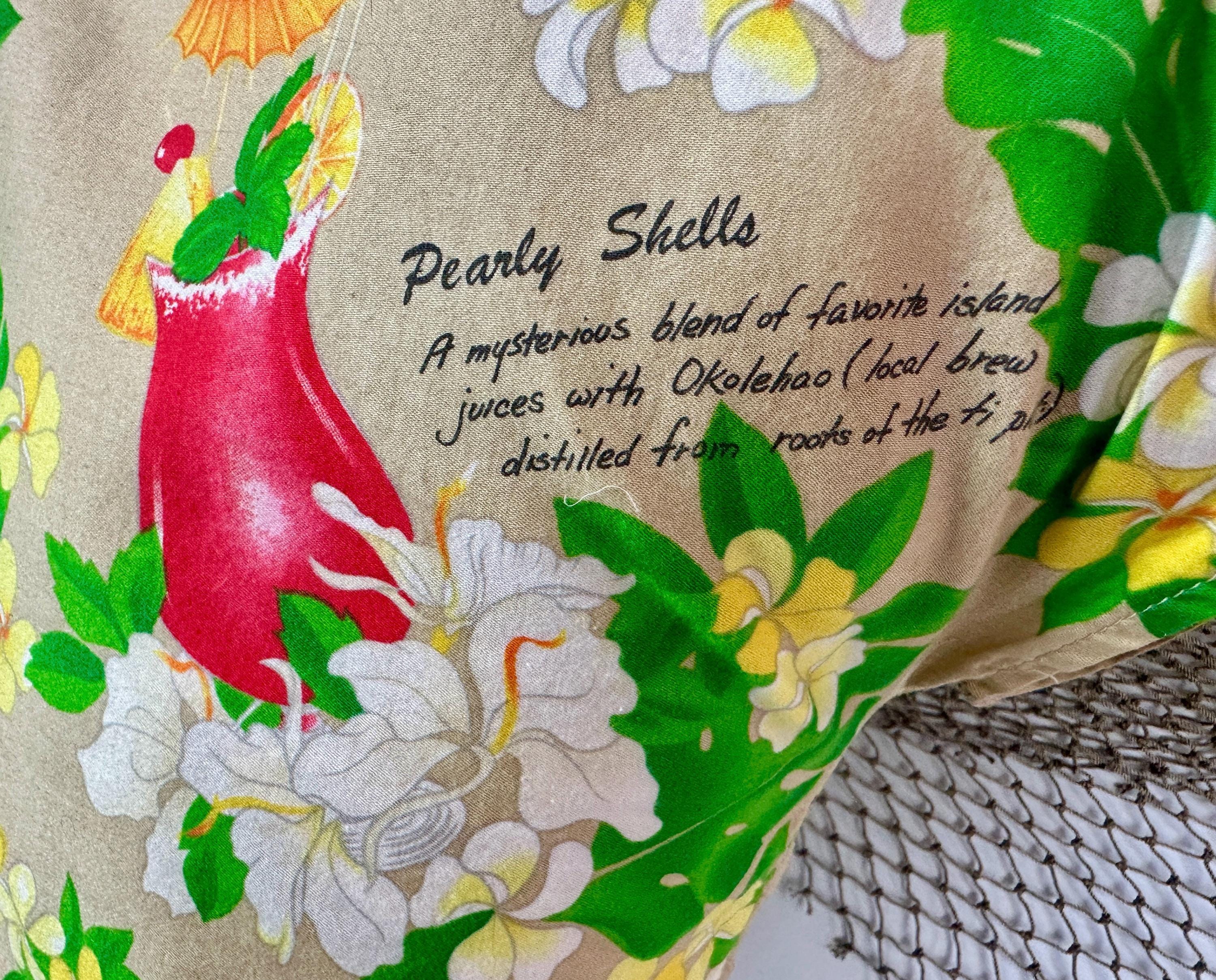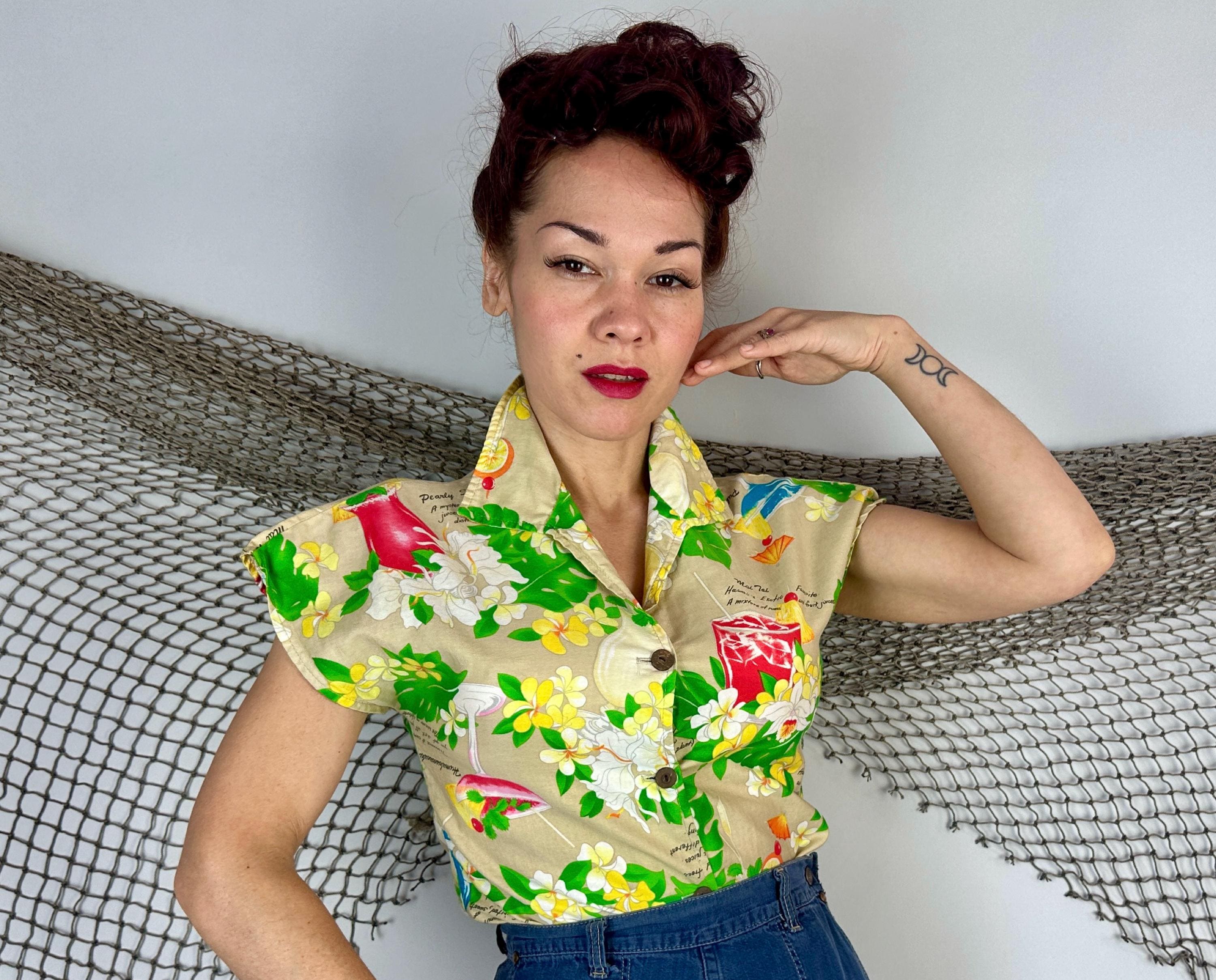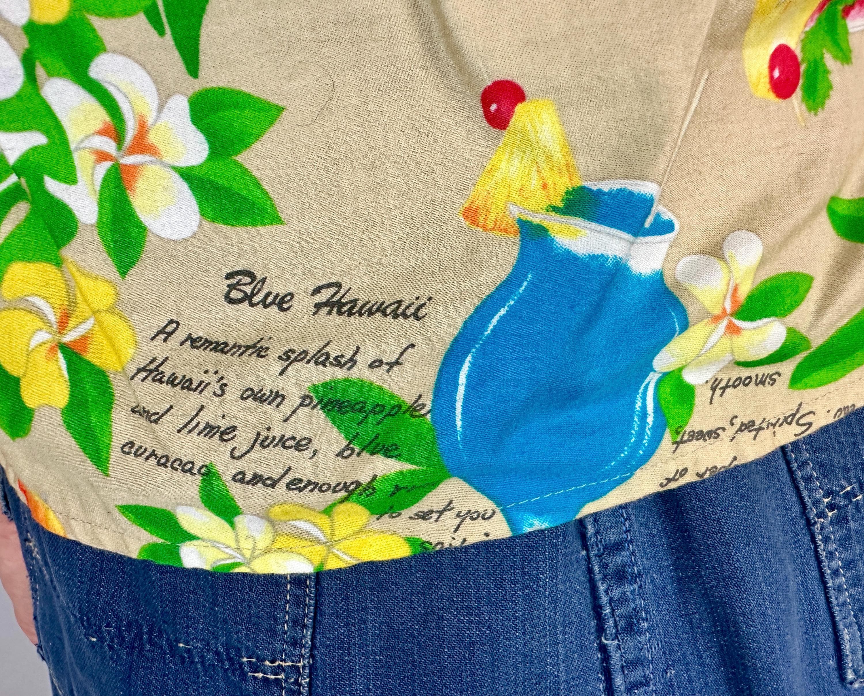 Mix it up with this 1950s top and liven any party with these cocktail recipes on hand! Soft cotton of white sand beige features famous tropical tiki drinks and their ingredients along with plumeria blossoms, orchids, and monstera leaves adding bright pops of grassy green, sunny yellow, scarlet, and azure blue. Styled with cap sleeves and coconut shell buttons, this piece will always have your back for those tiki bar adventures. Labeled "Hawaiian Palm". This shirt is in great vintage condition, with no holes, stains, or odors to note.