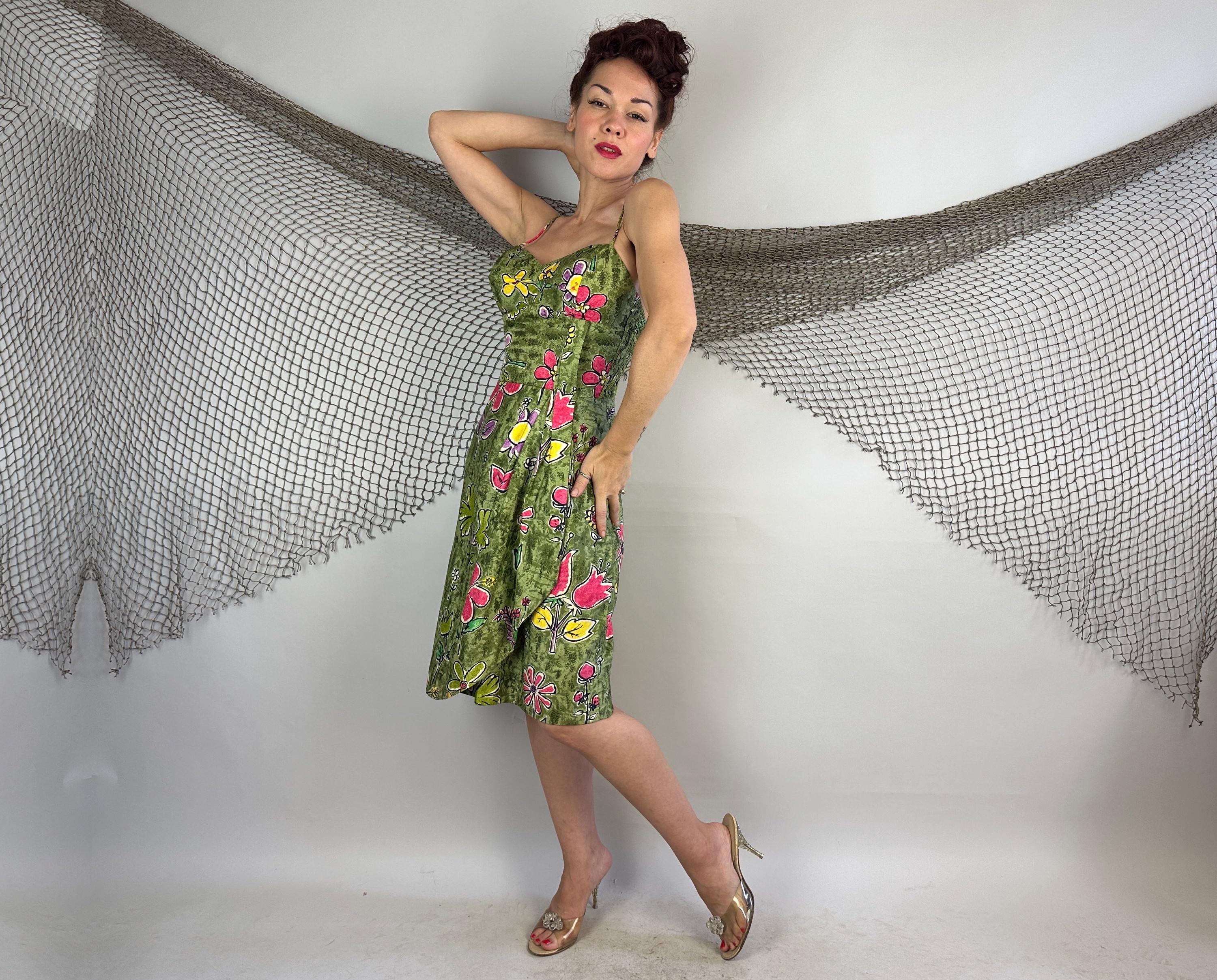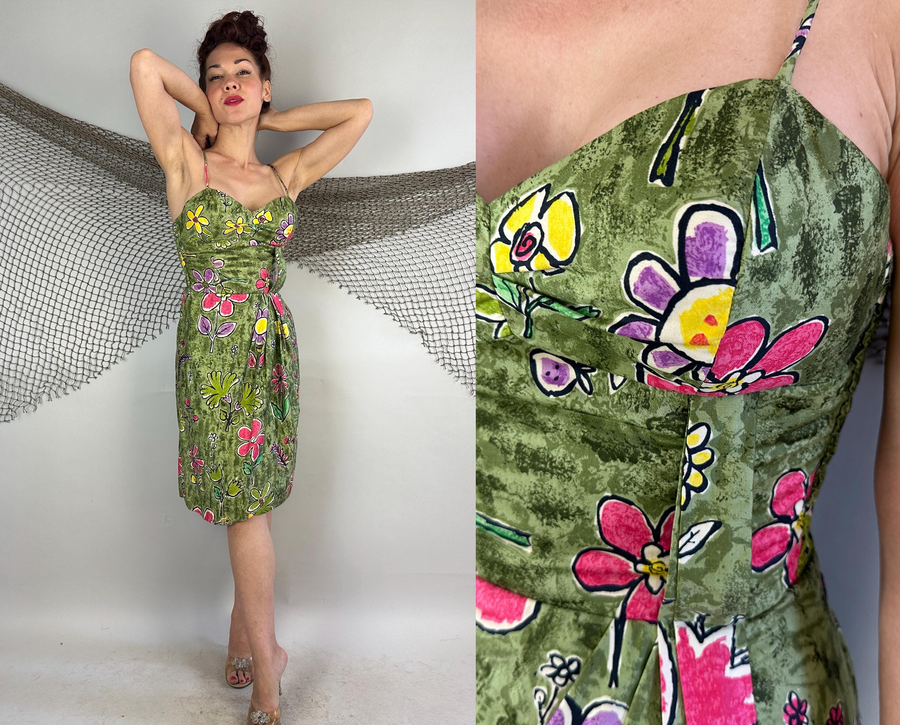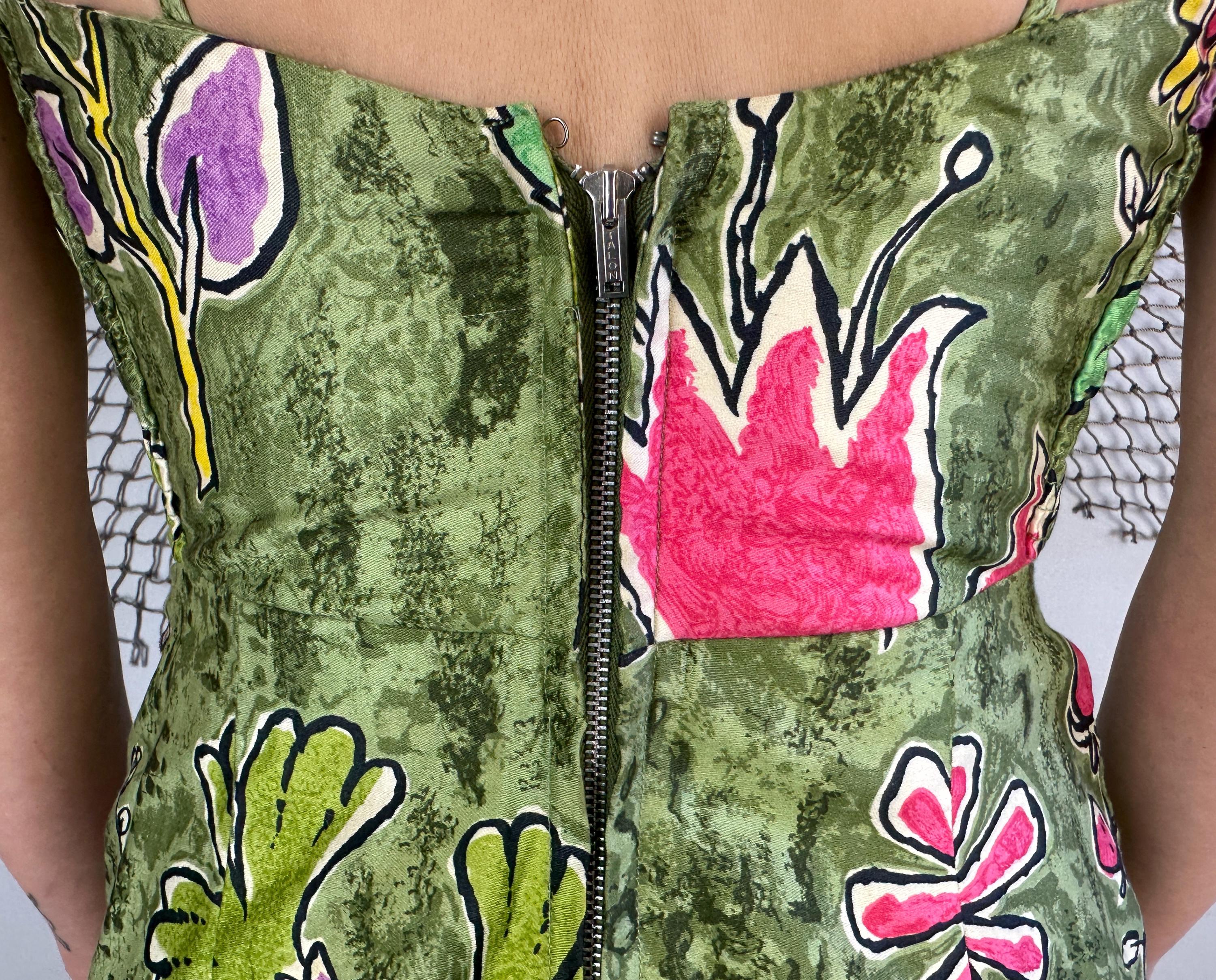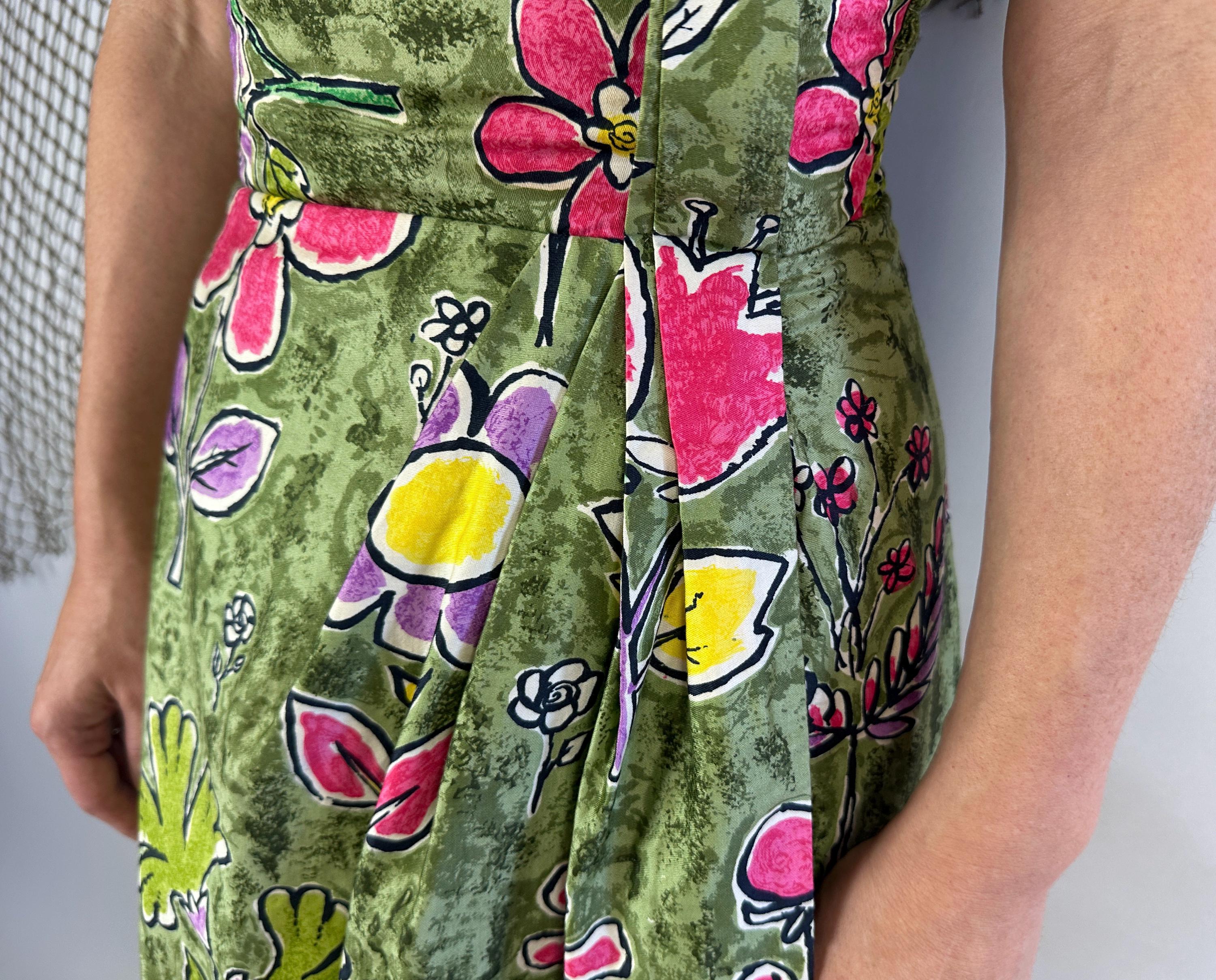 Your presence will pop at the Luau when you wear this fun 1950s sun dress! The sarong style dress is cotton in a mottled moss green with a bold child-like pop-art floral print in hot pink, sunny yellow, and grape purple outlined in black. The bodice is lightly boned and the sweetheart bust is shaped with strategic seams and central pleating. Panels of shirrng on each side give some flexibilty and the back is cut with a subtle dip where a metal "Talon" zipper fastens below. The skirt is a faux wrap with pleating accents that extend over the midriff as a strip on one side. Labeled "Made in Honolulu". This dress is in great vintage condition, with no holes, stains, or odors to note.