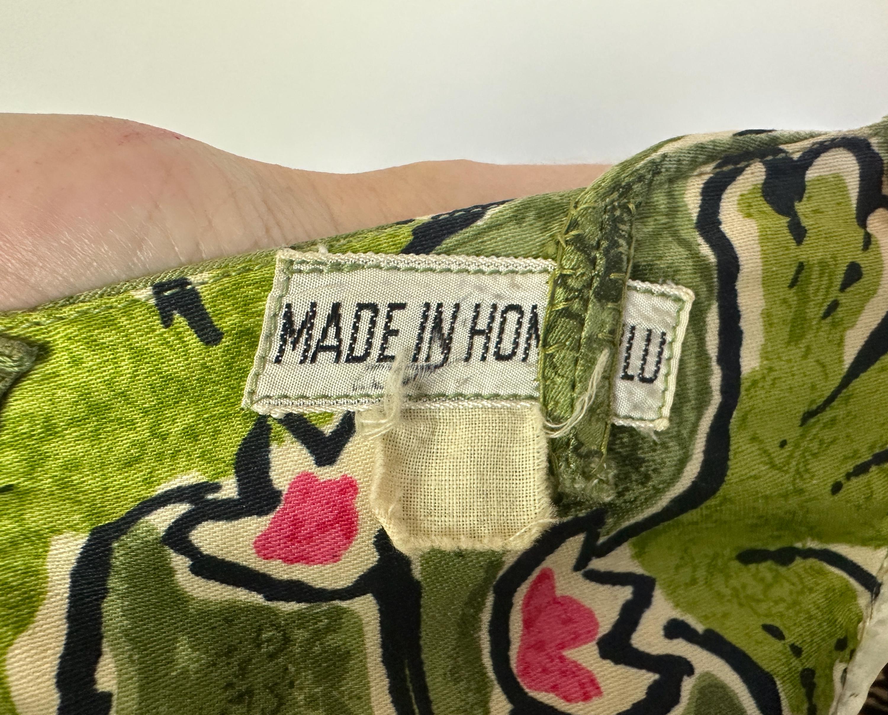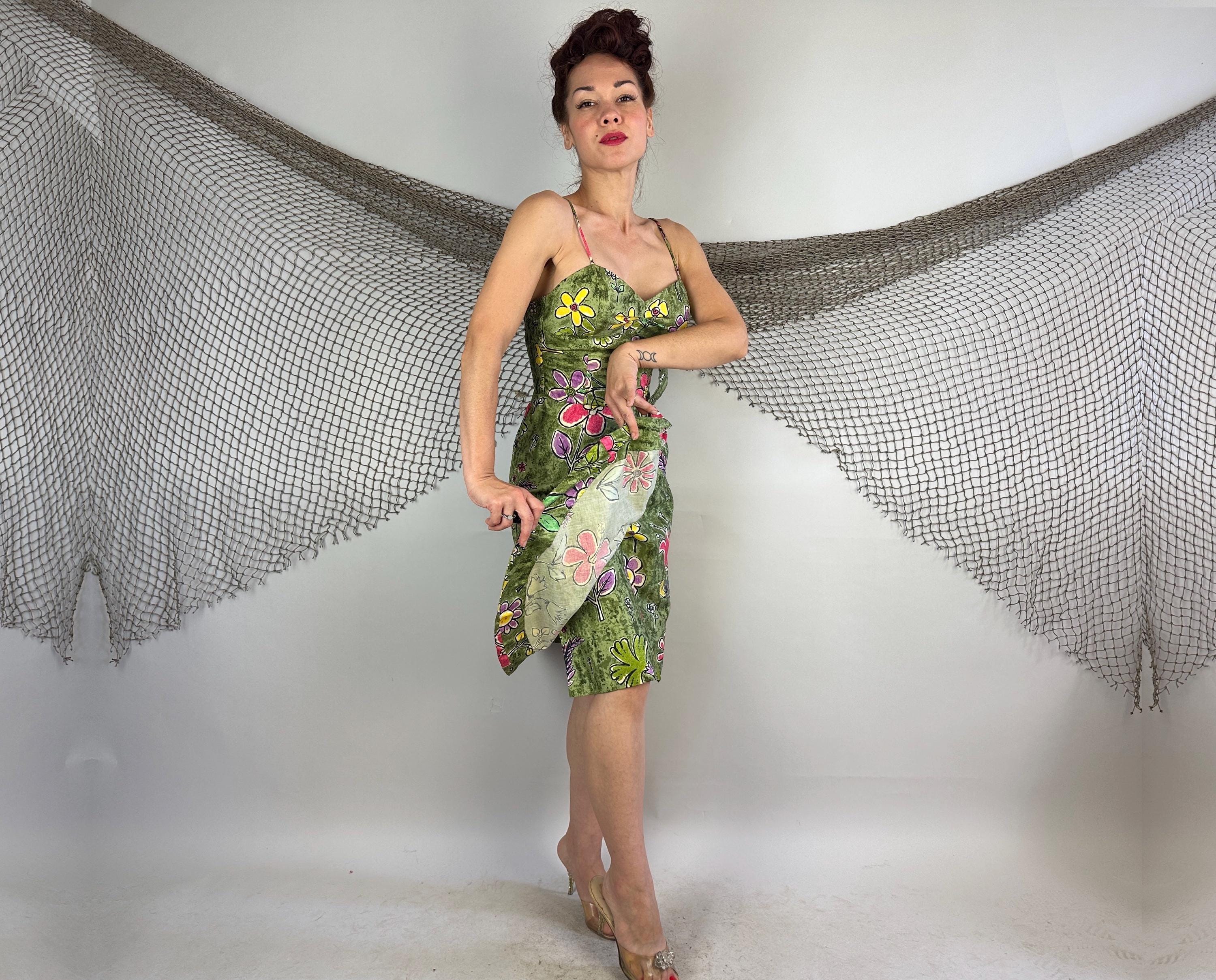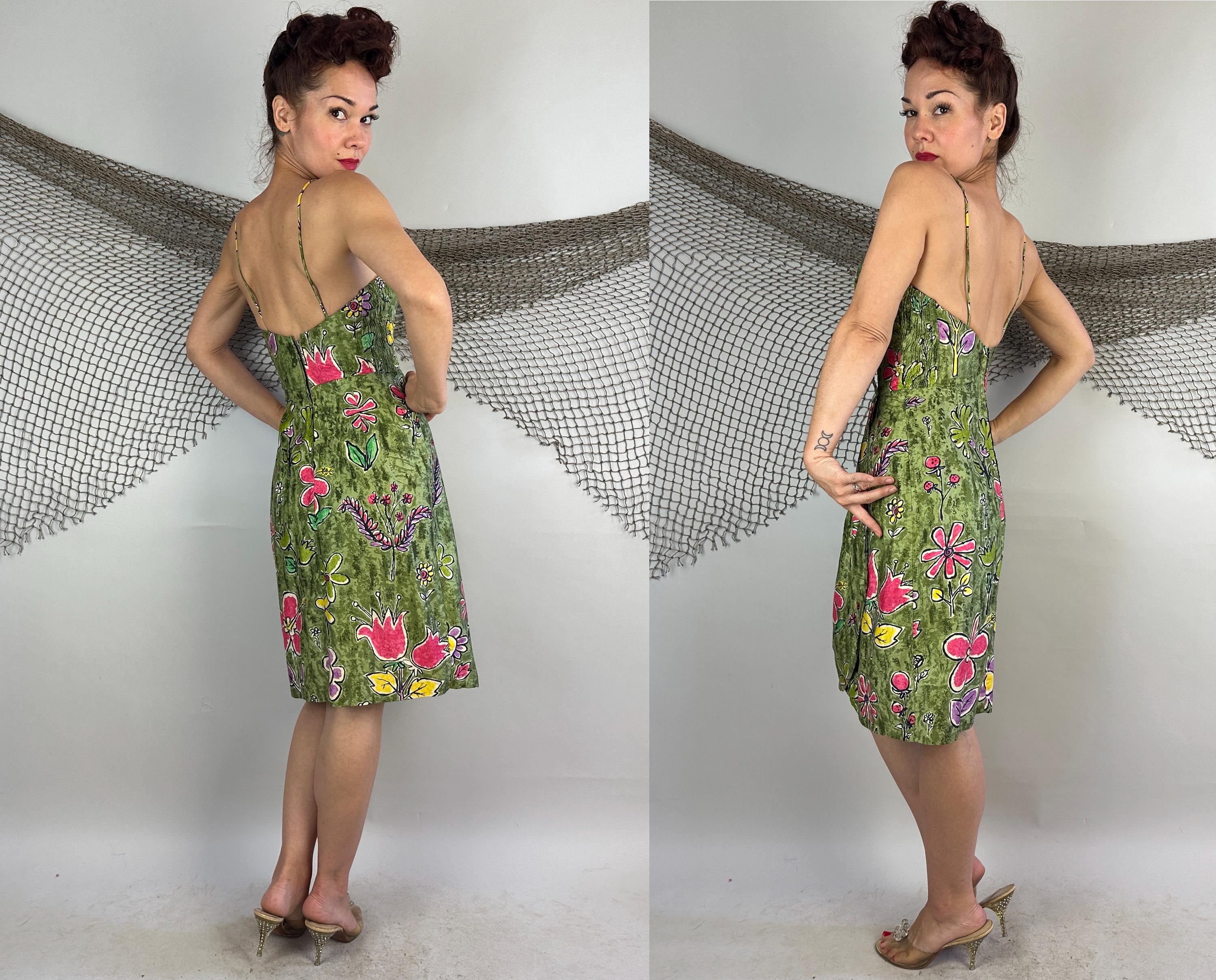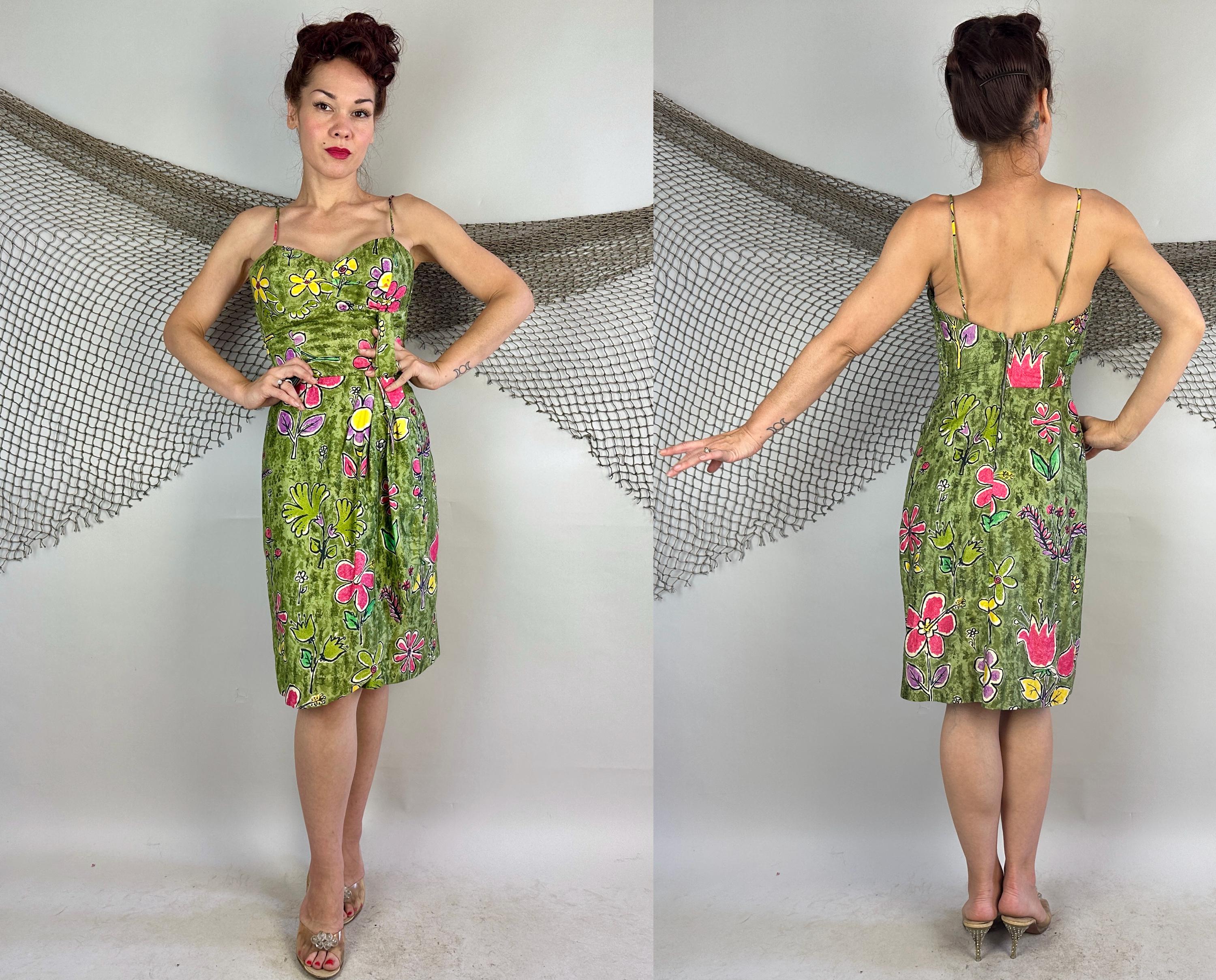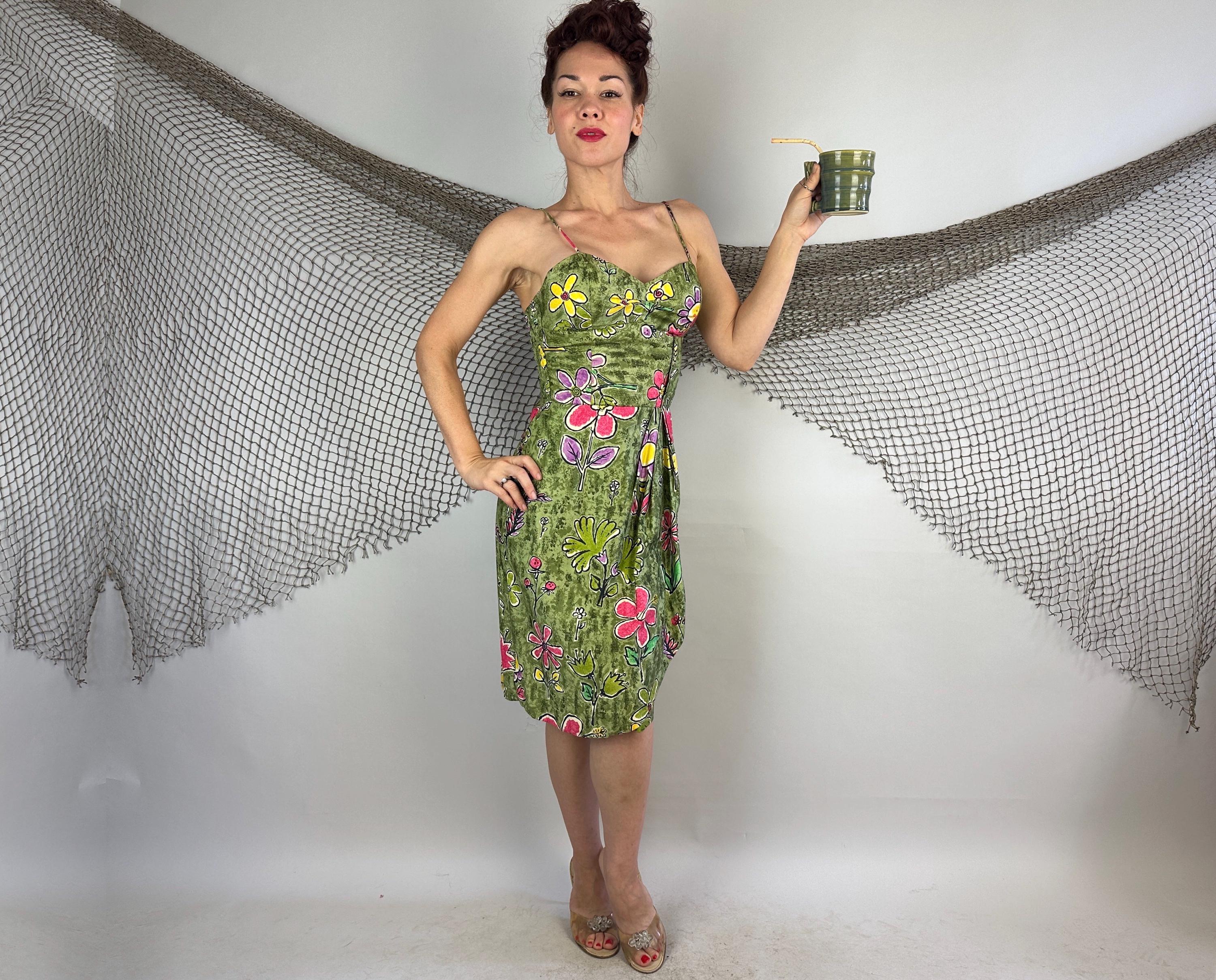 Your presence will pop at the Luau when you wear this fun 1950s sun dress! The sarong style dress is cotton in a mottled moss green with a bold child-like pop-art floral print in hot pink, sunny yellow, and grape purple outlined in black. The bodice is lightly boned and the sweetheart bust is shaped with strategic seams and central pleating. Panels of shirrng on each side give some flexibilty and the back is cut with a subtle dip where a metal "Talon" zipper fastens below. The skirt is a faux wrap with pleating accents that extend over the midriff as a strip on one side. Labeled "Made in Honolulu". This dress is in great vintage condition, with no holes, stains, or odors to note.