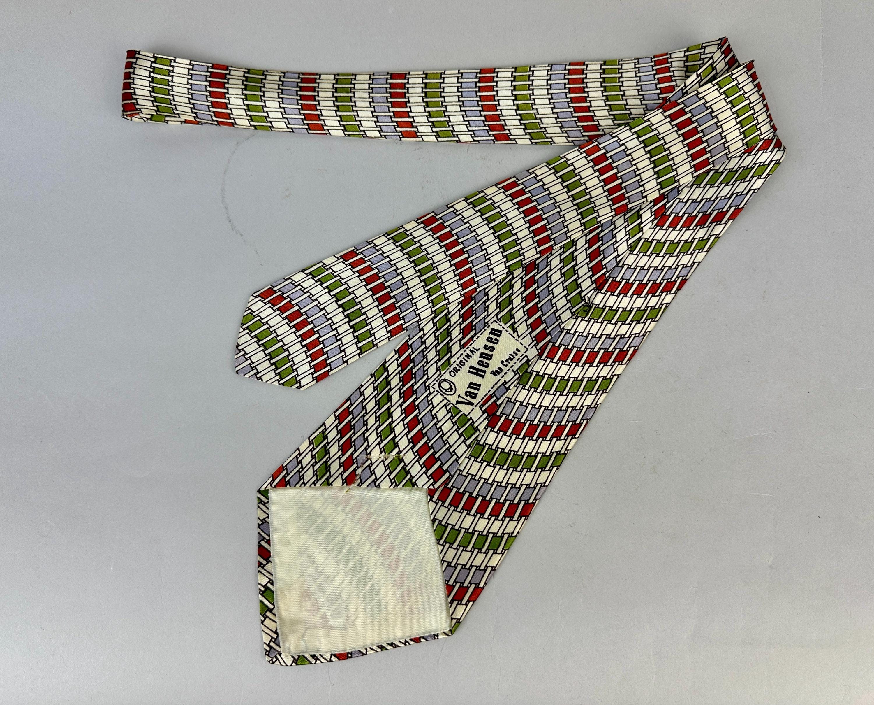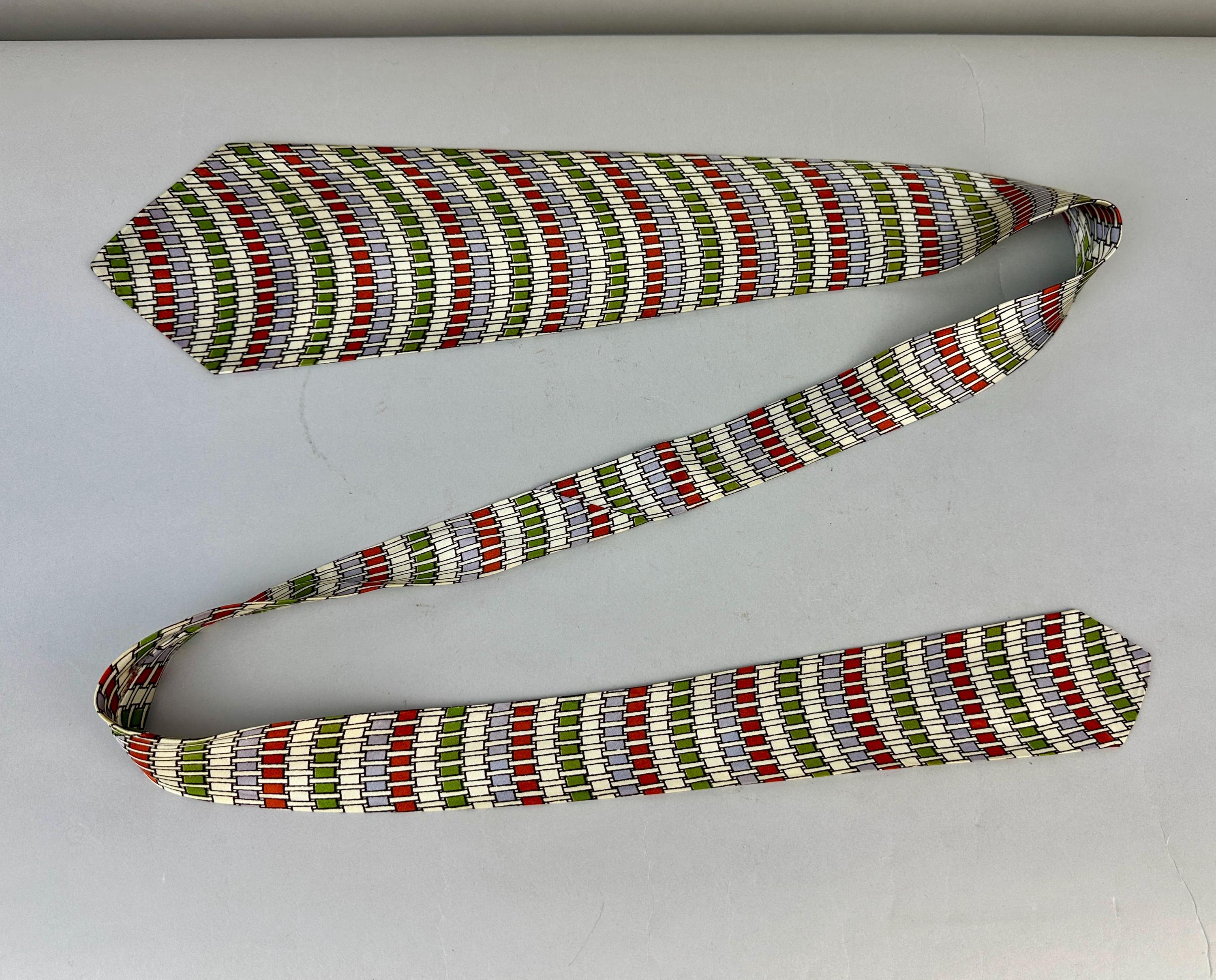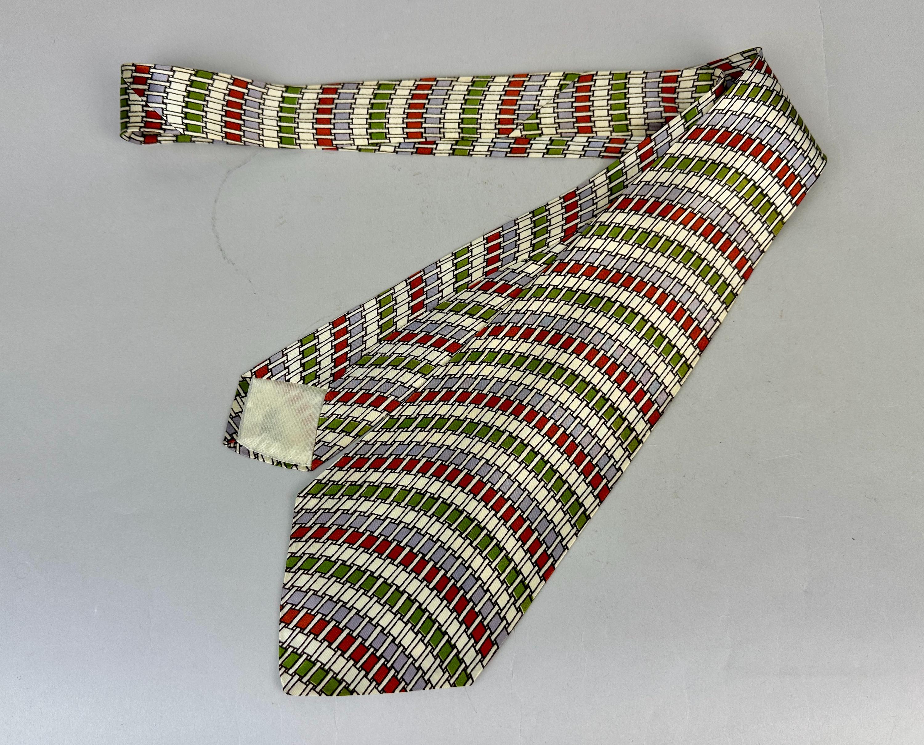 This 1940's tie will deliver baskets full of compliments! A shiny rayon satin is printed with a basket weave pattern of striping moss green, icy lavender, and spiced orange with a white base. Fully lined and by "Van Heusen". Pairs well with a wide variety of Art Deco and Mid-Century suit colors and fabric types. This tie is in excellent vintage condition with no flaws found!